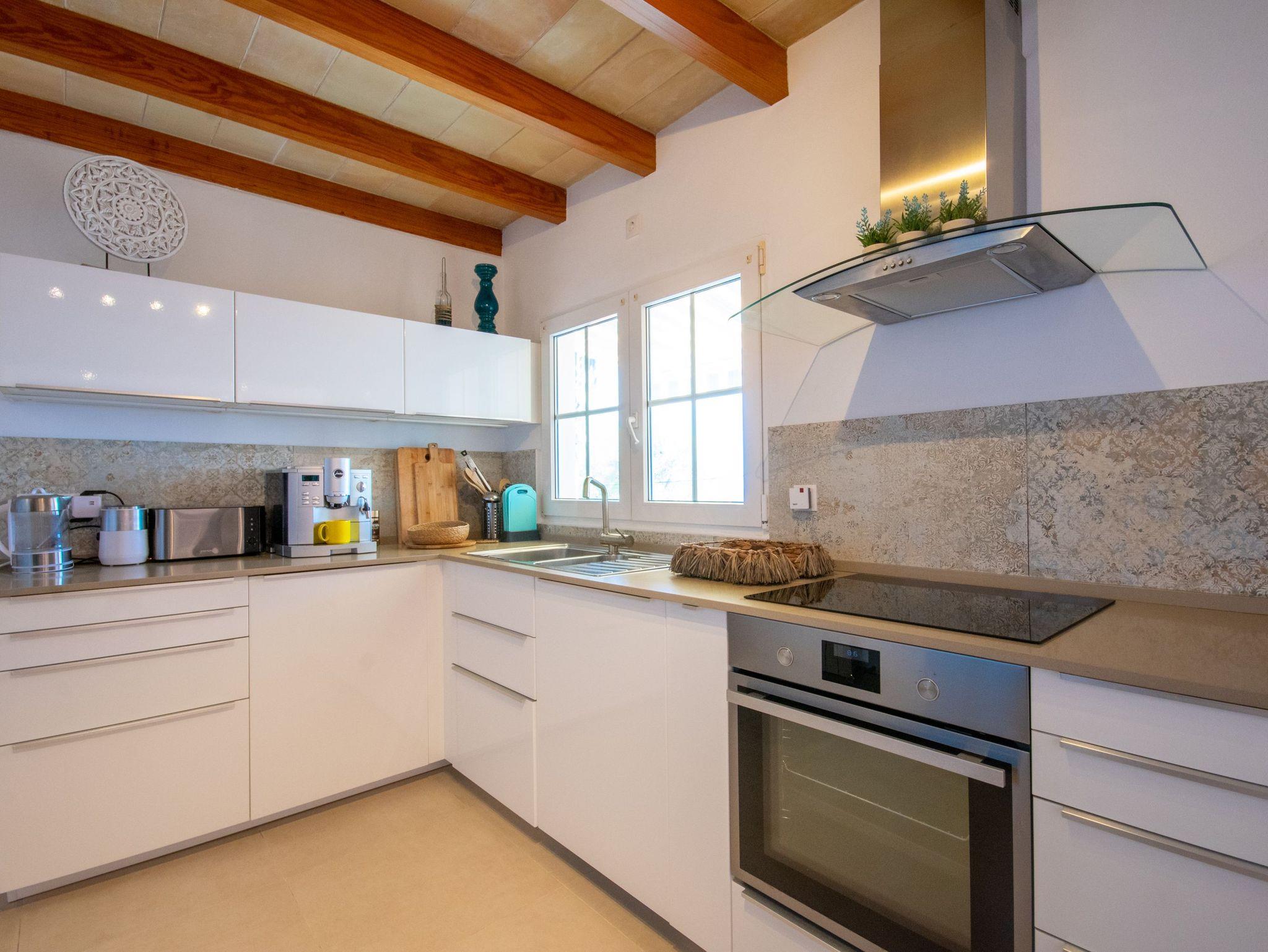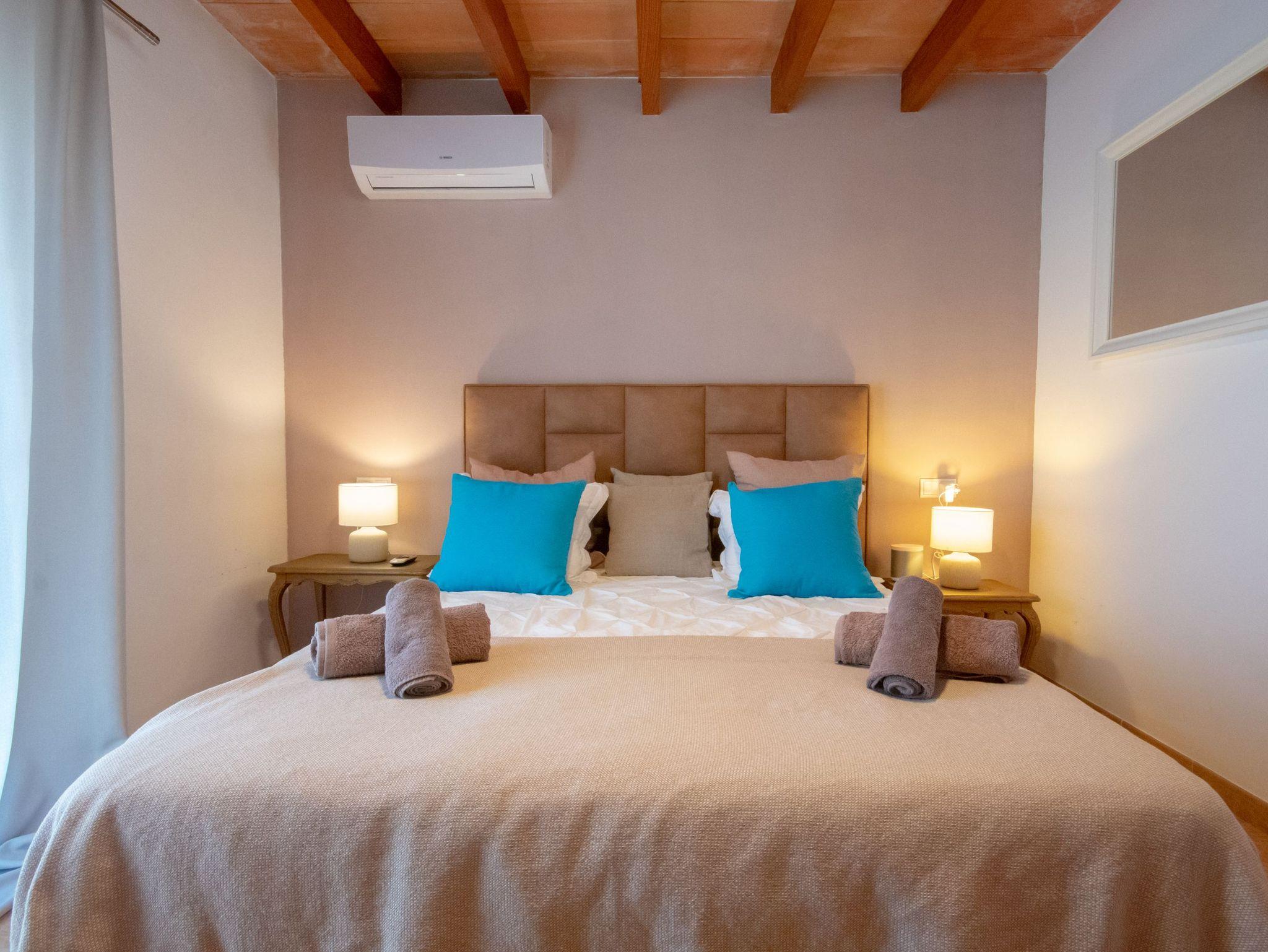.Das Haus ist modern und gemütlich, mit einem offenen Design, das das Wohnzimmer und die Küche verbindet, voller natürlichem Licht dank der großen Fenster, die auf die Terrasse öffnen. Es hat drei Schlafzimmer: eines im Erdgeschoss mit einem Doppelbett und eigenem Bad und zwei im Obergeschoss, die sich ein Bad mit Dusche teilen. Das Hauptschlafzimmer hat Zugang zu einer privaten Terrasse. Die Bäder sind stilvoll und modern, mit großen Duschen und hochwertigen Oberflächen. Darüber hinaus ist das Haus mit modernster Technik wie Glasfaser-Internet, Bluetooth-Lautsprechern und Satellitenfernsehen ausgestattet und bietet eine komfortable und funktionelle Umgebung, um Ihren Aufenthalt auf Mallorca zu genießen.