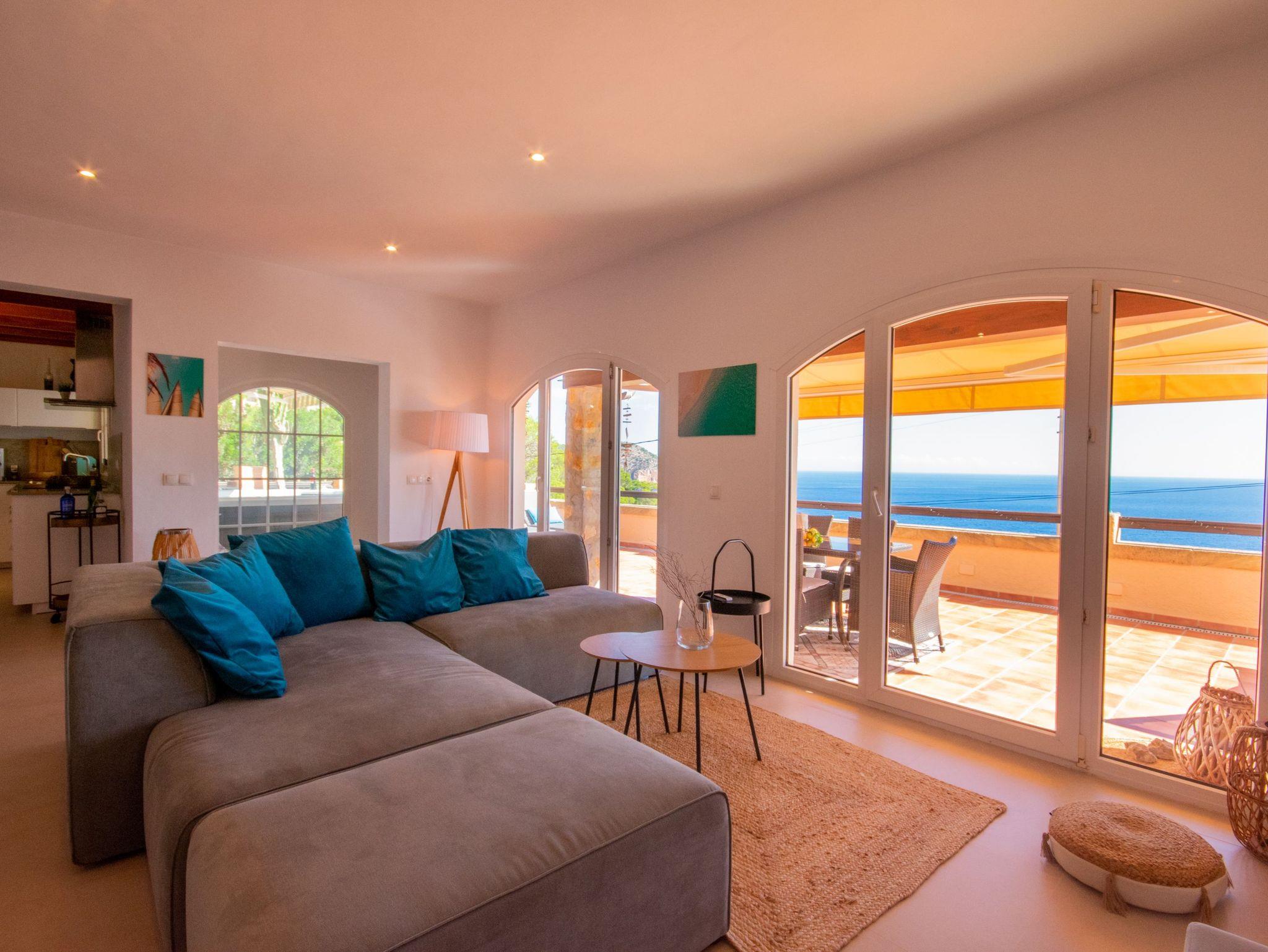 Die Villa „Vista Mar“ auf Mallorca ist ein Meisterwerk an Komfort und modernem Design, perfekt für diejenigen, die ein einzigartiges und luxuriöses Erlebnis suchen. Das Anwesen verfügt über ein geräumiges, offenes Wohn- und Küchenkonzept, das dank der großen Fenster, die sich zur Terrasse hin öffnen, eine fließende Atmosphäre voller natürlichem Licht schafft.
