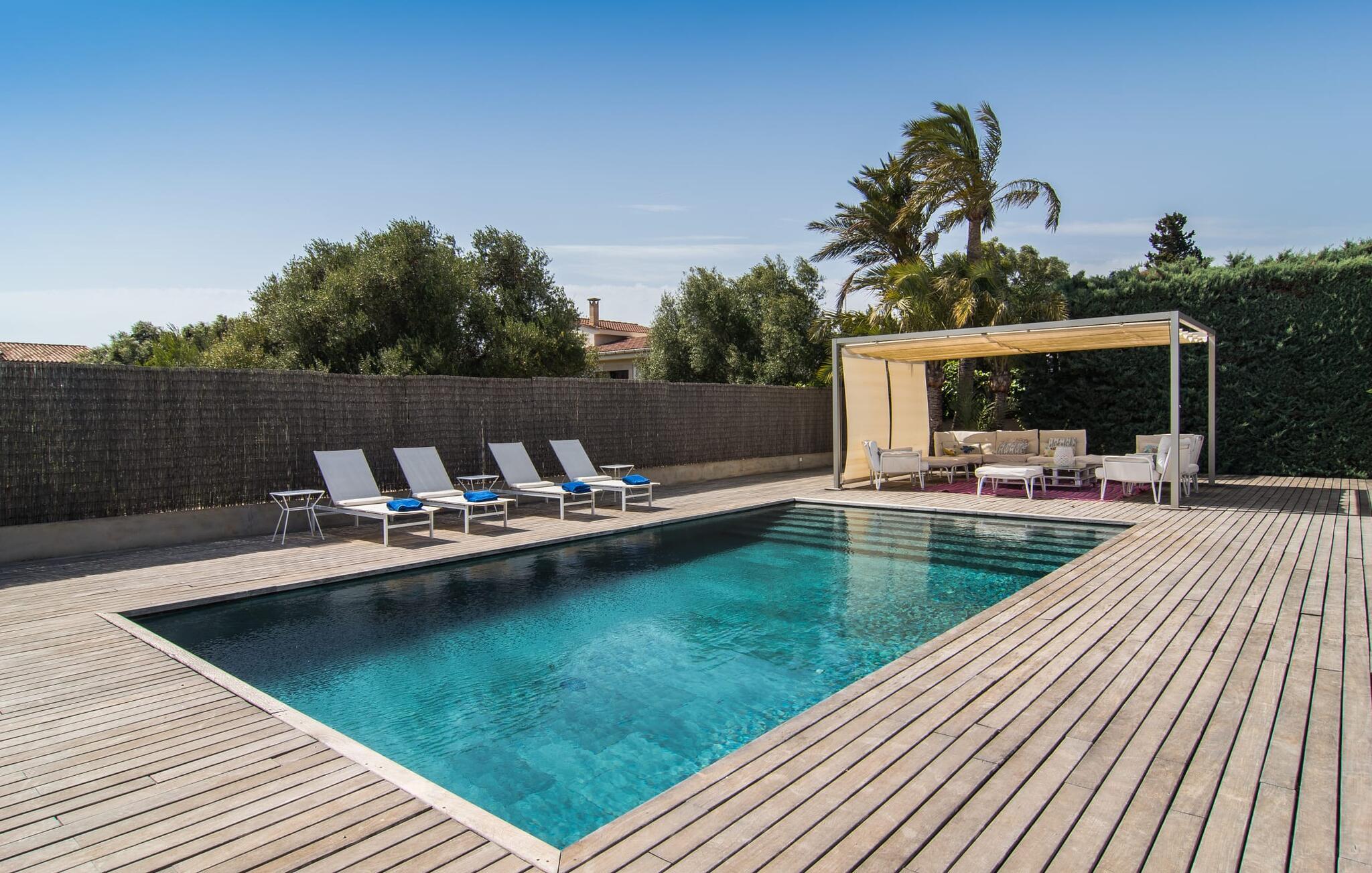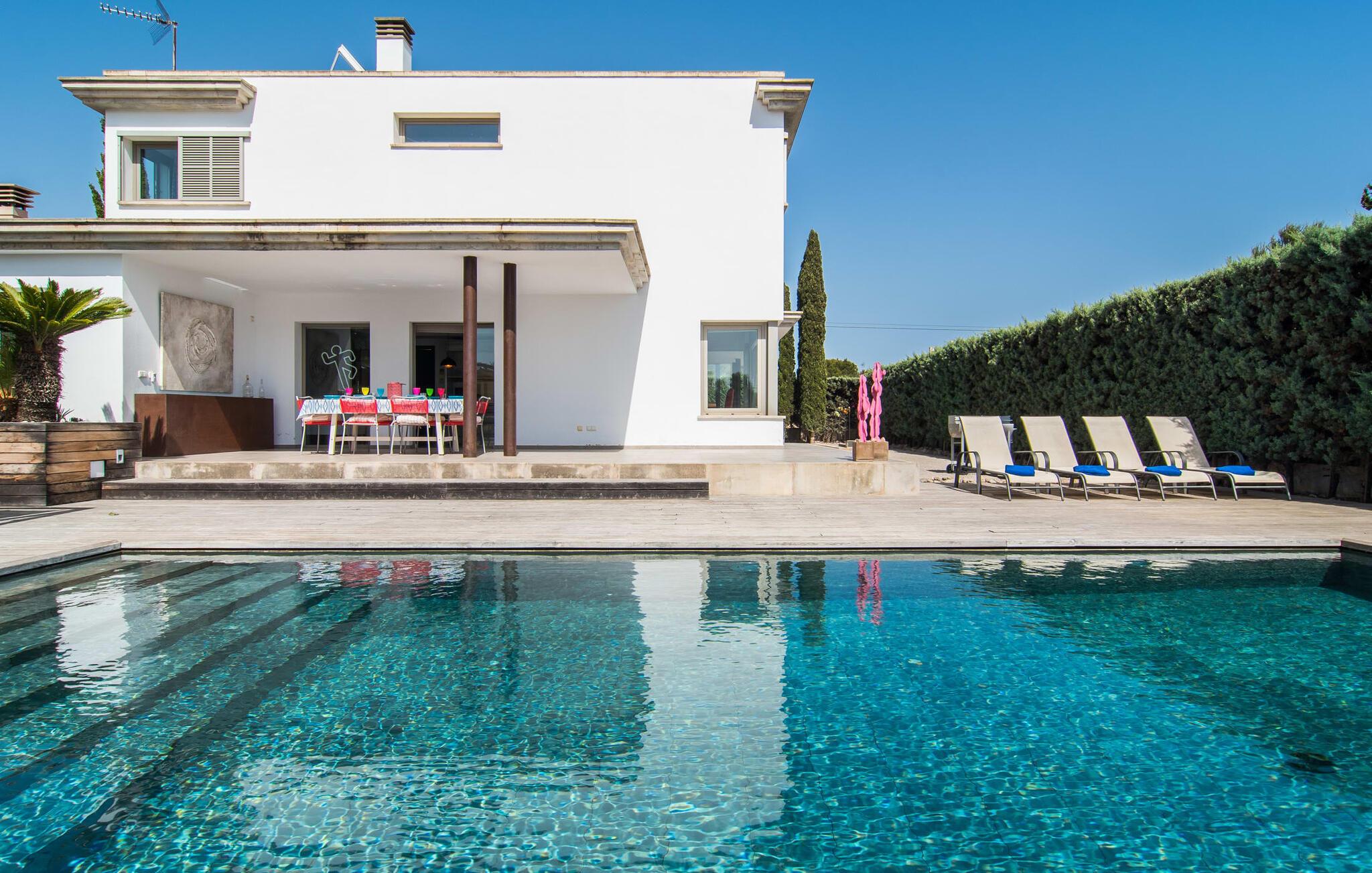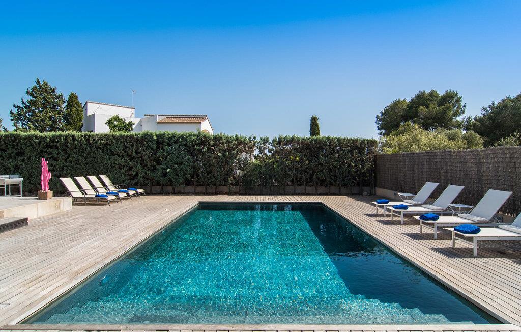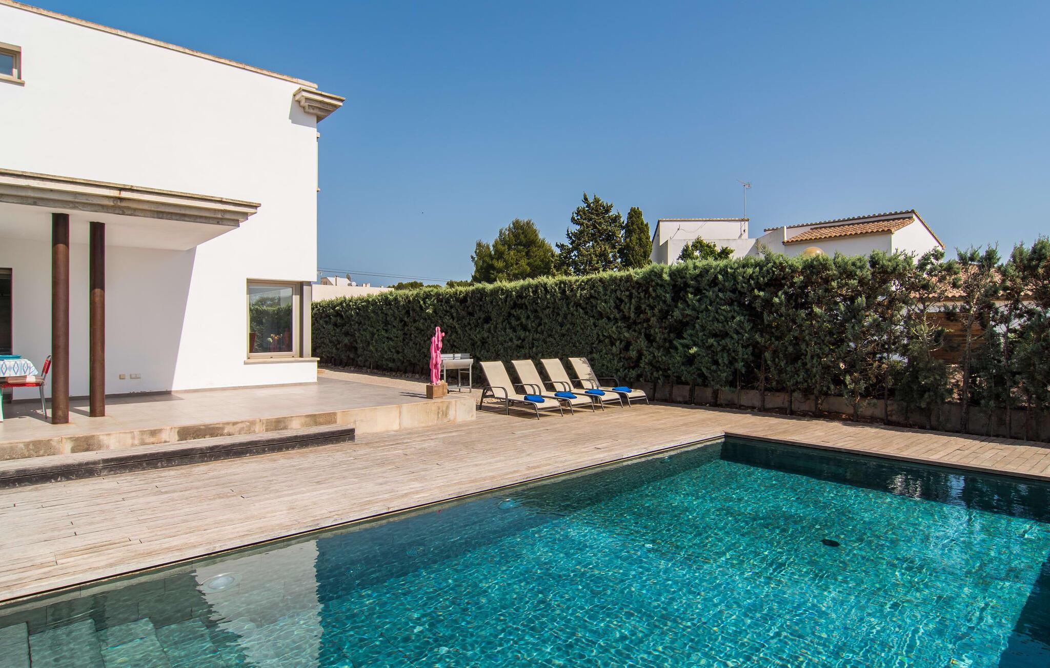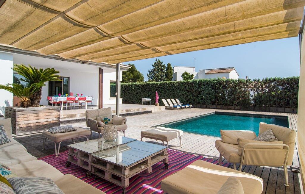 Vi er glade for at kunne præsentere jer for dette helt enestående feriehus; Ikke alene imponerede den os fuldstændig på alle måder, den er også fuldstændig uovertruffen med hensyn til originalitet og luksuriøs stemning. Enhver, der vægter komfort og æstetik højt på ferien, vil finde denne ejendom yderst attraktiv, især hvis nærhed til stranden og gode forbindelser til øens infrastruktur er vigtige for dem. Villa "Cap d'Olla" opfylder alle disse krav på den mest behagelige måde, man kan forestille sig. Beliggende på en smuk hjørnegrund i en boligbebyggelse og omgivet af hække og cypresser, bare ved at kigge på uderummet kan I se, at dette sted byder på nogle gode muligheder for en eksklusiv bolig. Foran huset strækker en overdækket terrasse sig mod poolen; Det er en dejlig ramme for al fresco spisning. Der er plads nok ved det hvide spisebord, så alle i jeres gruppe kan spise sammen når som helst på dagen. Herfra fører kun to trin ned til poolen, som er helt omgivet af en skøn træterrasse. Under en baldakin finder I et dejligt udendørs loungeområde med komfortable hvide sofaer og lænestole samt et stilfuldt glasbord og forsendelsespaller; Forkæl jer selv med lidt luksus, mens I sidder herude med en kølig drink i hånden og kigger ud over poolens glitrende turkise vand. Det lette tag er også justerbart, så I selv kan bestemme, hvor meget tid I vil bruge i solen eller i skyggen. Poolen, der er foret med usædvanligt store fliser, tilbyder unge og gamle et dejligt sted at slappe af og køle af på varme dage. Brede trin fører blidt ned i det behagelige, hudplejende saltvand. I vil måske også have fat i en god bog at læse, mens I ligger på en af de komfortable liggestole. Mens udendørsområdet udstråler sin del af luksus, er villaens indre fyldt til randen med en atmosfære af sofistikeret elegance. Den modtagelse, der venter gæster, når de træder ind i bygningen, kan kun beskrives som betagende. Helt oversvømmet med lys og rig på stærke farver, det brede, åbne rum fanger jer og inviterer jer til straks at gå i gang med at udforske de forskellige rum. Indretningen er domineret af røde og hvide toner, som skaber en fantastisk effekt i kombination med andre accentfarver og materialer. Stuen er foret med store panoramavinduer og har et stort udvalg af utroligt komfortable sofaer i midten. Det er helt sikkert stedet, hvor I vil tilbringe det meste af jeres tid indendørs. Fuld af farver og dekoreret med alle slags kunst, er det et fremragende sted at sidde og slappe af. Uanset hvor I kigger hen, fremtryller iøjnefaldende dekorative stykker en atmosfære, der er helt unik og skaber en helt særlig visuel oplevelse. Hvis I nogensinde bliver træt af at spise udenfor, er der en spiseplads to trin over stuen, hvor I kan spise jeres måltider med stil og nyde den ekstra smag, der følger med den elegante atmosfære. Det rummelige, moderne køkken er bekvemt placeret et værelse længere væk. En central ø gør det endnu sjovere at tilberede måltider sammen, og variationen og kvaliteten af faciliteter gør dette køkken til et sandt kokkens paradis. Der er endda plads til et ekstra spisebord, hvor I kan nyde en hurtig snack sammen. I stueetagen er der også et soveværelse med eget badeværelse og et ekstra toilet. En yderst elegant flydende trappe fører til øverste etage, som er luksuriøst indrettet og har en anden stue, et stort soveværelse med en-suite badeværelse (inklusive badekar og bruser som mulighed for sauna) og yderligere to soveværelser, der deler et badeværelse mellem dem. Det fantastiske ved den anden stue er, at I kan bruge lidt alenetid væk fra jeres feriegruppe eller endda dele jer op i mindre grupper for at lave forskellige aktiviteter uden at forstyrre hinanden. Nyd en god film på fladskærms-tv'et, mens I slapper af på den store røde sofa eller på en af de farverige gulvpuder. De klimatiserede, individuelt designede og farverige værelser udstråler et strejf af ekstravagance, der gør afslapning i disse værelser til en uforlignelig oplevelse. Vi er sikre på, at alle vil finde det perfekte sted at sove her. Badeværelserne, som også har deres egen charme, har naturligt lys og er udstyret med faciliteter af høj kvalitet som hårtørrere og nok plads til alle i gruppen. Sa Ràpita, en lille fiskerby langt væk fra folkemængderne, er et godt udgangspunkt for at udforske øen og opdage det "rigtige" Mallorca. Byen grænser op til et naturreservat, og to af øens smukkeste strande ligger praktisk talt lige uden for døren: Ses Covetes og den uberørte naturstrand Es Trenc. Da en af Sa Ràpitas hovedattraktioner er yachtklubben, omfatter fritidsaktiviteter en række vandsportsaktiviteter som surfing, sejlads og dykning, men der er også masser at lave for golfspillere og vandreentusiaster. Den super stilfulde villa “Cap d'Olla” ligger i et sommerhusområde i Sa Ràpita og er omgivet af et skønt, velholdt udeområde. Indkøb af dagligvarer og andre daglige fornødenheder, restauranter ved havet og selve havet er alle inden for gåafstand. Den attraktive Platja Sa Ràpita-strand ligger kun 2 km væk, og der er flere andre smukke strande i nærheden.
