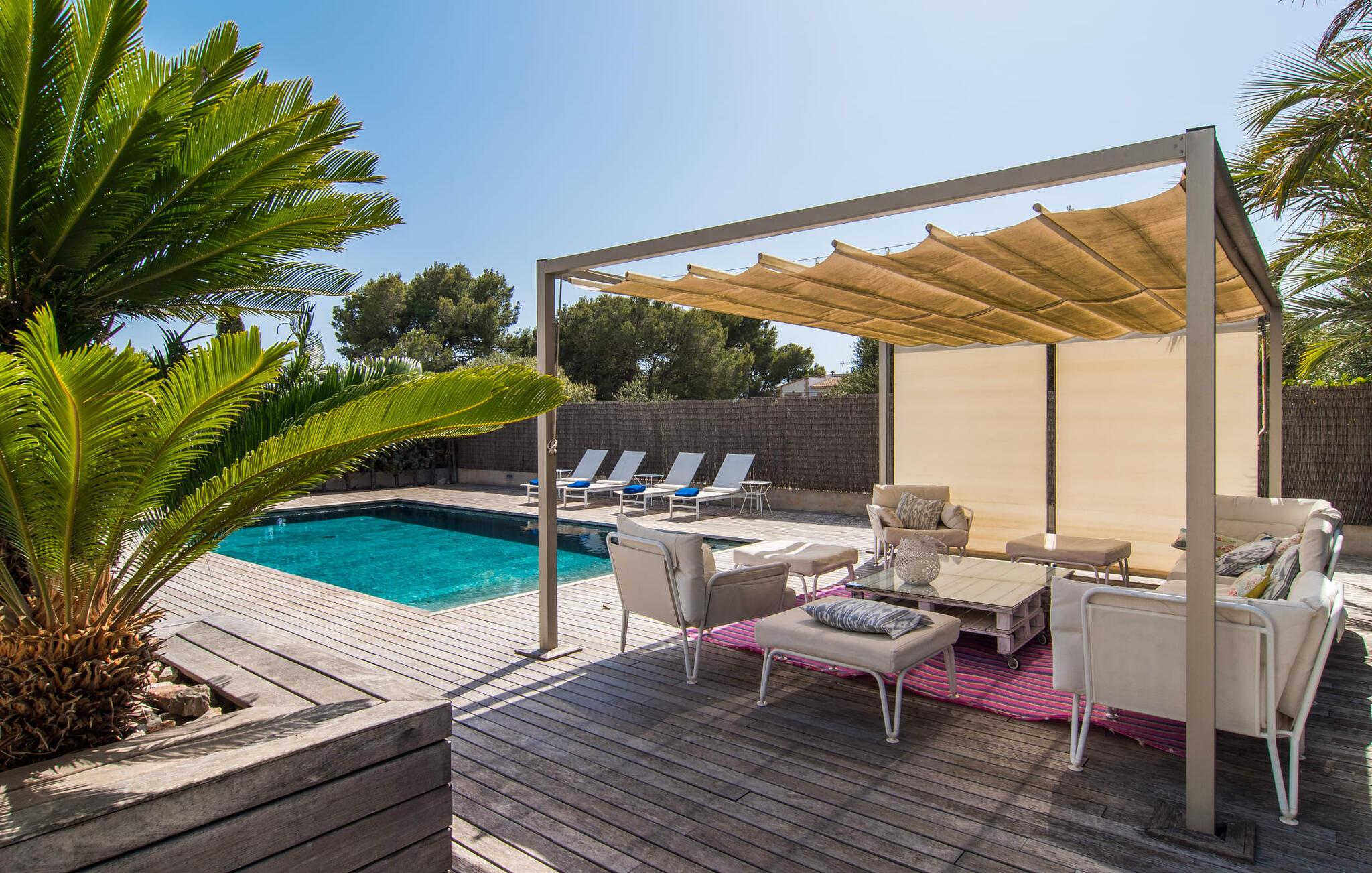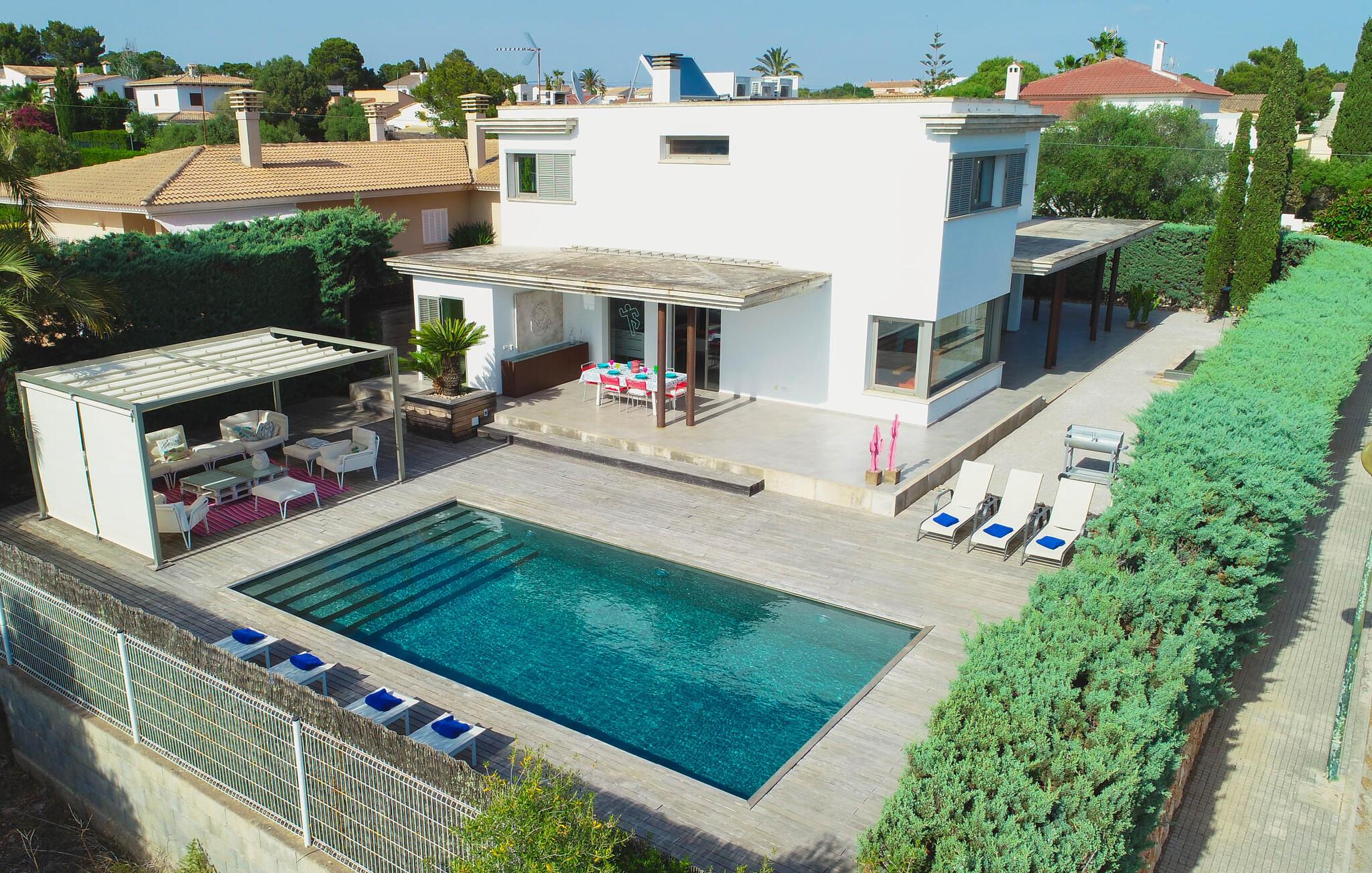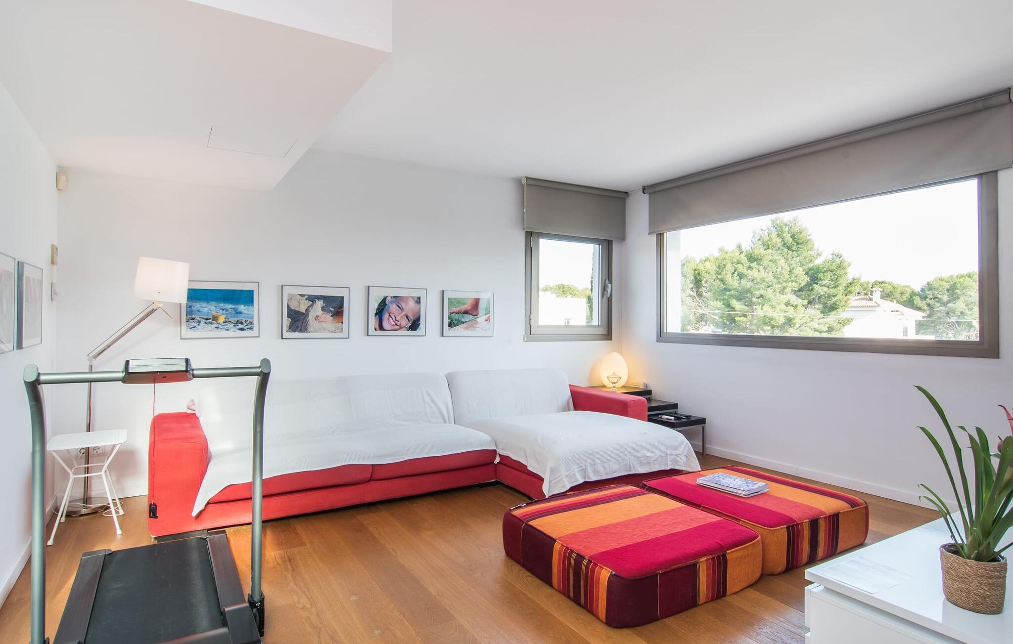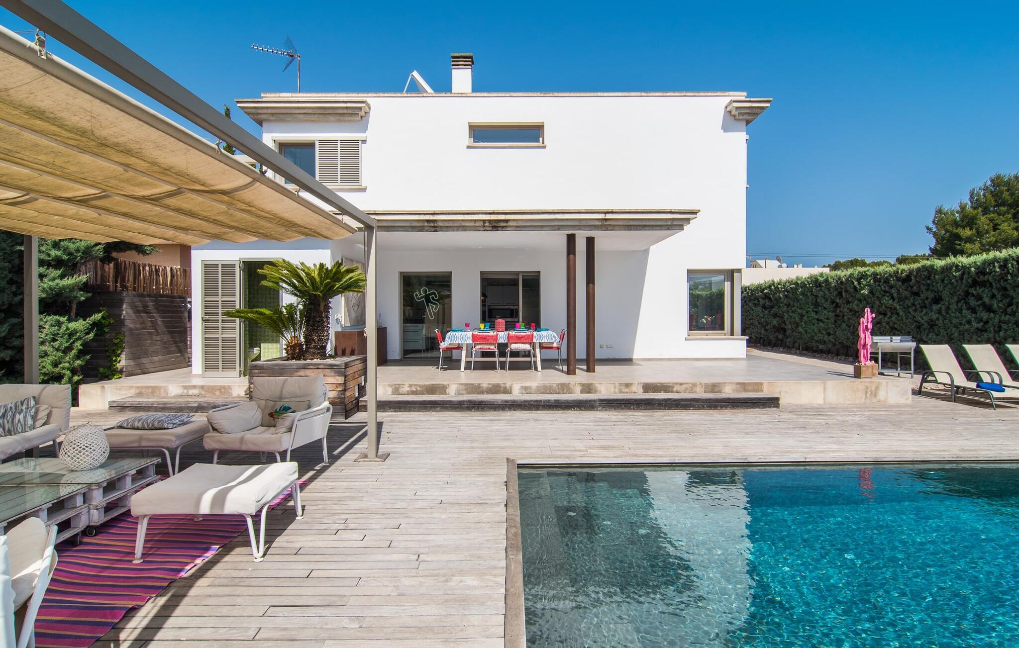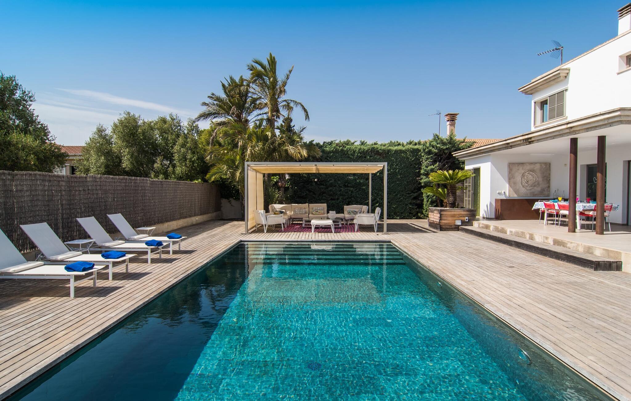 Vi er glade for at kunne præsentere jer for dette helt enestående feriehus; Ikke alene imponerede den os fuldstændig på alle måder, den er også fuldstændig uovertruffen med hensyn til originalitet og luksuriøs stemning. Enhver, der vægter komfort og æstetik højt på ferien, vil finde denne ejendom yderst attraktiv, især hvis nærhed til stranden og gode forbindelser til øens infrastruktur er vigtige for dem. Villa "Cap d'Olla" opfylder alle disse krav på den mest behagelige måde, man kan forestille sig. Beliggende på en smuk hjørnegrund i en boligbebyggelse og omgivet af hække og cypresser, bare ved at kigge på uderummet kan I se, at dette sted byder på nogle gode muligheder for en eksklusiv bolig. Foran huset strækker en overdækket terrasse sig mod poolen; Det er en dejlig ramme for al fresco spisning. Der er plads nok ved det hvide spisebord, så alle i jeres gruppe kan spise sammen når som helst på dagen. Herfra fører kun to trin ned til poolen, som er helt omgivet af en skøn træterrasse. Under en baldakin finder I et dejligt udendørs loungeområde med komfortable hvide sofaer og lænestole samt et stilfuldt glasbord og forsendelsespaller; Forkæl jer selv med lidt luksus, mens I sidder herude med en kølig drink i hånden og kigger ud over poolens glitrende turkise vand. Det lette tag er også justerbart, så I selv kan bestemme, hvor meget tid I vil bruge i solen eller i skyggen. Poolen, der er foret med usædvanligt store fliser, tilbyder unge og gamle et dejligt sted at slappe af og køle af på varme dage. Brede trin fører blidt ned i det behagelige, hudplejende saltvand. I vil måske også have fat i en god bog at læse, mens I ligger på en af de komfortable liggestole. Mens udendørsområdet udstråler sin del af luksus, er villaens indre fyldt til randen med en atmosfære af sofistikeret elegance. Den modtagelse, der venter gæster, når de træder ind i bygningen, kan kun beskrives som betagende. Helt oversvømmet med lys og rig på stærke farver, det brede, åbne rum fanger jer og inviterer jer til straks at gå i gang med at udforske de forskellige rum. Indretningen er domineret af røde og hvide toner, som skaber en fantastisk effekt i kombination med andre accentfarver og materialer. Stuen er foret med store panoramavinduer og har et stort udvalg af utroligt komfortable sofaer i midten. Det er helt sikkert stedet, hvor I vil tilbringe det meste af jeres tid indendørs. Fuld af farver og dekoreret med alle slags kunst, er det et fremragende sted at sidde og slappe af. Uanset hvor I kigger hen, fremtryller iøjnefaldende dekorative stykker en atmosfære, der er helt unik og skaber en helt særlig visuel oplevelse. Hvis I nogensinde bliver træt af at spise udenfor, er der en spiseplads to trin over stuen, hvor I kan spise jeres måltider med stil og nyde den ekstra smag, der følger med den elegante atmosfære. Det rummelige, moderne køkken er bekvemt placeret et værelse længere væk. En central ø gør det endnu sjovere at tilberede måltider sammen, og variationen og kvaliteten af faciliteter gør dette køkken til et sandt kokkens paradis. Der er endda plads til et ekstra spisebord, hvor I kan nyde en hurtig snack sammen. I stueetagen er der også et soveværelse med eget badeværelse og et ekstra toilet. En yderst elegant flydende trappe fører til øverste etage, som er luksuriøst indrettet og har en anden stue, et stort soveværelse med en-suite badeværelse (inklusive badekar og bruser som mulighed for sauna) og yderligere to soveværelser, der deler et badeværelse mellem dem. Det fantastiske ved den anden stue er, at I kan bruge lidt alenetid væk fra jeres feriegruppe eller endda dele jer op i mindre grupper for at lave forskellige aktiviteter uden at forstyrre hinanden. Nyd en god film på fladskærms-tv'et, mens I slapper af på den store røde sofa eller på en af de farverige gulvpuder. De klimatiserede, individuelt designede og farverige værelser udstråler et strejf af ekstravagance, der gør afslapning i disse værelser til en uforlignelig oplevelse. Vi er sikre på, at alle vil finde det perfekte sted at sove her. Badeværelserne, som også har deres egen charme, har naturligt lys og er udstyret med faciliteter af høj kvalitet som hårtørrere og nok plads til alle i gruppen. Sa Ràpita, en lille fiskerby langt væk fra folkemængderne, er et godt udgangspunkt for at udforske øen og opdage det "rigtige" Mallorca. Byen grænser op til et naturreservat, og to af øens smukkeste strande ligger praktisk talt lige uden for døren: Ses Covetes og den uberørte naturstrand Es Trenc. Da en af Sa Ràpitas hovedattraktioner er yachtklubben, omfatter fritidsaktiviteter en række vandsportsaktiviteter som surfing, sejlads og dykning, men der er også masser at lave for golfspillere og vandreentusiaster. Den super stilfulde villa “Cap d'Olla” ligger i et sommerhusområde i Sa Ràpita og er omgivet af et skønt, velholdt udeområde. Indkøb af dagligvarer og andre daglige fornødenheder, restauranter ved havet og selve havet er alle inden for gåafstand. Den attraktive Platja Sa Ràpita-strand ligger kun 2 km væk, og der er flere andre smukke strande i nærheden.