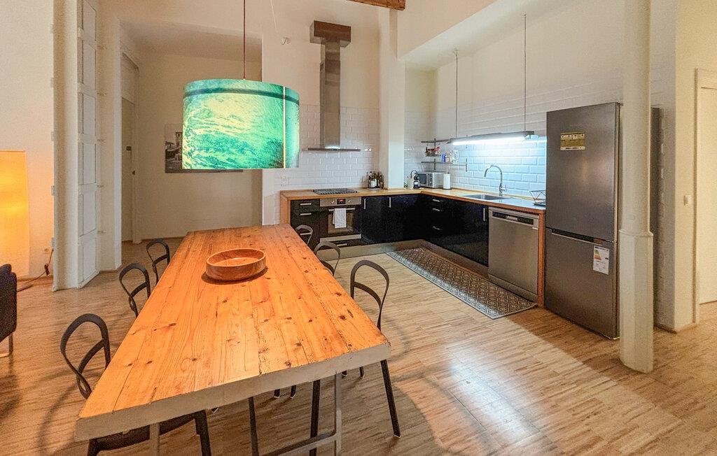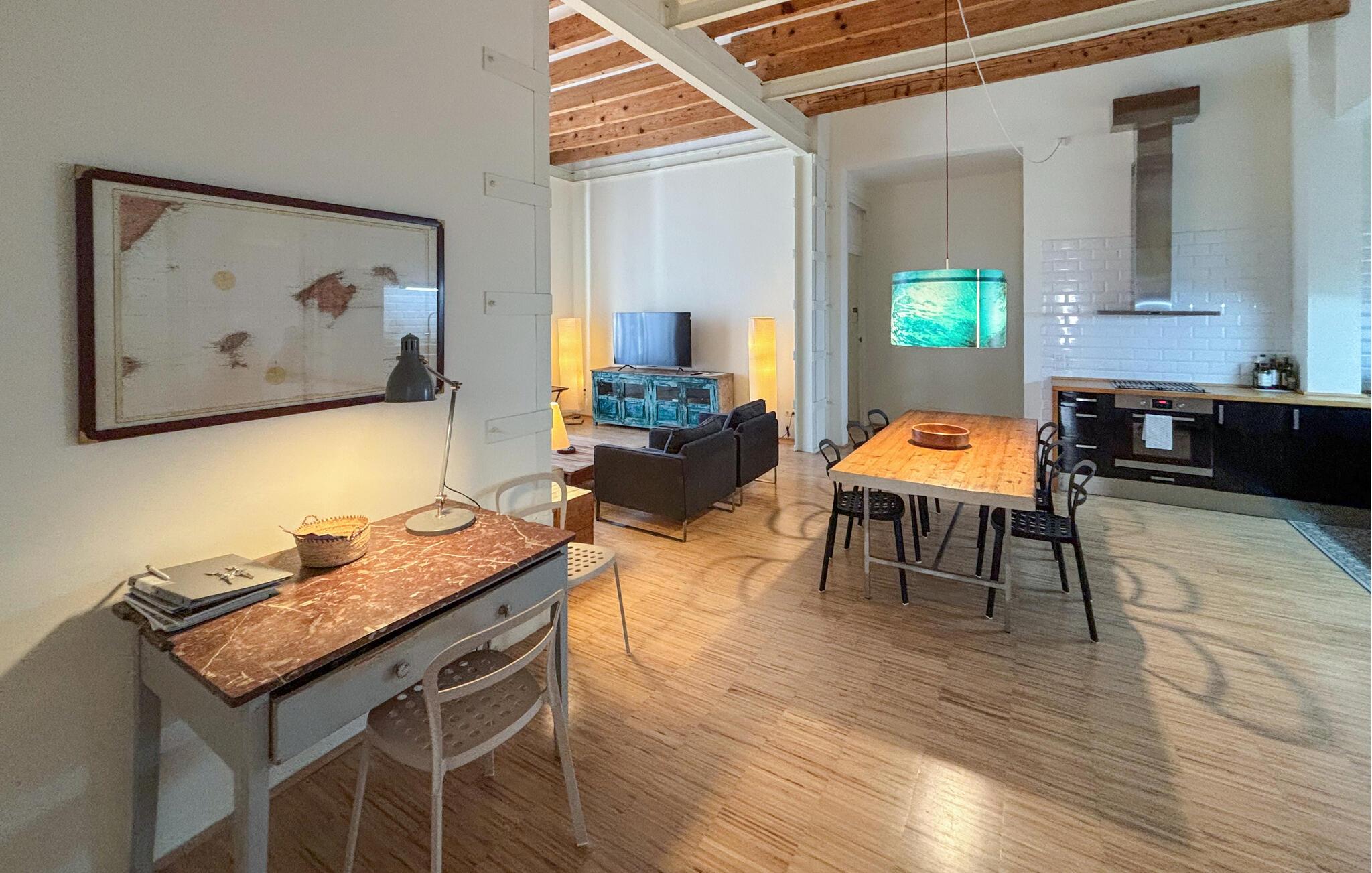 Træd indenfor og bliv budt velkommen af ??den store opholdsstue. Højt til loftet med synlige træbjælker og store vinduer skaber en behagelig atmosfære. Sæt jer godt til rette i sofaerne og slap af i de rolige omgivelser. Den åbne planløsning forbinder problemfrit opholds-, spise- og køkkenområderne og giver mulighed for hyggelige sammenkomster. Brug det lange træbord til fælles måltider eller rolige aftener med familien. Det moderne køkken med sine generøse arbejdsflader er de perfekte rammer for at lave mad sammen.