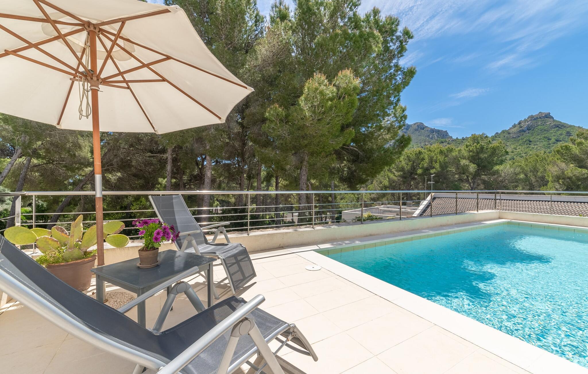 Villaen "Carritx des Tudons" er spektakulær i enhver henseende. Bygget i den moderne Ibiza-stil tilbyder den elegant komfort og en sublim følelse af velvære både inde og ude. Dette er et Fincallorca feriehus. Den rummelige poolterrasse foran huset byder på en fantastisk udsigt over de omkringliggende fyrreskove og bjergene. Herfra føler du, at du har middelhavssolen helt for dig selv. Samtidig giver en stor overdækket terrasse mulighed for at spise dine måltider i skyggen på alle tidspunkter af dagen. Dette skyggefulde område kan udvides til en del af poolterrassen ved hjælp af et stort fortelt. En bred glasskydedør sikrer en næsten sømløs overgang fra poolterrassen til en lys, rummelig opholdsstue. Stuen med åben spiseplads er oversvømmet med masser af naturligt dagslys. På samme niveau finder du et rummeligt, moderne køkken med udgang til poolterrassen, et enkelt soveværelse og et badeværelse med bruser. Fra stuen kan du tage trappen til øverste etage. Det huser tre lyse og komfortable dobbeltværelser med private badeværelser. Fra både entre og to af soveværelserne er der udgang til en stor altan. Herfra åbner udsigten ud til poolterrassen og de rolige omgivelser. Gå ikke glip af de vidunderligt forfriskende solopgange fra en af dine sydøstvendte terrasser! “Carritx des Tudors” ligger i et velholdt villaområde omgivet af fyrreskove på Mallorcas østkyst. Den lille strand Font de Sa Cala ligger kun 800 m herfra. Strandene i Cala Ratjada samt Cala Agulla kan nås på cirka 15 minutter. 10 minutter i bil.
