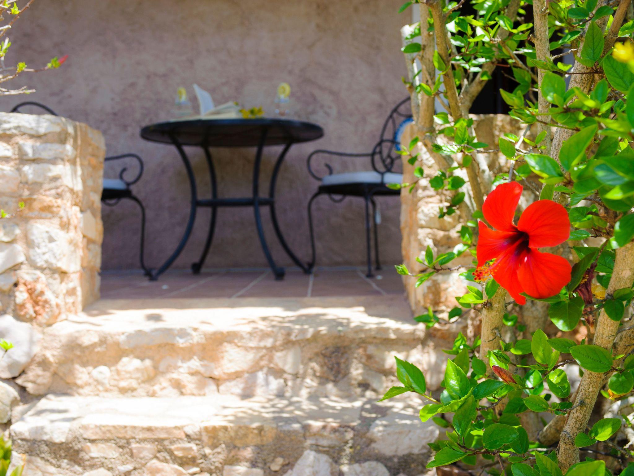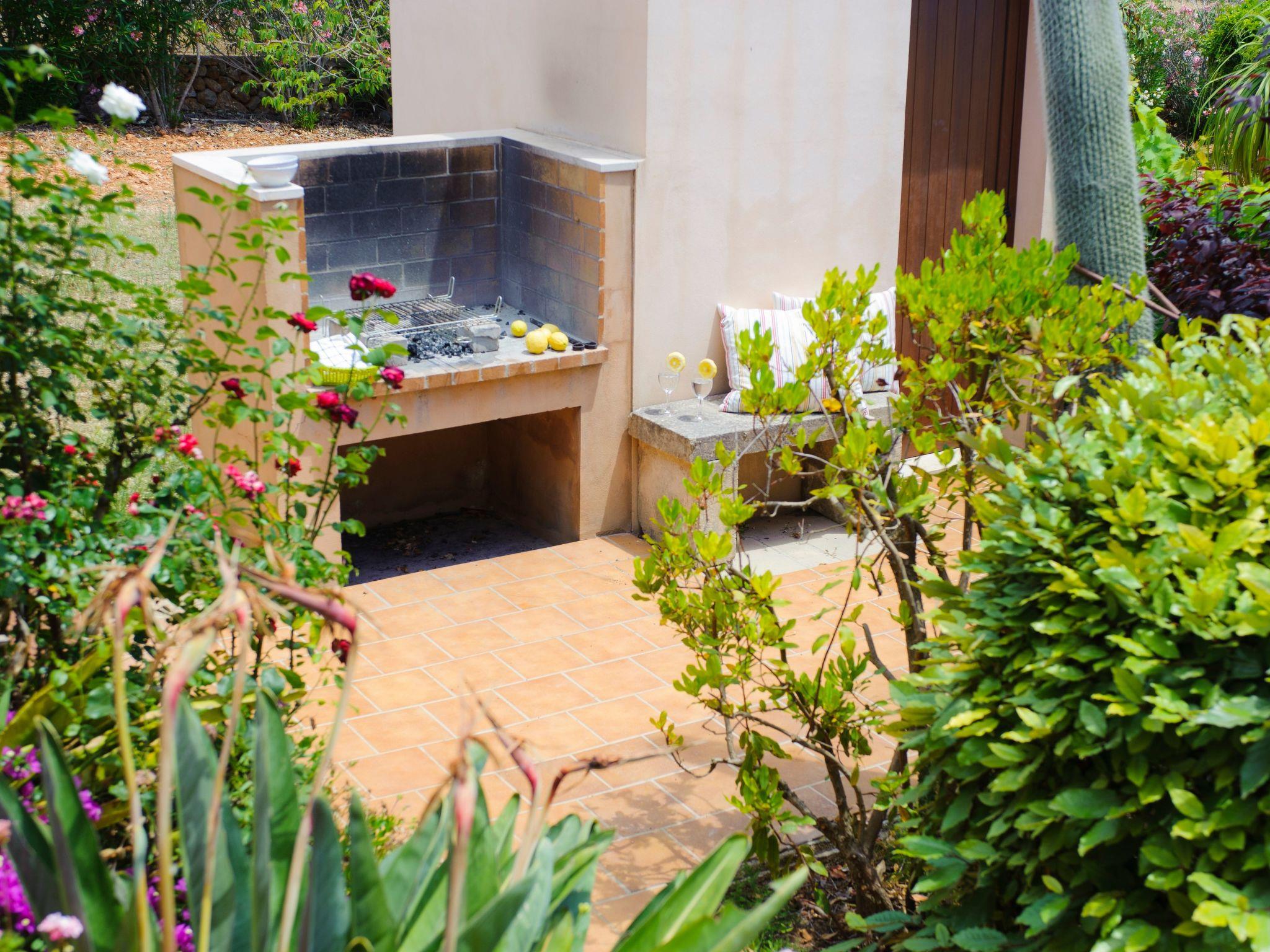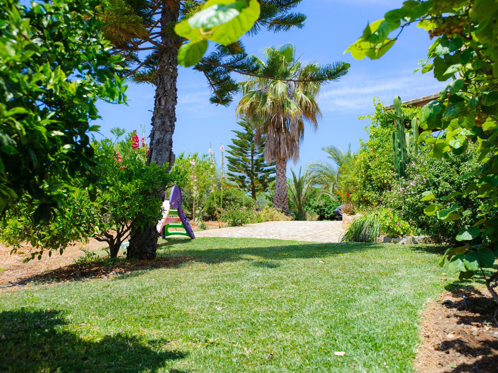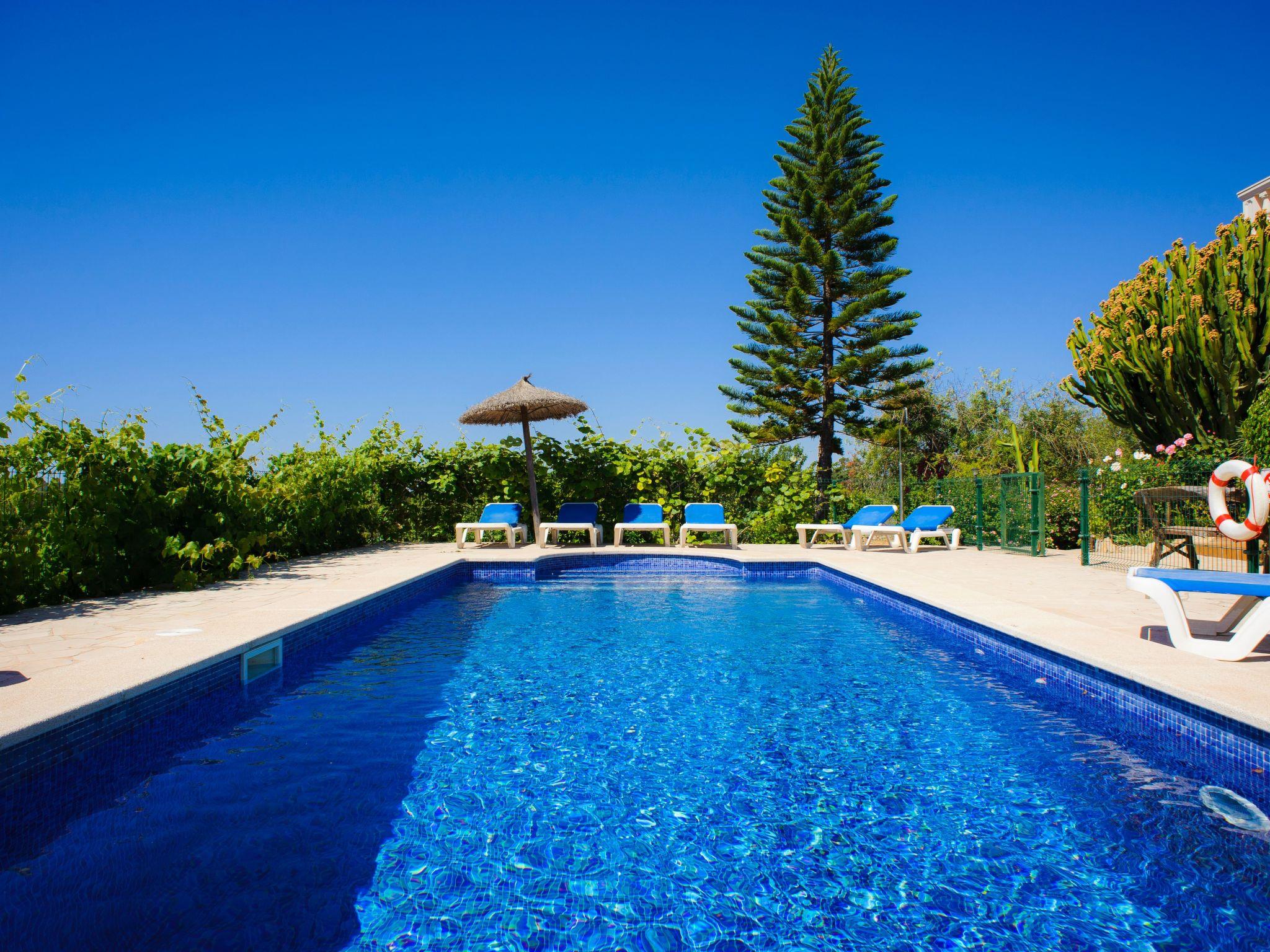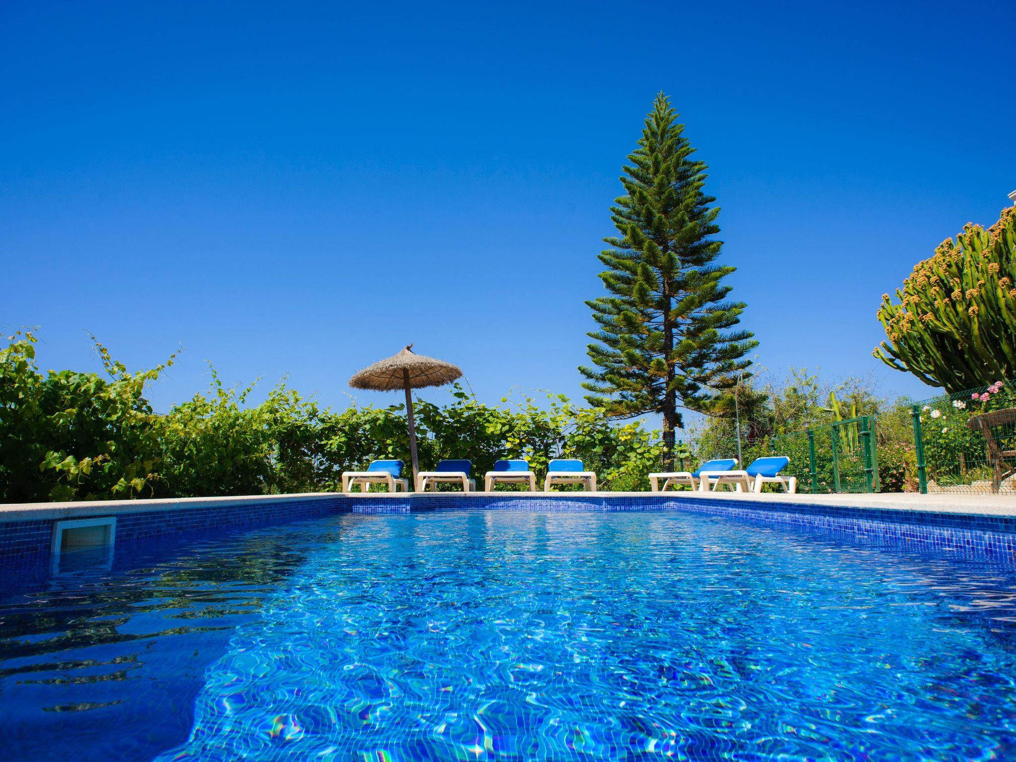 From the veranda, a small staircase leads to the beautiful, large pool area, which is fully fenced and has child-friendly steps. Sun loungers invite you to sunbathe and enjoy the marvellous view. From the rear terrace you also have access to a shower room with toilet. In the garden area there is a brick-built barbecue area and a seating area where you can relax. There are wonderfully fragrant shrubs and citrus trees as far as the eye can see and the large lawns are an invitation to stay, and not just for the children.
