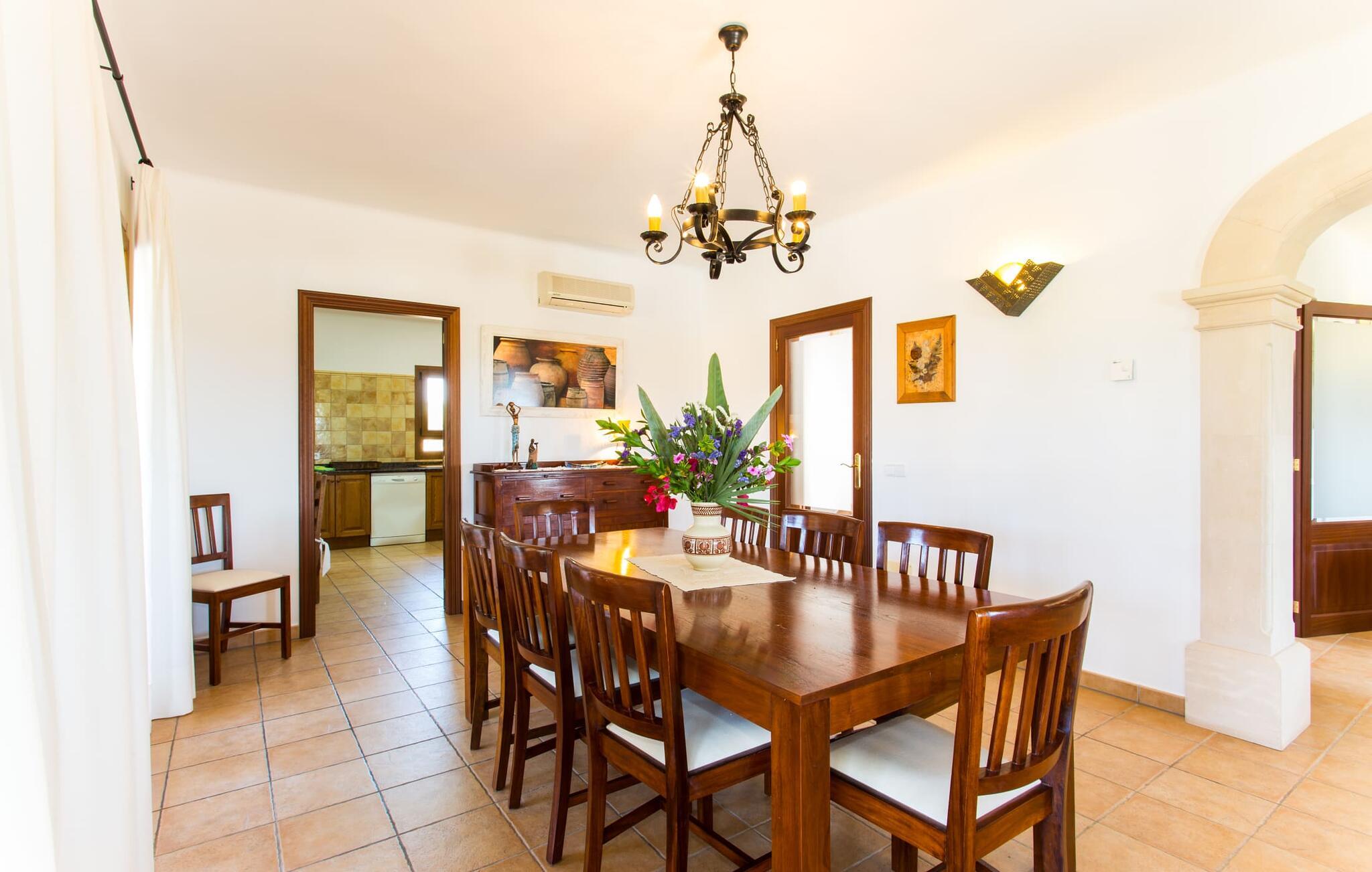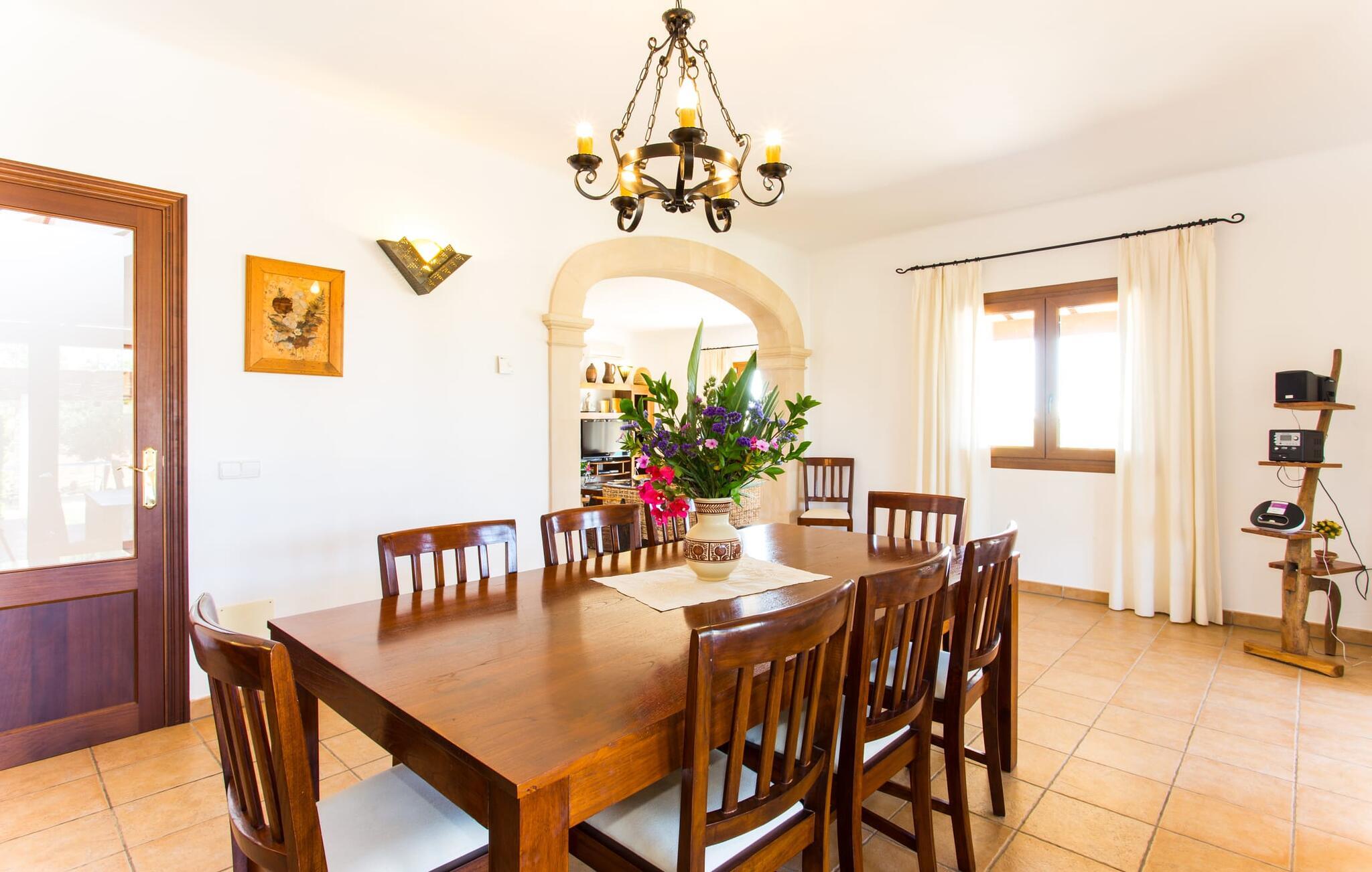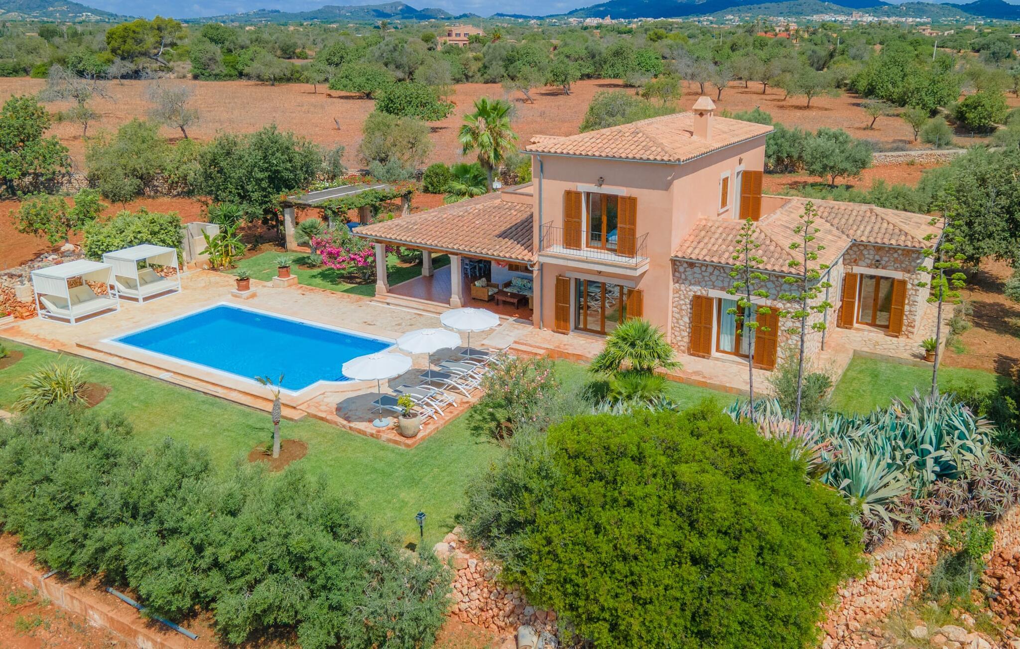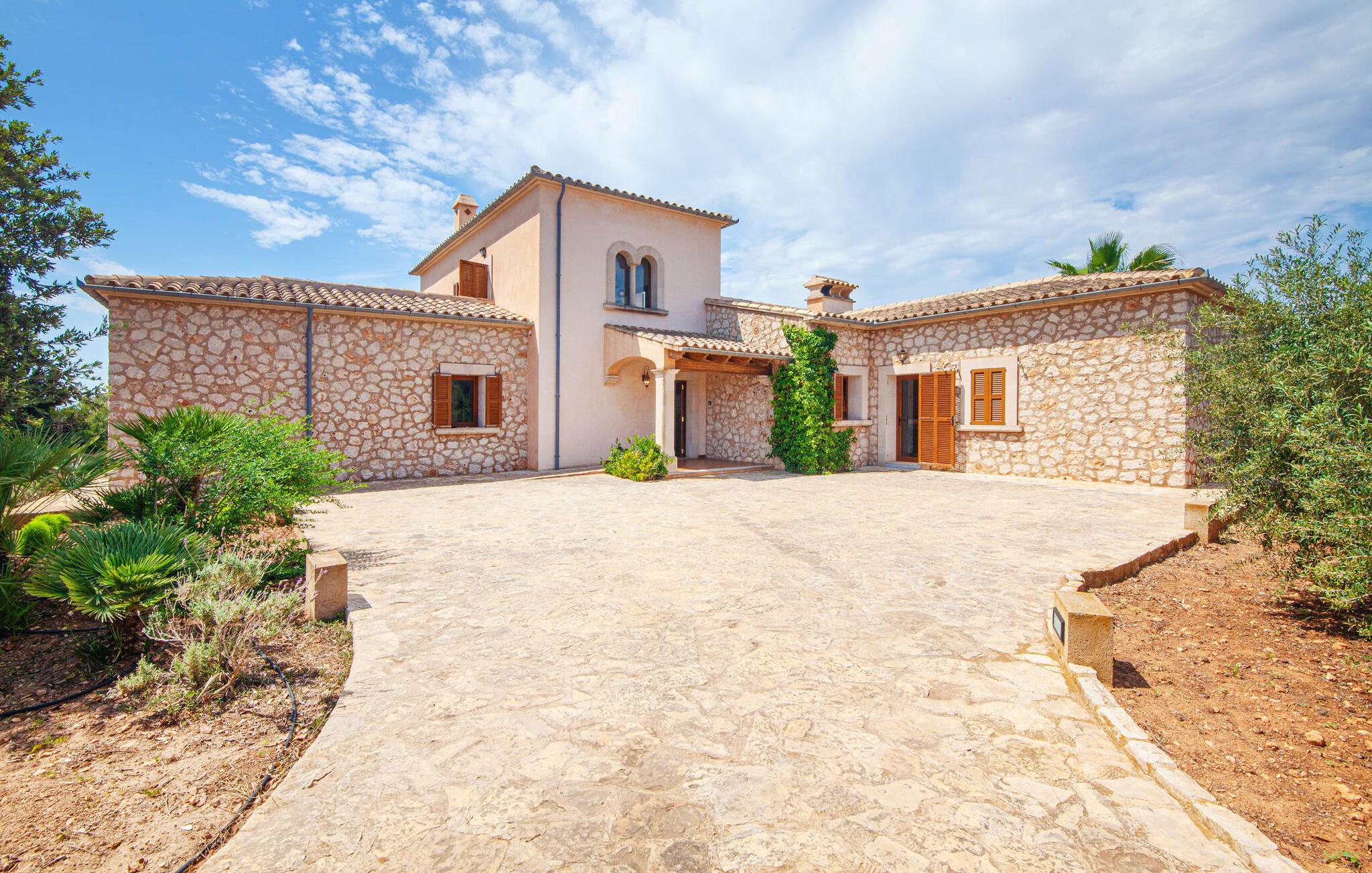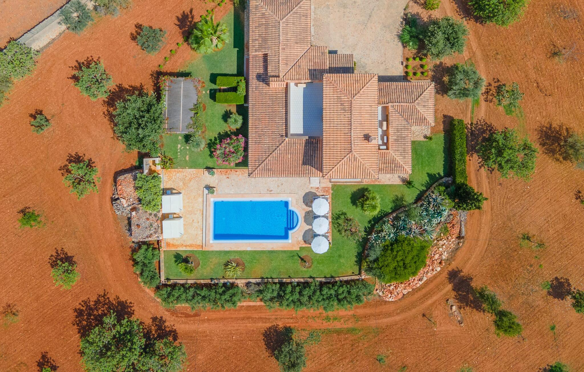 På en klar solskinsdag tager vi til villaen "Cas Fidever" efter at være blevet inviteret på en sightseeingtur af ejeren Miquel. Efter en dejlig køretur gennem landskabet omkring villaen er vi nysgerrige på ejendommen og bliver mødt med en varm velkomst. Det er et yderst smukt sommerhus og fremstår meget velholdt. Det første Miquel viser os er det utroligt alsidige udendørsområde. Ejendommen er omgivet af frodigt middelhavsgrønt og har nogle spektakulære områder til at tilbringe hele dagen udendørs, som vi bestemt skal se nærmere på. Mellem huset og poolen er der en stor overdækket terrasse, der omkranser en del af bygningen. Det er lidt forhøjet og byder på en fantastisk udsigt over poolen og haven. På den ene side af terrassen er der et stort, rustikt spisebord, på den anden side er der et opholdsområde med nogle meget behagelige rattanstole. Begge områder er indbydende på hver deres måde, alt efter om I vil spise behageligt udendørs eller slappe af med en kølig drink. I nærheden af spisebordet er der også et lille udekøkken med en muret grill, hvor I kan tilberede lækre måltider om aftenen. Udenfor i haven er der et luftigt, overdækket, pavillonlignende område - her kan I spille bordtennis. Efter et intenst spil bordtennis kan I skylle af i den praktiske udendørs bruser og derefter hoppe direkte ind i den luksuriøse swimmingpool, som er et rigtigt syn med sine udsmykkede flisetrin og mørkeblå trim. Bassinets dybde varierer mellem 1,20 m og 1,85 m. Når I er klar til at slappe af, kan I finde jer tilpas på græsplænen eller på de lidt mere behagelige liggestole ved poolkanten, evt. med parasoller. Og I skal nok finde en måde at afgøre, hvem der må ligge på den smukke udendørs daybed smukt placeret foran en bred naturstensmur. Nu er vi virkelig spændte på at se indersiden af dette hus. Er indersiden af villaen lige så smuk som det, vi lige har set her? Det er det bestemt! Det første, vi bemærker, er, hvor let og behagelig atmosfæren er her. De lyse hvide vægge i kombination med møblernes overvejende naturlige brune toner skaber en stemning af afslappet komfort, der tiltrækker og inviterer jer til at blive hængende. I stueetagen er der det primære opholds- og spiseområde, et stort køkken og tre smagfuldt indrettede soveværelser med aircondition samt tre moderne badeværelser. Sofaer med leopardtryk skaber en slags safaristemning i stuen, hvor I kan slappe af og læse lidt, lytte til musik, se en god film på tv eller surfe på internettet – her er mere end nok at lave. Og på køligere aftener bidrager en pejs til den hyggelige atmosfære. En bred stenbuegang fører til en ret statelig spiseplads, hvis I kunne tænke jer at nyde et lækkert måltid indendørs. Herfra er der kun få skridt til det rummelige køkken, som er fuldt udstyret med komfur, ovn, mikroovn, køleskab, opvaskemaskine, elkedel og Melitta kaffemaskine. Den er rummelig nok til, at flere personer kan tilberede gode måltider sammen. Der er endda plads til et ekstra spisebord, der komfortabelt kan rumme op til seks personer. Ovenpå er der endnu et indbydende, airconditioneret soveværelse med en-suite badeværelse og en lille tagterrasse med spektakulær udsigt. Placeringen af denne villa kunne ikke være bedre, da kystområdet omkring den sydlige spids af øen er spækket med unikke bugter med fine sandstrande, der skråner blidt ud i havet. Der er desuden en landevej ca. 300 m fra boligen, som giver mulighed for hurtigt at nå mange smukke udflugtsmål i området. Ud over Cala d'Or (4,5 km) er Santanyí (11 km) og S'Horta (4 km) større byer i nærheden, som begge byder på fremragende shoppingmuligheder. I er også meget tæt på "Parc natural de Mondragó", som med sine seværdigheder som sjældne orkideer og over 70 forskellige fuglearter gør dette naturreservat unikt og absolut et besøg værd. Villaen "Cas Fidever" ligger på en 9.000 m² stor grund i det sydlige Mallorcas landskab, direkte ved indgangen til Cala d'Or. Havet ligger kun godt en kilometer fra dette feriehus. Det er kun omkring 5 minutter i bil til det smukke feriested Cala d'Or, et dejligt sted at slentre eller spise i en af restauranterne. I umiddelbar nærhed er der talrige attraktive sandbugter som Cala Gran og Cala Esmeralda, hver mellem 4 og 5 km væk.