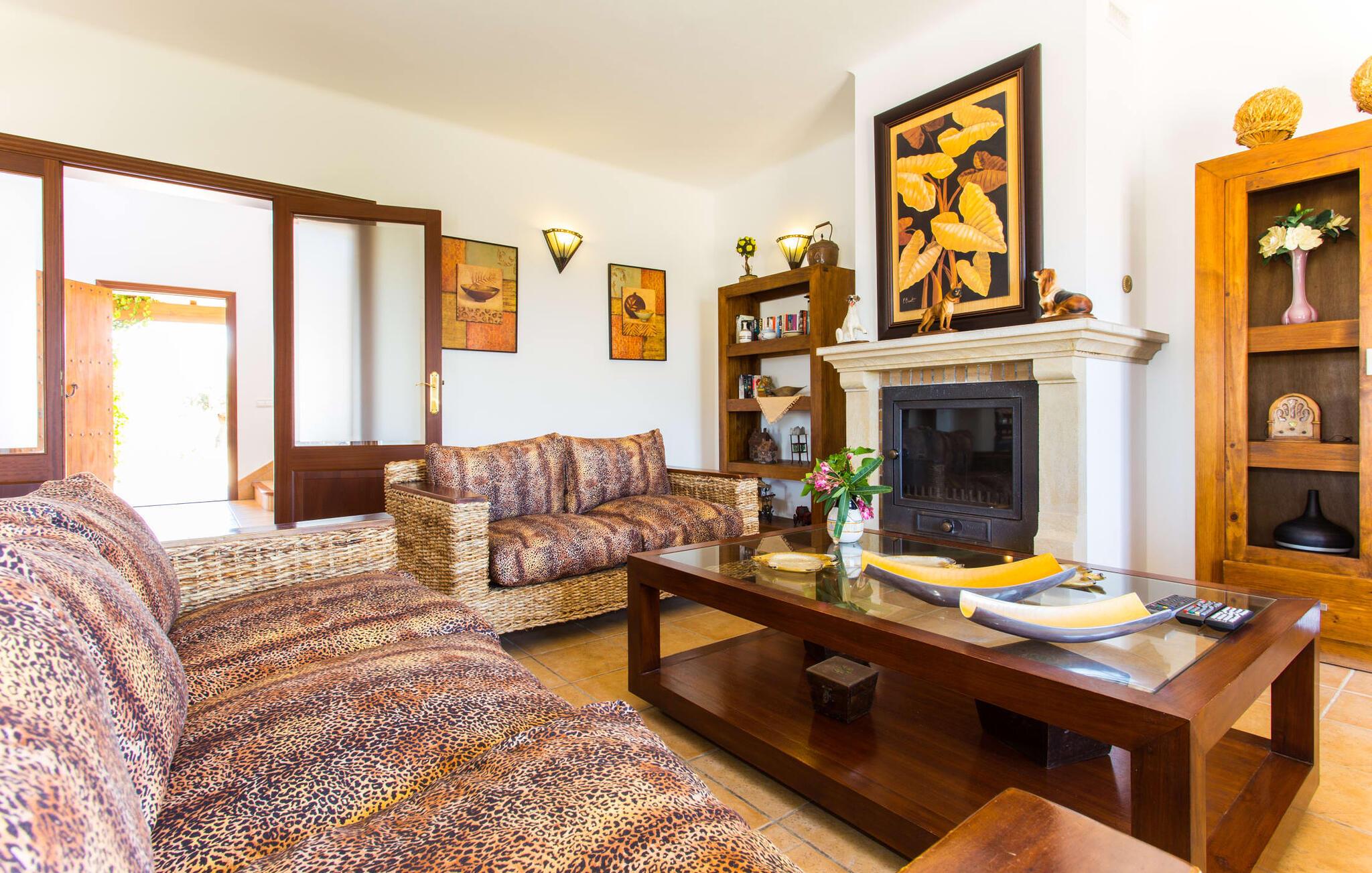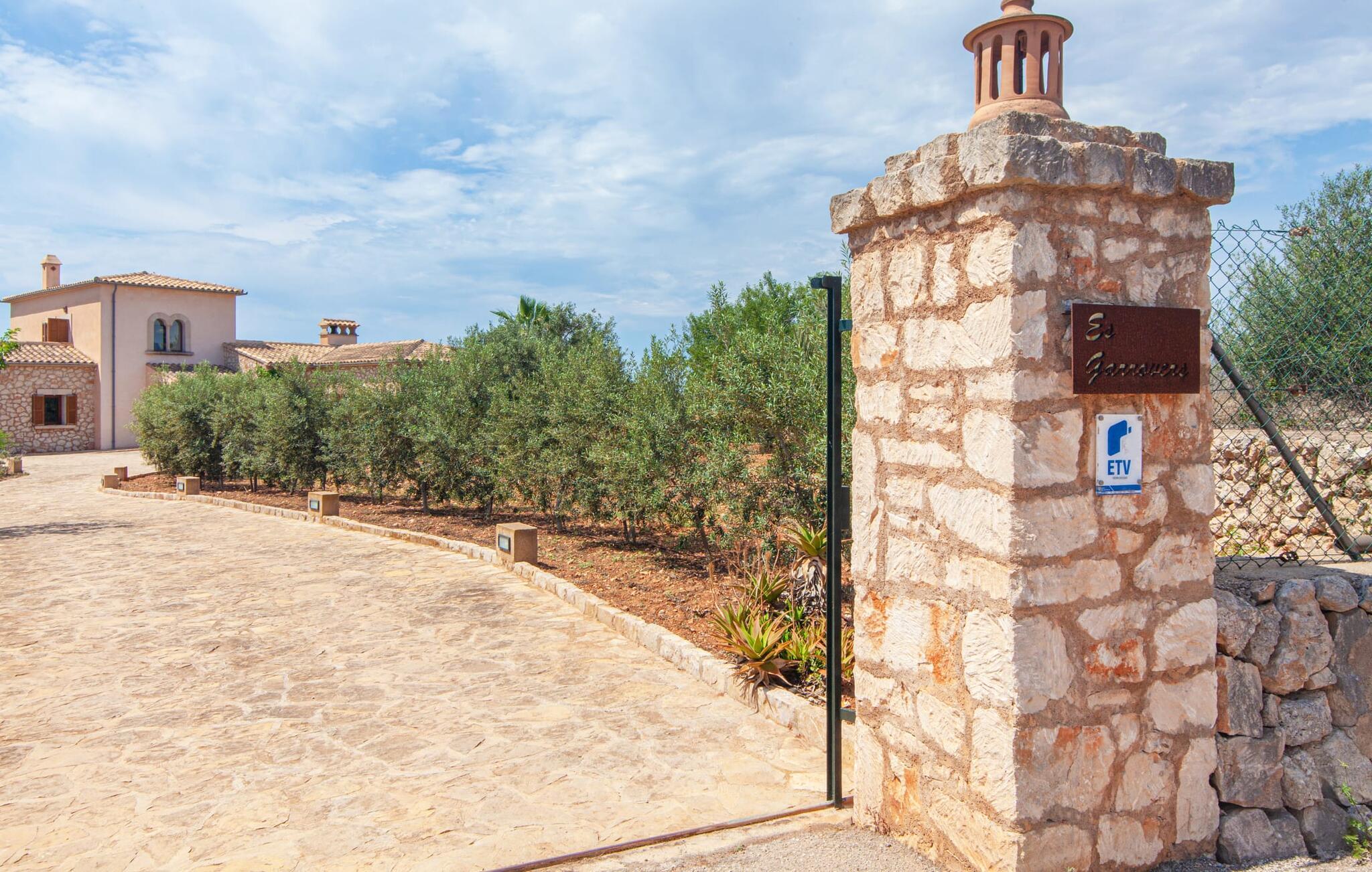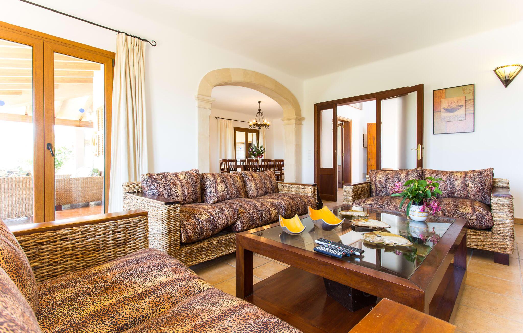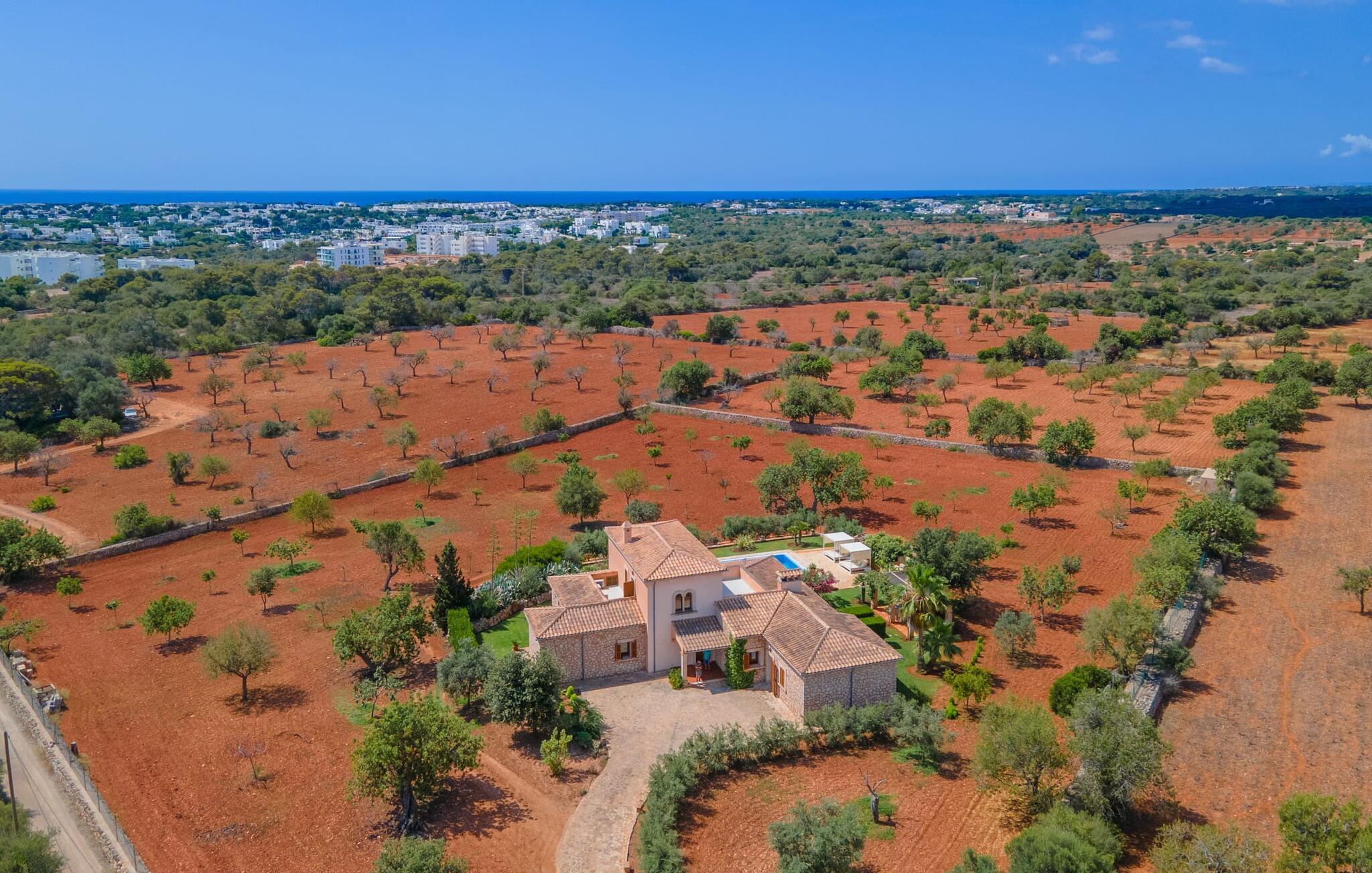 På en klar solskinsdag tager vi til villaen "Cas Fidever" efter at være blevet inviteret på en sightseeingtur af ejeren Miquel. Efter en dejlig køretur gennem landskabet omkring villaen er vi nysgerrige på ejendommen og bliver mødt med en varm velkomst. Det er et yderst smukt sommerhus og fremstår meget velholdt. Det første Miquel viser os er det utroligt alsidige udendørsområde. Ejendommen er omgivet af frodigt middelhavsgrønt og har nogle spektakulære områder til at tilbringe hele dagen udendørs, som vi bestemt skal se nærmere på. Mellem huset og poolen er der en stor overdækket terrasse, der omkranser en del af bygningen. Det er lidt forhøjet og byder på en fantastisk udsigt over poolen og haven. På den ene side af terrassen er der et stort, rustikt spisebord, på den anden side er der et opholdsområde med nogle meget behagelige rattanstole. Begge områder er indbydende på hver deres måde, alt efter om I vil spise behageligt udendørs eller slappe af med en kølig drink. I nærheden af spisebordet er der også et lille udekøkken med en muret grill, hvor I kan tilberede lækre måltider om aftenen. Udenfor i haven er der et luftigt, overdækket, pavillonlignende område - her kan I spille bordtennis. Efter et intenst spil bordtennis kan I skylle af i den praktiske udendørs bruser og derefter hoppe direkte ind i den luksuriøse swimmingpool, som er et rigtigt syn med sine udsmykkede flisetrin og mørkeblå trim. Bassinets dybde varierer mellem 1,20 m og 1,85 m. Når I er klar til at slappe af, kan I finde jer tilpas på græsplænen eller på de lidt mere behagelige liggestole ved poolkanten, evt. med parasoller. Og I skal nok finde en måde at afgøre, hvem der må ligge på den smukke udendørs daybed smukt placeret foran en bred naturstensmur. Nu er vi virkelig spændte på at se indersiden af dette hus. Er indersiden af villaen lige så smuk som det, vi lige har set her? Det er det bestemt! Det første, vi bemærker, er, hvor let og behagelig atmosfæren er her. De lyse hvide vægge i kombination med møblernes overvejende naturlige brune toner skaber en stemning af afslappet komfort, der tiltrækker og inviterer jer til at blive hængende. I stueetagen er der det primære opholds- og spiseområde, et stort køkken og tre smagfuldt indrettede soveværelser med aircondition samt tre moderne badeværelser. Sofaer med leopardtryk skaber en slags safaristemning i stuen, hvor I kan slappe af og læse lidt, lytte til musik, se en god film på tv eller surfe på internettet – her er mere end nok at lave. Og på køligere aftener bidrager en pejs til den hyggelige atmosfære. En bred stenbuegang fører til en ret statelig spiseplads, hvis I kunne tænke jer at nyde et lækkert måltid indendørs. Herfra er der kun få skridt til det rummelige køkken, som er fuldt udstyret med komfur, ovn, mikroovn, køleskab, opvaskemaskine, elkedel og Melitta kaffemaskine. Den er rummelig nok til, at flere personer kan tilberede gode måltider sammen. Der er endda plads til et ekstra spisebord, der komfortabelt kan rumme op til seks personer. Ovenpå er der endnu et indbydende, airconditioneret soveværelse med en-suite badeværelse og en lille tagterrasse med spektakulær udsigt. Placeringen af denne villa kunne ikke være bedre, da kystområdet omkring den sydlige spids af øen er spækket med unikke bugter med fine sandstrande, der skråner blidt ud i havet. Der er desuden en landevej ca. 300 m fra boligen, som giver mulighed for hurtigt at nå mange smukke udflugtsmål i området. Ud over Cala d'Or (4,5 km) er Santanyí (11 km) og S'Horta (4 km) større byer i nærheden, som begge byder på fremragende shoppingmuligheder. I er også meget tæt på "Parc natural de Mondragó", som med sine seværdigheder som sjældne orkideer og over 70 forskellige fuglearter gør dette naturreservat unikt og absolut et besøg værd. Villaen "Cas Fidever" ligger på en 9.000 m² stor grund i det sydlige Mallorcas landskab, direkte ved indgangen til Cala d'Or. Havet ligger kun godt en kilometer fra dette feriehus. Det er kun omkring 5 minutter i bil til det smukke feriested Cala d'Or, et dejligt sted at slentre eller spise i en af restauranterne. I umiddelbar nærhed er der talrige attraktive sandbugter som Cala Gran og Cala Esmeralda, hver mellem 4 og 5 km væk.