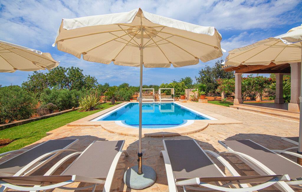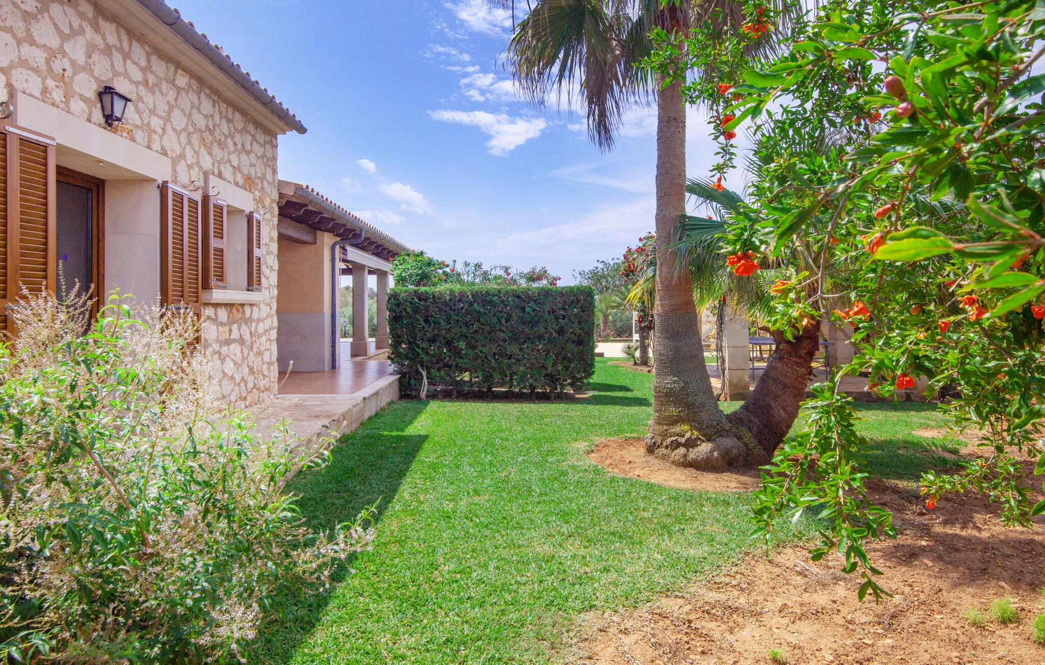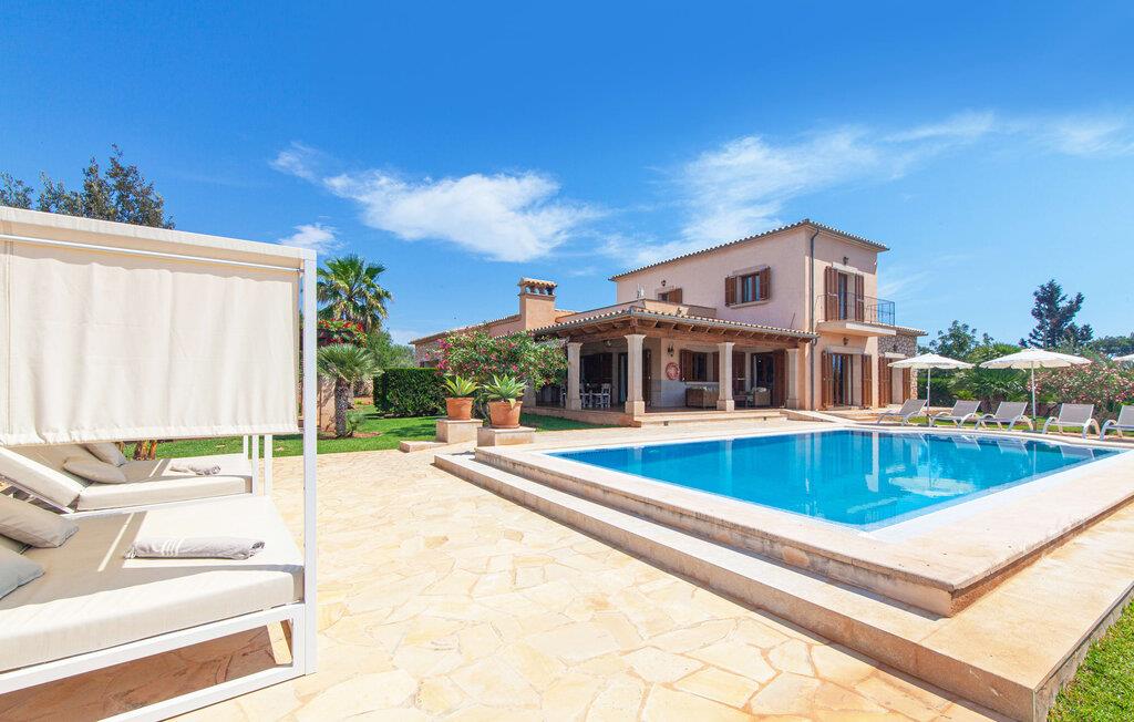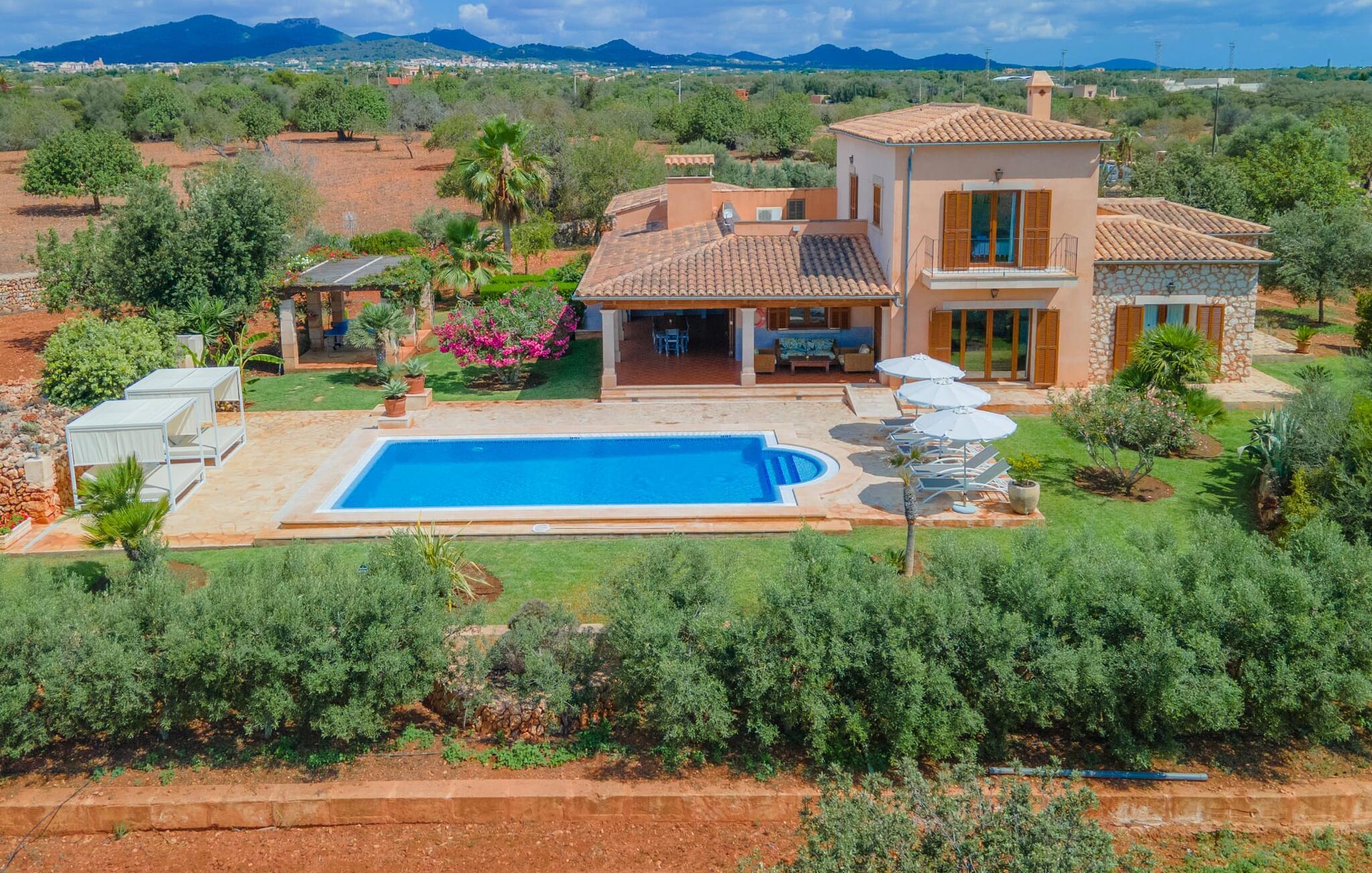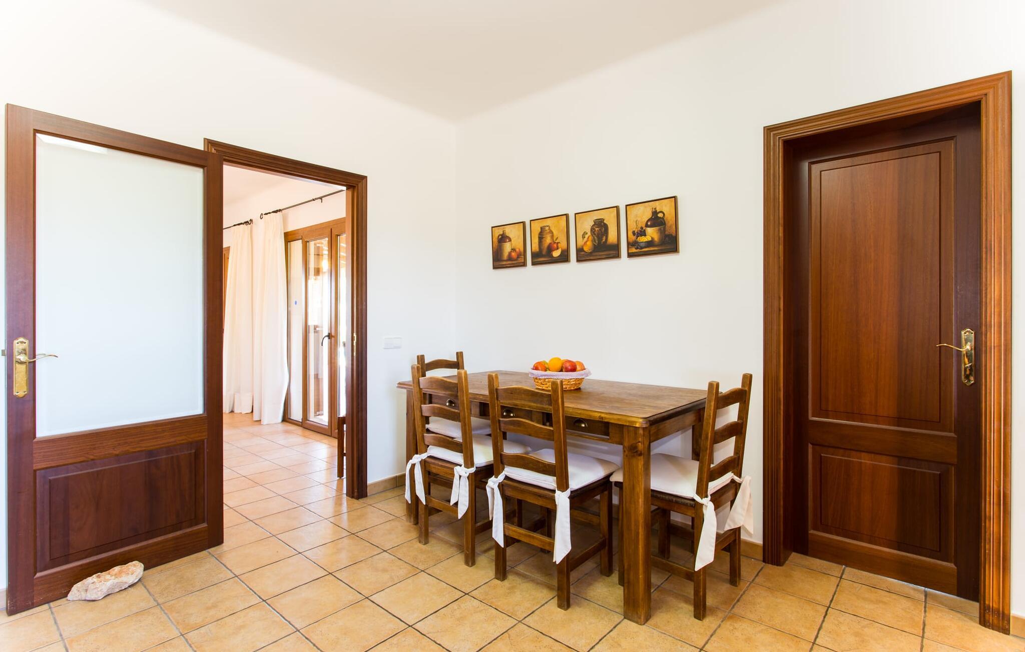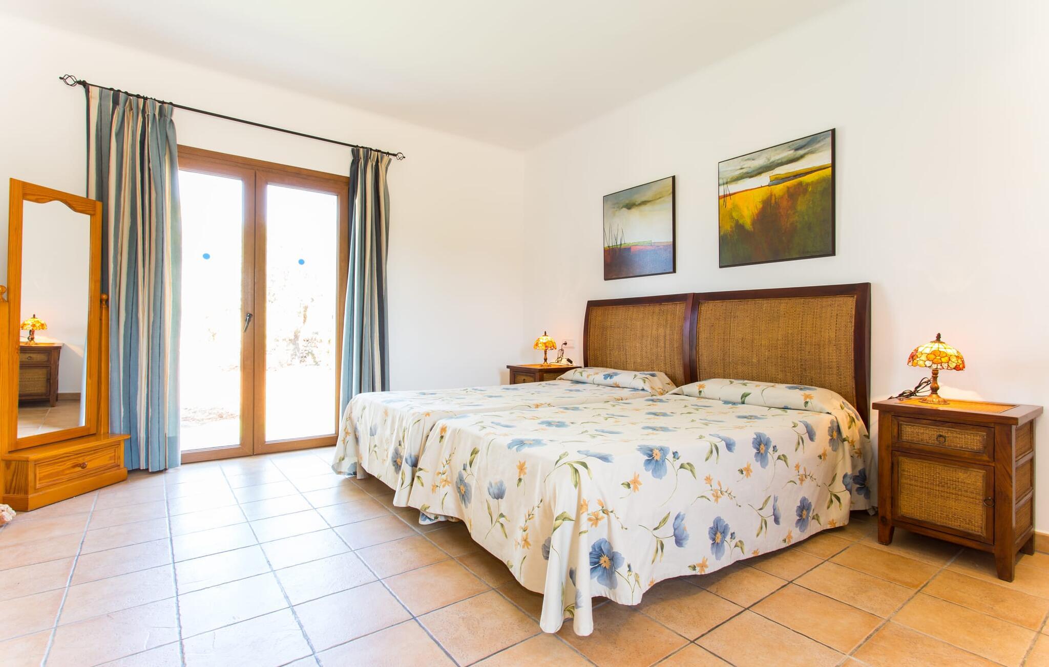 På en klar solskinsdag tager vi til villaen "Cas Fidever" efter at være blevet inviteret på en sightseeingtur af ejeren Miquel. Efter en dejlig køretur gennem landskabet omkring villaen er vi nysgerrige på ejendommen og bliver mødt med en varm velkomst. Det er et yderst smukt sommerhus og fremstår meget velholdt. Det første Miquel viser os er det utroligt alsidige udendørsområde. Ejendommen er omgivet af frodigt middelhavsgrønt og har nogle spektakulære områder til at tilbringe hele dagen udendørs, som vi bestemt skal se nærmere på. Mellem huset og poolen er der en stor overdækket terrasse, der omkranser en del af bygningen. Det er lidt forhøjet og byder på en fantastisk udsigt over poolen og haven. På den ene side af terrassen er der et stort, rustikt spisebord, på den anden side er der et opholdsområde med nogle meget behagelige rattanstole. Begge områder er indbydende på hver deres måde, alt efter om I vil spise behageligt udendørs eller slappe af med en kølig drink. I nærheden af spisebordet er der også et lille udekøkken med en muret grill, hvor I kan tilberede lækre måltider om aftenen. Udenfor i haven er der et luftigt, overdækket, pavillonlignende område - her kan I spille bordtennis. Efter et intenst spil bordtennis kan I skylle af i den praktiske udendørs bruser og derefter hoppe direkte ind i den luksuriøse swimmingpool, som er et rigtigt syn med sine udsmykkede flisetrin og mørkeblå trim. Bassinets dybde varierer mellem 1,20 m og 1,85 m. Når I er klar til at slappe af, kan I finde jer tilpas på græsplænen eller på de lidt mere behagelige liggestole ved poolkanten, evt. med parasoller. Og I skal nok finde en måde at afgøre, hvem der må ligge på den smukke udendørs daybed smukt placeret foran en bred naturstensmur. Nu er vi virkelig spændte på at se indersiden af dette hus. Er indersiden af villaen lige så smuk som det, vi lige har set her? Det er det bestemt! Det første, vi bemærker, er, hvor let og behagelig atmosfæren er her. De lyse hvide vægge i kombination med møblernes overvejende naturlige brune toner skaber en stemning af afslappet komfort, der tiltrækker og inviterer jer til at blive hængende. I stueetagen er der det primære opholds- og spiseområde, et stort køkken og tre smagfuldt indrettede soveværelser med aircondition samt tre moderne badeværelser. Sofaer med leopardtryk skaber en slags safaristemning i stuen, hvor I kan slappe af og læse lidt, lytte til musik, se en god film på tv eller surfe på internettet – her er mere end nok at lave. Og på køligere aftener bidrager en pejs til den hyggelige atmosfære. En bred stenbuegang fører til en ret statelig spiseplads, hvis I kunne tænke jer at nyde et lækkert måltid indendørs. Herfra er der kun få skridt til det rummelige køkken, som er fuldt udstyret med komfur, ovn, mikroovn, køleskab, opvaskemaskine, elkedel og Melitta kaffemaskine. Den er rummelig nok til, at flere personer kan tilberede gode måltider sammen. Der er endda plads til et ekstra spisebord, der komfortabelt kan rumme op til seks personer. Ovenpå er der endnu et indbydende, airconditioneret soveværelse med en-suite badeværelse og en lille tagterrasse med spektakulær udsigt. Placeringen af denne villa kunne ikke være bedre, da kystområdet omkring den sydlige spids af øen er spækket med unikke bugter med fine sandstrande, der skråner blidt ud i havet. Der er desuden en landevej ca. 300 m fra boligen, som giver mulighed for hurtigt at nå mange smukke udflugtsmål i området. Ud over Cala d'Or (4,5 km) er Santanyí (11 km) og S'Horta (4 km) større byer i nærheden, som begge byder på fremragende shoppingmuligheder. I er også meget tæt på "Parc natural de Mondragó", som med sine seværdigheder som sjældne orkideer og over 70 forskellige fuglearter gør dette naturreservat unikt og absolut et besøg værd. Villaen "Cas Fidever" ligger på en 9.000 m² stor grund i det sydlige Mallorcas landskab, direkte ved indgangen til Cala d'Or. Havet ligger kun godt en kilometer fra dette feriehus. Det er kun omkring 5 minutter i bil til det smukke feriested Cala d'Or, et dejligt sted at slentre eller spise i en af restauranterne. I umiddelbar nærhed er der talrige attraktive sandbugter som Cala Gran og Cala Esmeralda, hver mellem 4 og 5 km væk.