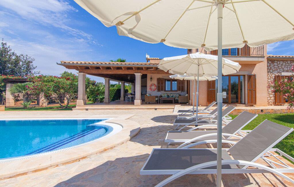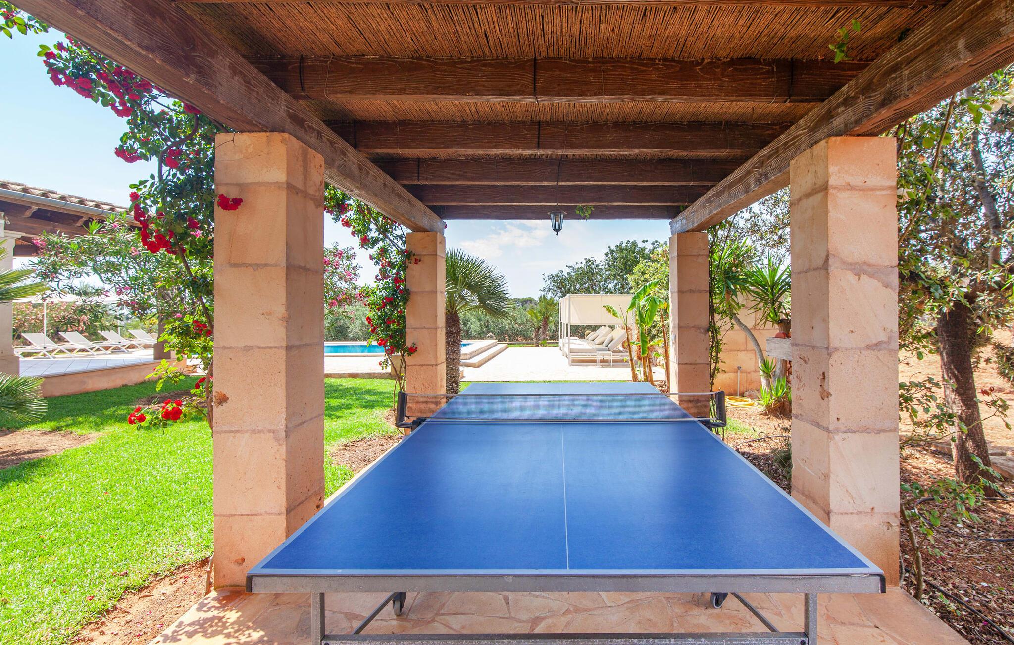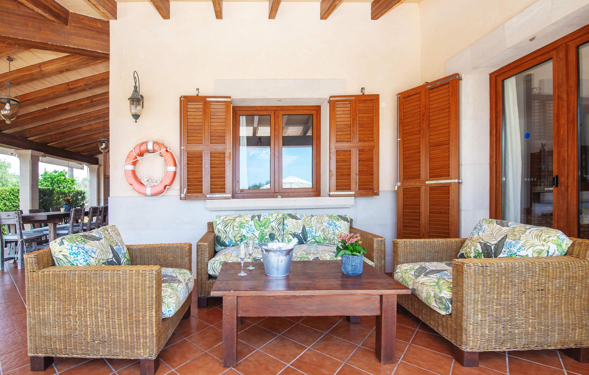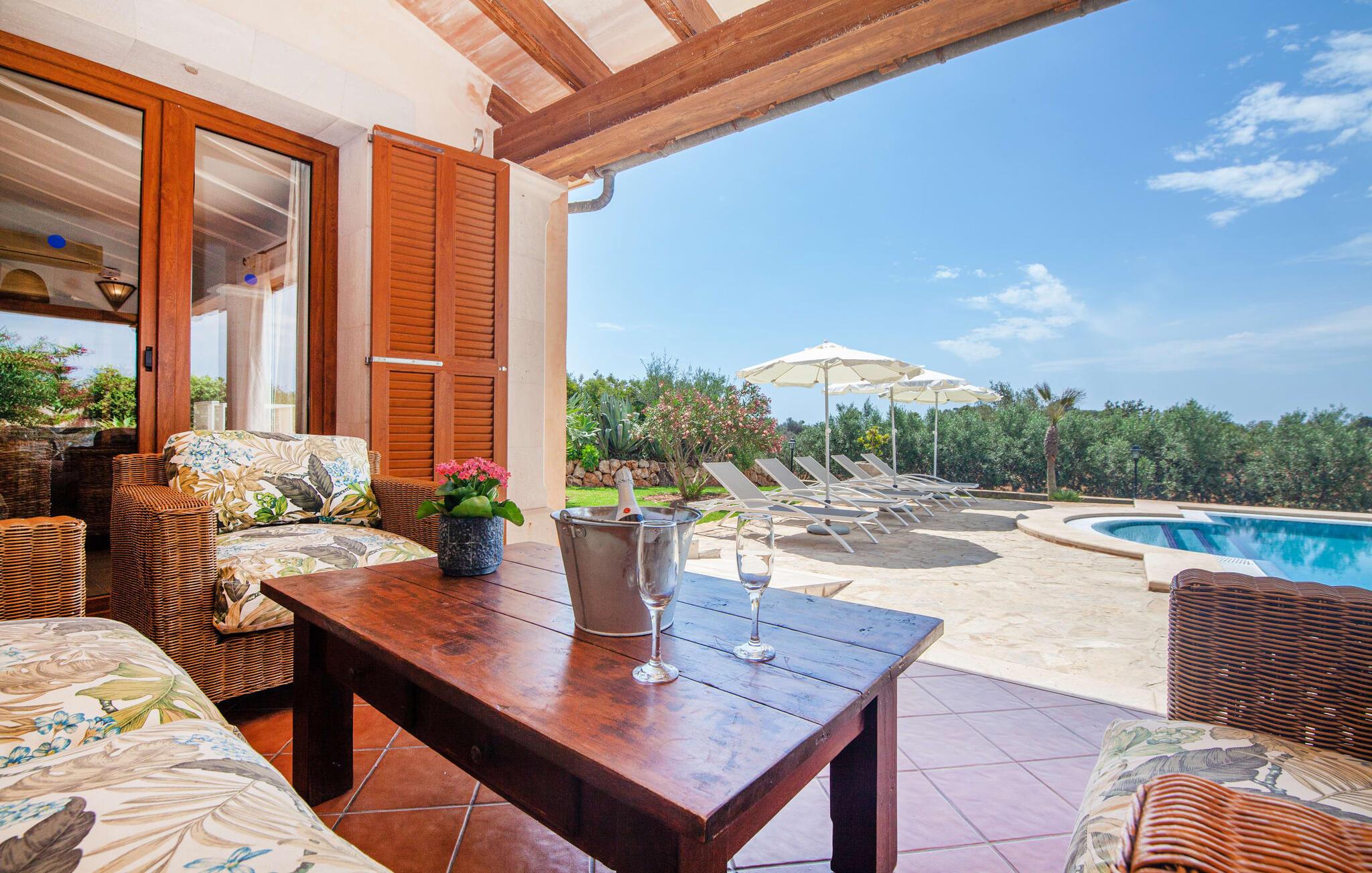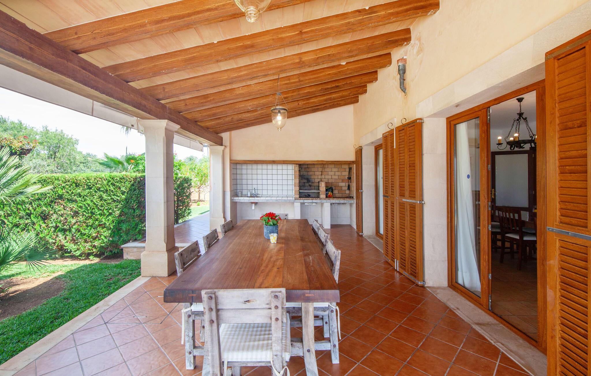 På en klar solskinsdag tager vi til villaen "Cas Fidever" efter at være blevet inviteret på en sightseeingtur af ejeren Miquel. Efter en dejlig køretur gennem landskabet omkring villaen er vi nysgerrige på ejendommen og bliver mødt med en varm velkomst. Det er et yderst smukt sommerhus og fremstår meget velholdt. Det første Miquel viser os er det utroligt alsidige udendørsområde. Ejendommen er omgivet af frodigt middelhavsgrønt og har nogle spektakulære områder til at tilbringe hele dagen udendørs, som vi bestemt skal se nærmere på. Mellem huset og poolen er der en stor overdækket terrasse, der omkranser en del af bygningen. Det er lidt forhøjet og byder på en fantastisk udsigt over poolen og haven. På den ene side af terrassen er der et stort, rustikt spisebord, på den anden side er der et opholdsområde med nogle meget behagelige rattanstole. Begge områder er indbydende på hver deres måde, alt efter om I vil spise behageligt udendørs eller slappe af med en kølig drink. I nærheden af spisebordet er der også et lille udekøkken med en muret grill, hvor I kan tilberede lækre måltider om aftenen. Udenfor i haven er der et luftigt, overdækket, pavillonlignende område - her kan I spille bordtennis. Efter et intenst spil bordtennis kan I skylle af i den praktiske udendørs bruser og derefter hoppe direkte ind i den luksuriøse swimmingpool, som er et rigtigt syn med sine udsmykkede flisetrin og mørkeblå trim. Bassinets dybde varierer mellem 1,20 m og 1,85 m. Når I er klar til at slappe af, kan I finde jer tilpas på græsplænen eller på de lidt mere behagelige liggestole ved poolkanten, evt. med parasoller. Og I skal nok finde en måde at afgøre, hvem der må ligge på den smukke udendørs daybed smukt placeret foran en bred naturstensmur. Nu er vi virkelig spændte på at se indersiden af dette hus. Er indersiden af villaen lige så smuk som det, vi lige har set her? Det er det bestemt! Det første, vi bemærker, er, hvor let og behagelig atmosfæren er her. De lyse hvide vægge i kombination med møblernes overvejende naturlige brune toner skaber en stemning af afslappet komfort, der tiltrækker og inviterer jer til at blive hængende. I stueetagen er der det primære opholds- og spiseområde, et stort køkken og tre smagfuldt indrettede soveværelser med aircondition samt tre moderne badeværelser. Sofaer med leopardtryk skaber en slags safaristemning i stuen, hvor I kan slappe af og læse lidt, lytte til musik, se en god film på tv eller surfe på internettet – her er mere end nok at lave. Og på køligere aftener bidrager en pejs til den hyggelige atmosfære. En bred stenbuegang fører til en ret statelig spiseplads, hvis I kunne tænke jer at nyde et lækkert måltid indendørs. Herfra er der kun få skridt til det rummelige køkken, som er fuldt udstyret med komfur, ovn, mikroovn, køleskab, opvaskemaskine, elkedel og Melitta kaffemaskine. Den er rummelig nok til, at flere personer kan tilberede gode måltider sammen. Der er endda plads til et ekstra spisebord, der komfortabelt kan rumme op til seks personer. Ovenpå er der endnu et indbydende, airconditioneret soveværelse med en-suite badeværelse og en lille tagterrasse med spektakulær udsigt. Placeringen af denne villa kunne ikke være bedre, da kystområdet omkring den sydlige spids af øen er spækket med unikke bugter med fine sandstrande, der skråner blidt ud i havet. Der er desuden en landevej ca. 300 m fra boligen, som giver mulighed for hurtigt at nå mange smukke udflugtsmål i området. Ud over Cala d'Or (4,5 km) er Santanyí (11 km) og S'Horta (4 km) større byer i nærheden, som begge byder på fremragende shoppingmuligheder. I er også meget tæt på "Parc natural de Mondragó", som med sine seværdigheder som sjældne orkideer og over 70 forskellige fuglearter gør dette naturreservat unikt og absolut et besøg værd. Villaen "Cas Fidever" ligger på en 9.000 m² stor grund i det sydlige Mallorcas landskab, direkte ved indgangen til Cala d'Or. Havet ligger kun godt en kilometer fra dette feriehus. Det er kun omkring 5 minutter i bil til det smukke feriested Cala d'Or, et dejligt sted at slentre eller spise i en af restauranterne. I umiddelbar nærhed er der talrige attraktive sandbugter som Cala Gran og Cala Esmeralda, hver mellem 4 og 5 km væk.