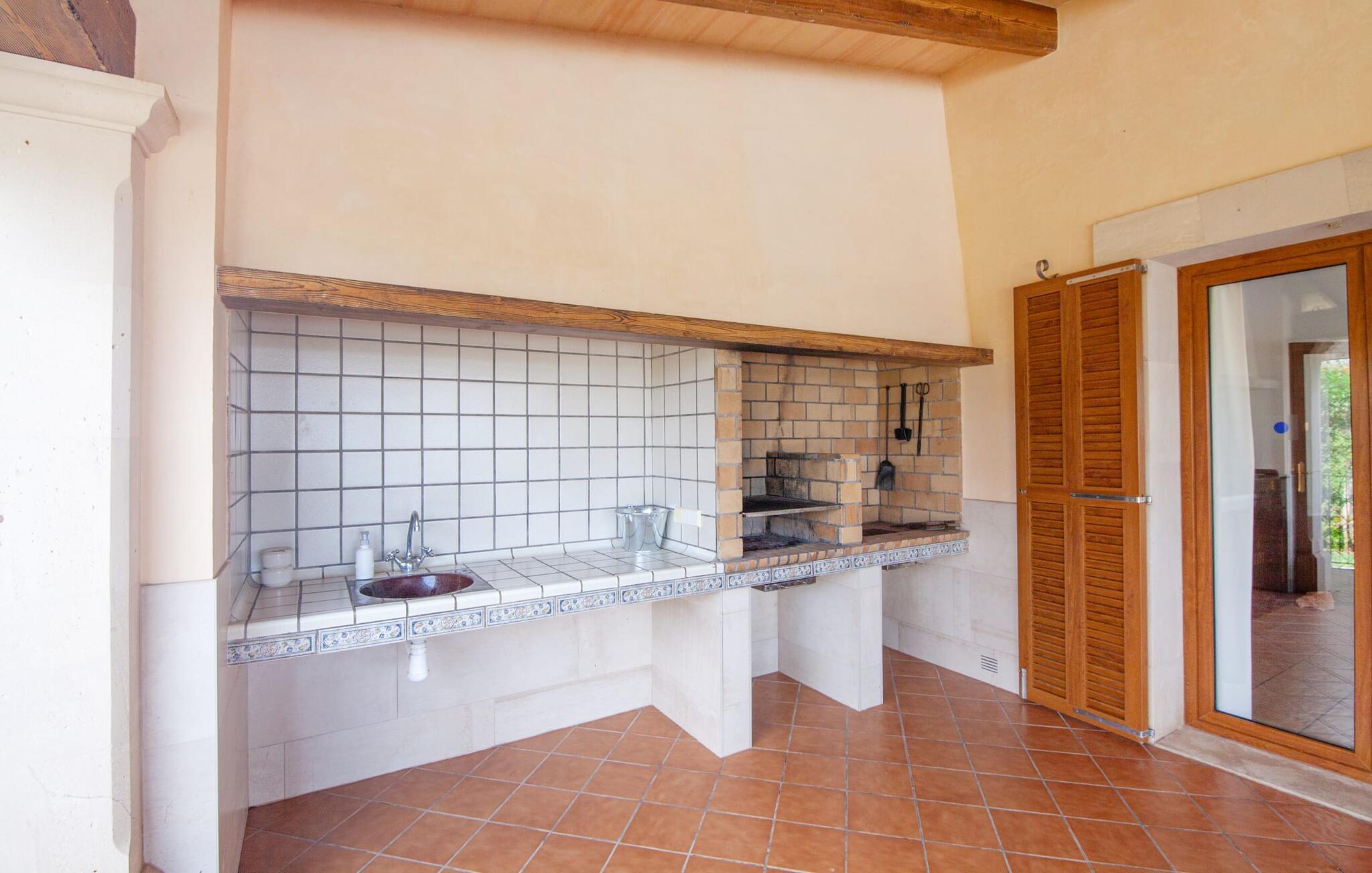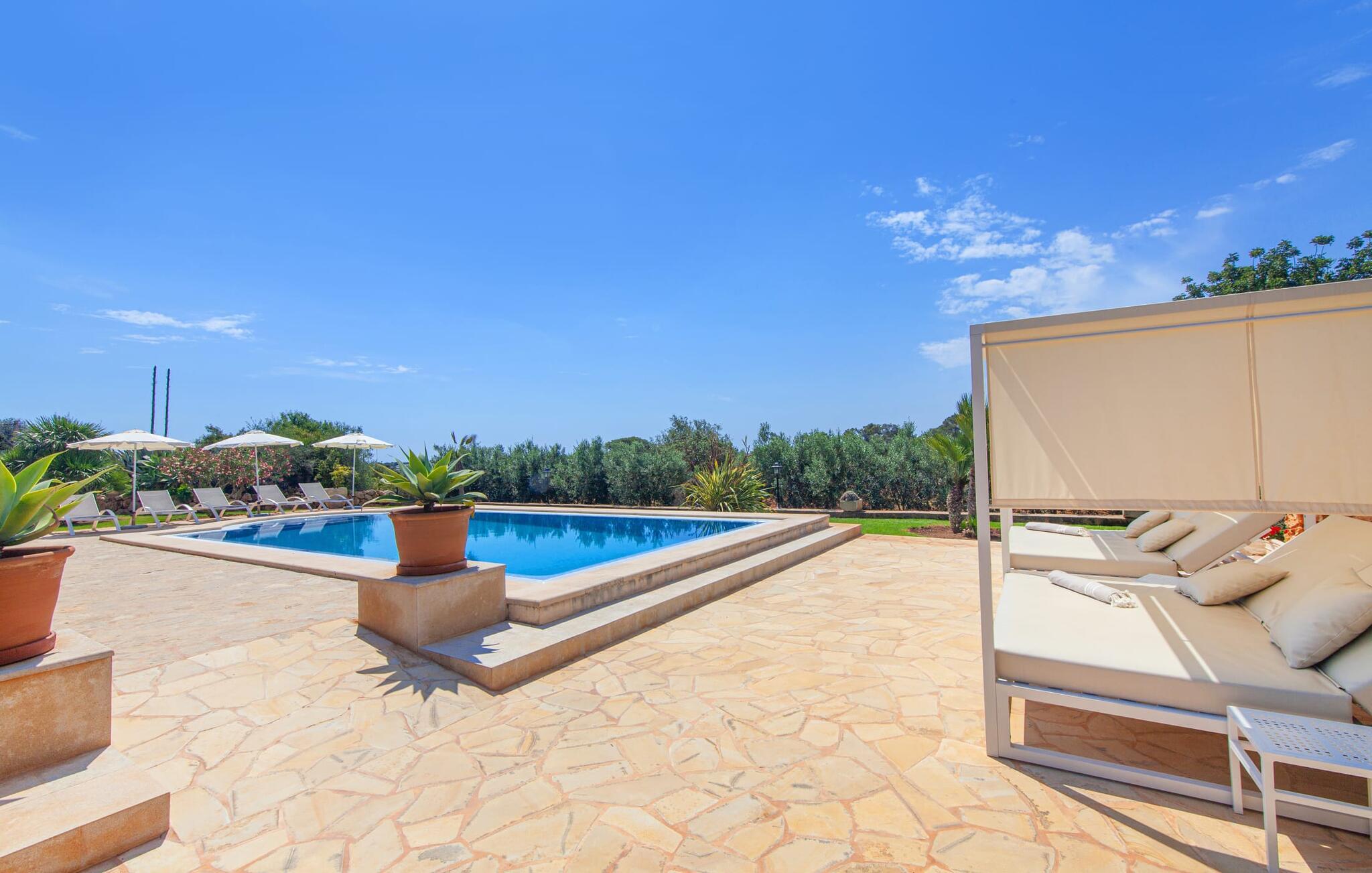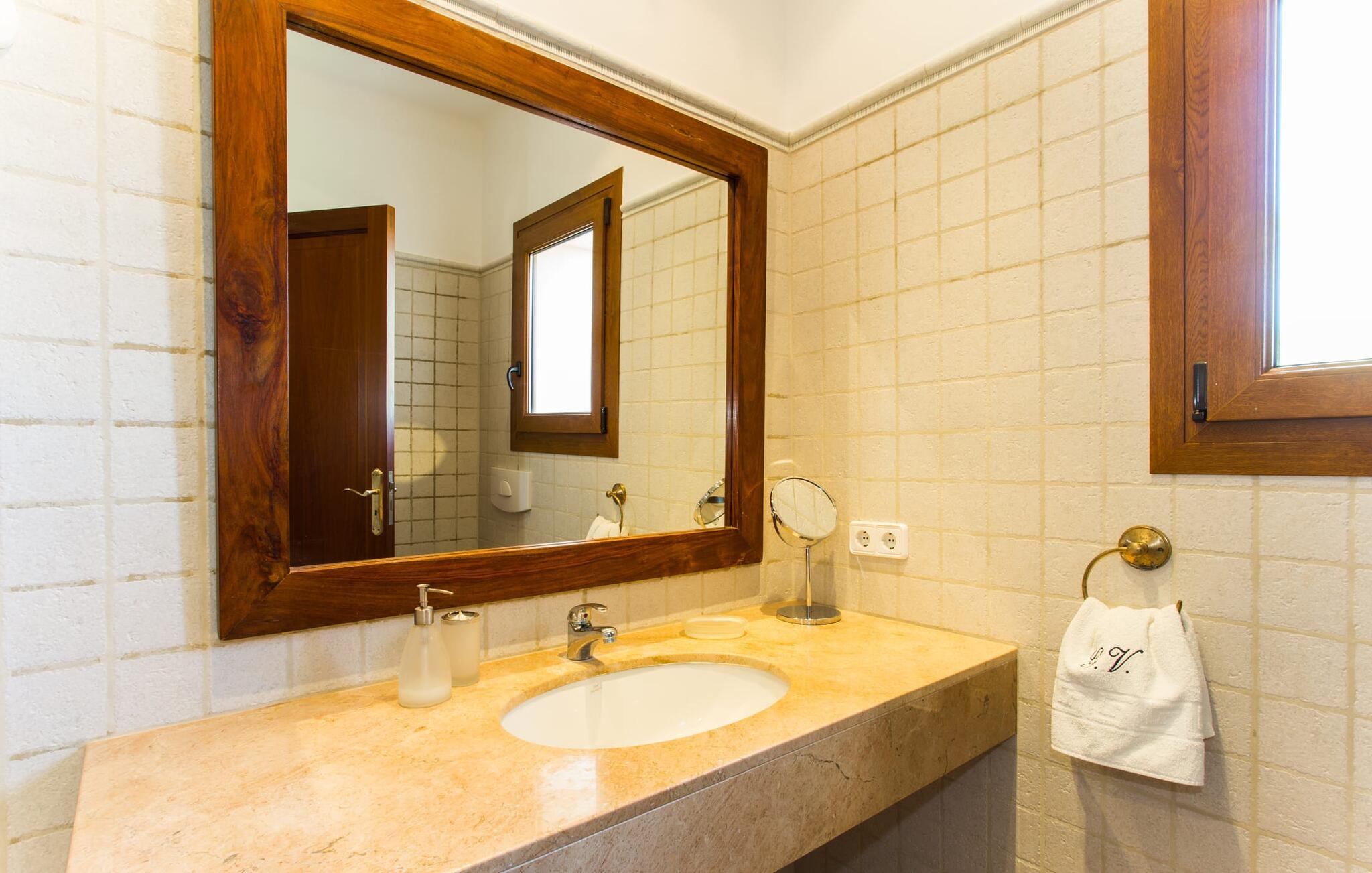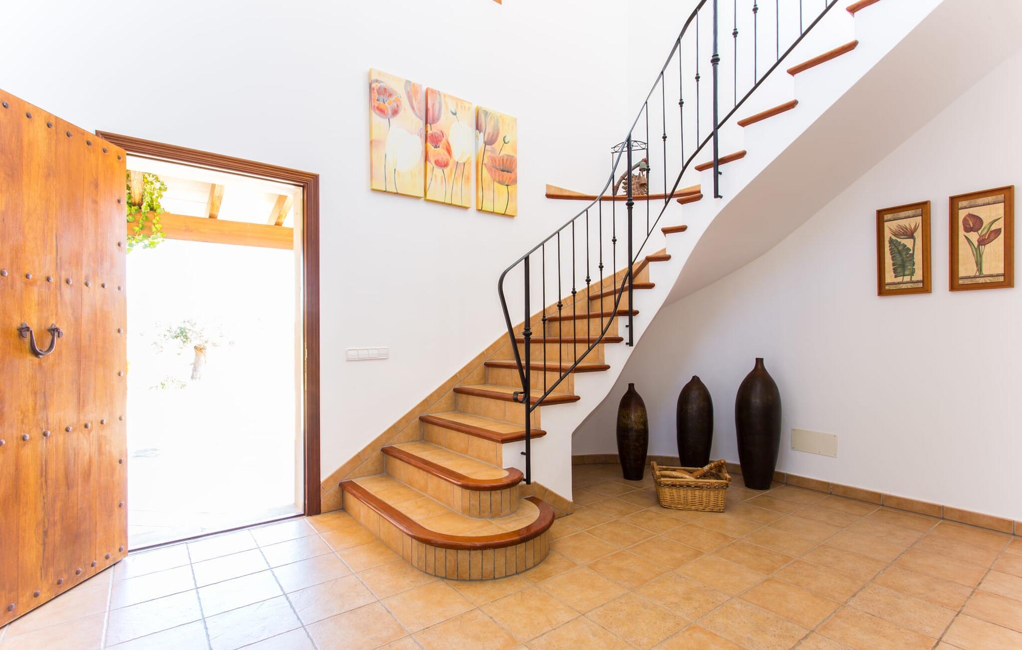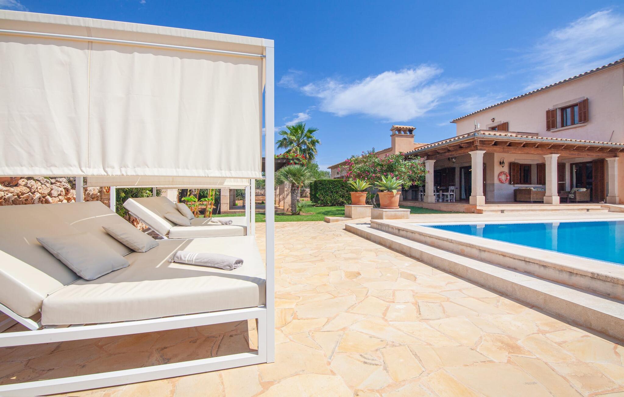 På en klar solskinsdag tager vi til villaen "Cas Fidever" efter at være blevet inviteret på en sightseeingtur af ejeren Miquel. Efter en dejlig køretur gennem landskabet omkring villaen er vi nysgerrige på ejendommen og bliver mødt med en varm velkomst. Det er et yderst smukt sommerhus og fremstår meget velholdt. Det første Miquel viser os er det utroligt alsidige udendørsområde. Ejendommen er omgivet af frodigt middelhavsgrønt og har nogle spektakulære områder til at tilbringe hele dagen udendørs, som vi bestemt skal se nærmere på. Mellem huset og poolen er der en stor overdækket terrasse, der omkranser en del af bygningen. Det er lidt forhøjet og byder på en fantastisk udsigt over poolen og haven. På den ene side af terrassen er der et stort, rustikt spisebord, på den anden side er der et opholdsområde med nogle meget behagelige rattanstole. Begge områder er indbydende på hver deres måde, alt efter om I vil spise behageligt udendørs eller slappe af med en kølig drink. I nærheden af spisebordet er der også et lille udekøkken med en muret grill, hvor I kan tilberede lækre måltider om aftenen. Udenfor i haven er der et luftigt, overdækket, pavillonlignende område - her kan I spille bordtennis. Efter et intenst spil bordtennis kan I skylle af i den praktiske udendørs bruser og derefter hoppe direkte ind i den luksuriøse swimmingpool, som er et rigtigt syn med sine udsmykkede flisetrin og mørkeblå trim. Bassinets dybde varierer mellem 1,20 m og 1,85 m. Når I er klar til at slappe af, kan I finde jer tilpas på græsplænen eller på de lidt mere behagelige liggestole ved poolkanten, evt. med parasoller. Og I skal nok finde en måde at afgøre, hvem der må ligge på den smukke udendørs daybed smukt placeret foran en bred naturstensmur. Nu er vi virkelig spændte på at se indersiden af dette hus. Er indersiden af villaen lige så smuk som det, vi lige har set her? Det er det bestemt! Det første, vi bemærker, er, hvor let og behagelig atmosfæren er her. De lyse hvide vægge i kombination med møblernes overvejende naturlige brune toner skaber en stemning af afslappet komfort, der tiltrækker og inviterer jer til at blive hængende. I stueetagen er der det primære opholds- og spiseområde, et stort køkken og tre smagfuldt indrettede soveværelser med aircondition samt tre moderne badeværelser. Sofaer med leopardtryk skaber en slags safaristemning i stuen, hvor I kan slappe af og læse lidt, lytte til musik, se en god film på tv eller surfe på internettet – her er mere end nok at lave. Og på køligere aftener bidrager en pejs til den hyggelige atmosfære. En bred stenbuegang fører til en ret statelig spiseplads, hvis I kunne tænke jer at nyde et lækkert måltid indendørs. Herfra er der kun få skridt til det rummelige køkken, som er fuldt udstyret med komfur, ovn, mikroovn, køleskab, opvaskemaskine, elkedel og Melitta kaffemaskine. Den er rummelig nok til, at flere personer kan tilberede gode måltider sammen. Der er endda plads til et ekstra spisebord, der komfortabelt kan rumme op til seks personer. Ovenpå er der endnu et indbydende, airconditioneret soveværelse med en-suite badeværelse og en lille tagterrasse med spektakulær udsigt. Placeringen af denne villa kunne ikke være bedre, da kystområdet omkring den sydlige spids af øen er spækket med unikke bugter med fine sandstrande, der skråner blidt ud i havet. Der er desuden en landevej ca. 300 m fra boligen, som giver mulighed for hurtigt at nå mange smukke udflugtsmål i området. Ud over Cala d'Or (4,5 km) er Santanyí (11 km) og S'Horta (4 km) større byer i nærheden, som begge byder på fremragende shoppingmuligheder. I er også meget tæt på "Parc natural de Mondragó", som med sine seværdigheder som sjældne orkideer og over 70 forskellige fuglearter gør dette naturreservat unikt og absolut et besøg værd. Villaen "Cas Fidever" ligger på en 9.000 m² stor grund i det sydlige Mallorcas landskab, direkte ved indgangen til Cala d'Or. Havet ligger kun godt en kilometer fra dette feriehus. Det er kun omkring 5 minutter i bil til det smukke feriested Cala d'Or, et dejligt sted at slentre eller spise i en af restauranterne. I umiddelbar nærhed er der talrige attraktive sandbugter som Cala Gran og Cala Esmeralda, hver mellem 4 og 5 km væk.