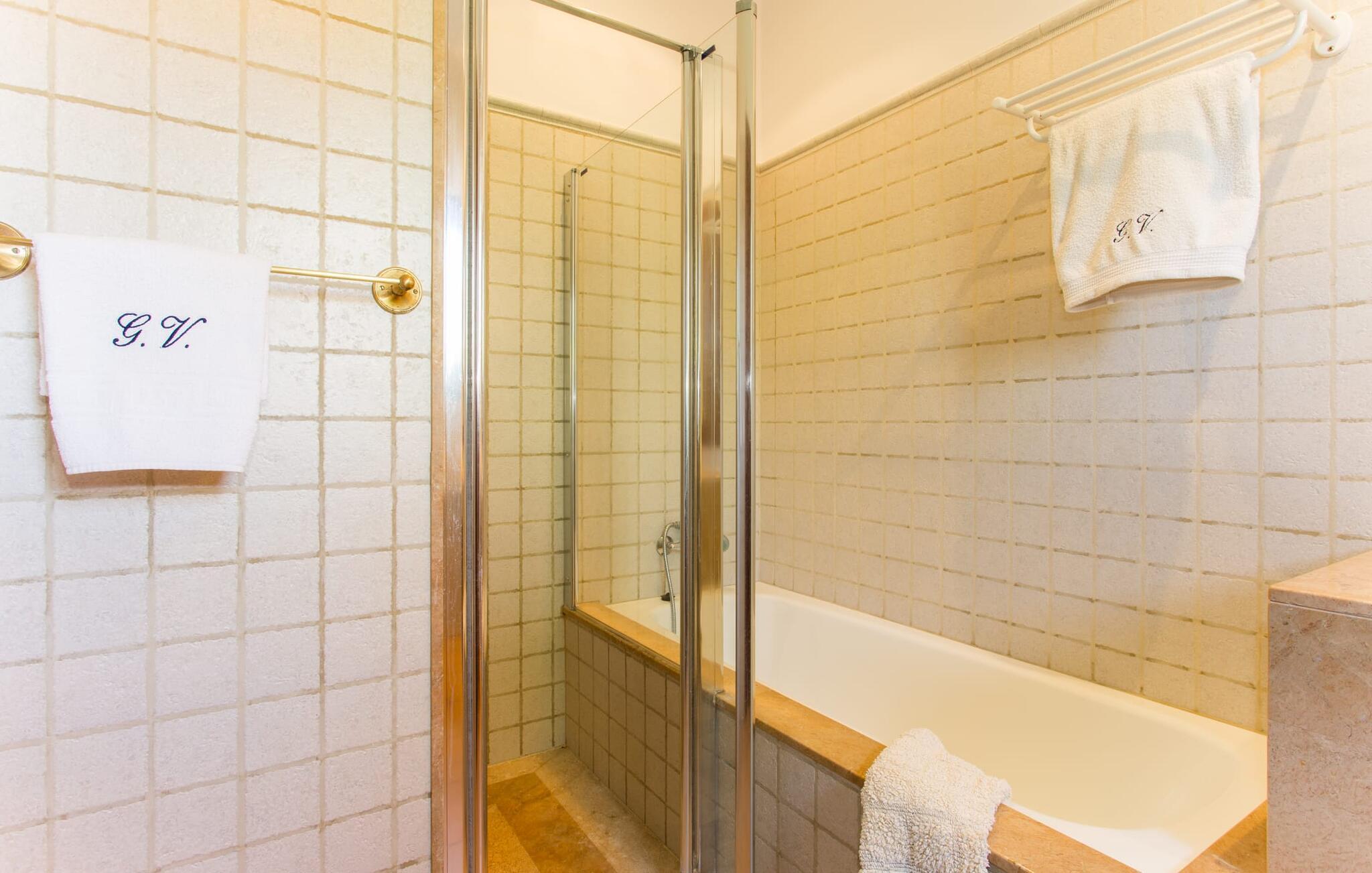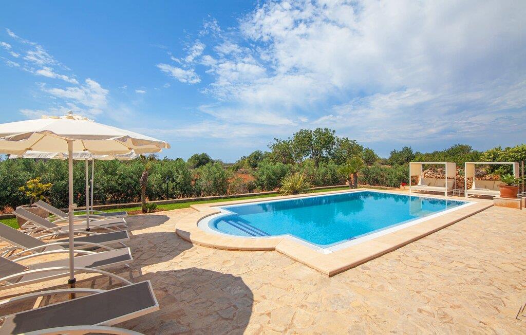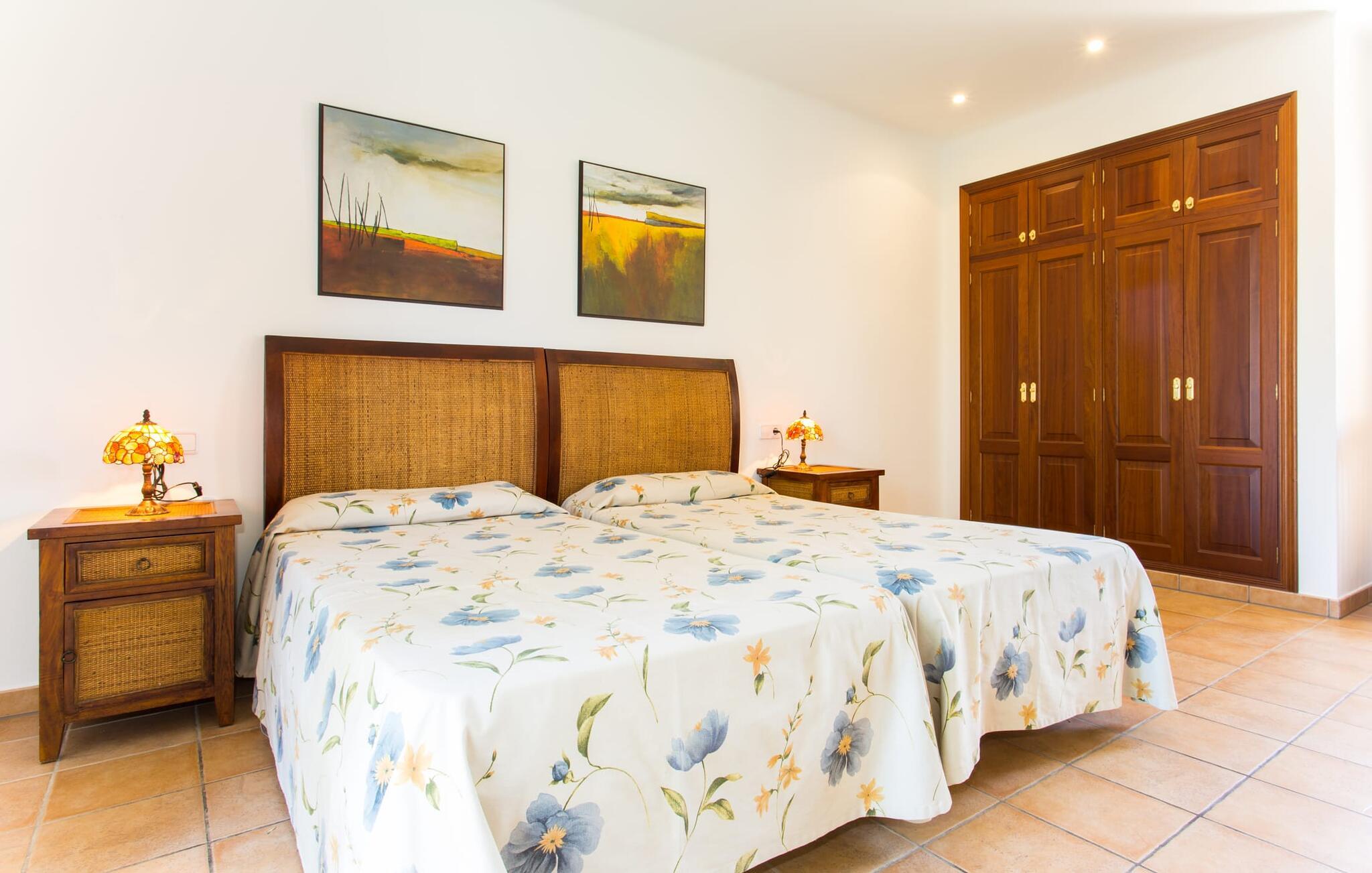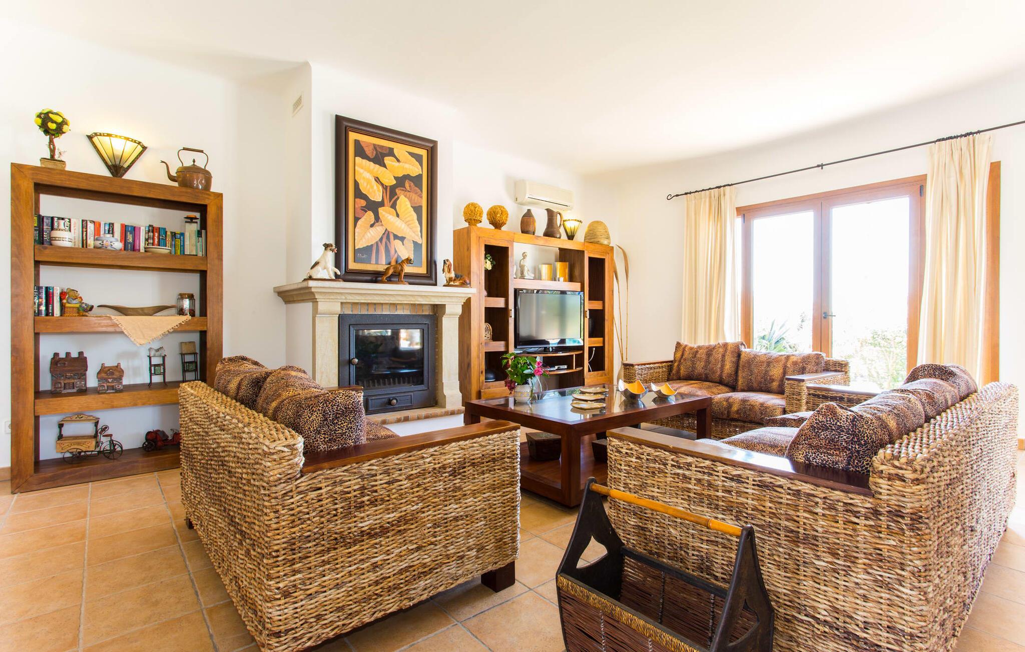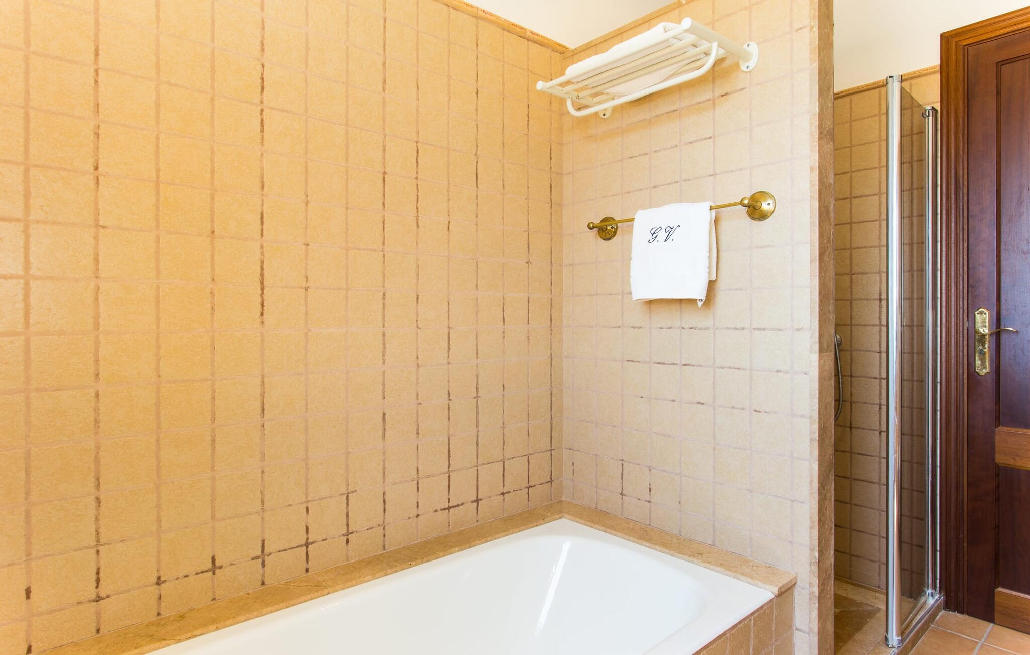 På en klar solskinsdag tager vi til villaen "Cas Fidever" efter at være blevet inviteret på en sightseeingtur af ejeren Miquel. Efter en dejlig køretur gennem landskabet omkring villaen er vi nysgerrige på ejendommen og bliver mødt med en varm velkomst. Det er et yderst smukt sommerhus og fremstår meget velholdt. Det første Miquel viser os er det utroligt alsidige udendørsområde. Ejendommen er omgivet af frodigt middelhavsgrønt og har nogle spektakulære områder til at tilbringe hele dagen udendørs, som vi bestemt skal se nærmere på. Mellem huset og poolen er der en stor overdækket terrasse, der omkranser en del af bygningen. Det er lidt forhøjet og byder på en fantastisk udsigt over poolen og haven. På den ene side af terrassen er der et stort, rustikt spisebord, på den anden side er der et opholdsområde med nogle meget behagelige rattanstole. Begge områder er indbydende på hver deres måde, alt efter om I vil spise behageligt udendørs eller slappe af med en kølig drink. I nærheden af spisebordet er der også et lille udekøkken med en muret grill, hvor I kan tilberede lækre måltider om aftenen. Udenfor i haven er der et luftigt, overdækket, pavillonlignende område - her kan I spille bordtennis. Efter et intenst spil bordtennis kan I skylle af i den praktiske udendørs bruser og derefter hoppe direkte ind i den luksuriøse swimmingpool, som er et rigtigt syn med sine udsmykkede flisetrin og mørkeblå trim. Bassinets dybde varierer mellem 1,20 m og 1,85 m. Når I er klar til at slappe af, kan I finde jer tilpas på græsplænen eller på de lidt mere behagelige liggestole ved poolkanten, evt. med parasoller. Og I skal nok finde en måde at afgøre, hvem der må ligge på den smukke udendørs daybed smukt placeret foran en bred naturstensmur. Nu er vi virkelig spændte på at se indersiden af dette hus. Er indersiden af villaen lige så smuk som det, vi lige har set her? Det er det bestemt! Det første, vi bemærker, er, hvor let og behagelig atmosfæren er her. De lyse hvide vægge i kombination med møblernes overvejende naturlige brune toner skaber en stemning af afslappet komfort, der tiltrækker og inviterer jer til at blive hængende. I stueetagen er der det primære opholds- og spiseområde, et stort køkken og tre smagfuldt indrettede soveværelser med aircondition samt tre moderne badeværelser. Sofaer med leopardtryk skaber en slags safaristemning i stuen, hvor I kan slappe af og læse lidt, lytte til musik, se en god film på tv eller surfe på internettet – her er mere end nok at lave. Og på køligere aftener bidrager en pejs til den hyggelige atmosfære. En bred stenbuegang fører til en ret statelig spiseplads, hvis I kunne tænke jer at nyde et lækkert måltid indendørs. Herfra er der kun få skridt til det rummelige køkken, som er fuldt udstyret med komfur, ovn, mikroovn, køleskab, opvaskemaskine, elkedel og Melitta kaffemaskine. Den er rummelig nok til, at flere personer kan tilberede gode måltider sammen. Der er endda plads til et ekstra spisebord, der komfortabelt kan rumme op til seks personer. Ovenpå er der endnu et indbydende, airconditioneret soveværelse med en-suite badeværelse og en lille tagterrasse med spektakulær udsigt. Placeringen af denne villa kunne ikke være bedre, da kystområdet omkring den sydlige spids af øen er spækket med unikke bugter med fine sandstrande, der skråner blidt ud i havet. Der er desuden en landevej ca. 300 m fra boligen, som giver mulighed for hurtigt at nå mange smukke udflugtsmål i området. Ud over Cala d'Or (4,5 km) er Santanyí (11 km) og S'Horta (4 km) større byer i nærheden, som begge byder på fremragende shoppingmuligheder. I er også meget tæt på "Parc natural de Mondragó", som med sine seværdigheder som sjældne orkideer og over 70 forskellige fuglearter gør dette naturreservat unikt og absolut et besøg værd. Villaen "Cas Fidever" ligger på en 9.000 m² stor grund i det sydlige Mallorcas landskab, direkte ved indgangen til Cala d'Or. Havet ligger kun godt en kilometer fra dette feriehus. Det er kun omkring 5 minutter i bil til det smukke feriested Cala d'Or, et dejligt sted at slentre eller spise i en af restauranterne. I umiddelbar nærhed er der talrige attraktive sandbugter som Cala Gran og Cala Esmeralda, hver mellem 4 og 5 km væk.