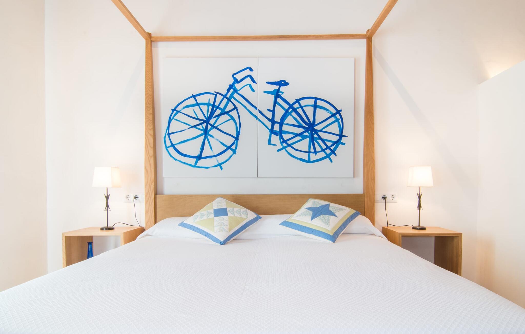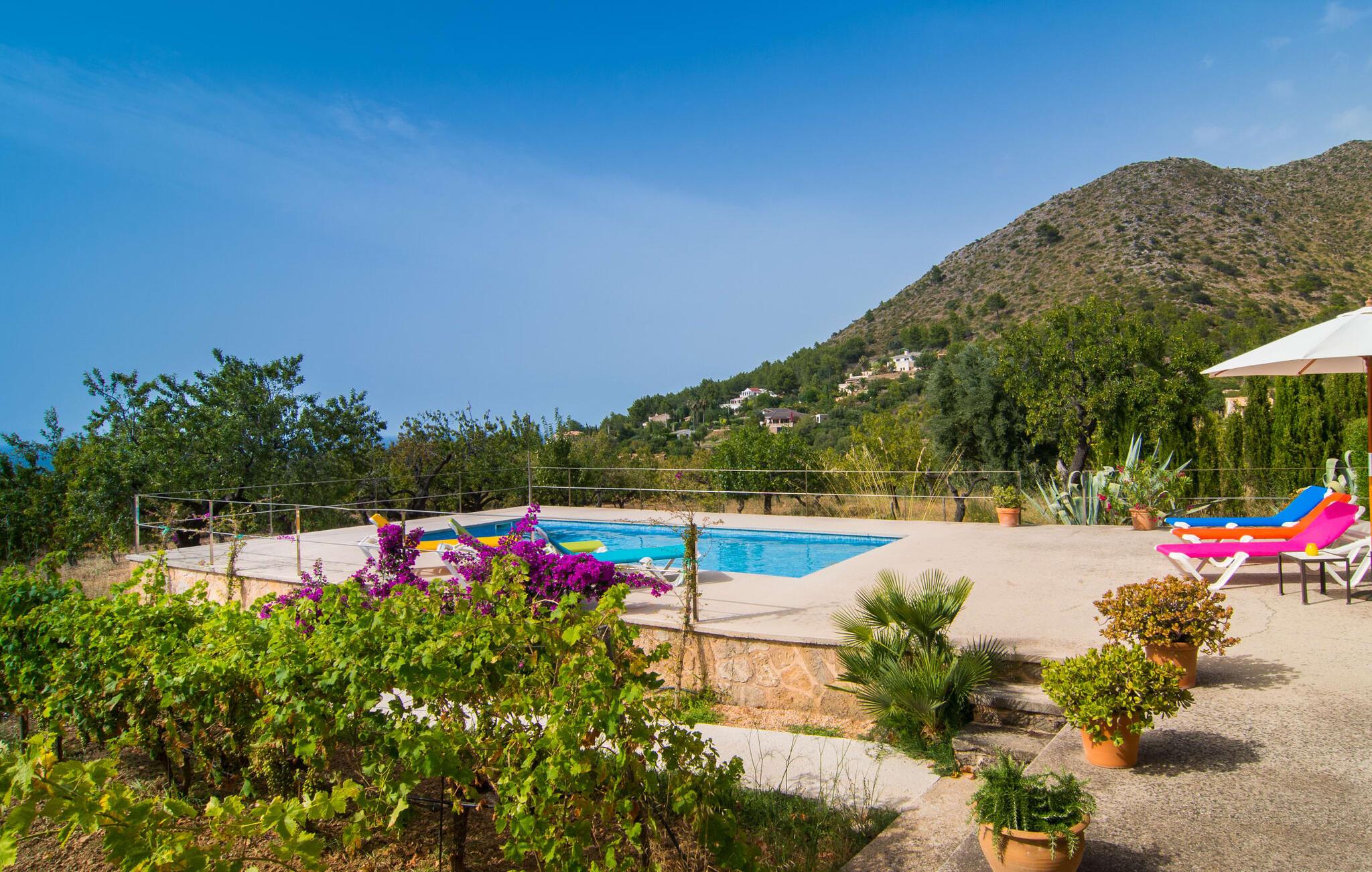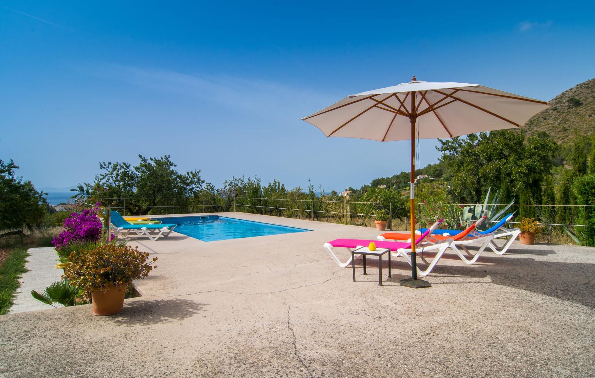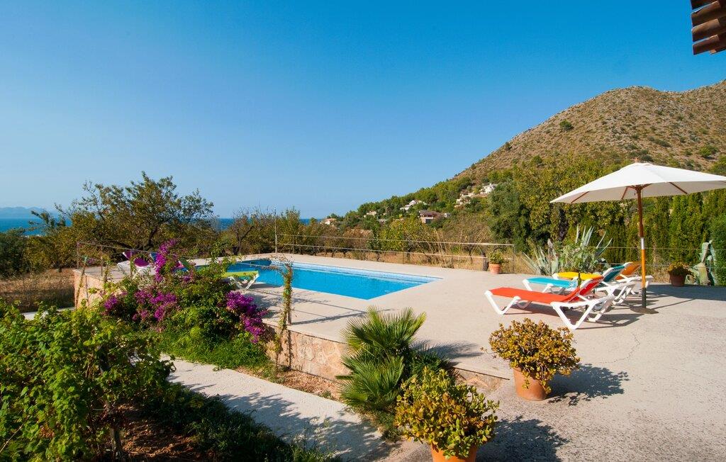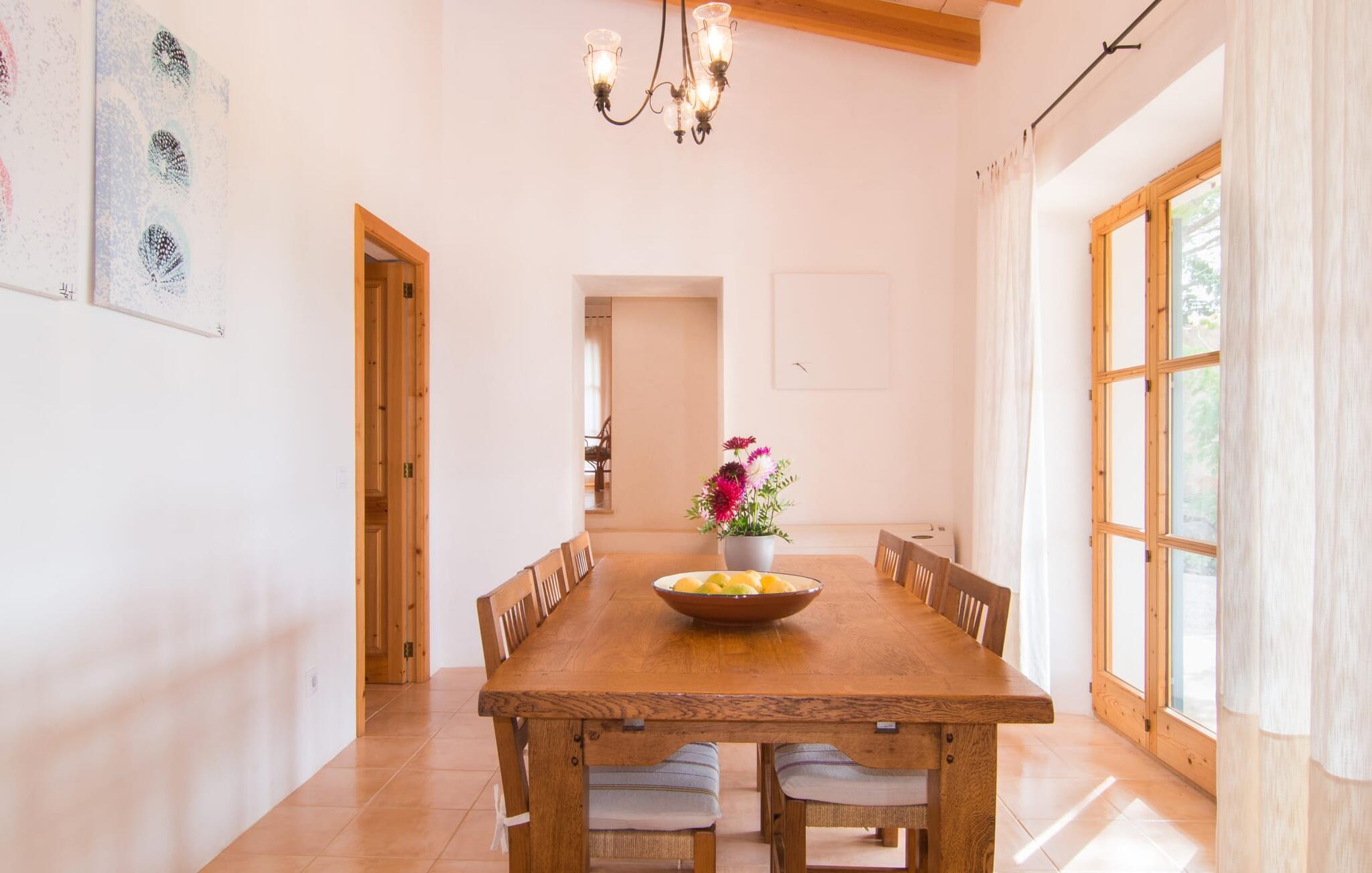 Den attraktive etplansvilla "Cas Forner" smelter harmonisk ind i det omgivende landskab og ligger for foden af en imponerende skråning og kun få minutters gang fra Colonia des Sant Pere. Det smagfulde udendørsområde er primært præget af vinstokke, oliven- og mandeltræer samt et rummeligt terrasseområde, der byder på en række muligheder for et attraktivt udendørs ophold. Den 8 x 4 m store pool strækker sig til horisonten og er omgivet af en smuk loungeterrasse. Poolen er meget let tilgængelig via trapper. Seks komfortable liggestole inviterer dig til at slappe af under den mallorcanske sol. Her kan du nyde absolut fred. Bliver UV-strålingen for kraftig, er du velkommen til at bruge de to tilgængelige parasoller. Et andet lille højdepunkt er det lille, overdækkede grillhus, som inviterer til kulinariske grillceremonier på lune aftener. Under en grill som denne kan man som ved alle andre måltider sidde på den overdækkede del af terrassen lige ved siden af huset og nyde den vidunderlige udsigt i godt selskab. Dette er et Fincallorca feriehus. Man træder ind i huset fra terrassen og ender straks i den rummelige spiseplads, udstyret med et solidt bord til seks personer, som igen giver direkte adgang til køkkenet. På den anden side er den lyst designede stue med et behageligt sofaområde og pejs. Her er også fladskærms-tv med satellitforbindelse installeret. Rumdesignets åbne stil, som også kan ses på øverste etage, formidler et særligt og meget behageligt indtryk af rum og generøsitet. De lette vægge og gulve samt det æstetiske synlige bjælkeloft forstærker denne atmosfære. Det typiske mallorcanske køkken, delvist i mursten, er udstyret med alt hvad du har brug for hver dag, inklusive en kedel og filterkaffemaskine. Tre moderne og lyst møblerede soveværelser repræsenterer klarhed og ro i deres design. Uden en masse distraherende tilbehør kan du finde den fred og ro, du har ledt efter. Gæsterne har adgang til en seng, der måler 1,80 x 2,00 m og fire senge, der måler 0,90 x 2,00 m. Et af soveværelserne er udstyret med åbent en-suite badeværelse, som igen er udstyret med håndvask, toilet, bidet, bruser og badekar. De to andre soveværelser deler endnu et badeværelse med to håndvaske, toilet, bidet og bruser. Et strygejern og en hårtørrer er til rådighed i huset, så du ikke behøver at medbringe dit eget. Colonia de Sant Pere er et ret roligt sted i kommunen Artà, skånet for masseturisme. Det ligger på den østlige udkant af Alcúdia-bugten. Ved fiskerihavnen finder du en smuk promenade med flere gode restauranter og cafeer. Kysten her er stenet og flad. Den lokale strand ved siden af havnen er kunstigt genopfyldt og godt beskyttet af bølgebrydere. Omkring Colonia de Sant Pere og nabobyen Betlem finder du andre stille sandede og klippefyldte bugter med klart, turkisblåt vand. De maleriske omgivelser i Colonia byder på adskillige aktivitetsmuligheder for både mountainbikere og vandrefans. Kun en kilometer fra havet og beliggende i bakken finder du villaen med havudsigt "Cas Forner". Fra hele komplekset har du en vidunderlig udsigt over Alcúdia-bugten. I Colonia de Sant Pere finder du gode indkøbsmuligheder, en promenade med indbydende restauranter og en lille yacht og fiskerihavn. Den beskyttede sandstrand er ideel for familier med børn.