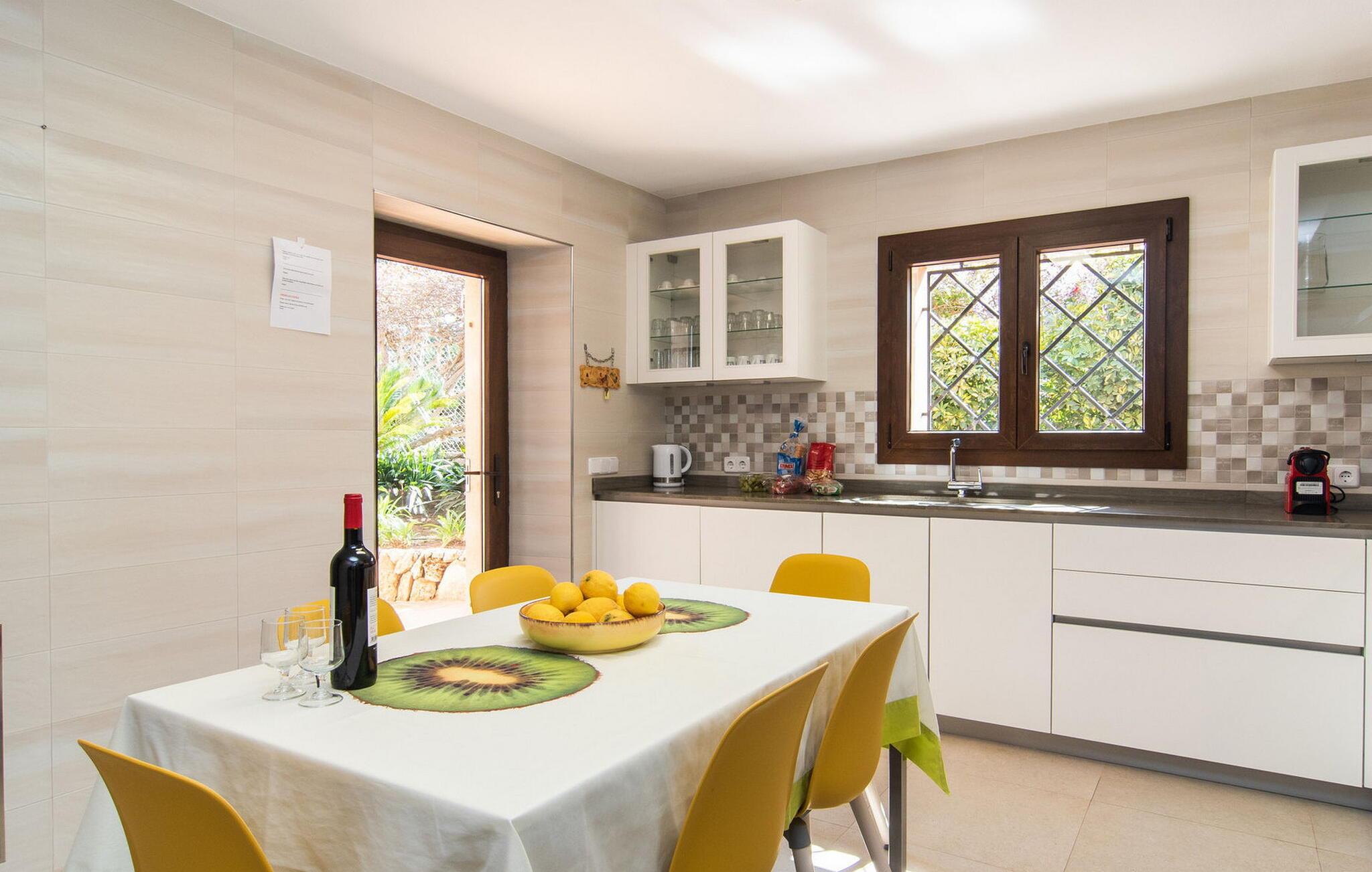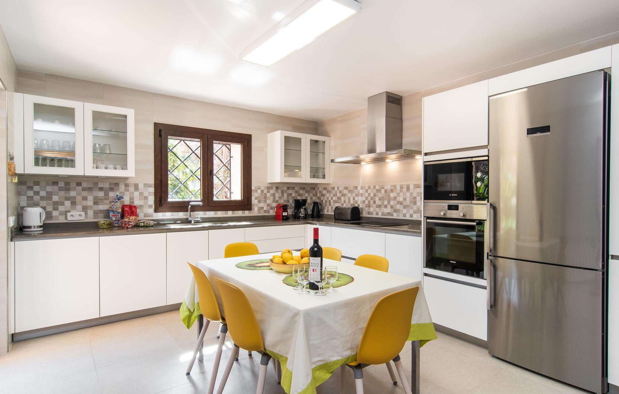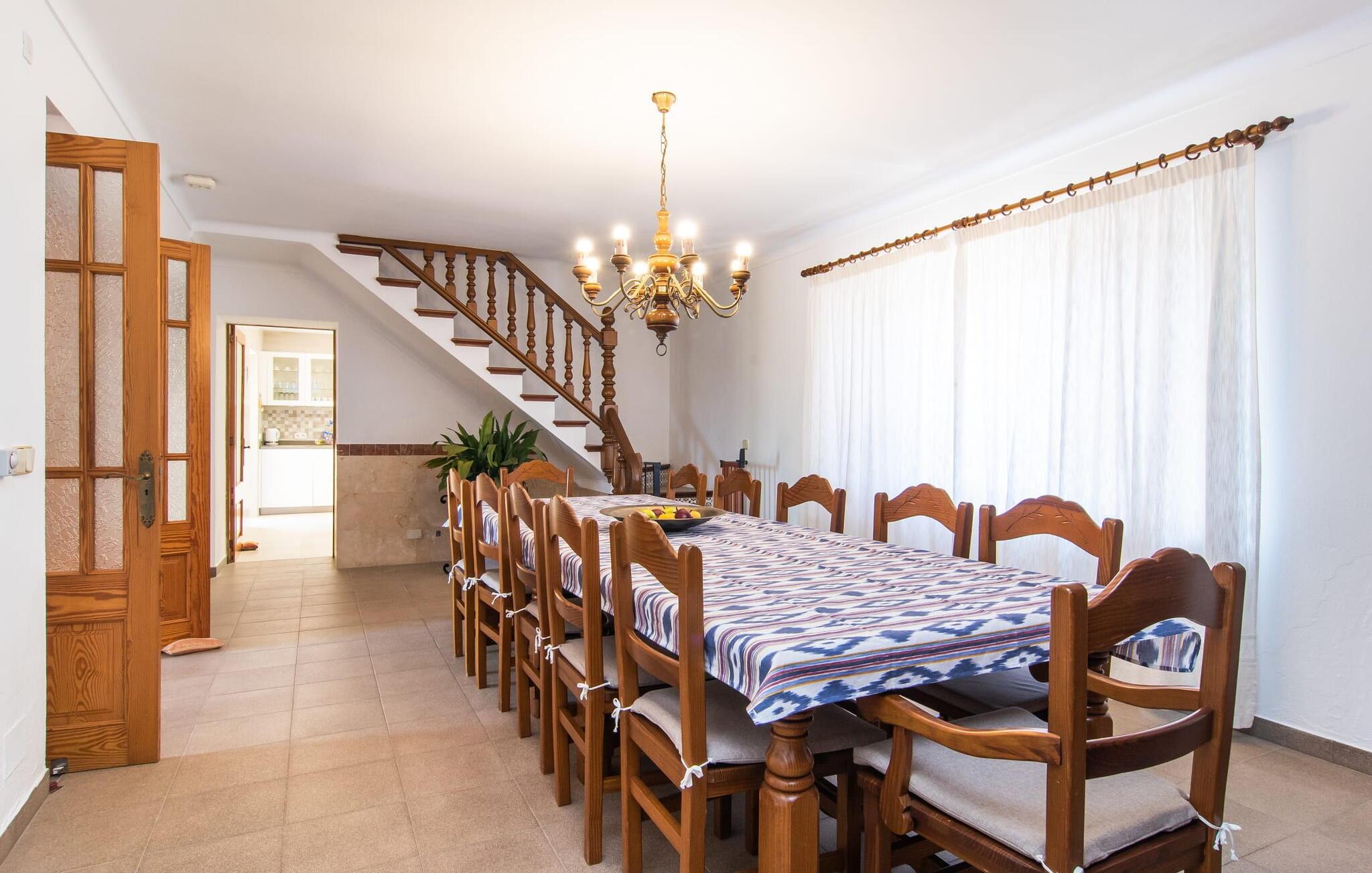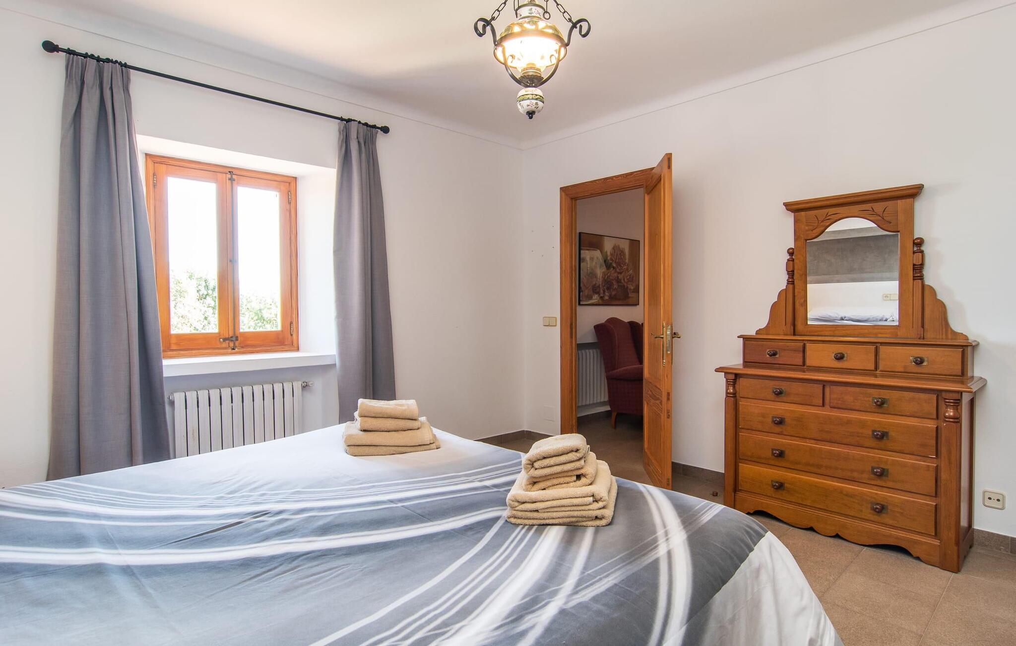 “Cas Munji er et glimrende eksempel på et mallorcinsk feriehus til familierejser. Det er kendetegnet ved et rummeligt, to-etagers landsted, der har en omfattende naturstenterrasse, en stor pool og et smukt anlagt haveområde. Farverig bougainvillea og majestætiske palmer. Engager jer med andre arter af palmetræer og kaktusser. På de delvist overdækkede terrasser finder I masser af siddepladser til alle sammen eller som et retræte til en god snak. Venligt, da der er en bekvem trappeindgang, og området er sikret af et hegn, er bordtennisbordet yderligere sjovt for unge og gamle, mens nogle kan slappe af i solen på en af liggestolene eller spille et spil bordtennis, mens andre kan svømme i poolen Gæsterne er allerede ved at forberede grillaftenen og middagen sammen. På denne måde vil I føle jer hjemme på ferien og kan helt hengive jer til luksuriøs afslapning. Mallorca venter på jer - ikke kun med middelhavsoverfloden i denne betagende smukke region, men også med de traditionelle møbler i dette familievenlige landsted. Med opdelingen i et master bedroom og et børneværelse pr. etage samt et femte dobbeltværelse har I og to familier og venner et rummeligt feriehus i mallorcansk tradition til rådighed. De veludstyrede afslapningsrum har naturligvis alle aircondition. De smarte badeværelser (fire i alt plus et femte udendørs badeværelse) imponerer også med deres varierede farvemøbler. Mallorcansk hygge med traditionelle indretningselementer venter jer også i de to hyggelige stuer - en på hver etage. Hvis I ikke ønsker at bruge udekøkkenet, finder I her et fremragende udstyret køkken, der vil give jer ren glæde, mens I laver mad. Hyggelighed – uanset om det er ved langbordet indenfor eller under den overdækkede terrasse – og afslappet ferienydelse for venner og familie er meget vigtigt på "Cas Munji". Hvad venter I på? Med det klassiske bondehus "Cas Munji" går drømmen om et idyllisk pool-feriehus til to familier i opfyldelse. Det traditionelle landsted har en førsteklasses beliggenhed i den sydøstlige del af Mallorca nær S'Horta. Stedet, der er blevet skånet for masseturisme, bevarer sin autenticitet og byder samtidig på indkøbsmuligheder og hyggelige caféer. Det er kun 5 minutters kørsel til havet, som også er inden for synsvidde. Drømmebugter som Sa Nau eller Cala d'Or venter jer der, omgivet af duftende fyrretræer.