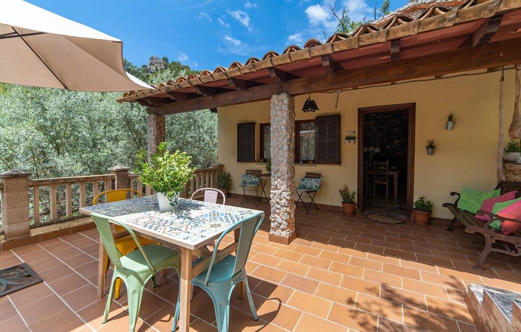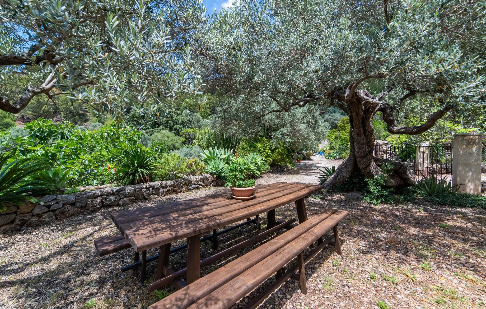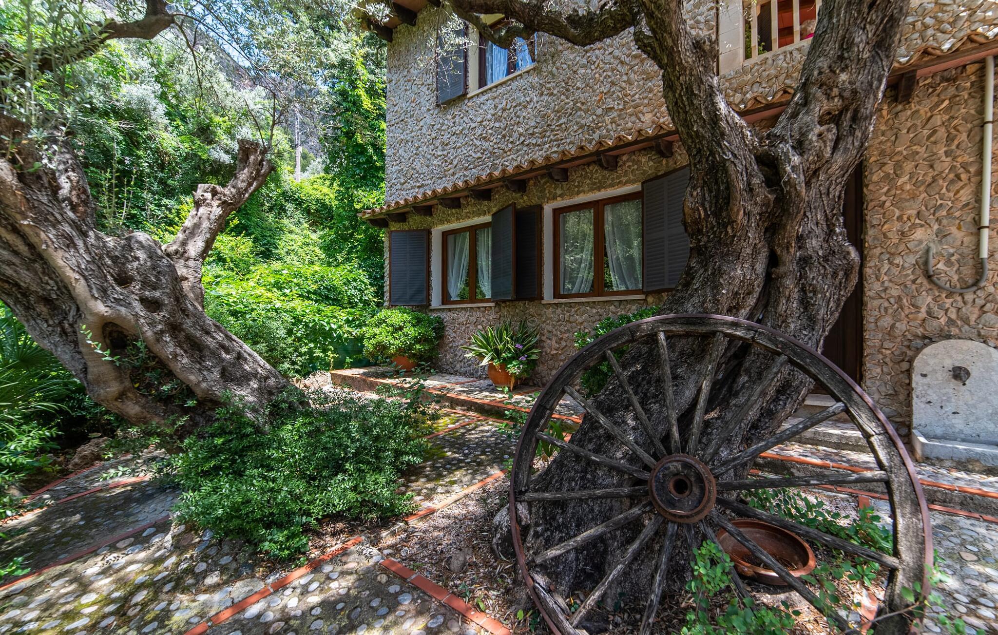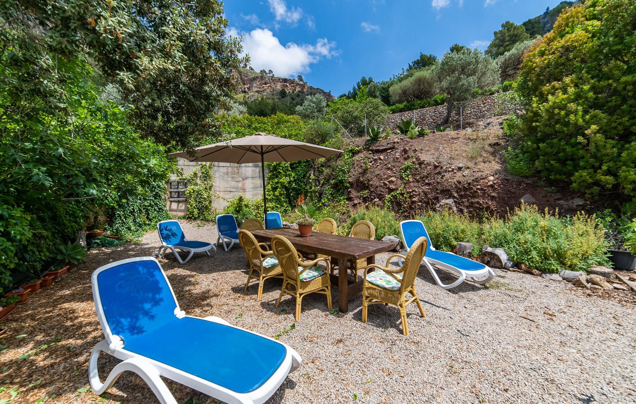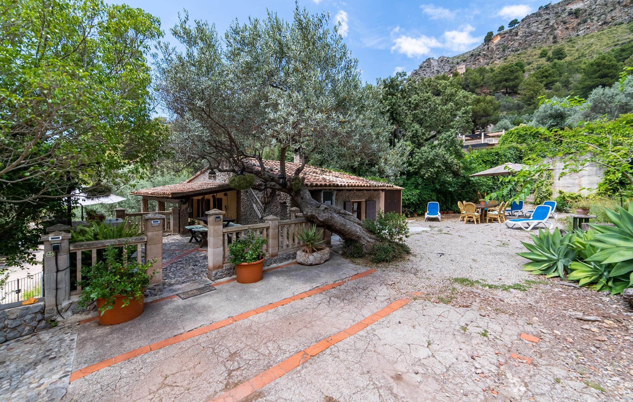 Bjerghytten "Cas Sito" i den nordlige del af Mallorca ligger i den vilde natur i Tramuntana-bjergene. Det giver jer den sjældne mulighed for at vågne op midt i et spektakulært verdensarvssted. Gamle oliventræer og frodige grønne planter danner en skyggefuld jungle omkring de afsondrede terrasser på bjergsidens ejendom, hvilket gør det nemt at slappe af. Selv i de varme sommermåneder. Adgang til ejendommen sker via en indkørsel og de to terrasser på forsiden af huset. Mens den første terrasse byder på en rustik spiseplads i skyggen af frodig vegetation, tilbyder den anden terrasse en fantastisk udsigt over den imponerende bjergfront. Haven byder på en muret grill, et solrigt, afskærmet område med liggestole og flere andre komfortable spisepladser. Indenfor strækker opholdsrummet sig over to plan. Hovedindgangen fører til det øverste niveau med en åben opholdsstue med pejs, spiseplads og et rummeligt, fuldt udstyret køkken. Området har varm/kold aircondition. En trappe fører jer ned til underetagen. Takket være beliggenheden på bjergsiden har de tre dobbeltværelser også udsigt til haven. De tre velholdte soveområder deler et moderne badeværelse med brus. Huset er udstyret med radiatorer, så vandrere og cyklister kan finde et hyggeligt fristed efter lange ture. Bjerghuset ligger på en bjergskråning med frodig natur i centrum af Tramuntana-bjergene i den nordlige del af Mallorca. Cala Tuent-bugten og dens restaurant ligger 13 minutters gang eller 3 minutter i bil. Der er interessante cykel- og vandreruter, for eksempel til reservoirerne Gorg Blau og Cúber.