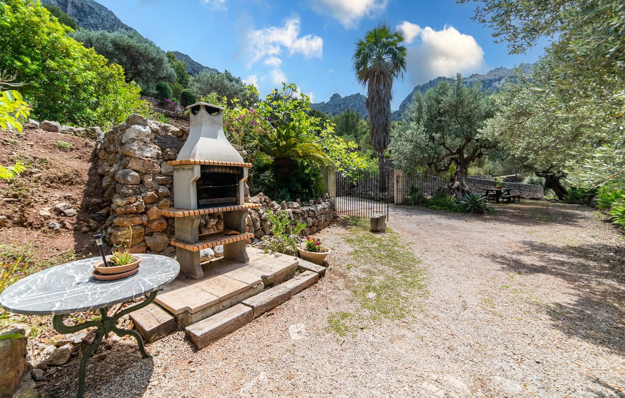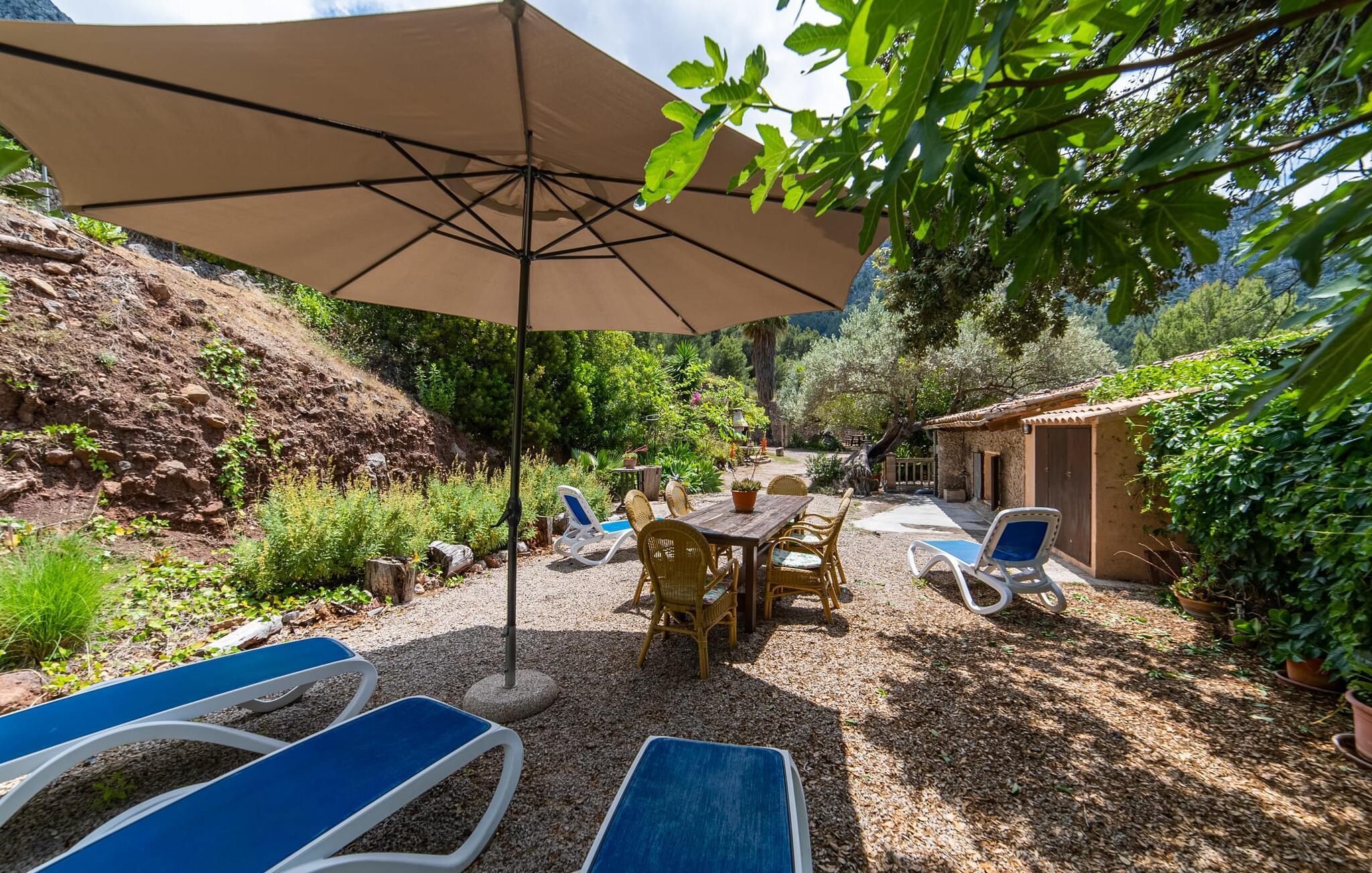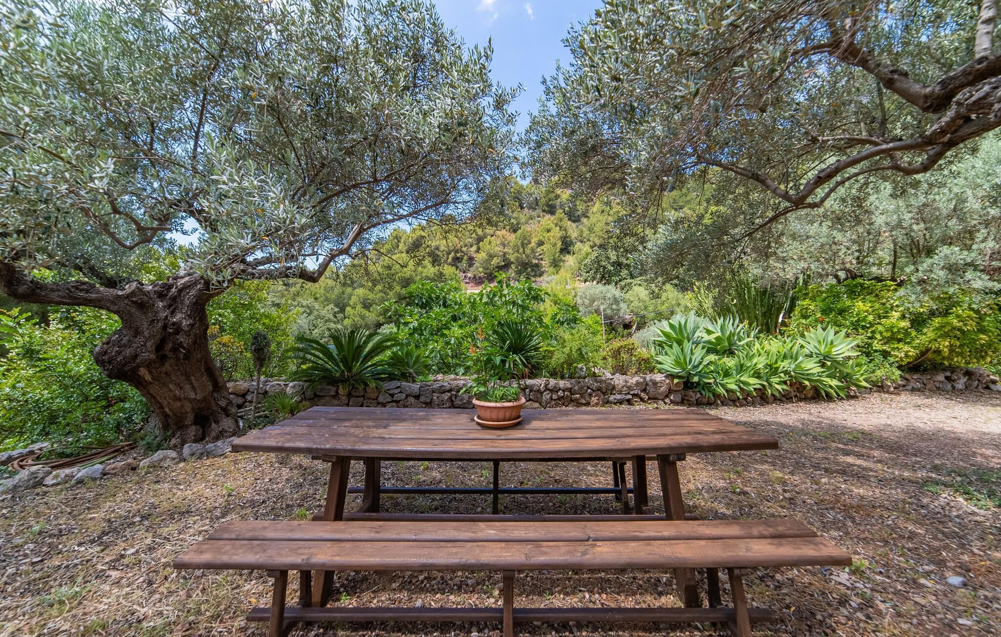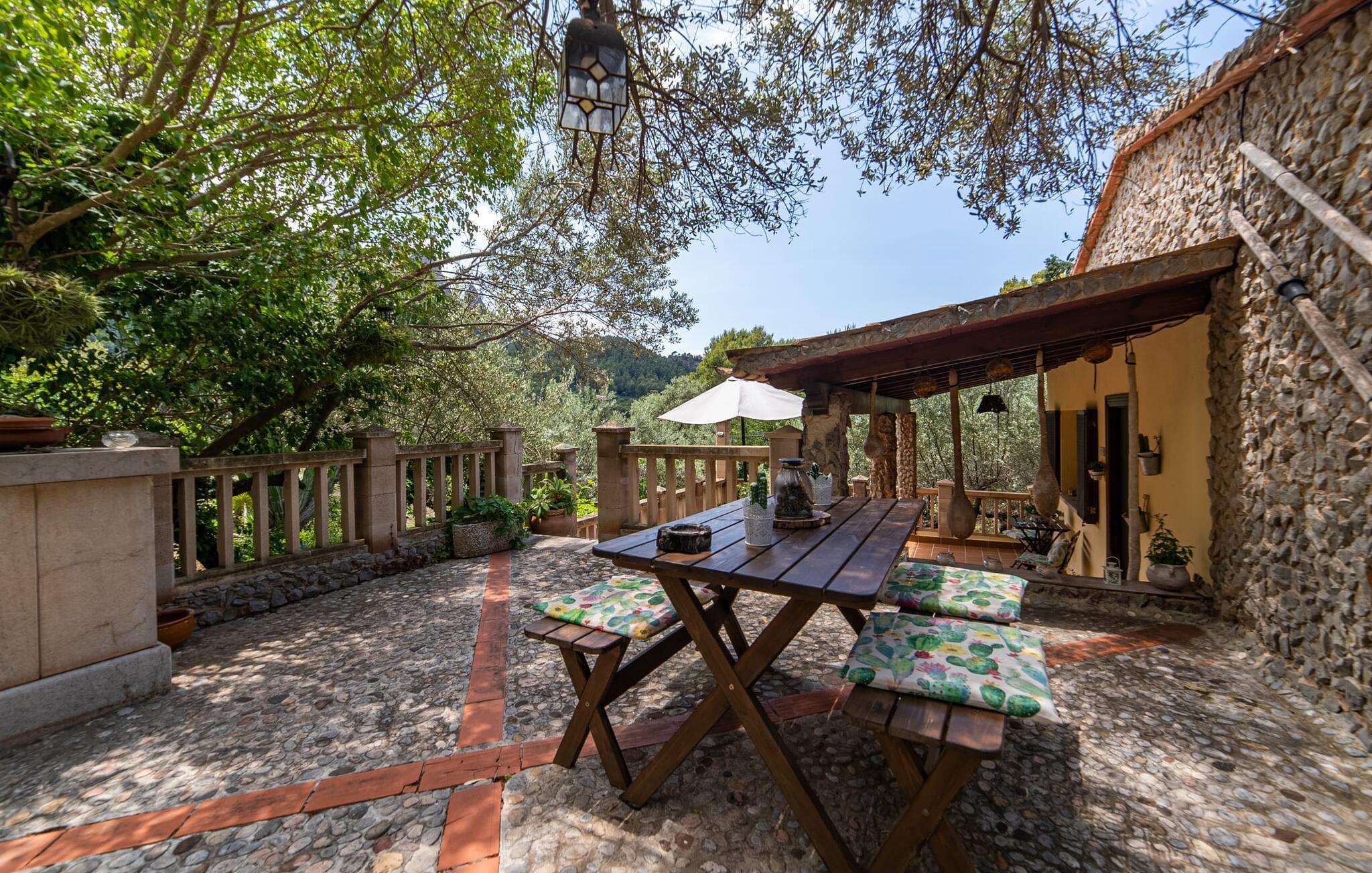 Bjerghytten "Cas Sito" i den nordlige del af Mallorca ligger i den vilde natur i Tramuntana-bjergene. Det giver dig den sjældne mulighed for at vågne op midt i et spektakulært verdensarvssted. Dette er et feriehus i Fincallorca. Gamle oliventræer og frodige grønne planter danner en skyggefuld jungle omkring de afsondrede terrasser på bjergsidens ejendom, hvilket gør det nemt at slappe af. Selv i de varme sommermåneder. Adgang til ejendommen sker via en indkørsel og de to terrasser på forsiden af huset. Mens den første terrasse byder på en rustik spiseplads i skyggen af frodig vegetation, tilbyder den anden terrasse en fantastisk udsigt over den imponerende bjergfront. Haven byder på en muret grill, et solrigt, afskærmet område med liggestole og flere andre komfortable spisepladser. Indenfor strækker opholdsrummet sig over to plan. Hovedindgangen fører til det øverste niveau med en åben opholdsstue med pejs, spiseplads og et rummeligt, fuldt udstyret køkken. Området har varm/kold aircondition. En trappe fører dig ned til underetagen. Takket være beliggenheden på bjergsiden har de tre dobbeltværelser også udsigt til haven. De tre velholdte soveområder deler et moderne badeværelse med brus. Huset er udstyret med radiatorer, så vandrere og cyklister kan finde et hyggeligt fristed efter lange ture. Bjerghuset ligger på en bjergskråning med frodig natur i centrum af Tramuntana-bjergene i den nordlige del af Mallorca. Cala Tuent-bugten og dens restaurant ligger 13 minutters gang eller 3 minutter i bil. Der er interessante cykel- og vandreruter, for eksempel til reservoirerne Gorg Blau og Cúber.