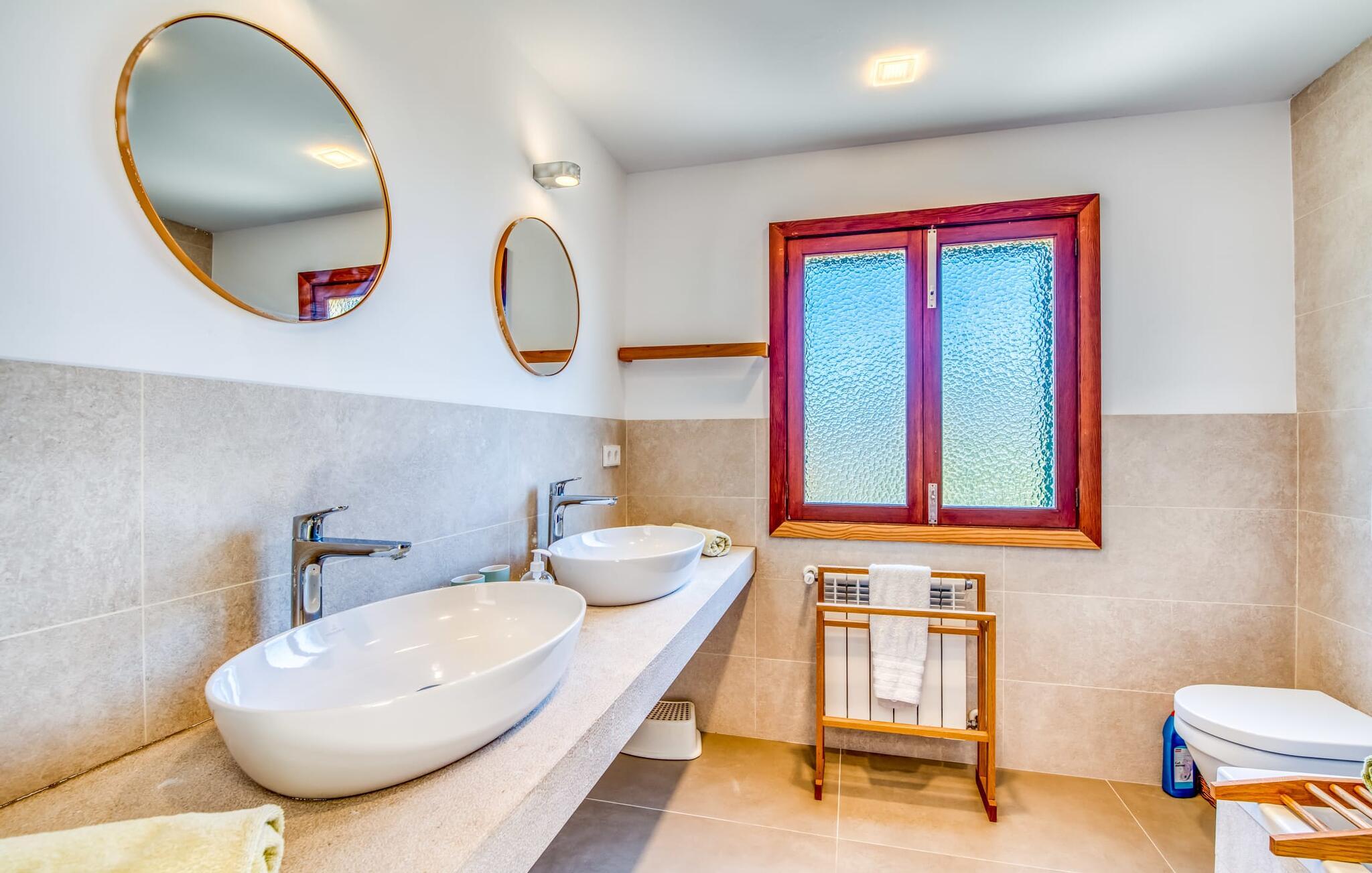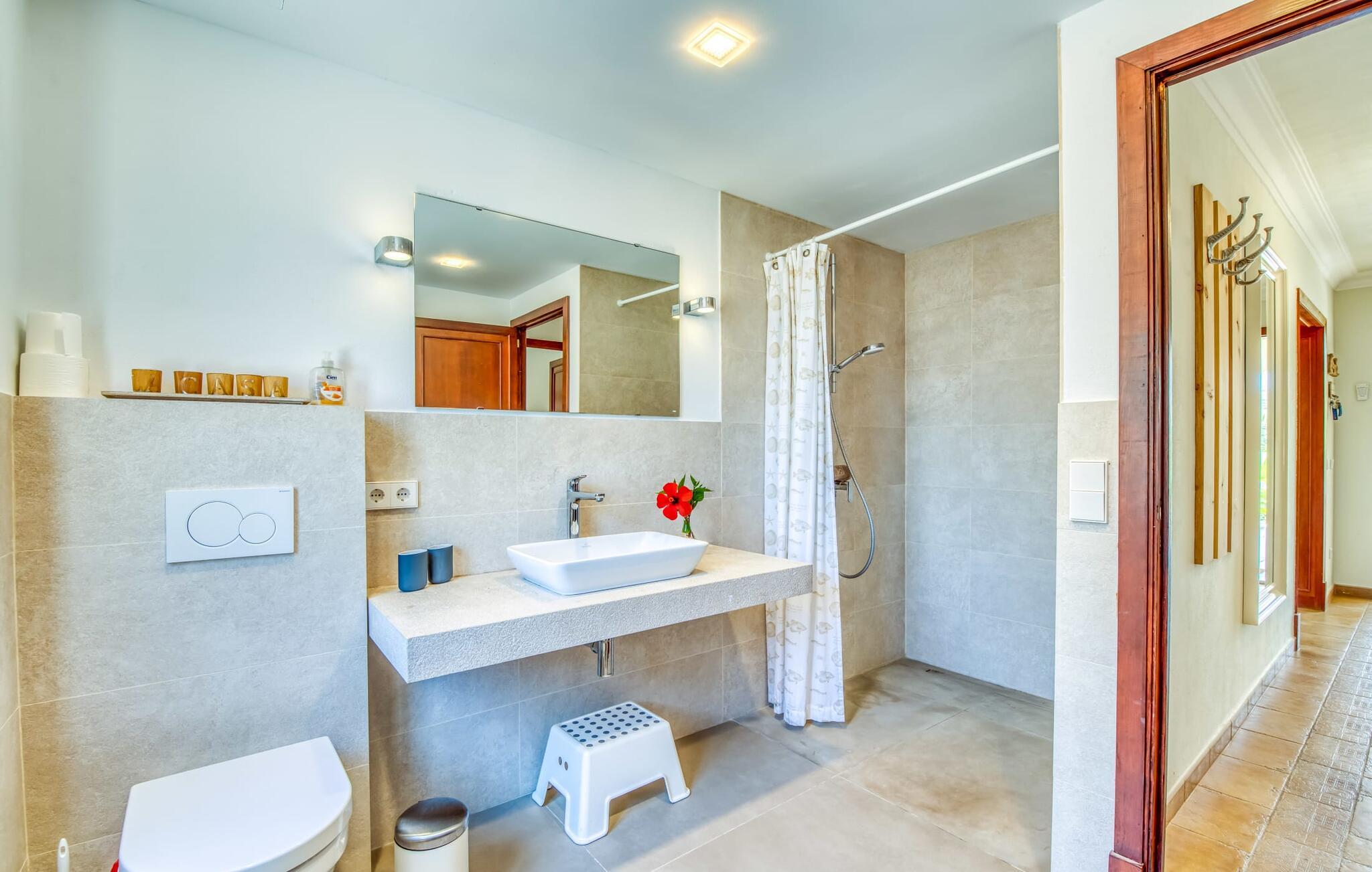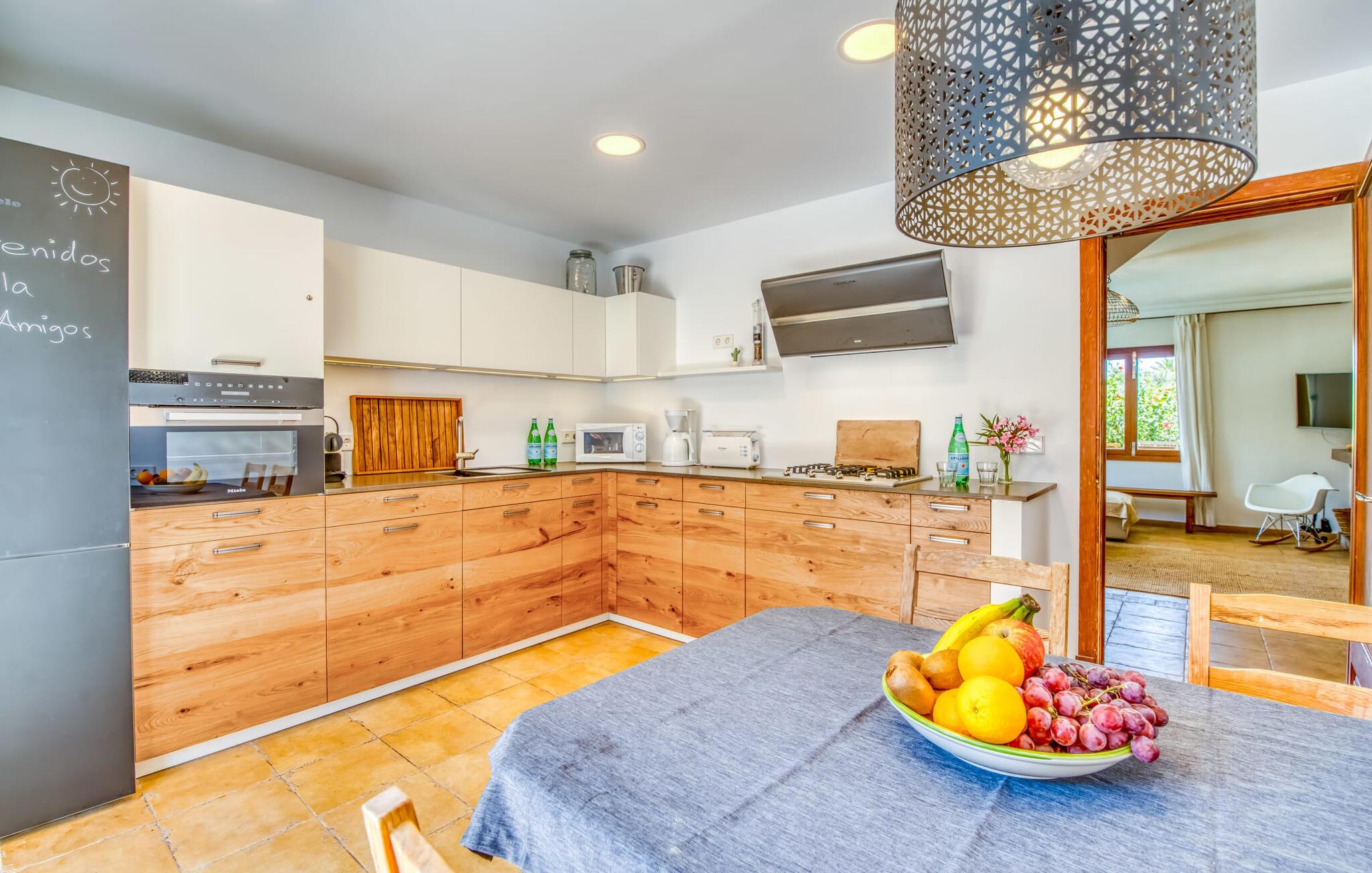 Et væld af dejlige udendørs siddepladser, en privat pool og muligheden for at slentre ned til havet i ro og mag – alt dette og meget mere venter jer i Villa "Casa Amigos". Terrassen lige ved siden af ??huset er indrammet af buer og behageligt luftig – et vidunderligt sted til morgenmad eller et skyggefuldt tilflugtssted efter en lang dag med solbadning. På den 650 m² store grund kan I sidde eller slappe af i adskillige andre udendørsområder, f.eks. ved poolen, som – tilgængelig via en bred trappe – inviterer jer til at køle af. Om nødvendigt kan I også nyde varmt vand under den praktiske udendørs bruser – en velkommen forfriskning efter en dag på stranden. Det charmerende spisebord foran køkkenet gør det hurtigt og nemt at dække bordet. Tagterrassen, komplet med loungemøbler, stole og liggestole, tilbyder panoramaudsigt.