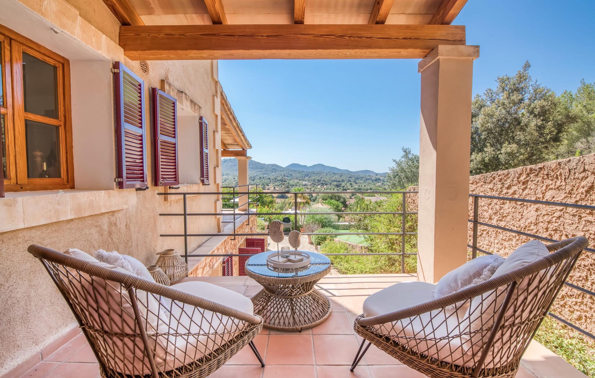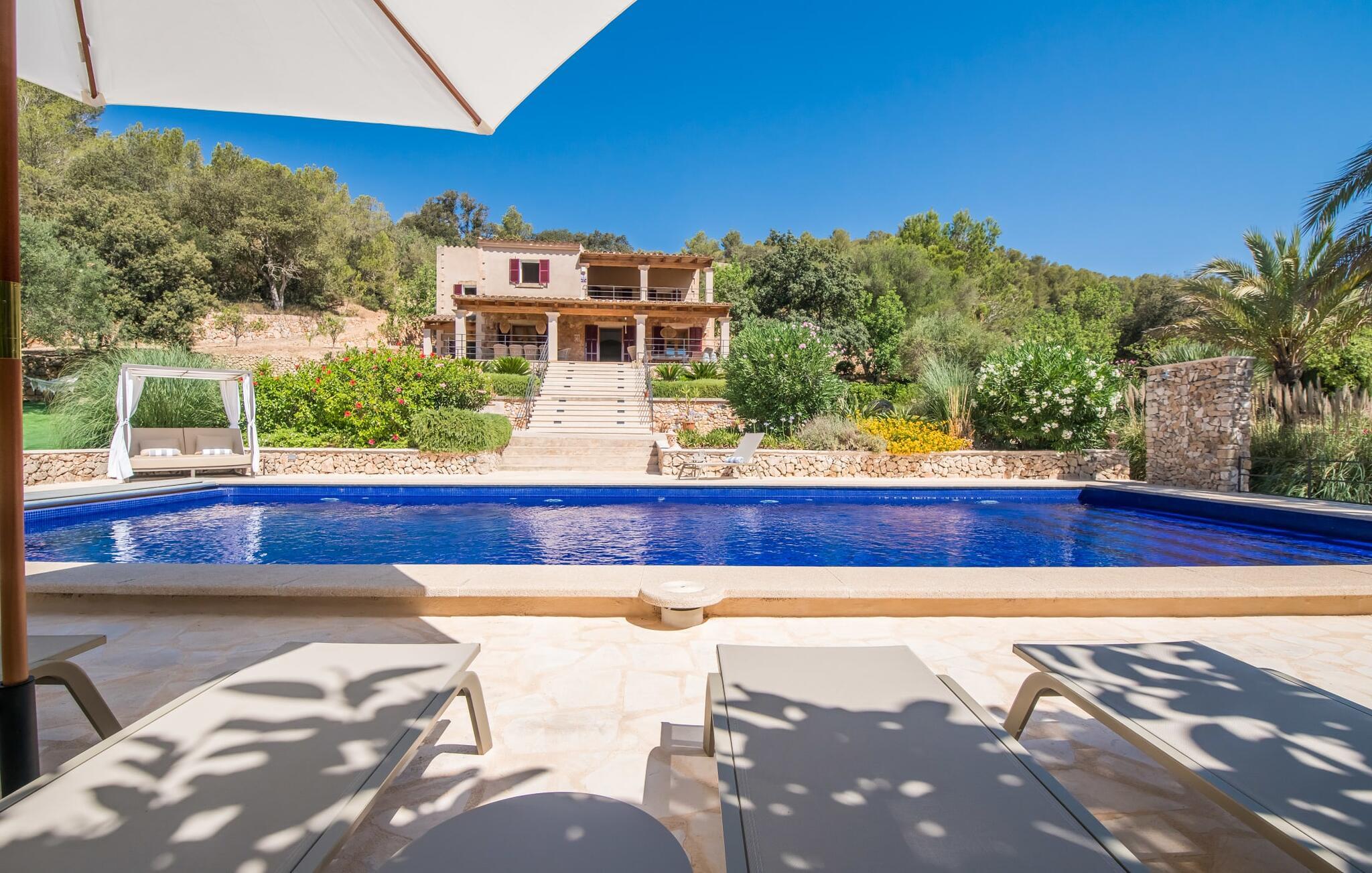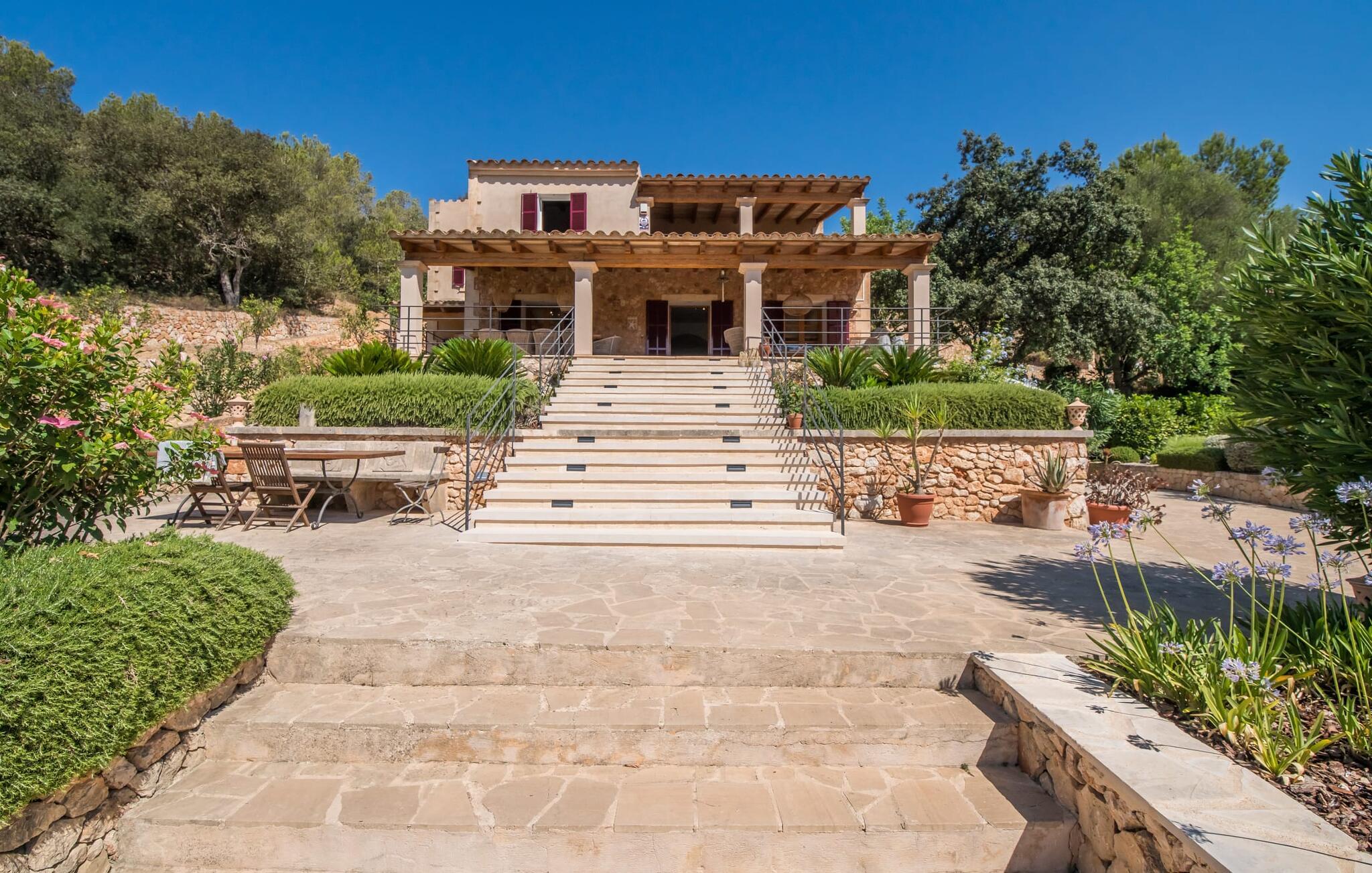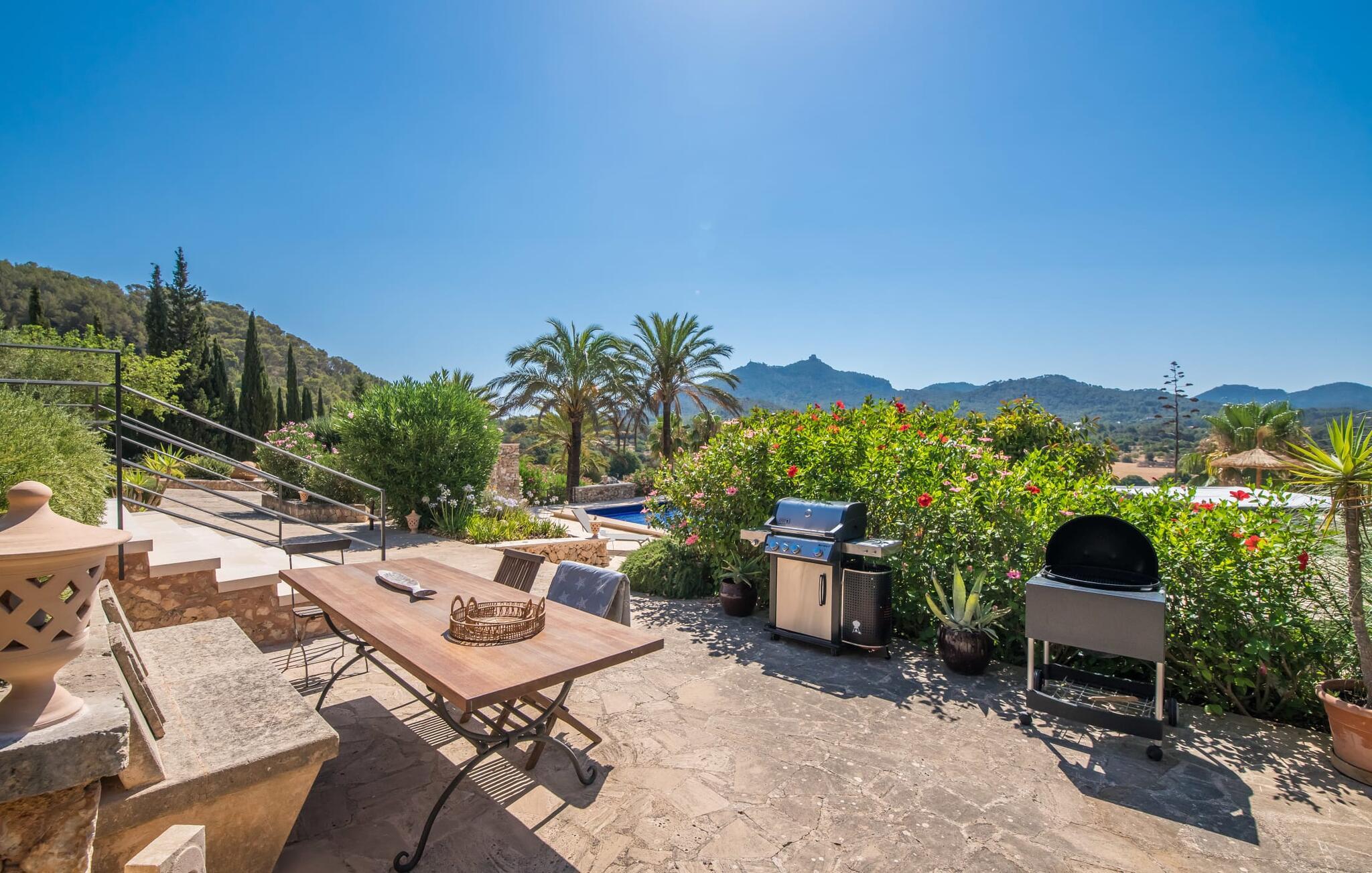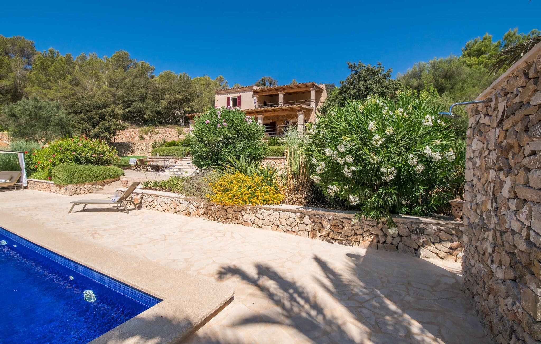 Oplev et sandt ferieparadis bag den elektriske port på "Casa Amorena". Denne udsøgte naturstensvilla, kærligt indrettet af sine tyske ejere, bevarer sin rustikke charme, mens den tilbyder moderne komfort. Beliggende i skovklædte bakker, har ejendommen en fantastisk have med palmer og cypresser, der blander sig problemfrit med den betagende udsigt over San Salvador-bjergene. Den glitrende pool med panoramaterrasse, højkvalitets rattan liggestole og en Bali seng inviterer jer til at slappe af. Et mezzaninniveau er ideelt til grillning, udstyret med en Weber-kulgrill og rigelige siddepladser, så I kan nyde essensen af Mallorca. For dem, der leder efter en aktiv ferie, har villaen et fitnesscenter, der er tilgængeligt fra haven. Den rummelige, udvendige suite i stueetagen med åbent badeværelse tilbyder også direkte adgang til poolen, mens der i stueetagen er en elegant opholds- og spisestue med pejs og XL-fladskærms-tv. Det luftige køkken og overdækkede terrasse tilføjer oplevelsen sammen med et yderligere soveværelse med dobbeltseng med en-suite badeværelse og privat balkon. Yderligere soveværelser og badeværelser er placeret ovenpå (der er ingen rækværk) med direkte adgang til den ekspansive loungebalkon. "Casa Amorena" tilbyder virkelig plads nok til alle. Stilfuldt renoveret, smuk tysklavet villa! Den terrasseret "Casa Amorena", i en rolig, afsondret beliggenhed kun 3 km fra Felanitx, kunne være kærlighed ved første blik. Et supermarked og et ugentligt marked, caféer og restauranter ligger kun få minutters kørsel væk i byen, og strandene ligger kun 15 km væk på den sydøstlige kyst.