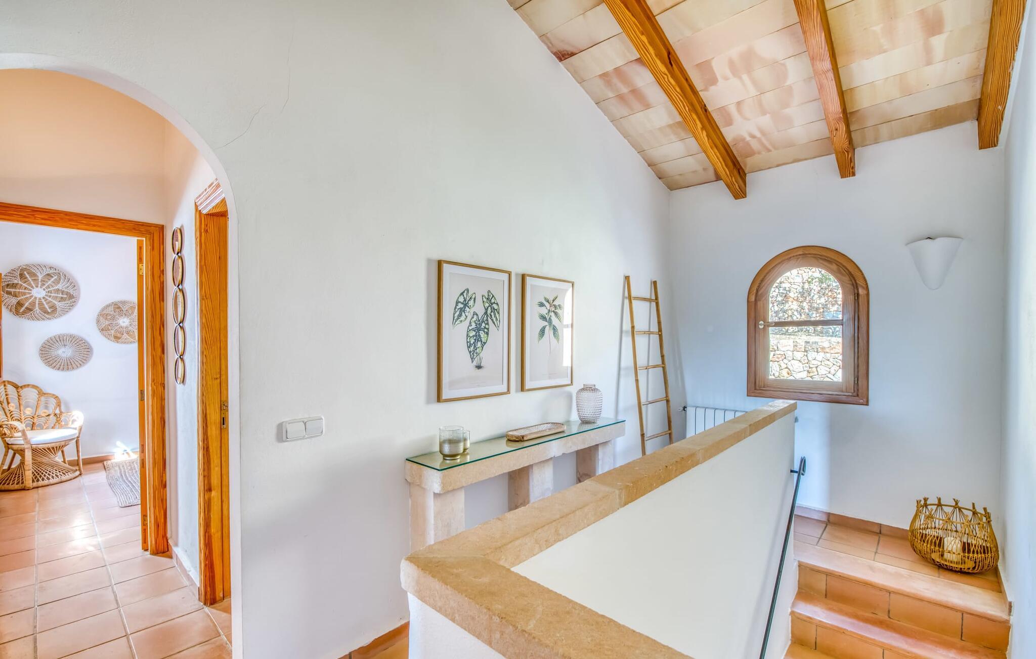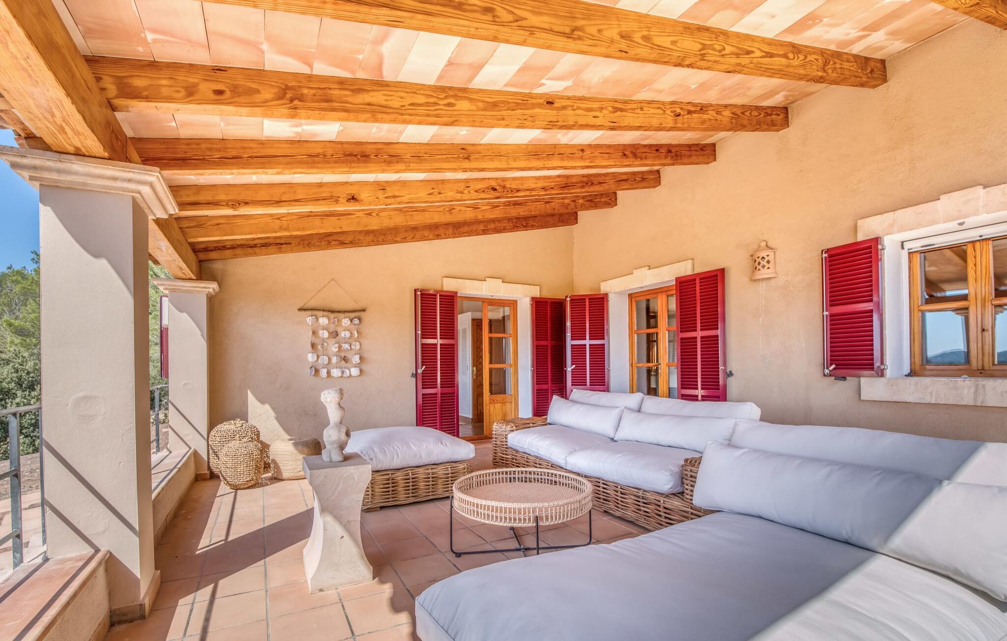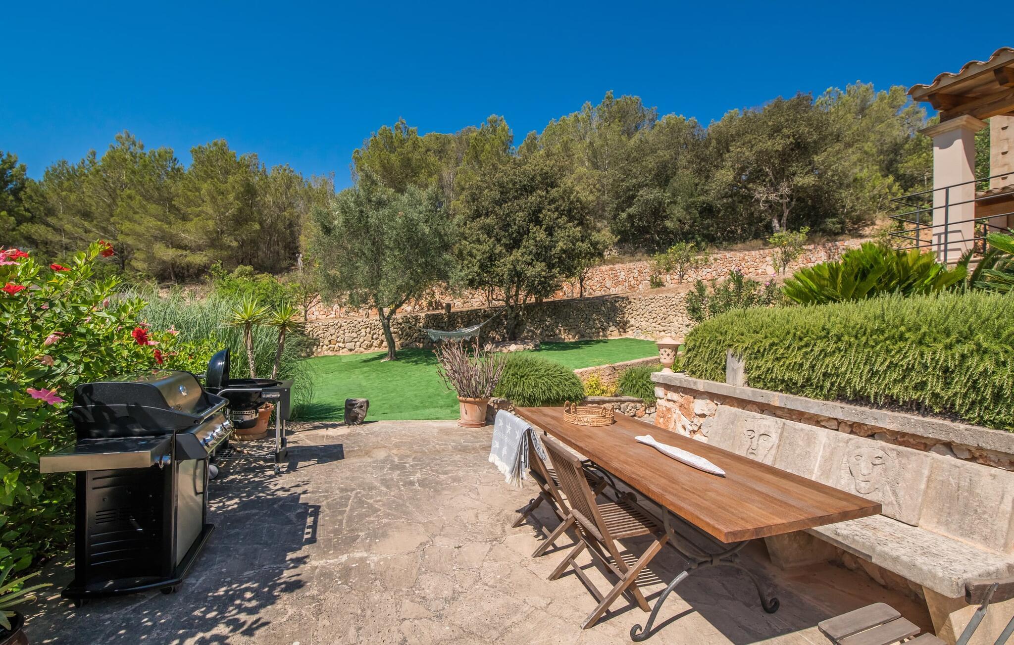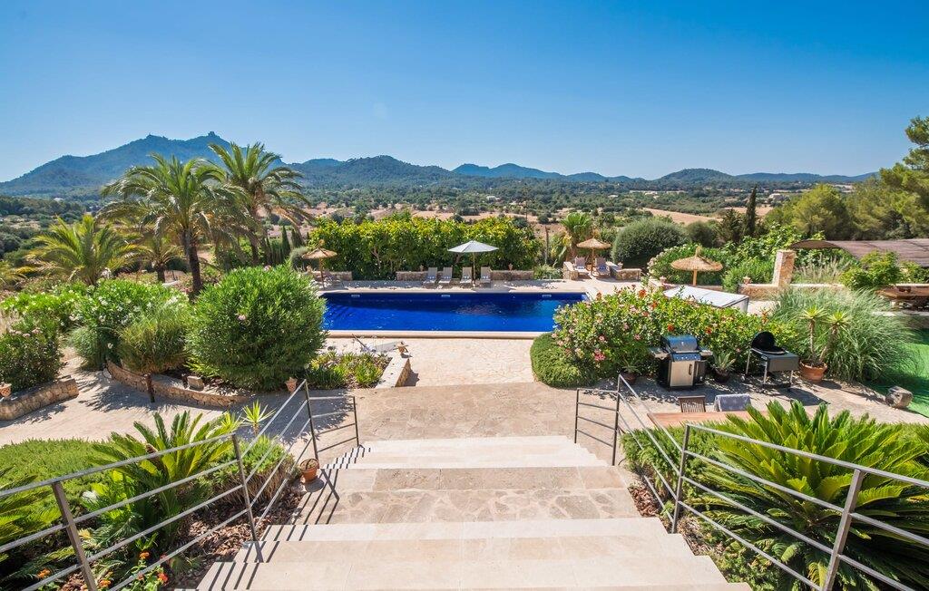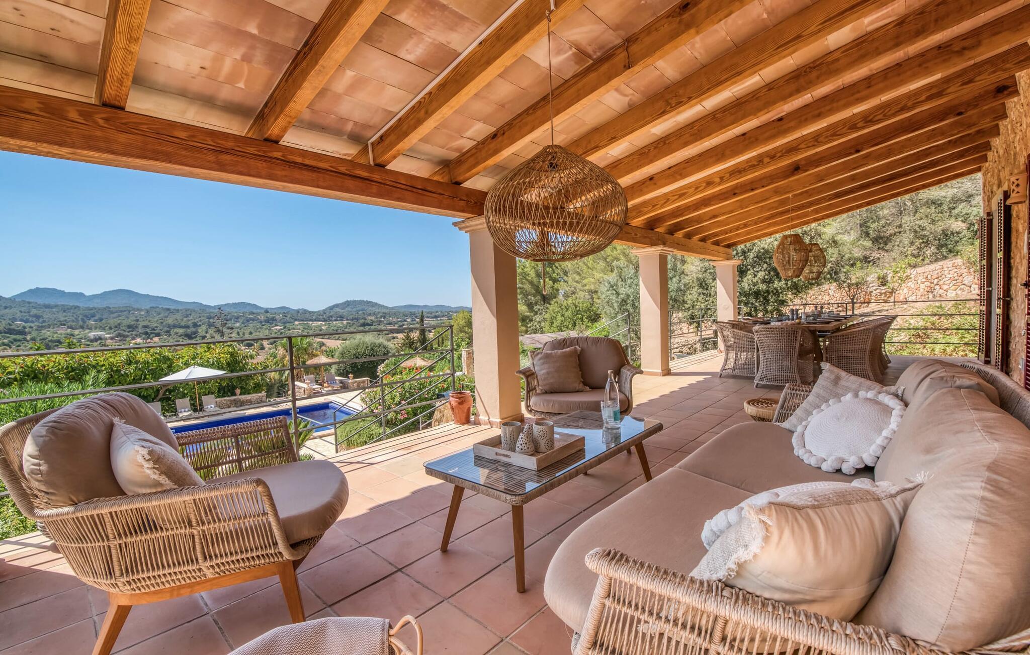 Oplev et sandt ferieparadis bag den elektriske port på "Casa Amorena". Denne udsøgte naturstensvilla, kærligt indrettet af sine tyske ejere, bevarer sin rustikke charme, mens den tilbyder moderne komfort. Beliggende i skovklædte bakker, har ejendommen en fantastisk have med palmer og cypresser, der blander sig problemfrit med den betagende udsigt over San Salvador-bjergene. Den glitrende pool med panoramaterrasse, højkvalitets rattan liggestole og en Bali seng inviterer jer til at slappe af. Et mezzaninniveau er ideelt til grillning, udstyret med en Weber-kulgrill og rigelige siddepladser, så I kan nyde essensen af Mallorca. For dem, der leder efter en aktiv ferie, har villaen et fitnesscenter, der er tilgængeligt fra haven. Den rummelige, udvendige suite i stueetagen med åbent badeværelse tilbyder også direkte adgang til poolen, mens der i stueetagen er en elegant opholds- og spisestue med pejs og XL-fladskærms-tv. Det luftige køkken og overdækkede terrasse tilføjer oplevelsen sammen med et yderligere soveværelse med dobbeltseng med en-suite badeværelse og privat balkon. Yderligere soveværelser og badeværelser er placeret ovenpå (der er ingen rækværk) med direkte adgang til den ekspansive loungebalkon. "Casa Amorena" tilbyder virkelig plads nok til alle. Stilfuldt renoveret, smuk tysklavet villa! Den terrasseret "Casa Amorena", i en rolig, afsondret beliggenhed kun 3 km fra Felanitx, kunne være kærlighed ved første blik. Et supermarked og et ugentligt marked, caféer og restauranter ligger kun få minutters kørsel væk i byen, og strandene ligger kun 15 km væk på den sydøstlige kyst.