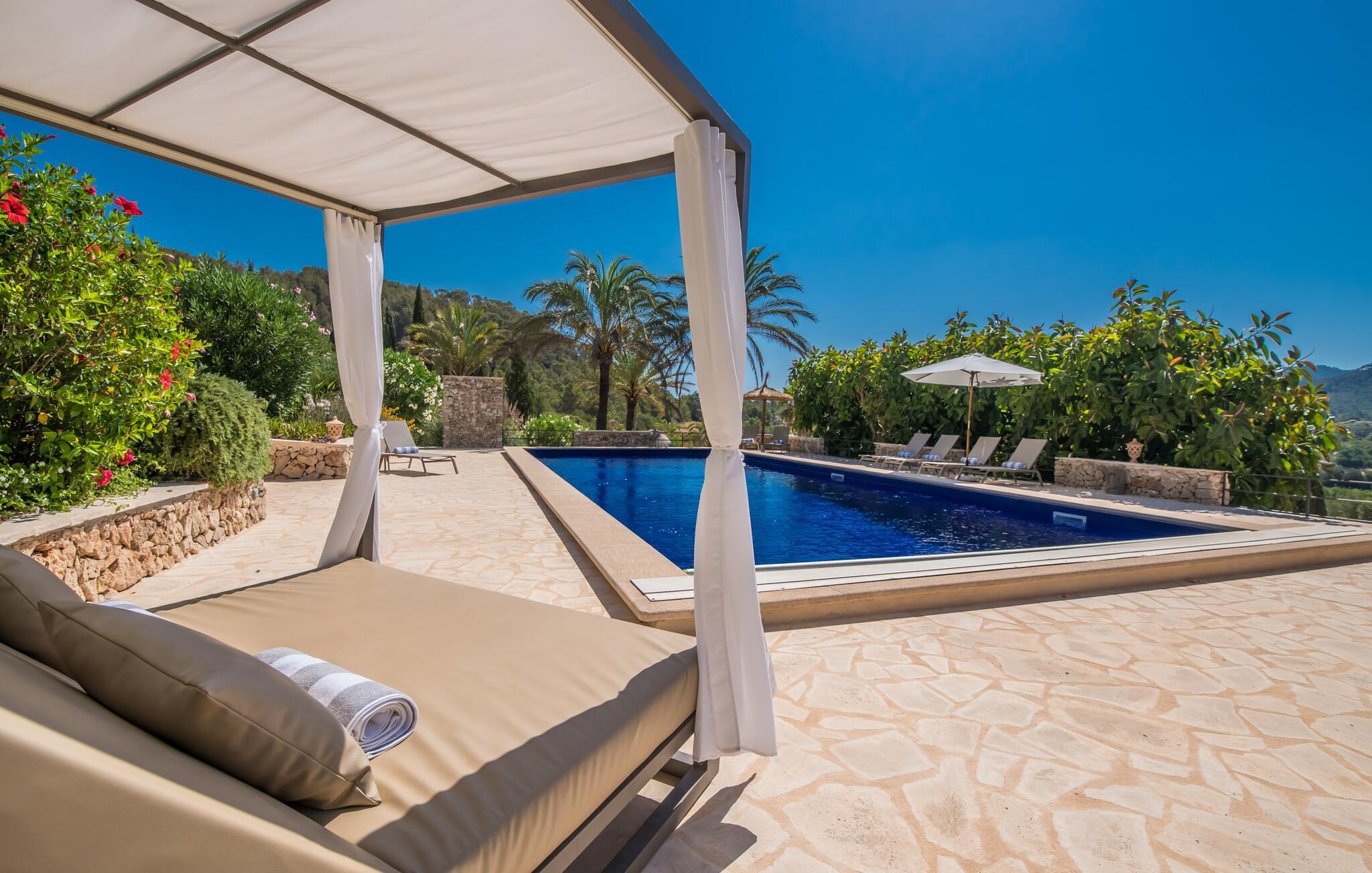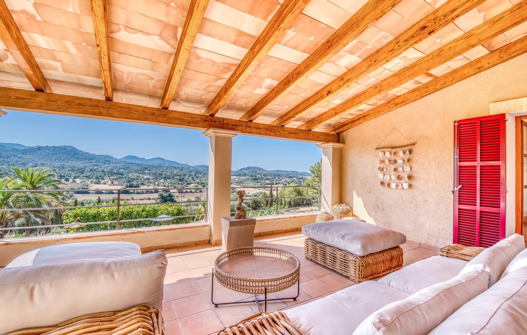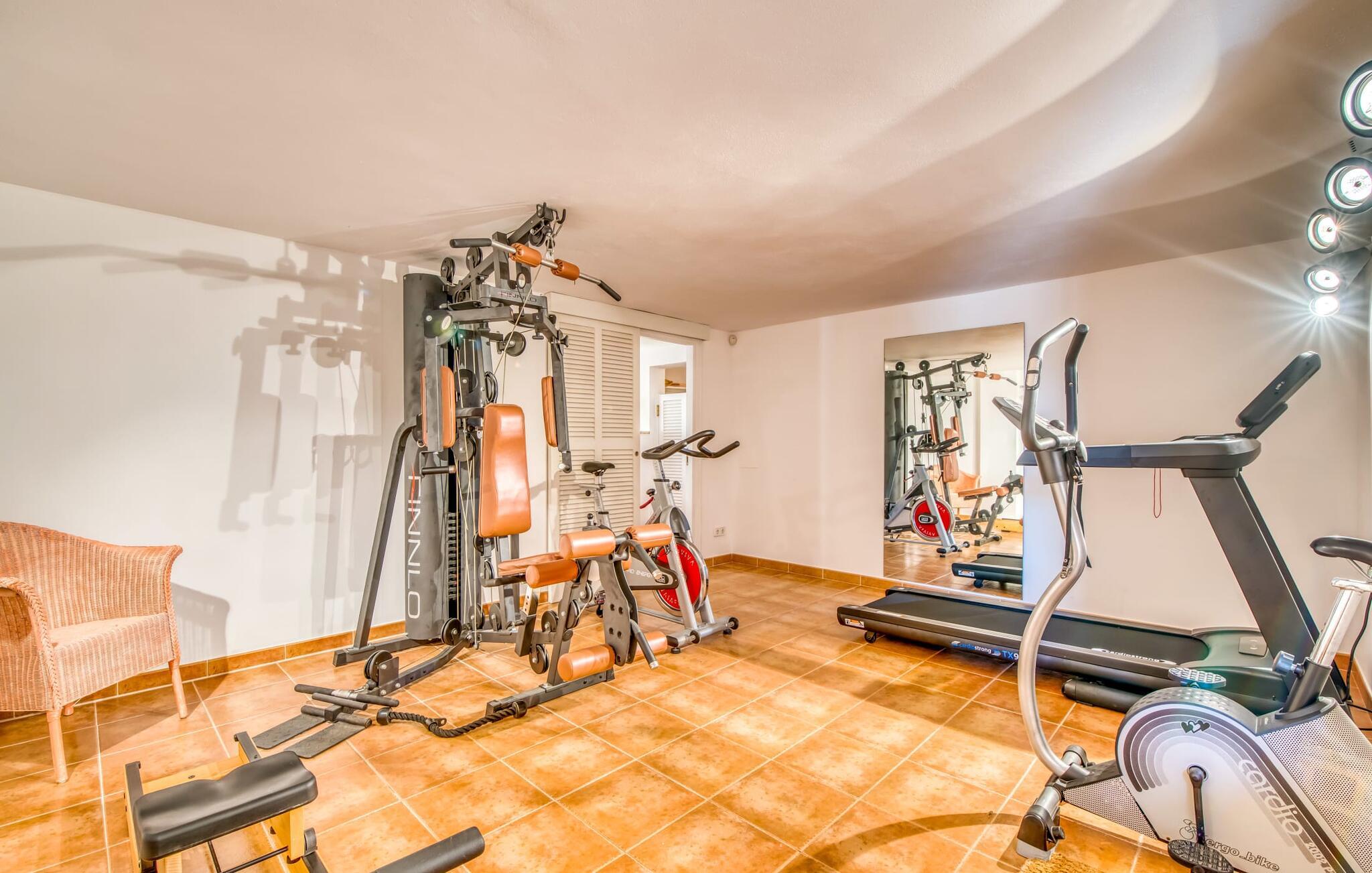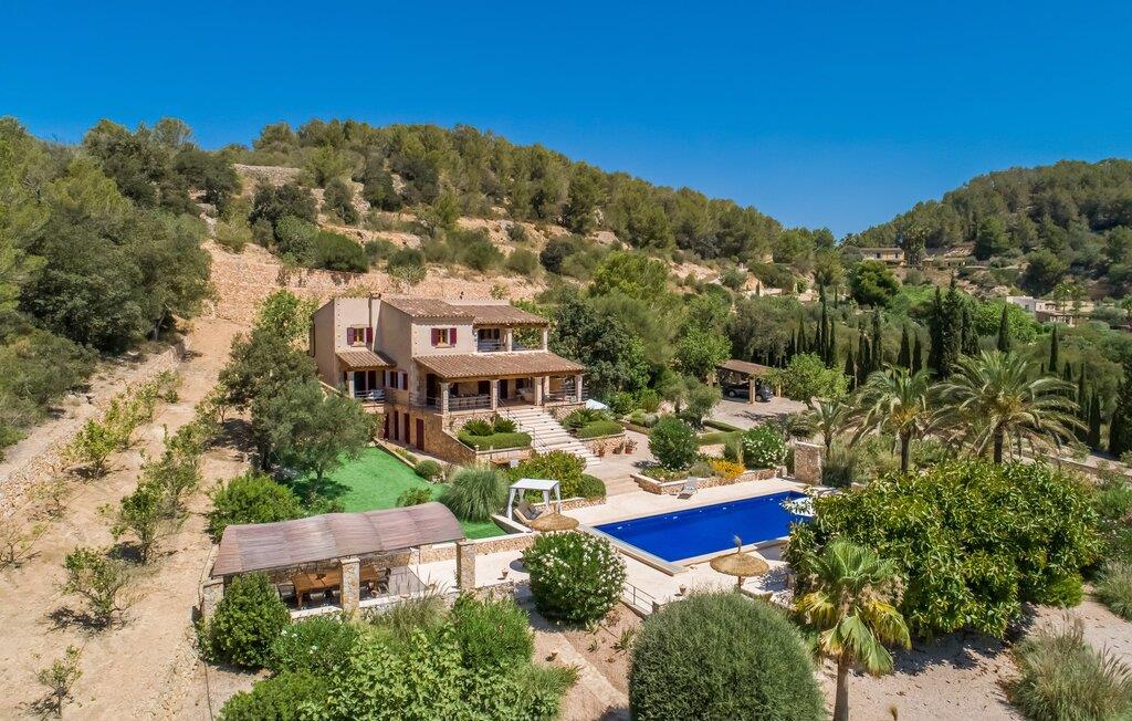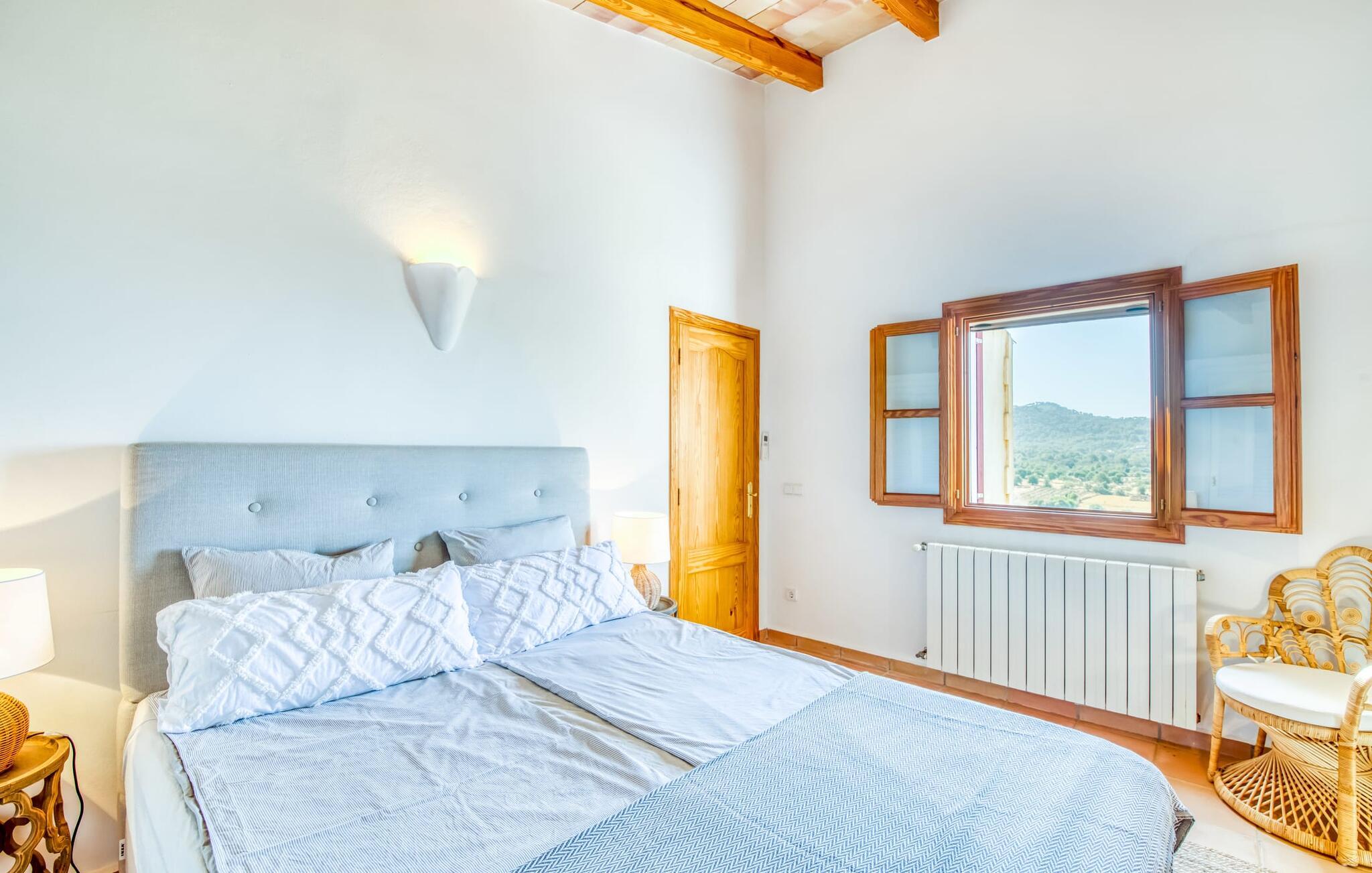Oplev et sandt ferieparadis bag den elektriske port på "Casa Amorena". Denne udsøgte naturstensvilla, kærligt indrettet af sine tyske ejere, bevarer sin rustikke charme, mens den tilbyder moderne komfort. Beliggende i skovklædte bakker, har ejendommen en fantastisk have med palmer og cypresser, der blander sig problemfrit med den betagende udsigt over San Salvador-bjergene. Den glitrende pool med panoramaterrasse, højkvalitets rattan liggestole og en Bali seng inviterer jer til at slappe af. Et mezzaninniveau er ideelt til grillning, udstyret med en Weber-kulgrill og rigelige siddepladser, så I kan nyde essensen af Mallorca. For dem, der leder efter en aktiv ferie, har villaen et fitnesscenter, der er tilgængeligt fra haven. Den rummelige, udvendige suite i stueetagen med åbent badeværelse tilbyder også direkte adgang til poolen, mens der i stueetagen er en elegant opholds- og spisestue med pejs og XL-fladskærms-tv. Det luftige køkken og overdækkede terrasse tilføjer oplevelsen sammen med et yderligere soveværelse med dobbeltseng med en-suite badeværelse og privat balkon. Yderligere soveværelser og badeværelser er placeret ovenpå (der er ingen rækværk) med direkte adgang til den ekspansive loungebalkon. "Casa Amorena" tilbyder virkelig plads nok til alle. Stilfuldt renoveret, smuk tysklavet villa! Den terrasseret "Casa Amorena", i en rolig, afsondret beliggenhed kun 3 km fra Felanitx, kunne være kærlighed ved første blik. Et supermarked og et ugentligt marked, caféer og restauranter ligger kun få minutters kørsel væk i byen, og strandene ligger kun 15 km væk på den sydøstlige kyst.