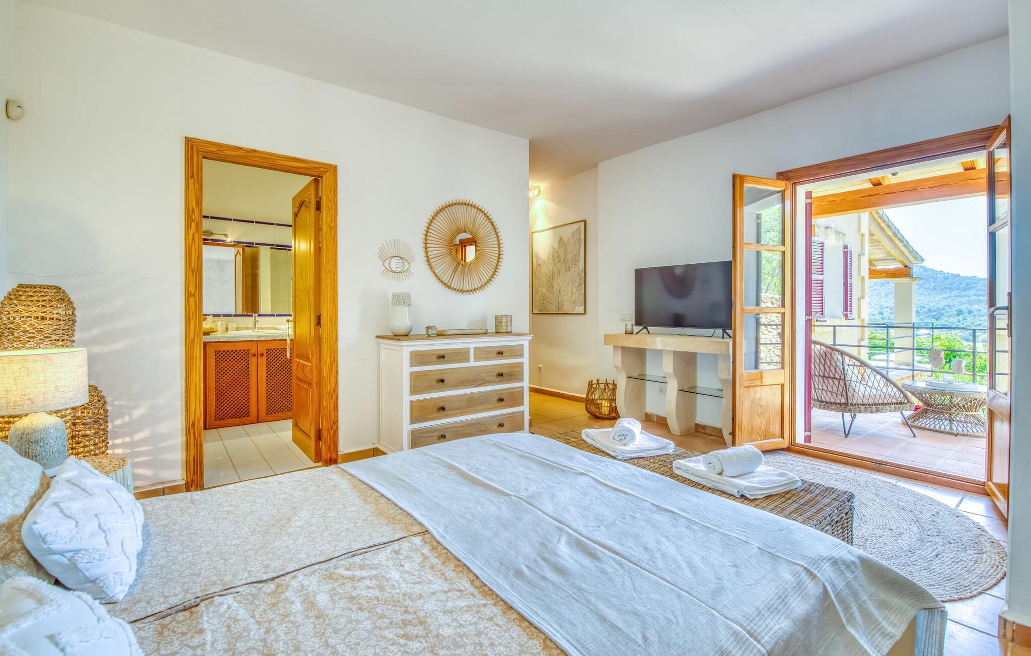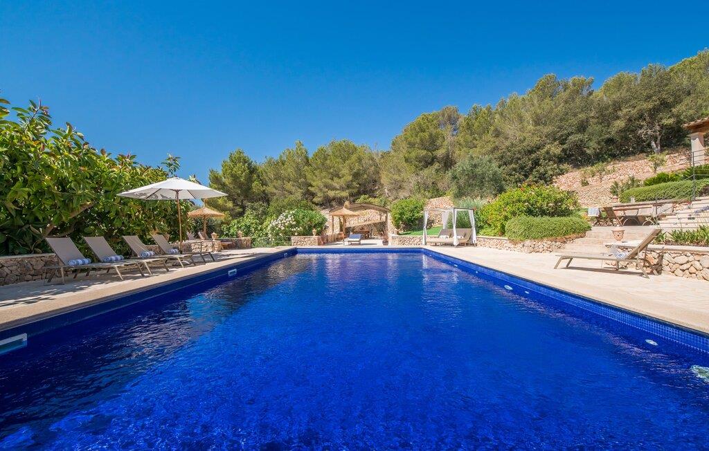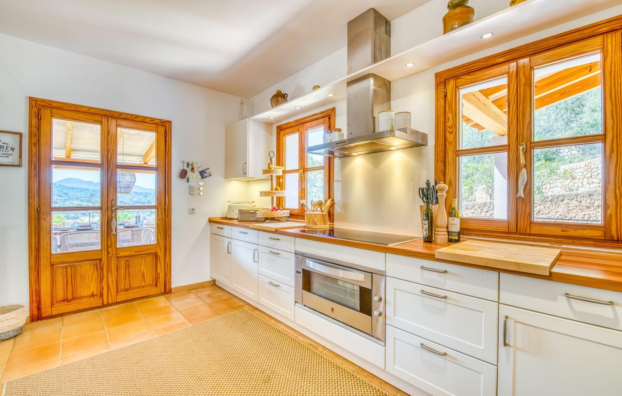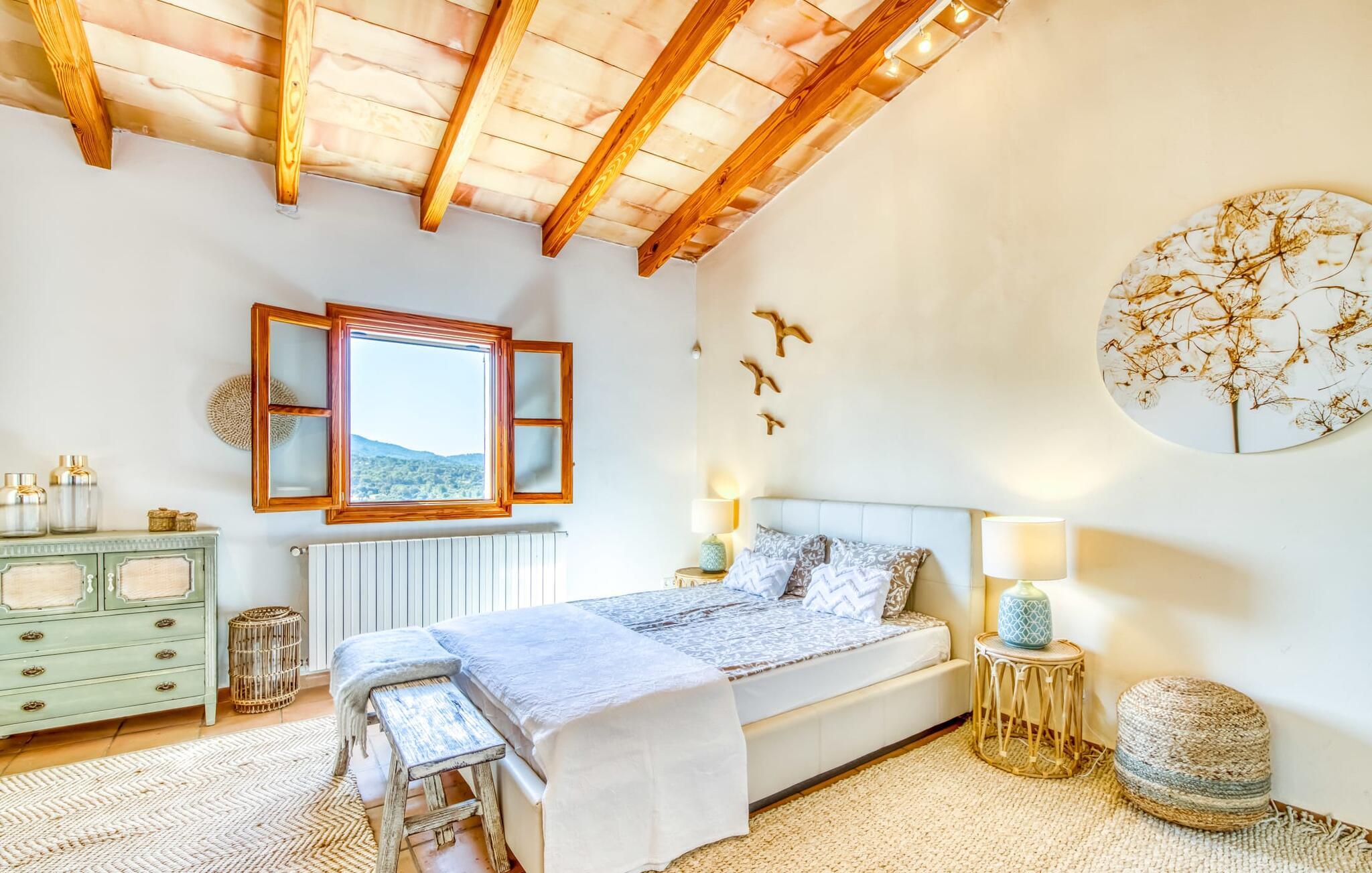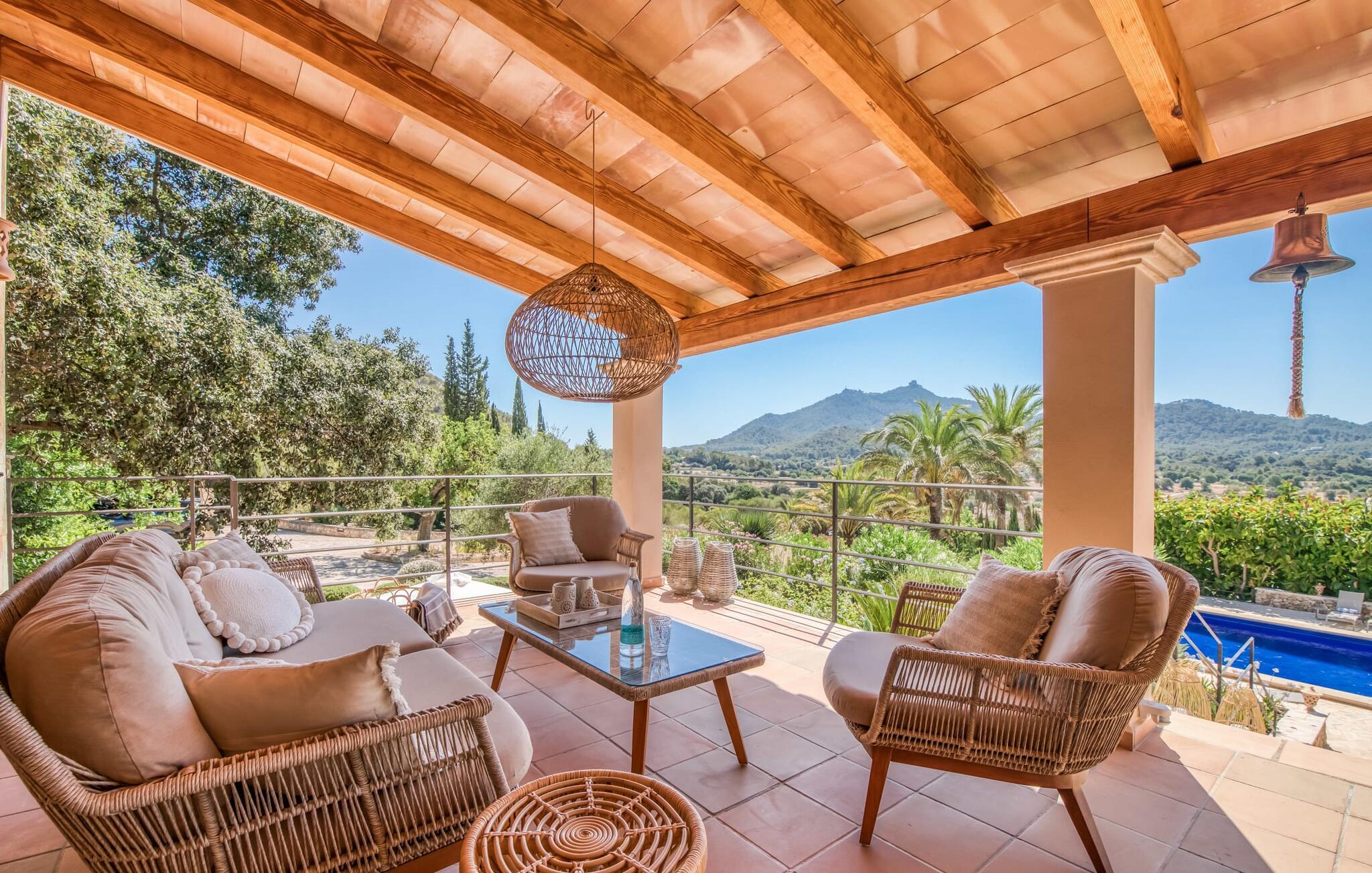 Oplev et sandt ferieparadis bag den elektriske port på "Casa Amorena". Denne udsøgte naturstensvilla, kærligt indrettet af sine tyske ejere, bevarer sin rustikke charme, mens den tilbyder moderne komfort. Beliggende i skovklædte bakker, har ejendommen en fantastisk have med palmer og cypresser, der blander sig problemfrit med den betagende udsigt over San Salvador-bjergene. Den glitrende pool med panoramaterrasse, højkvalitets rattan liggestole og en Bali seng inviterer jer til at slappe af. Et mezzaninniveau er ideelt til grillning, udstyret med en Weber-kulgrill og rigelige siddepladser, så I kan nyde essensen af Mallorca. For dem, der leder efter en aktiv ferie, har villaen et fitnesscenter, der er tilgængeligt fra haven. Den rummelige, udvendige suite i stueetagen med åbent badeværelse tilbyder også direkte adgang til poolen, mens der i stueetagen er en elegant opholds- og spisestue med pejs og XL-fladskærms-tv. Det luftige køkken og overdækkede terrasse tilføjer oplevelsen sammen med et yderligere soveværelse med dobbeltseng med en-suite badeværelse og privat balkon. Yderligere soveværelser og badeværelser er placeret ovenpå (der er ingen rækværk) med direkte adgang til den ekspansive loungebalkon. "Casa Amorena" tilbyder virkelig plads nok til alle. Stilfuldt renoveret, smuk tysklavet villa! Den terrasseret "Casa Amorena", i en rolig, afsondret beliggenhed kun 3 km fra Felanitx, kunne være kærlighed ved første blik. Et supermarked og et ugentligt marked, caféer og restauranter ligger kun få minutters kørsel væk i byen, og strandene ligger kun 15 km væk på den sydøstlige kyst.