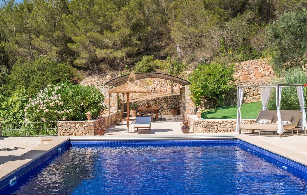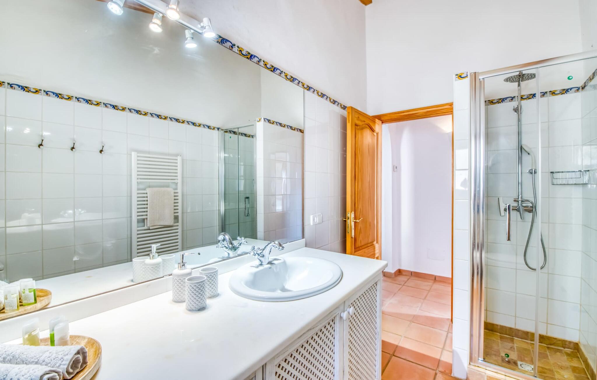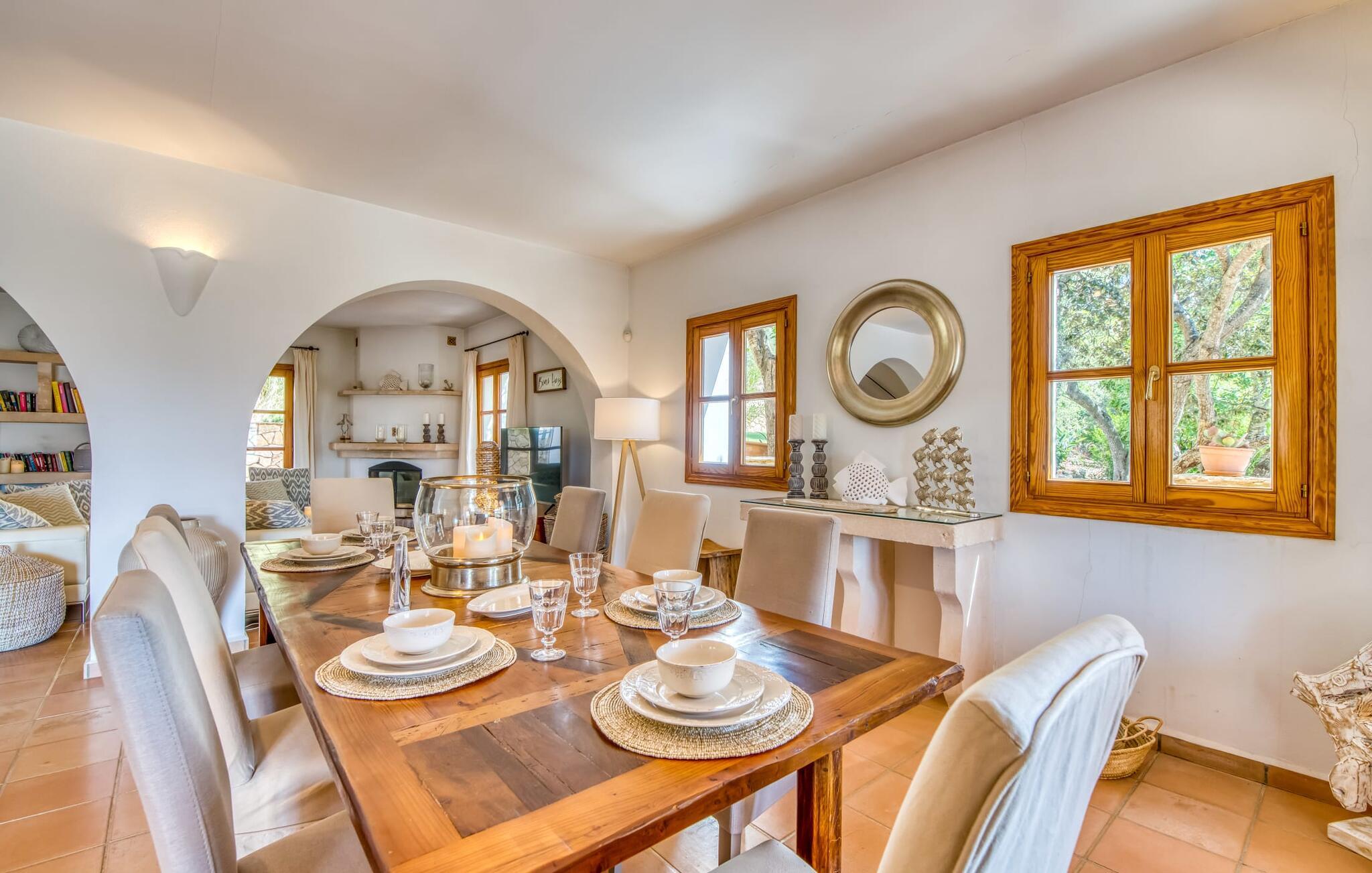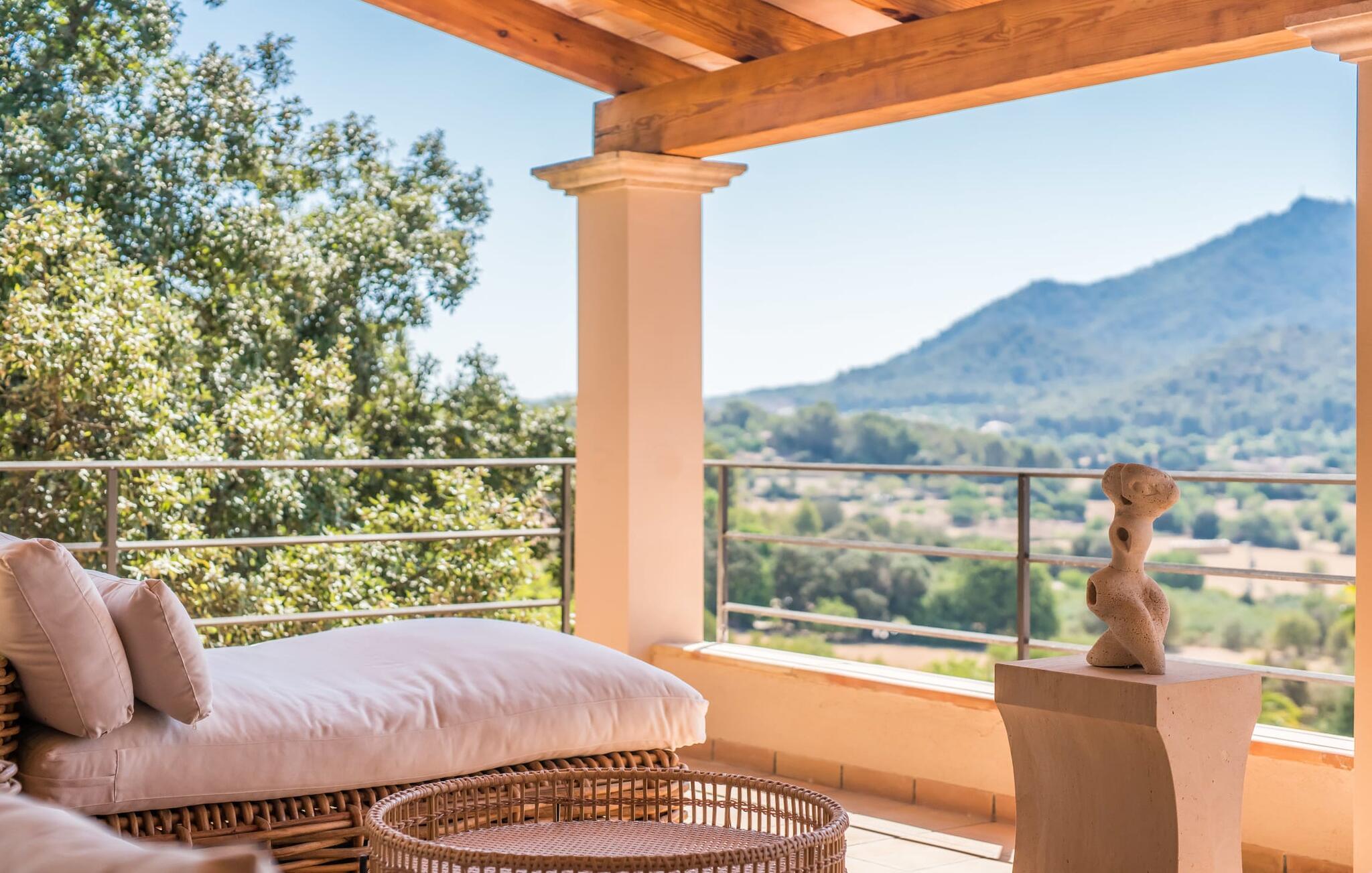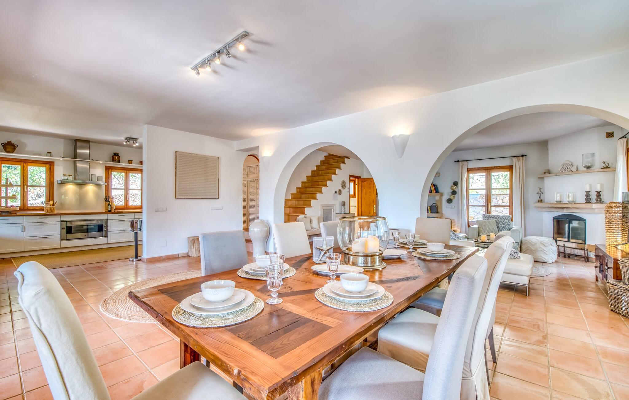 Oplev et sandt ferieparadis bag den elektriske port på "Casa Amorena". Denne udsøgte naturstensvilla, kærligt indrettet af sine tyske ejere, bevarer sin rustikke charme, mens den tilbyder moderne komfort. Beliggende i skovklædte bakker, har ejendommen en fantastisk have med palmer og cypresser, der blander sig problemfrit med den betagende udsigt over San Salvador-bjergene. Den glitrende pool med panoramaterrasse, højkvalitets rattan liggestole og en Bali seng inviterer jer til at slappe af. Et mezzaninniveau er ideelt til grillning, udstyret med en Weber-kulgrill og rigelige siddepladser, så I kan nyde essensen af Mallorca. For dem, der leder efter en aktiv ferie, har villaen et fitnesscenter, der er tilgængeligt fra haven. Den rummelige, udvendige suite i stueetagen med åbent badeværelse tilbyder også direkte adgang til poolen, mens der i stueetagen er en elegant opholds- og spisestue med pejs og XL-fladskærms-tv. Det luftige køkken og overdækkede terrasse tilføjer oplevelsen sammen med et yderligere soveværelse med dobbeltseng med en-suite badeværelse og privat balkon. Yderligere soveværelser og badeværelser er placeret ovenpå (der er ingen rækværk) med direkte adgang til den ekspansive loungebalkon. "Casa Amorena" tilbyder virkelig plads nok til alle. Stilfuldt renoveret, smuk tysklavet villa! Den terrasseret "Casa Amorena", i en rolig, afsondret beliggenhed kun 3 km fra Felanitx, kunne være kærlighed ved første blik. Et supermarked og et ugentligt marked, caféer og restauranter ligger kun få minutters kørsel væk i byen, og strandene ligger kun 15 km væk på den sydøstlige kyst.