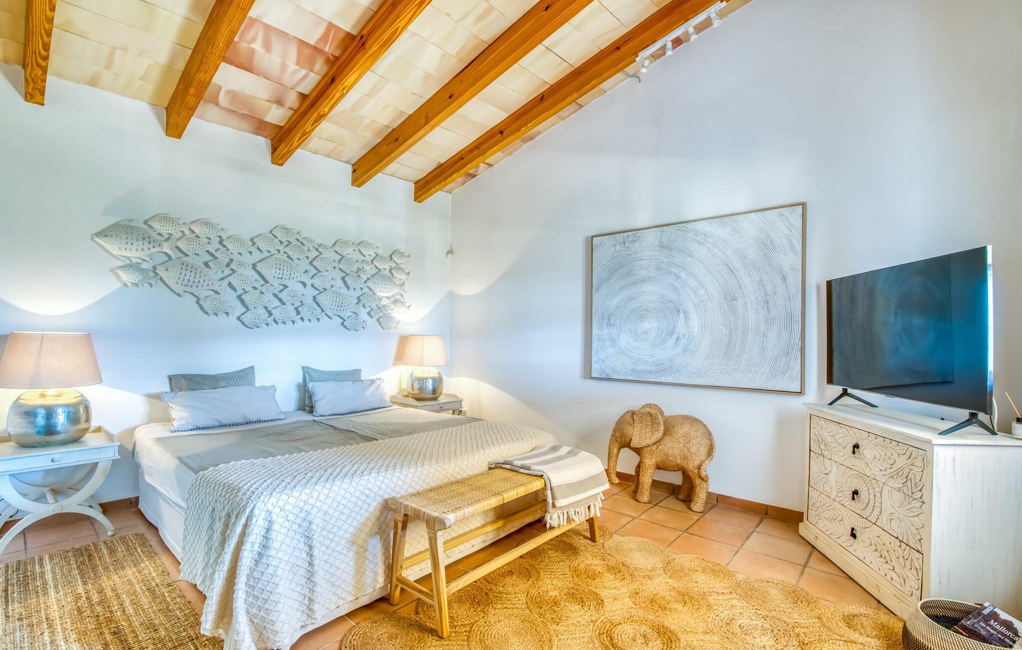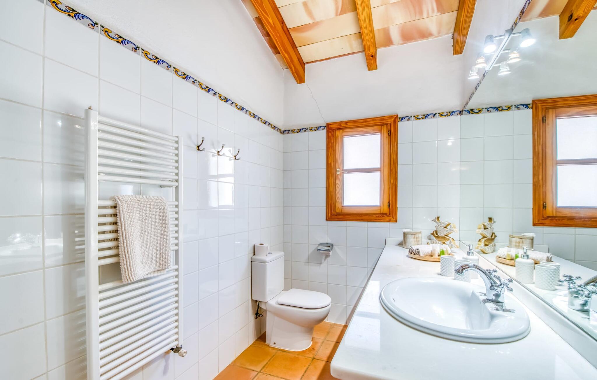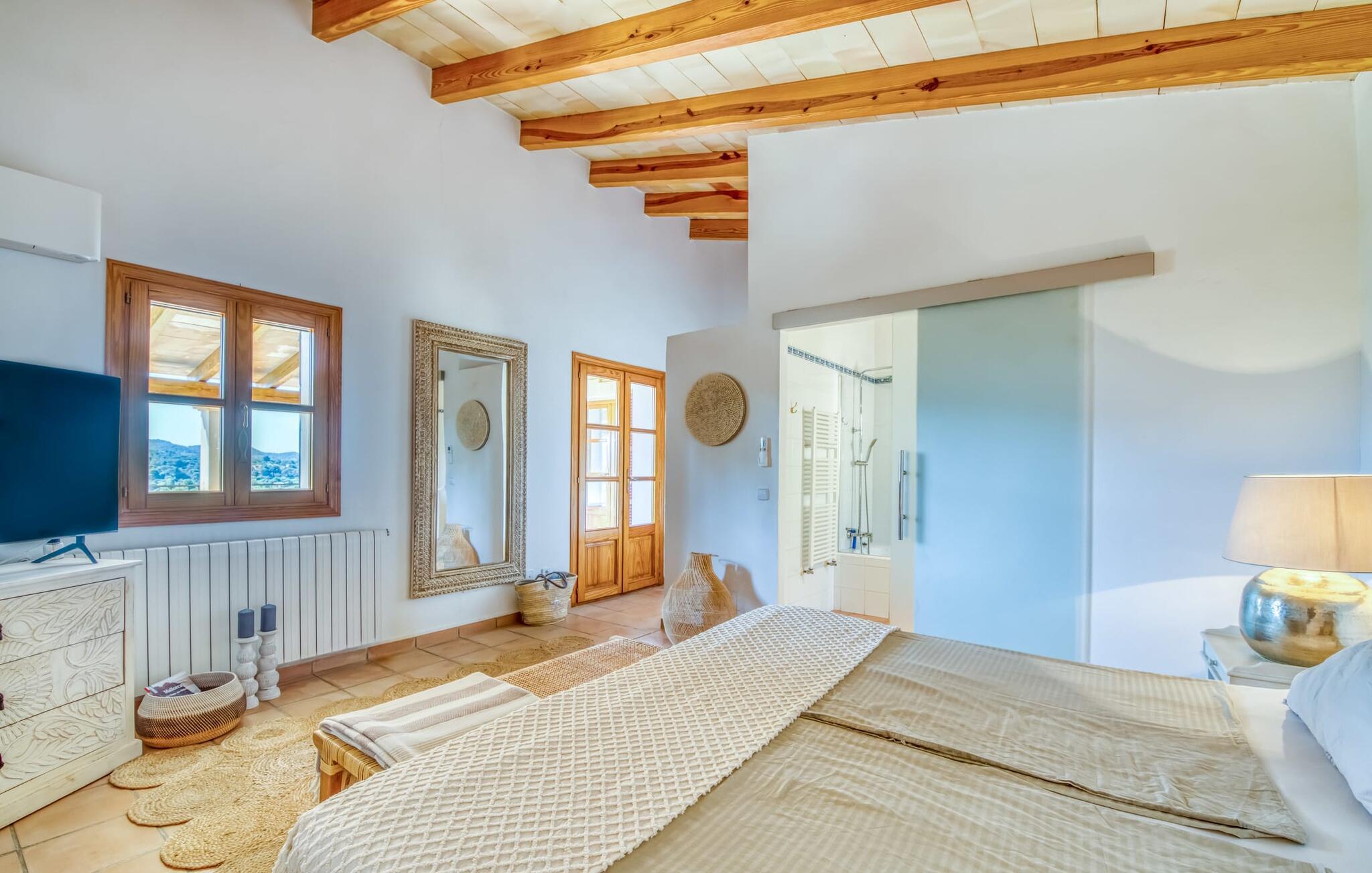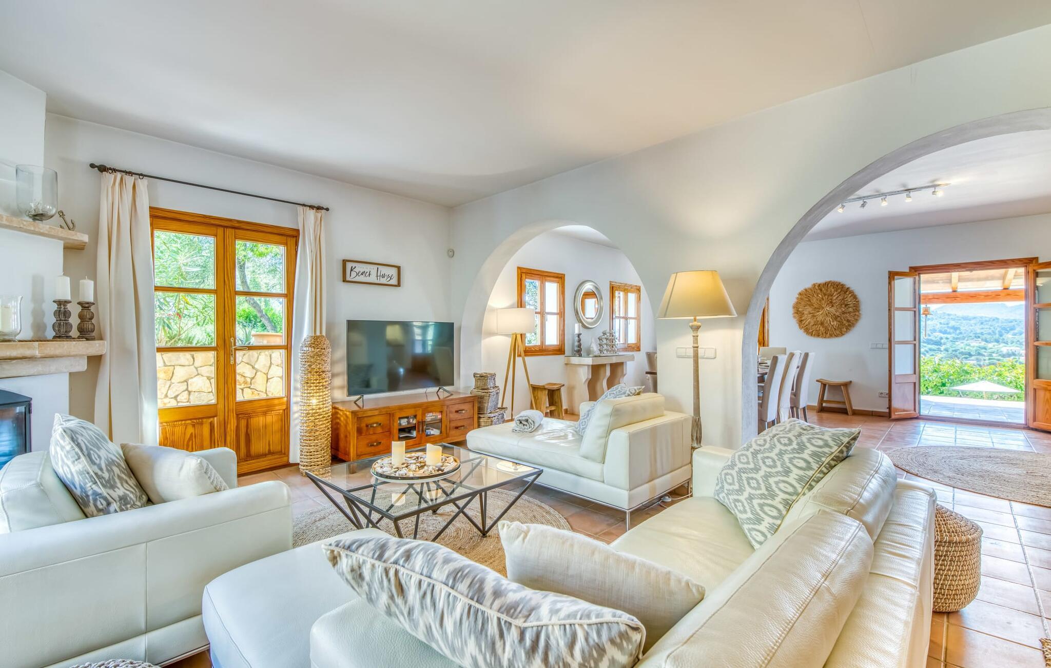 Oplev et sandt ferieparadis bag den elektriske port på "Casa Amorena". Denne udsøgte naturstensvilla, kærligt indrettet af sine tyske ejere, bevarer sin rustikke charme, mens den tilbyder moderne komfort. Beliggende i skovklædte bakker, har ejendommen en fantastisk have med palmer og cypresser, der blander sig problemfrit med den betagende udsigt over San Salvador-bjergene. Den glitrende pool med panoramaterrasse, højkvalitets rattan liggestole og en Bali seng inviterer jer til at slappe af. Et mezzaninniveau er ideelt til grillning, udstyret med en Weber-kulgrill og rigelige siddepladser, så I kan nyde essensen af Mallorca. For dem, der leder efter en aktiv ferie, har villaen et fitnesscenter, der er tilgængeligt fra haven. Den rummelige, udvendige suite i stueetagen med åbent badeværelse tilbyder også direkte adgang til poolen, mens der i stueetagen er en elegant opholds- og spisestue med pejs og XL-fladskærms-tv. Det luftige køkken og overdækkede terrasse tilføjer oplevelsen sammen med et yderligere soveværelse med dobbeltseng med en-suite badeværelse og privat balkon. Yderligere soveværelser og badeværelser er placeret ovenpå (der er ingen rækværk) med direkte adgang til den ekspansive loungebalkon. "Casa Amorena" tilbyder virkelig plads nok til alle. Stilfuldt renoveret, smuk tysklavet villa! Den terrasseret "Casa Amorena", i en rolig, afsondret beliggenhed kun 3 km fra Felanitx, kunne være kærlighed ved første blik. Et supermarked og et ugentligt marked, caféer og restauranter ligger kun få minutters kørsel væk i byen, og strandene ligger kun 15 km væk på den sydøstlige kyst.