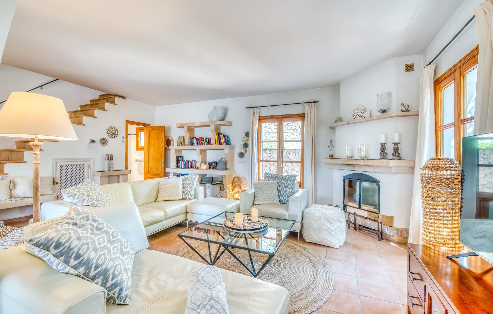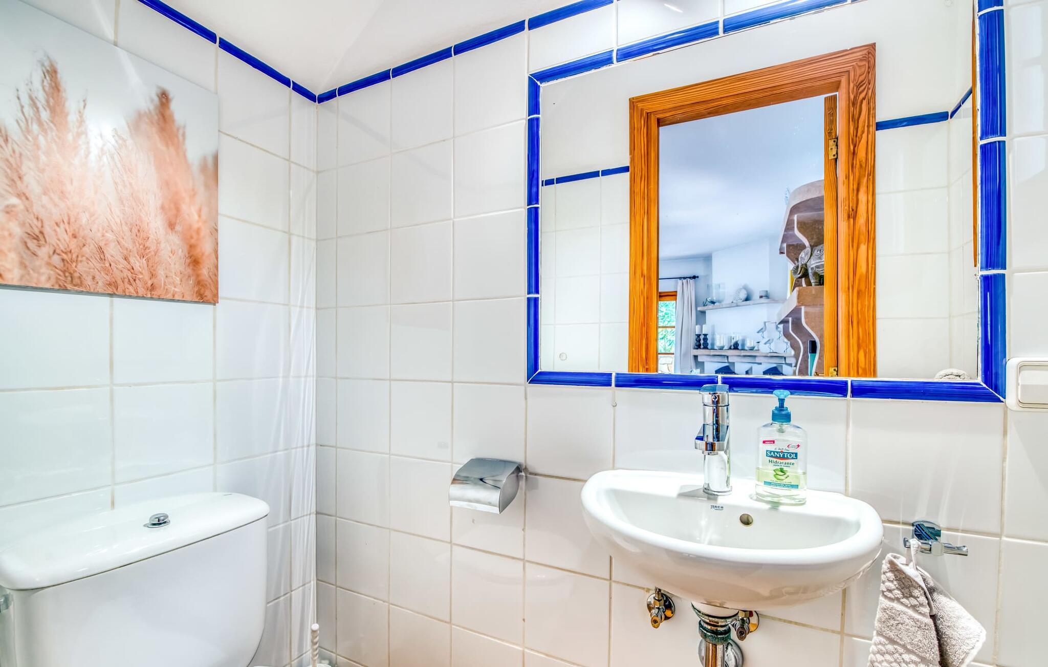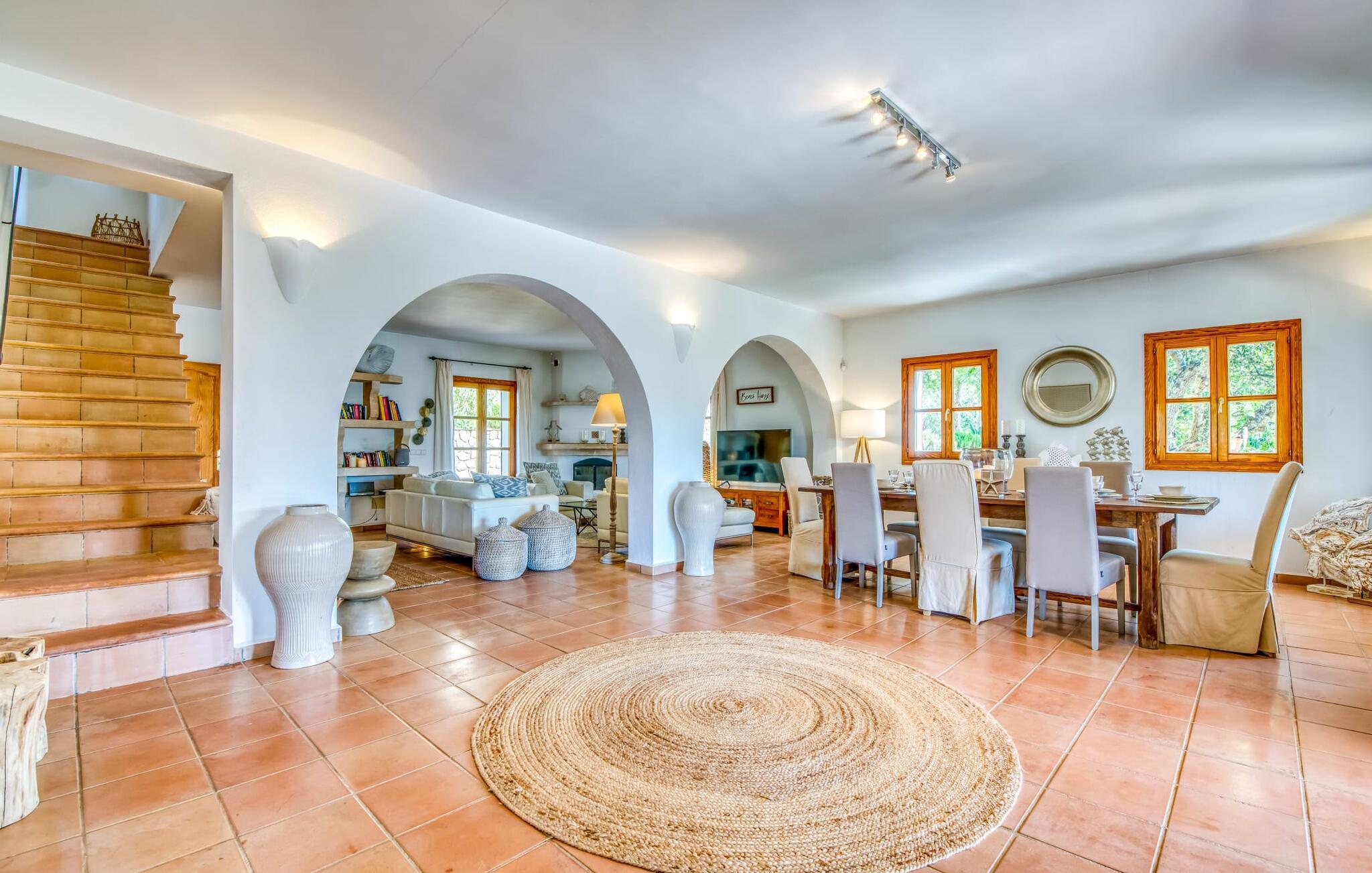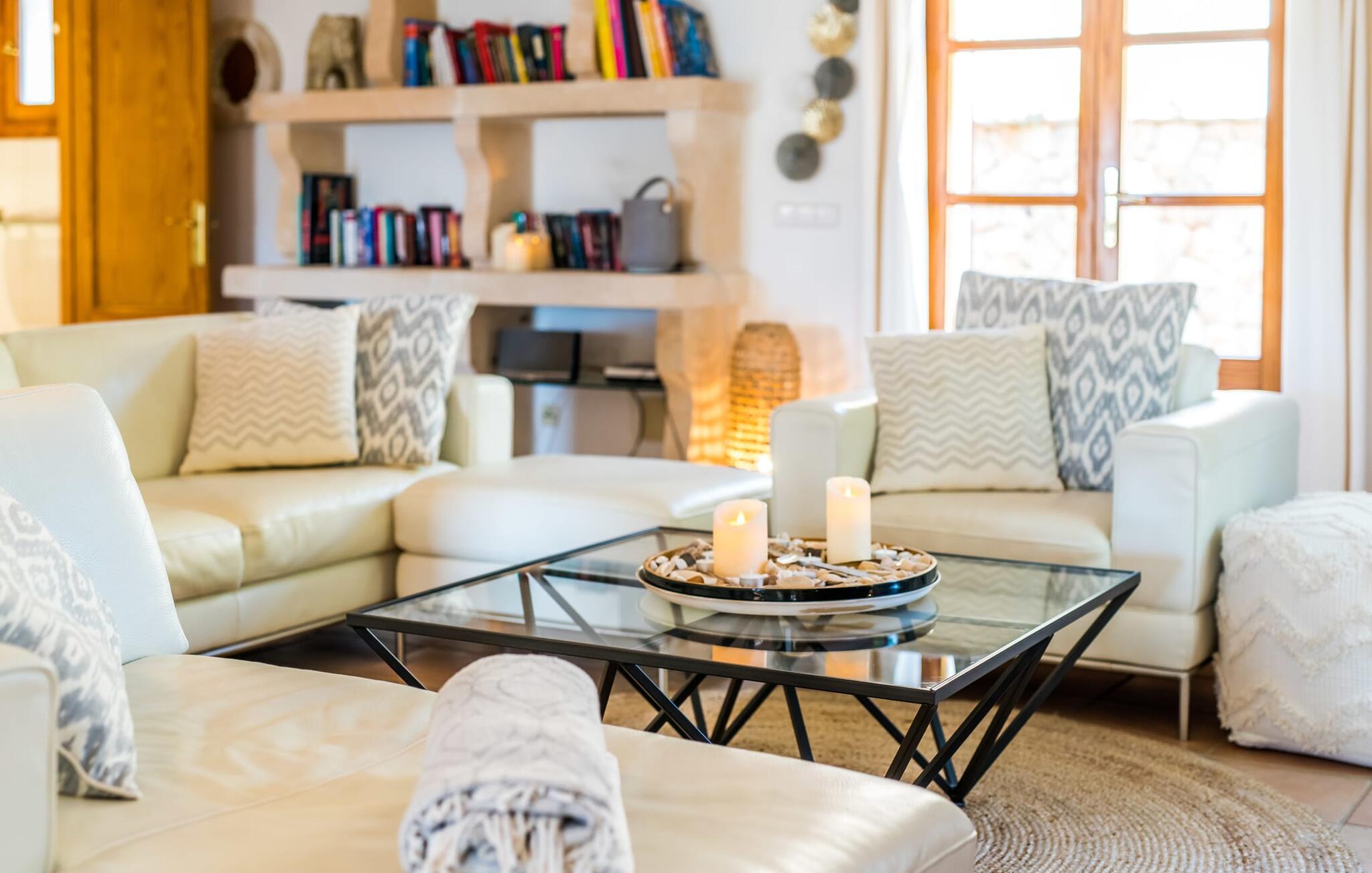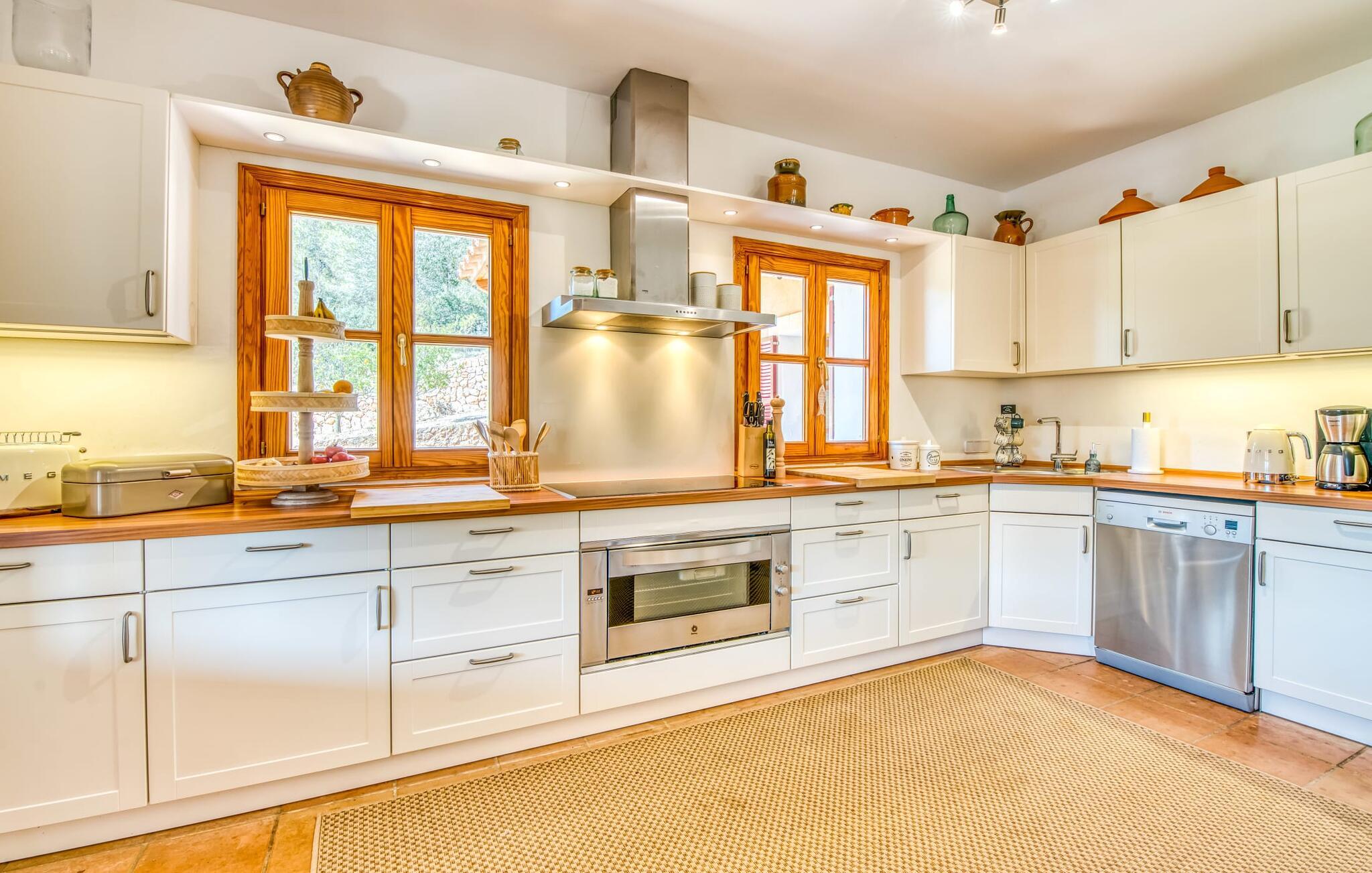 Oplev et sandt ferieparadis bag den elektriske port på "Casa Amorena". Denne udsøgte naturstensvilla, kærligt indrettet af sine tyske ejere, bevarer sin rustikke charme, mens den tilbyder moderne komfort. Beliggende i skovklædte bakker, har ejendommen en fantastisk have med palmer og cypresser, der blander sig problemfrit med den betagende udsigt over San Salvador-bjergene. Den glitrende pool med panoramaterrasse, højkvalitets rattan liggestole og en Bali seng inviterer jer til at slappe af. Et mezzaninniveau er ideelt til grillning, udstyret med en Weber-kulgrill og rigelige siddepladser, så I kan nyde essensen af Mallorca. For dem, der leder efter en aktiv ferie, har villaen et fitnesscenter, der er tilgængeligt fra haven. Den rummelige, udvendige suite i stueetagen med åbent badeværelse tilbyder også direkte adgang til poolen, mens der i stueetagen er en elegant opholds- og spisestue med pejs og XL-fladskærms-tv. Det luftige køkken og overdækkede terrasse tilføjer oplevelsen sammen med et yderligere soveværelse med dobbeltseng med en-suite badeværelse og privat balkon. Yderligere soveværelser og badeværelser er placeret ovenpå (der er ingen rækværk) med direkte adgang til den ekspansive loungebalkon. "Casa Amorena" tilbyder virkelig plads nok til alle. Stilfuldt renoveret, smuk tysklavet villa! Den terrasseret "Casa Amorena", i en rolig, afsondret beliggenhed kun 3 km fra Felanitx, kunne være kærlighed ved første blik. Et supermarked og et ugentligt marked, caféer og restauranter ligger kun få minutters kørsel væk i byen, og strandene ligger kun 15 km væk på den sydøstlige kyst.