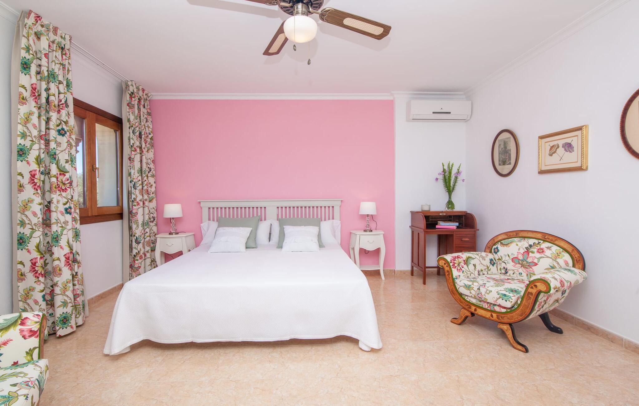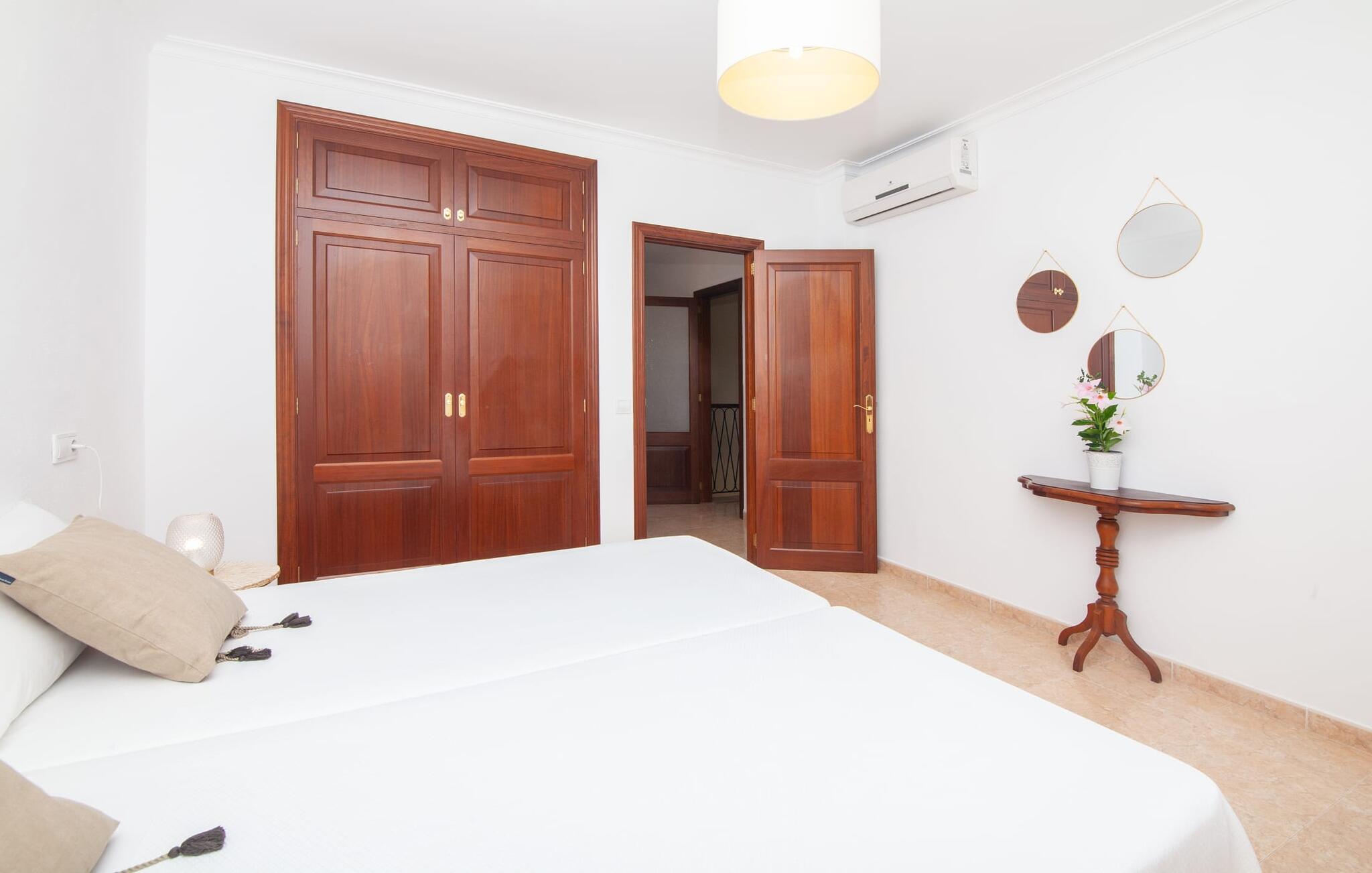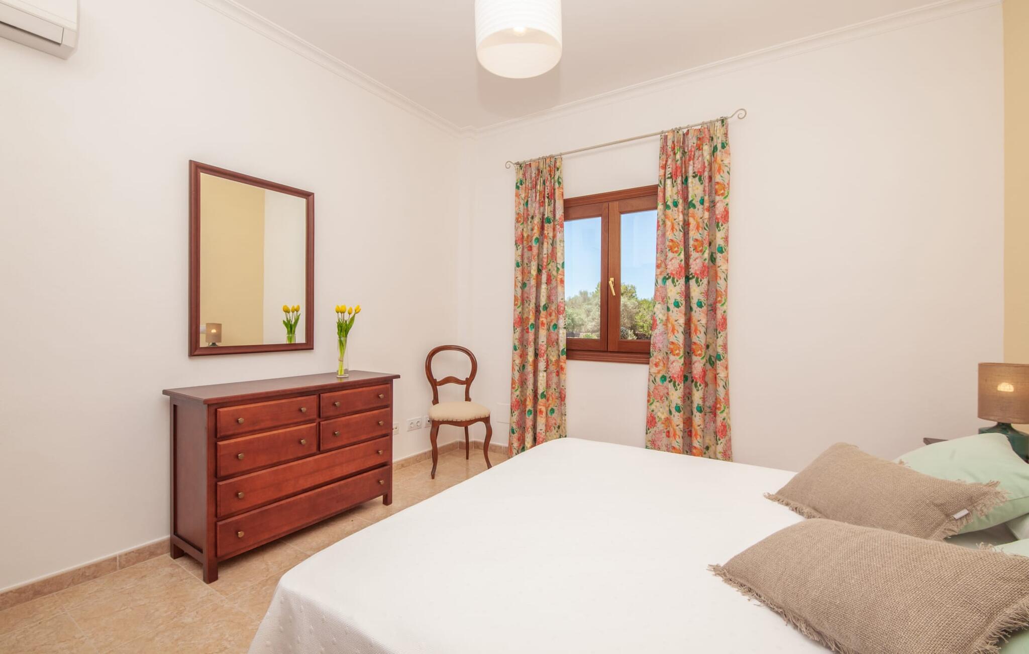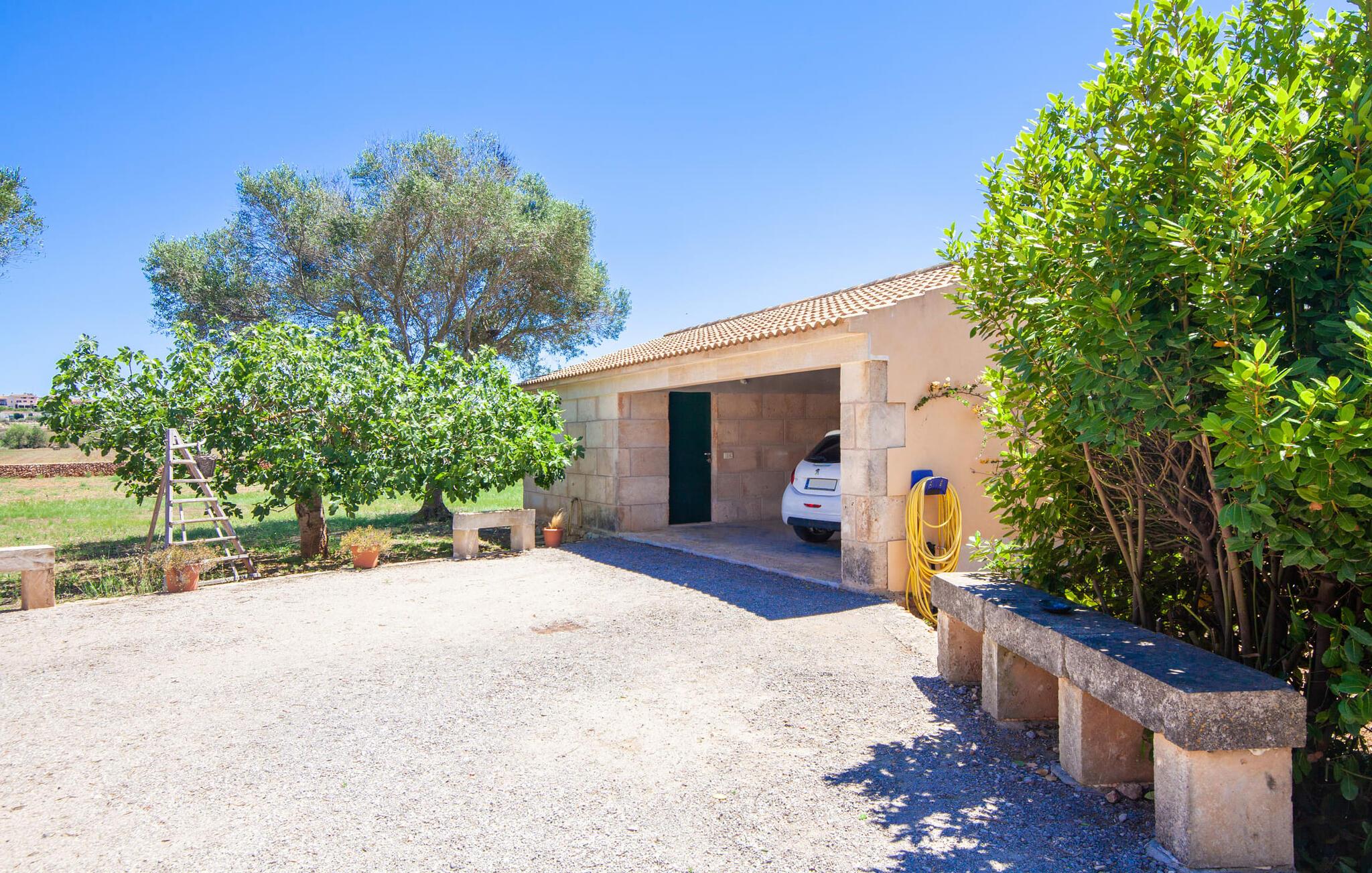 En kæmpe indhegnet ejendom giver en ferie i denne finca på Mallorca en intens oplevelse af frihed og rum. Dette feriehus har dog meget mere at byde på, som I vil bemærke, når I kigger nærmere efter. Dette omfatter for eksempel den frodige vegetation inklusive gamle træer, der putter sig i haveområdet og giver luftig naturlig skygge og en helt idyllisk atmosfære, hvor I hurtigt og lykkeligt kan føle jer hjemme. Poolen byder på 8 x 4 m køligt, behageligt vand og er dekorativt dekoreret med mosaiksten og bugtende mønstre. Efter at have styrket jer selv, inviterer de komfortable liggestole jer til blot at glide ind på det smukkeste sted og måske forkæle jer selv med at lave ingenting. Et godt sted til morgenmad om morgenen eller grill om aftenen er den rummelige terrasse lige ved siden af huset, hvorfra I har en smuk udsigt over haven og poolområdet. Altanen på øverste etage er også et skønt sted at sidde – med en fantastisk udsigt. Det indre af huset er ret uhøjtideligt uden at være almindeligt. Solide møbler, masser af træ og nogle få moderate, men dygtigt placerede accenter skaber en meget indbydende boligatmosfære, som også gør opholdet indendørs meget attraktivt. Slap behageligt af på en af de stilfulde sofaer eller sæt jer sammen ved spisebordet i det rummelige, veludstyrede køkken. Et soveværelse med dobbeltseng, et badeværelse og et gæstetoilet er også placeret i stueetagen, mens de to andre soveværelser og det andet badeværelse er placeret ovenpå. Soveværelserne er lidt forskellige i stilen, så alle kan vælge deres perfekte nattesøvn baseret på deres individuelle præferencer. Begge badeværelser har naturligt lys og er udstyret med brusebadekar. Hos Fincallorca mener vi, at dette hus på Mallorca er ideelt for familier, der leder efter fred, eller for par, der rejser sammen, som værdsætter en elegant atmosfære, nærhed til stranden og fremragende værdi for pengene. Den meget velholdte finca "Casa Andrea" er roligt beliggende nær Ses Salines på en grund på 17.000 m². De nærmeste strande ligger blot et par kilometer væk, herunder den populære Es Trenc. I kan gøre jeres daglige indkøb i Santanyi (ca. 15 minutter i bil). Cala Figuera, ca. Byen, 13 km væk, inviterer jer til at slentre og dvæle med sin smukke kystpromenade. Aircondition i ejendommen er inkluderet i prisen, men dets brug er begrænset til 9:00 til 9:00. Gebyret afregnes herefter kontant på stedet.