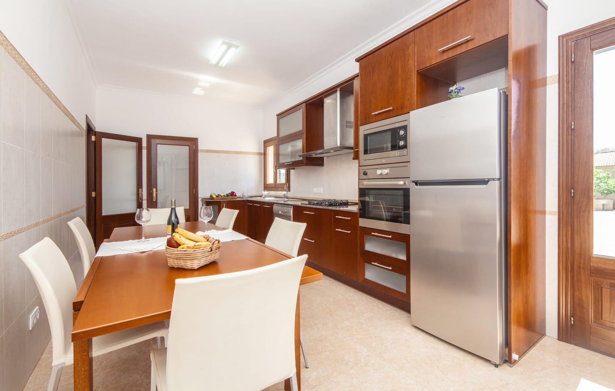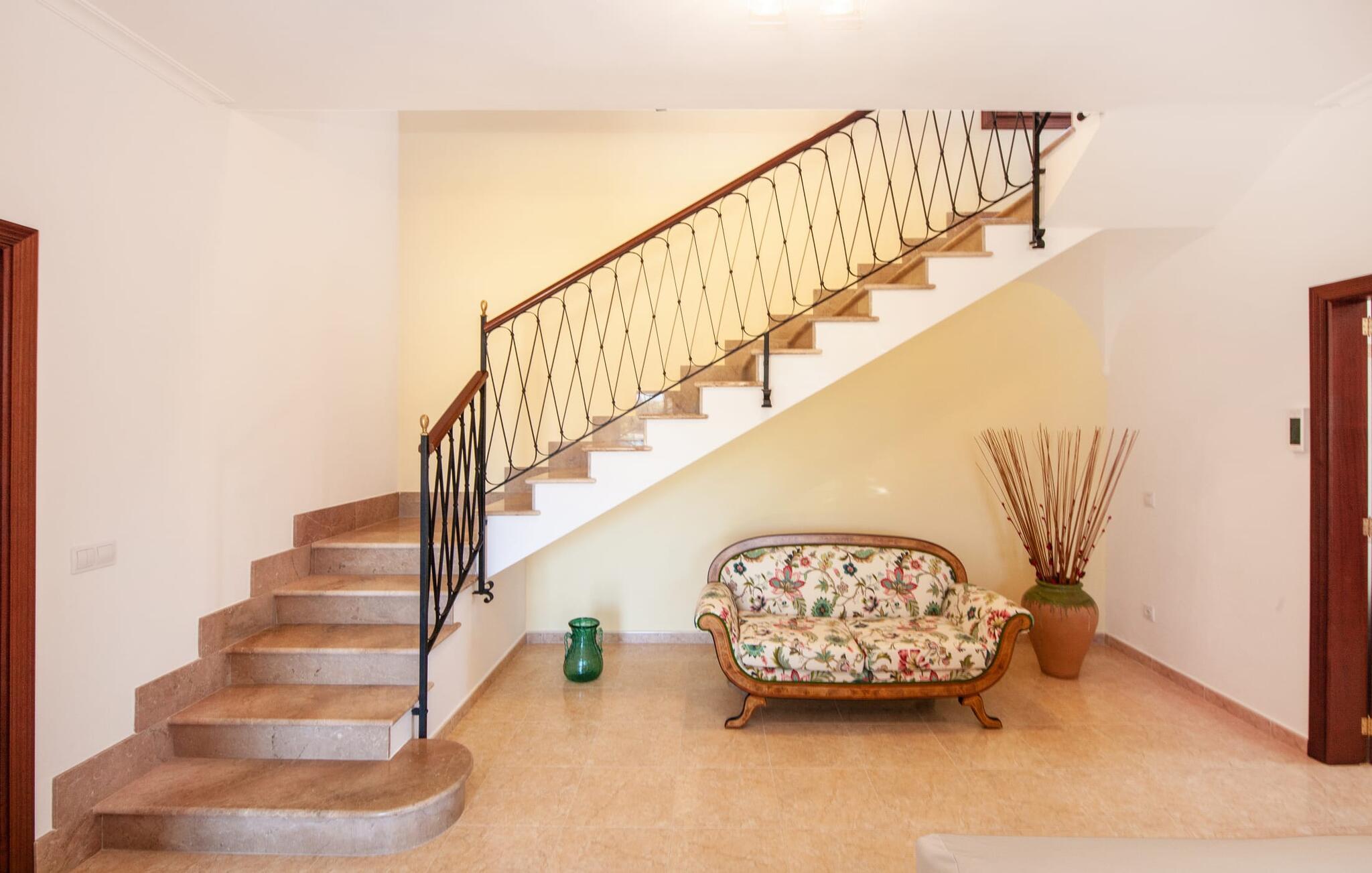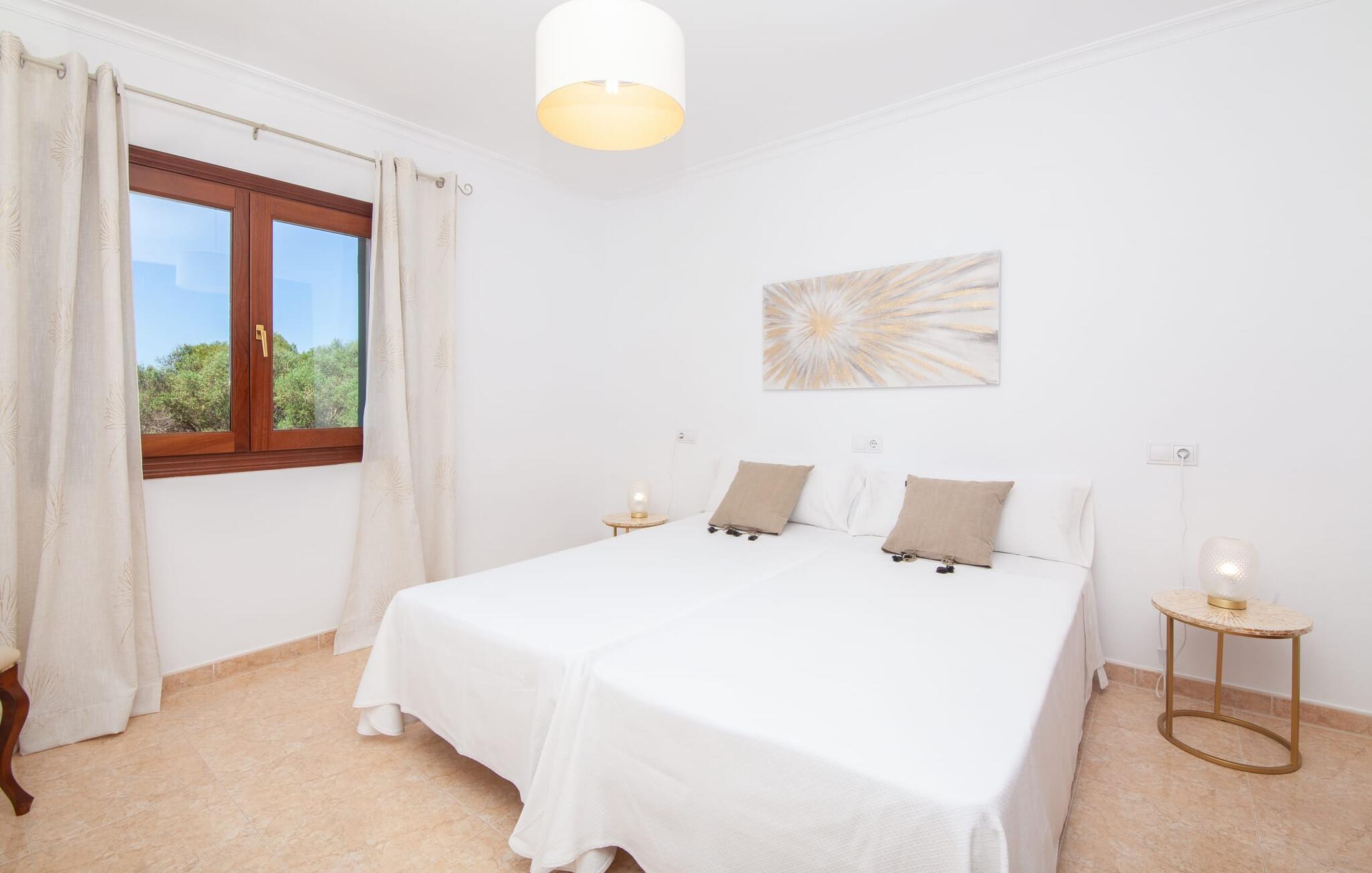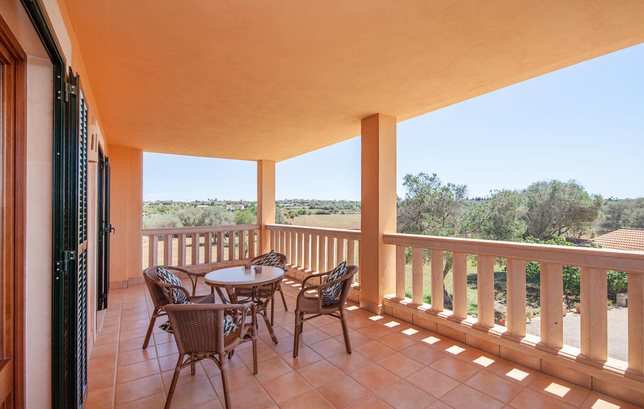 En kæmpe indhegnet ejendom giver en ferie i denne finca på Mallorca en intens oplevelse af frihed og rum. Dette feriehus har dog meget mere at byde på, som I vil bemærke, når I kigger nærmere efter. Dette omfatter for eksempel den frodige vegetation inklusive gamle træer, der putter sig i haveområdet og giver luftig naturlig skygge og en helt idyllisk atmosfære, hvor I hurtigt og lykkeligt kan føle jer hjemme. Poolen byder på 8 x 4 m køligt, behageligt vand og er dekorativt dekoreret med mosaiksten og bugtende mønstre. Efter at have styrket jer selv, inviterer de komfortable liggestole jer til blot at glide ind på det smukkeste sted og måske forkæle jer selv med at lave ingenting. Et godt sted til morgenmad om morgenen eller grill om aftenen er den rummelige terrasse lige ved siden af huset, hvorfra I har en smuk udsigt over haven og poolområdet. Altanen på øverste etage er også et skønt sted at sidde – med en fantastisk udsigt. Det indre af huset er ret uhøjtideligt uden at være almindeligt. Solide møbler, masser af træ og nogle få moderate, men dygtigt placerede accenter skaber en meget indbydende boligatmosfære, som også gør opholdet indendørs meget attraktivt. Slap behageligt af på en af de stilfulde sofaer eller sæt jer sammen ved spisebordet i det rummelige, veludstyrede køkken. Et soveværelse med dobbeltseng, et badeværelse og et gæstetoilet er også placeret i stueetagen, mens de to andre soveværelser og det andet badeværelse er placeret ovenpå. Soveværelserne er lidt forskellige i stilen, så alle kan vælge deres perfekte nattesøvn baseret på deres individuelle præferencer. Begge badeværelser har naturligt lys og er udstyret med brusebadekar. Hos Fincallorca mener vi, at dette hus på Mallorca er ideelt for familier, der leder efter fred, eller for par, der rejser sammen, som værdsætter en elegant atmosfære, nærhed til stranden og fremragende værdi for pengene. Den meget velholdte finca "Casa Andrea" er roligt beliggende nær Ses Salines på en grund på 17.000 m². De nærmeste strande ligger blot et par kilometer væk, herunder den populære Es Trenc. I kan gøre jeres daglige indkøb i Santanyi (ca. 15 minutter i bil). Cala Figuera, ca. Byen, 13 km væk, inviterer jer til at slentre og dvæle med sin smukke kystpromenade. Aircondition i ejendommen er inkluderet i prisen, men dets brug er begrænset til 9:00 til 9:00. Gebyret afregnes herefter kontant på stedet.