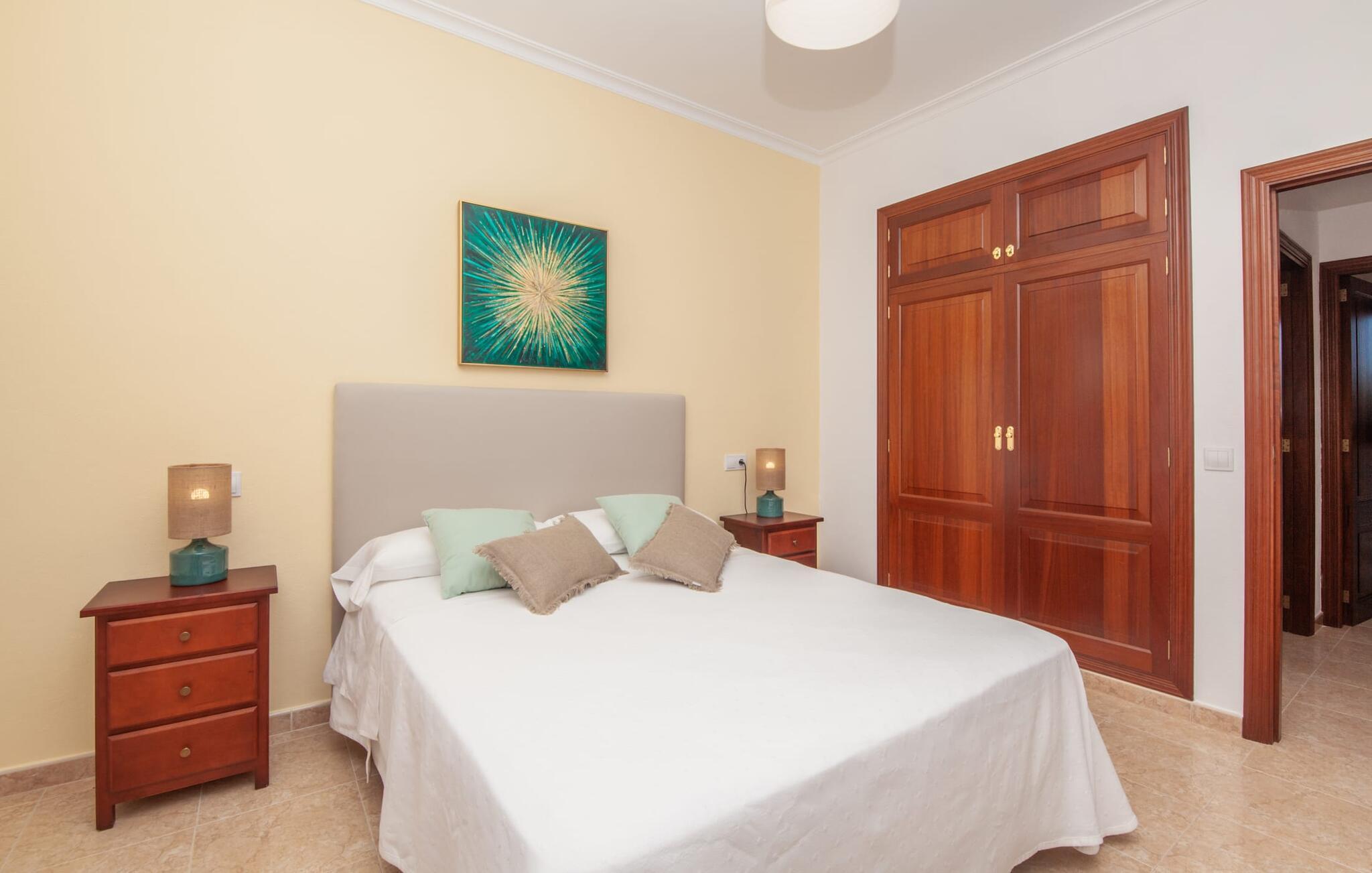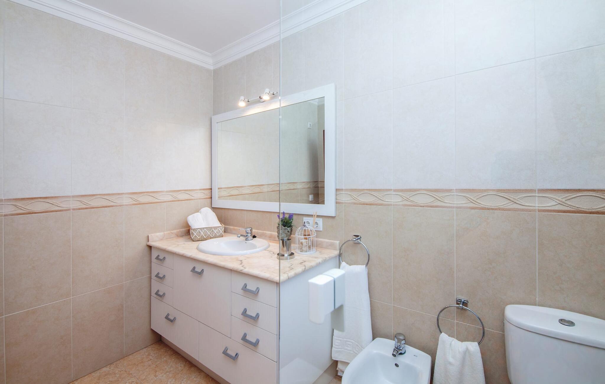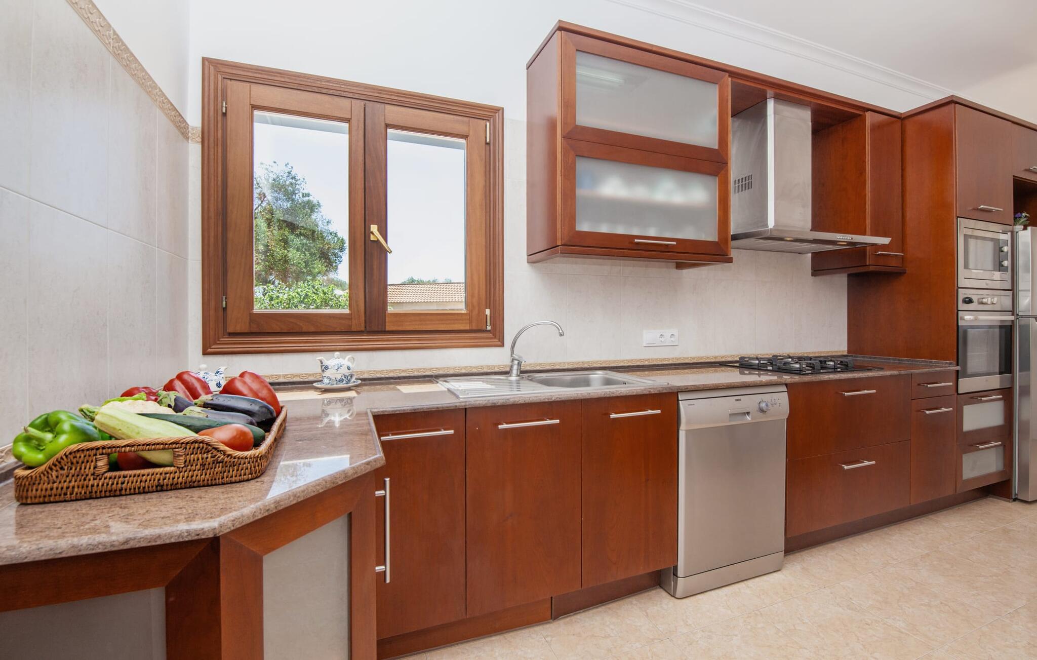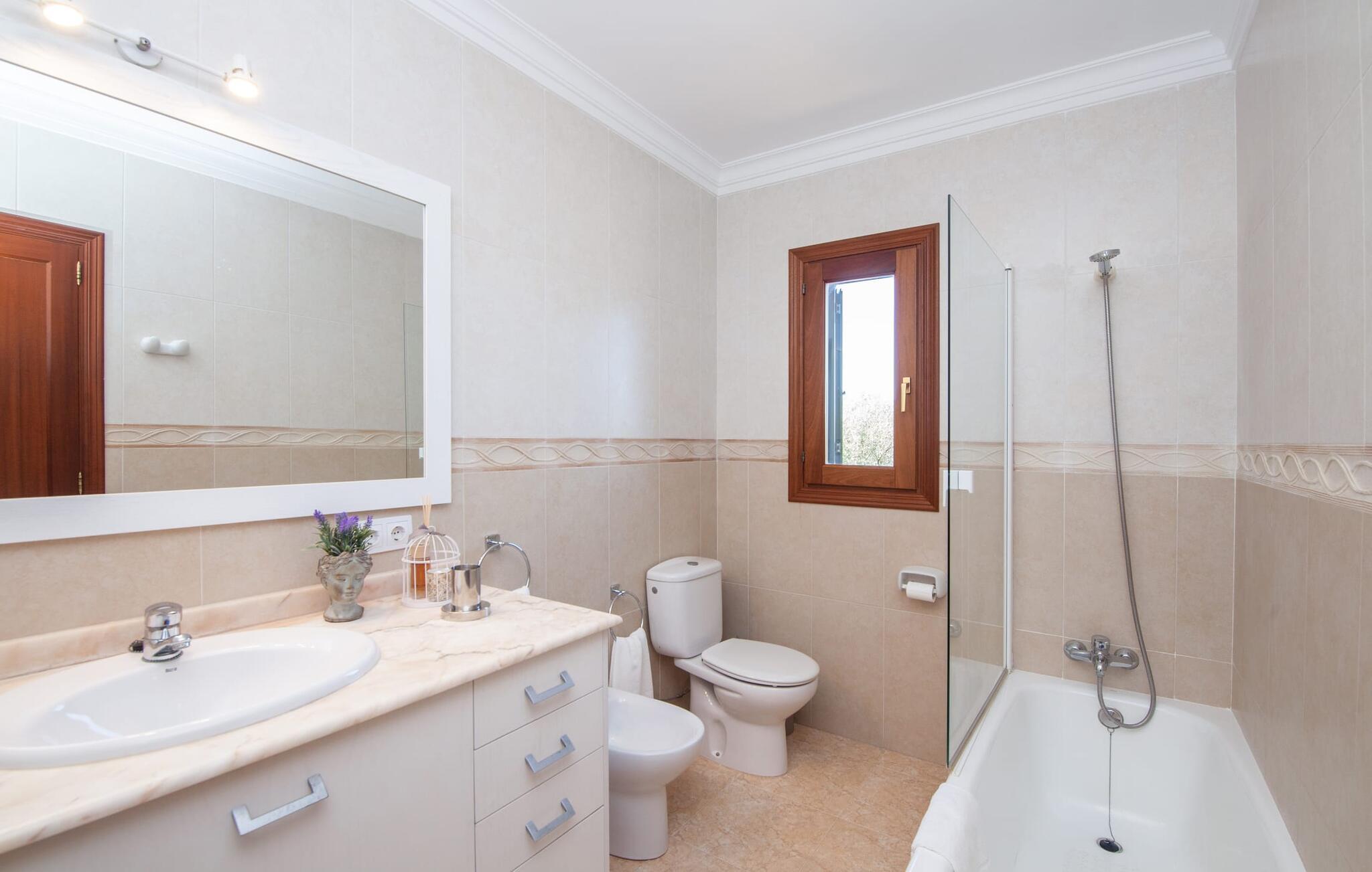 En kæmpe indhegnet ejendom giver en ferie i denne finca på Mallorca en intens oplevelse af frihed og rum. Dette feriehus har dog meget mere at byde på, som I vil bemærke, når I kigger nærmere efter. Dette omfatter for eksempel den frodige vegetation inklusive gamle træer, der putter sig i haveområdet og giver luftig naturlig skygge og en helt idyllisk atmosfære, hvor I hurtigt og lykkeligt kan føle jer hjemme. Poolen byder på 8 x 4 m køligt, behageligt vand og er dekorativt dekoreret med mosaiksten og bugtende mønstre. Efter at have styrket jer selv, inviterer de komfortable liggestole jer til blot at glide ind på det smukkeste sted og måske forkæle jer selv med at lave ingenting. Et godt sted til morgenmad om morgenen eller grill om aftenen er den rummelige terrasse lige ved siden af huset, hvorfra I har en smuk udsigt over haven og poolområdet. Altanen på øverste etage er også et skønt sted at sidde – med en fantastisk udsigt. Det indre af huset er ret uhøjtideligt uden at være almindeligt. Solide møbler, masser af træ og nogle få moderate, men dygtigt placerede accenter skaber en meget indbydende boligatmosfære, som også gør opholdet indendørs meget attraktivt. Slap behageligt af på en af de stilfulde sofaer eller sæt jer sammen ved spisebordet i det rummelige, veludstyrede køkken. Et soveværelse med dobbeltseng, et badeværelse og et gæstetoilet er også placeret i stueetagen, mens de to andre soveværelser og det andet badeværelse er placeret ovenpå. Soveværelserne er lidt forskellige i stilen, så alle kan vælge deres perfekte nattesøvn baseret på deres individuelle præferencer. Begge badeværelser har naturligt lys og er udstyret med brusebadekar. Hos Fincallorca mener vi, at dette hus på Mallorca er ideelt for familier, der leder efter fred, eller for par, der rejser sammen, som værdsætter en elegant atmosfære, nærhed til stranden og fremragende værdi for pengene. Den meget velholdte finca "Casa Andrea" er roligt beliggende nær Ses Salines på en grund på 17.000 m². De nærmeste strande ligger blot et par kilometer væk, herunder den populære Es Trenc. I kan gøre jeres daglige indkøb i Santanyi (ca. 15 minutter i bil). Cala Figuera, ca. Byen, 13 km væk, inviterer jer til at slentre og dvæle med sin smukke kystpromenade. Aircondition i ejendommen er inkluderet i prisen, men dets brug er begrænset til 9:00 til 9:00. Gebyret afregnes herefter kontant på stedet.
