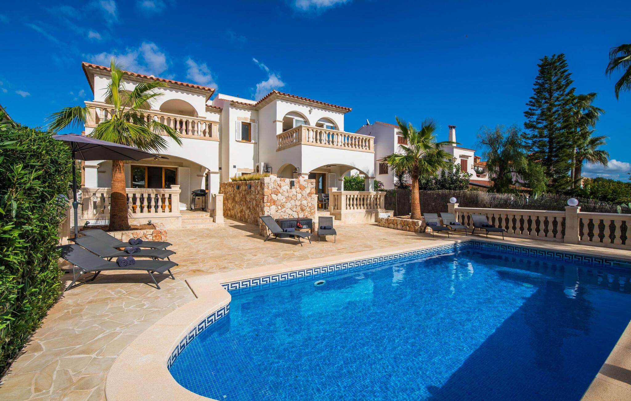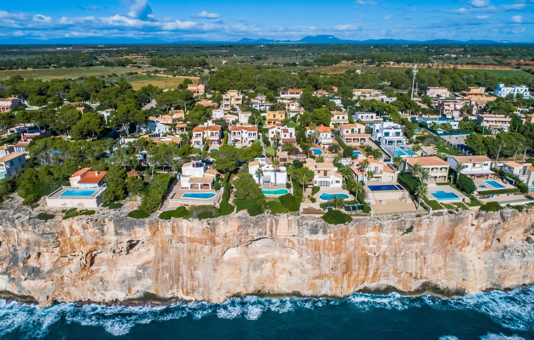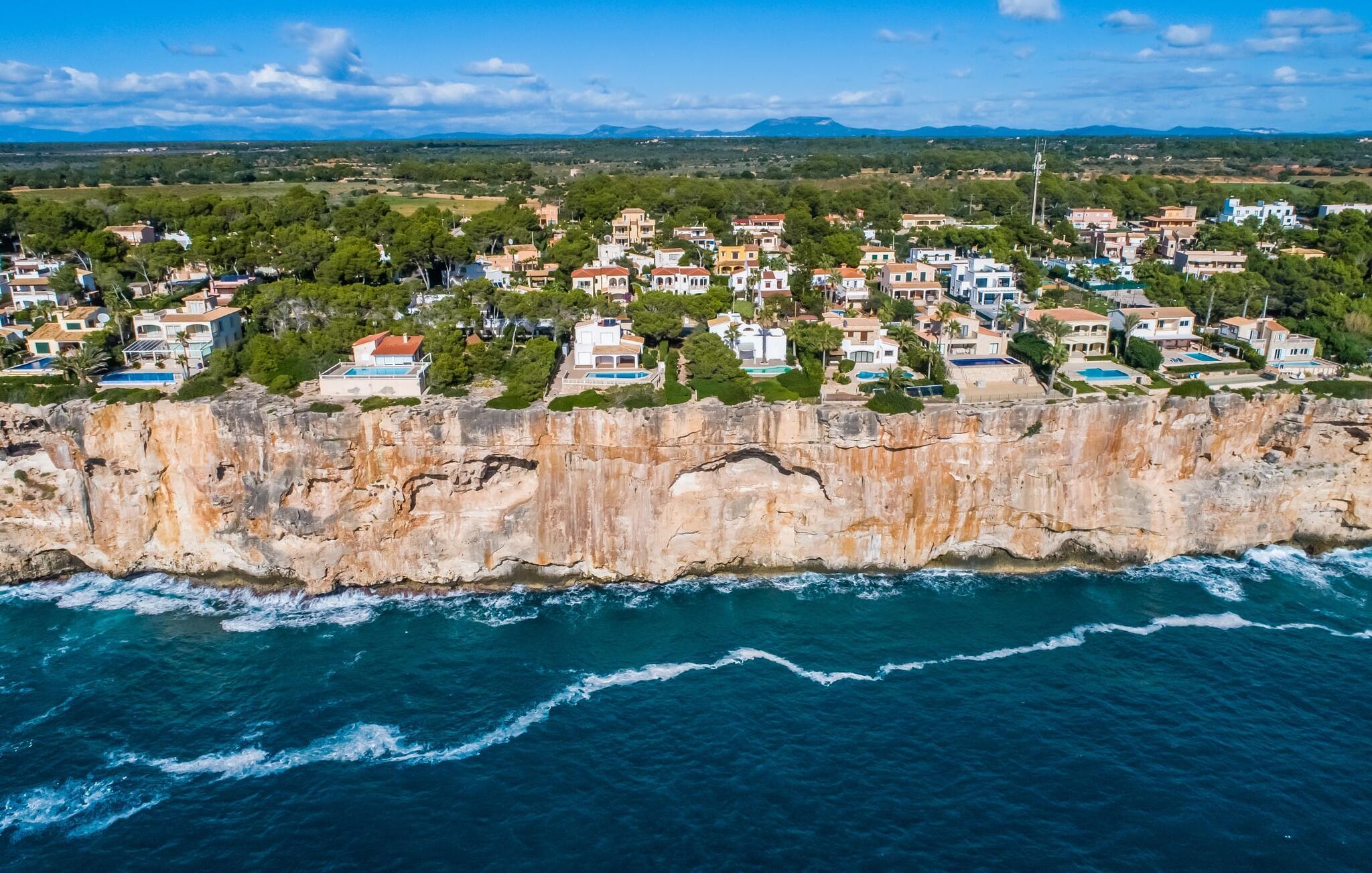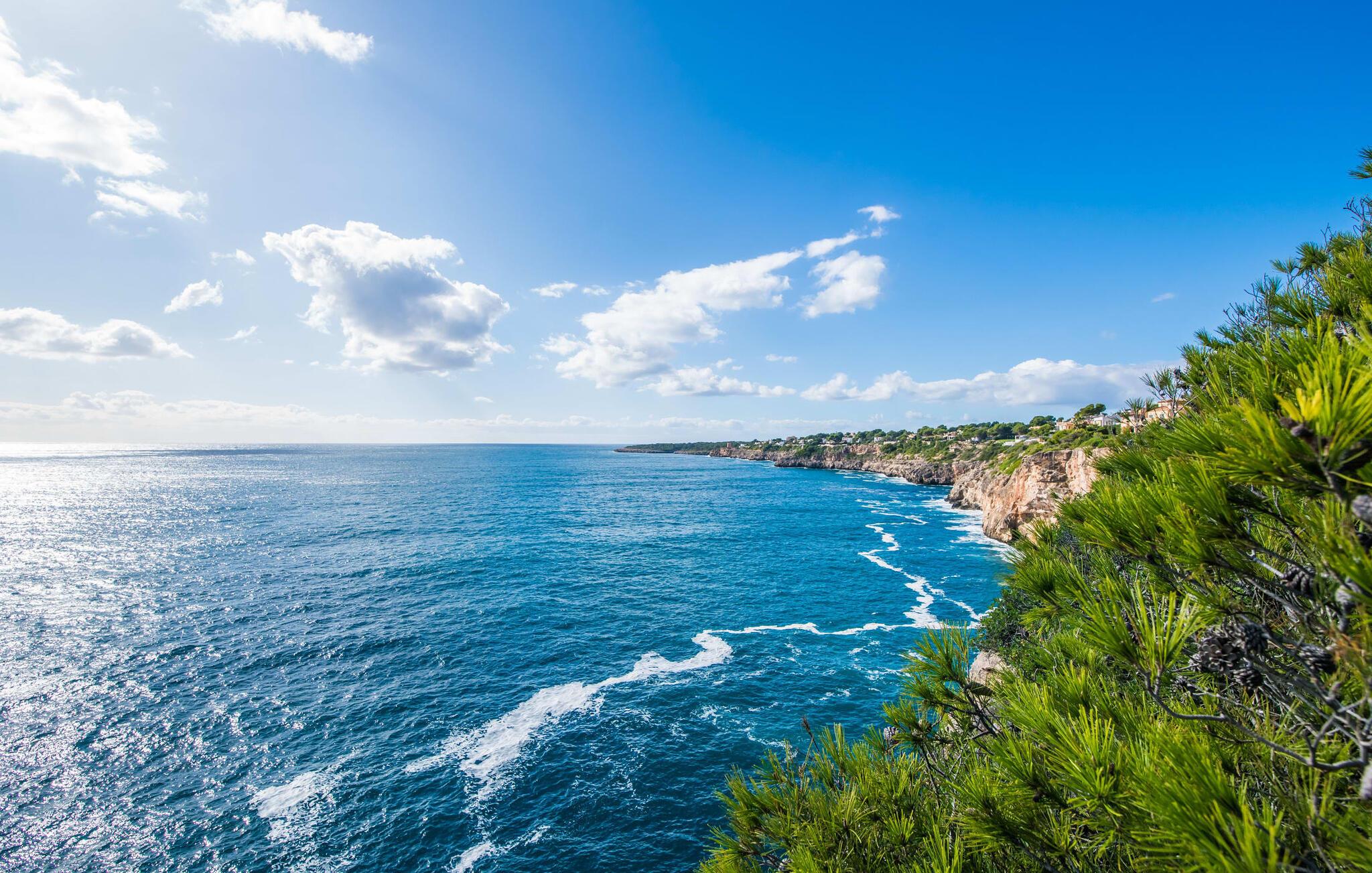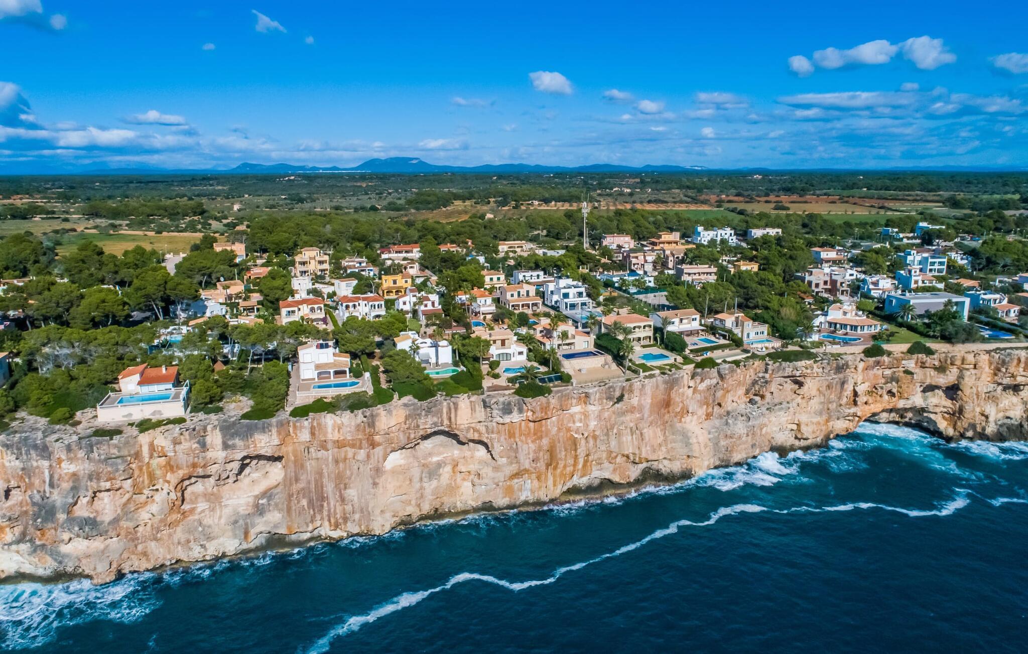 En blid havbrise, kombineret med luksuriøs flair, caribisk lethed og smittende munterhed, gør den strålende hvide finca "Casa Cuba" uimodståelig attraktiv. Palmer indrammer naturstensterrassen med smarte liggestole og parasol. Den fælles pool med sine bugtende mosaikfliser inviterer jer til at slappe af og deles med det tilstødende hus - en ideel ramme for en ferie med venner eller familie uden at ofre jeres privatliv. Den overdækkede terrasse er perfekt til at nyde måltider på varme sommerdage, måske tilberedt på grillen. Indvendigt har villaen et opholds- og spiseområde i åbent plan og et veludstyret køkken i amerikansk stil med morgenmadsbar, perfekt til fælles måltider med selvforplejning. Der er to dobbeltværelser med aircondition ovenpå og et tredje soveværelse med dobbeltseng nedenunder, samt to badeværelser med brusekabine. På første sal er der en rummelig, solrig altan med udsigt over palmer og fyrretræer og havet. Tagterrassen, som kan tilgås fra begge soveværelser, byder på masser af plads til en afslappet start eller afslutning på dagen. Denne villa er ideel for familier, der ønsker at nyde charmen ved livet på en kystø. Havudsigtsvillaen "Casa Cuba" ligger to gader fra de fænomenale klipper i den dejlige kystby Cala Pi. Denne velholdte urbanisering giver jer mulighed for at tilbringe vidunderlige timer på lange gåture langs den imponerende kystregion. I kan gøre jeres indkøb i de omkringliggende byer på den sydlige del af øen. Den fjordlignende, børnevenlige badebugt Cala Pi ligger kun 2 km væk.