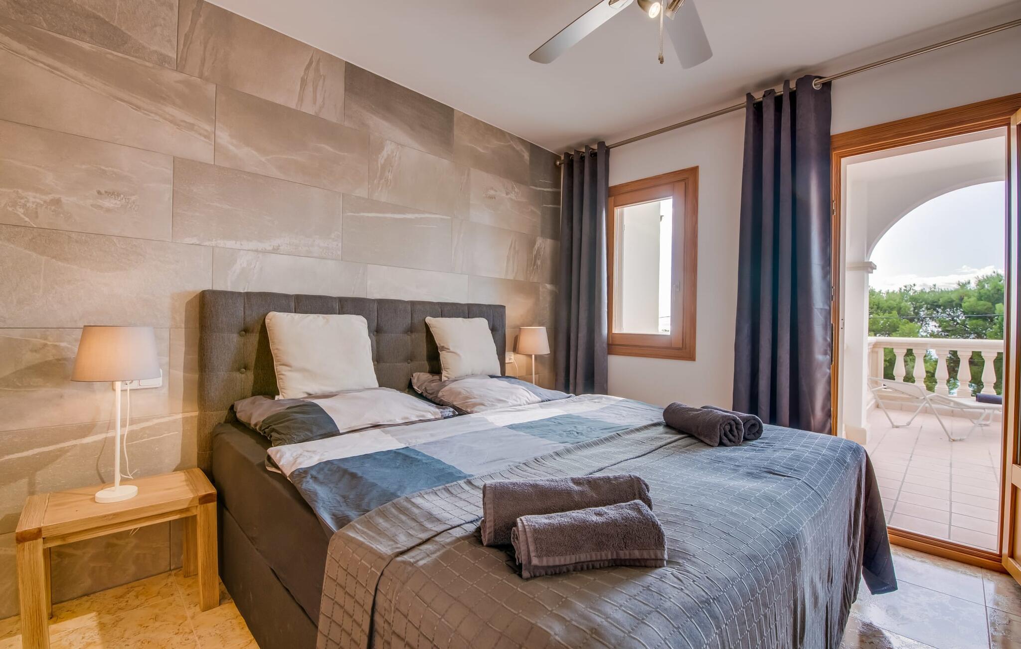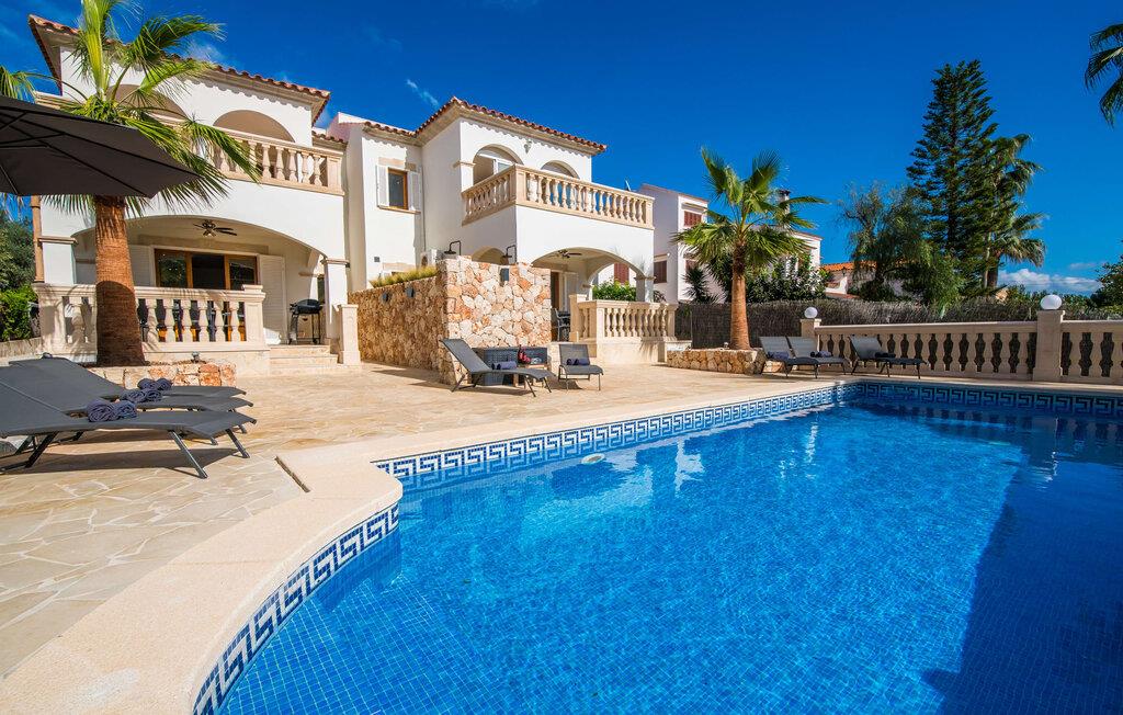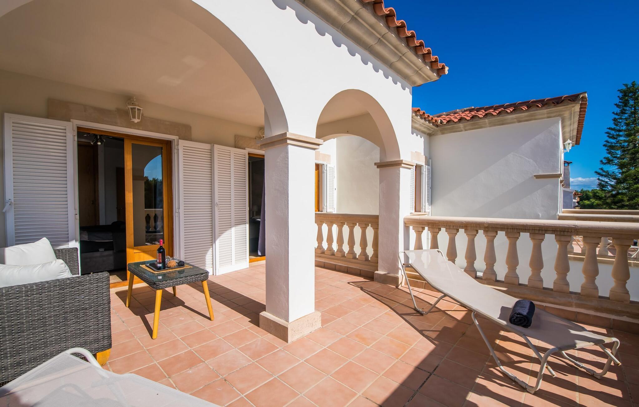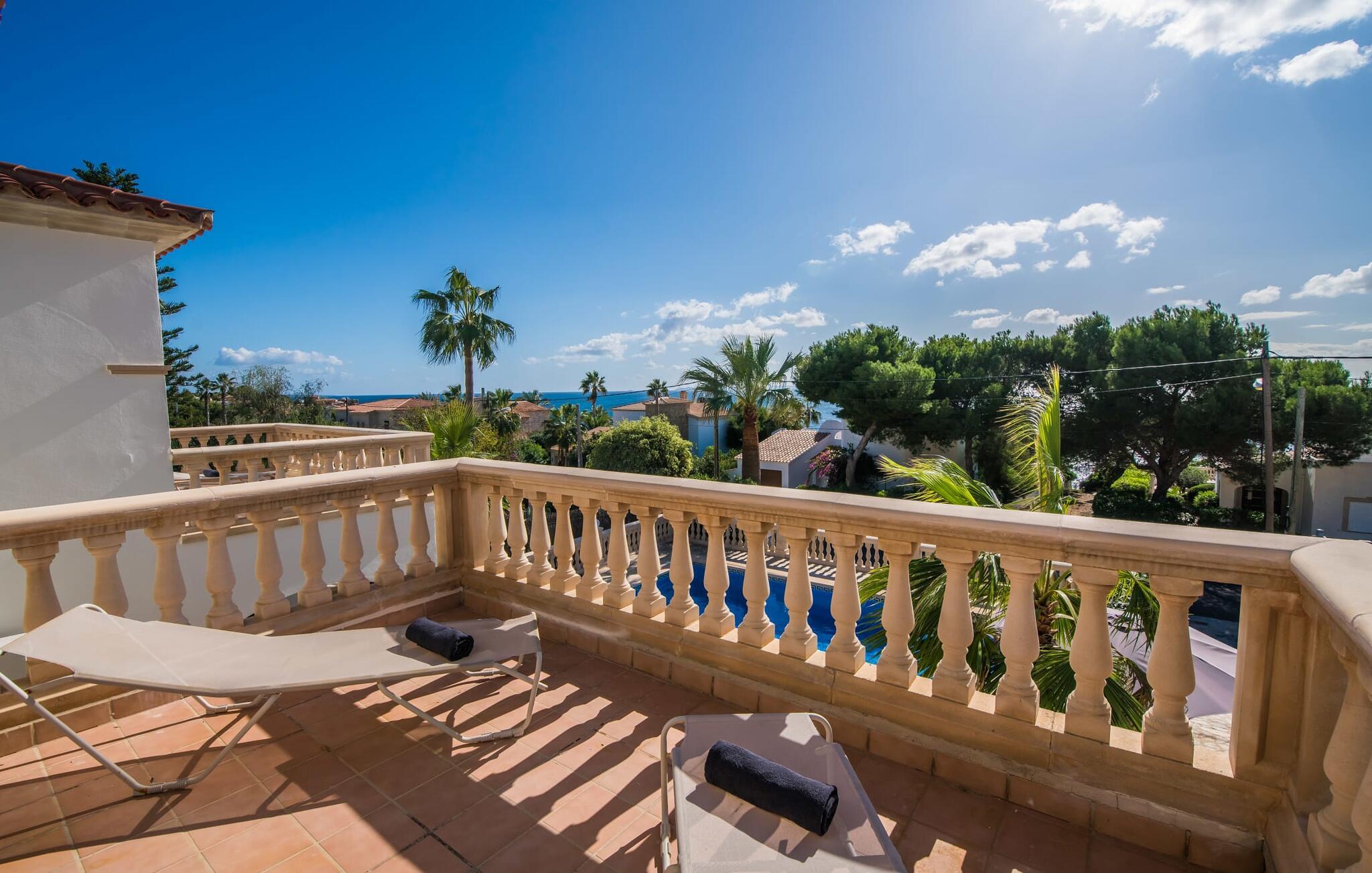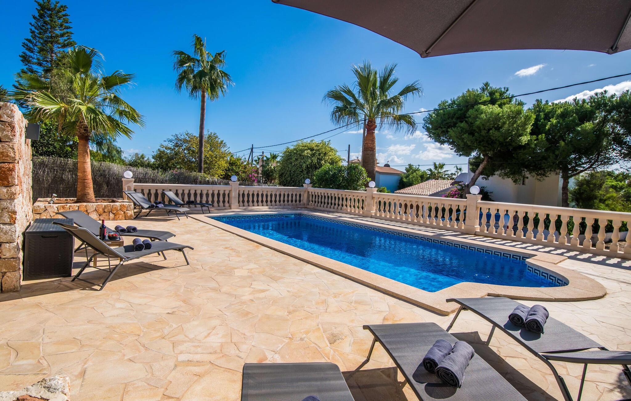 En blid havbrise, kombineret med luksuriøs flair, caribisk lethed og smittende munterhed, gør den strålende hvide finca "Casa Cuba" uimodståelig attraktiv. Palmer indrammer naturstensterrassen med smarte liggestole og parasol. Den fælles pool med sine bugtende mosaikfliser inviterer jer til at slappe af og deles med det tilstødende hus - en ideel ramme for en ferie med venner eller familie uden at ofre jeres privatliv. Den overdækkede terrasse er perfekt til at nyde måltider på varme sommerdage, måske tilberedt på grillen. Indvendigt har villaen et opholds- og spiseområde i åbent plan og et veludstyret køkken i amerikansk stil med morgenmadsbar, perfekt til fælles måltider med selvforplejning. Der er to dobbeltværelser med aircondition ovenpå og et tredje soveværelse med dobbeltseng nedenunder, samt to badeværelser med brusekabine. På første sal er der en rummelig, solrig altan med udsigt over palmer og fyrretræer og havet. Tagterrassen, som kan tilgås fra begge soveværelser, byder på masser af plads til en afslappet start eller afslutning på dagen. Denne villa er ideel for familier, der ønsker at nyde charmen ved livet på en kystø. Havudsigtsvillaen "Casa Cuba" ligger to gader fra de fænomenale klipper i den dejlige kystby Cala Pi. Denne velholdte urbanisering giver jer mulighed for at tilbringe vidunderlige timer på lange gåture langs den imponerende kystregion. I kan gøre jeres indkøb i de omkringliggende byer på den sydlige del af øen. Den fjordlignende, børnevenlige badebugt Cala Pi ligger kun 2 km væk.