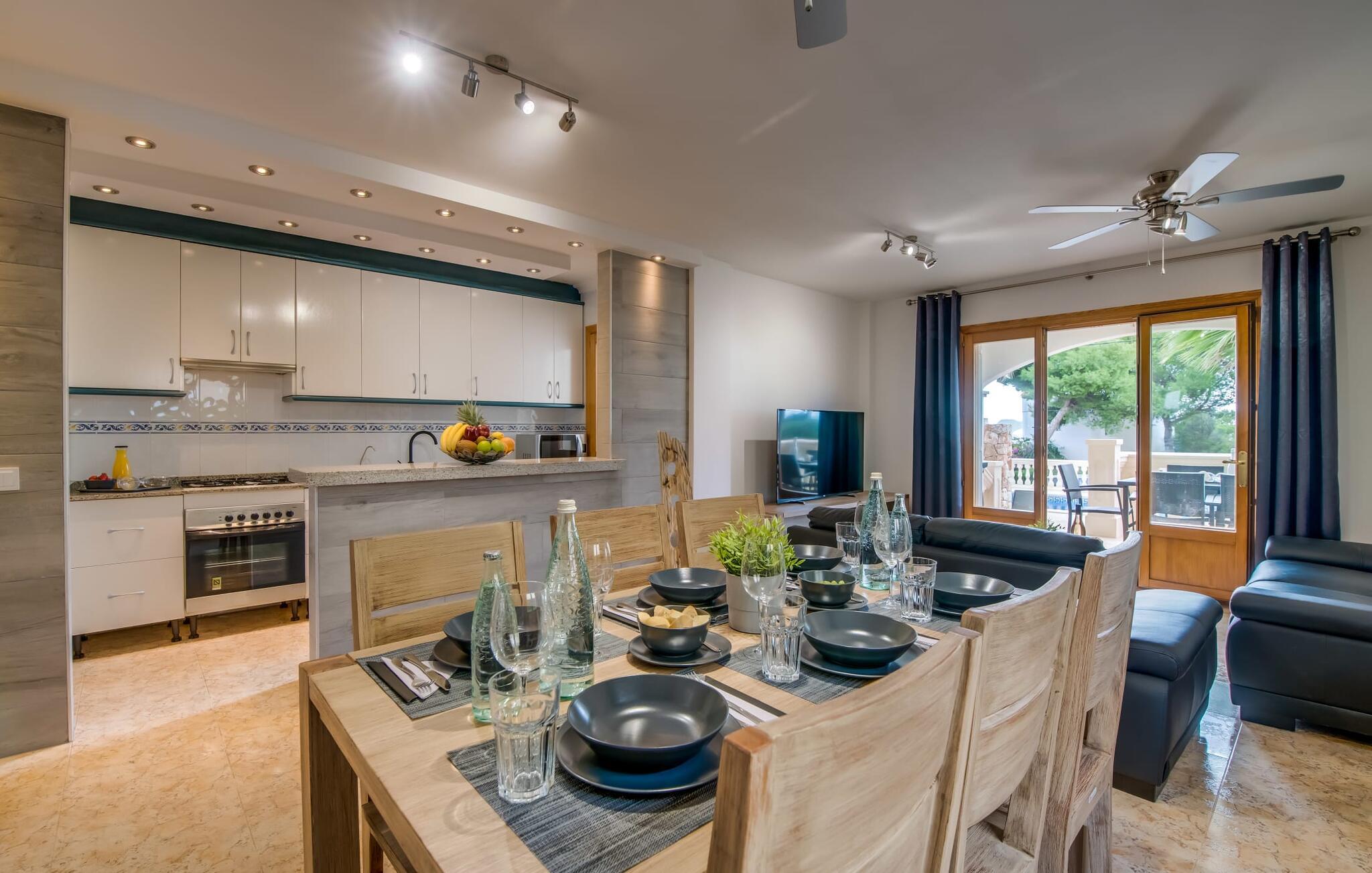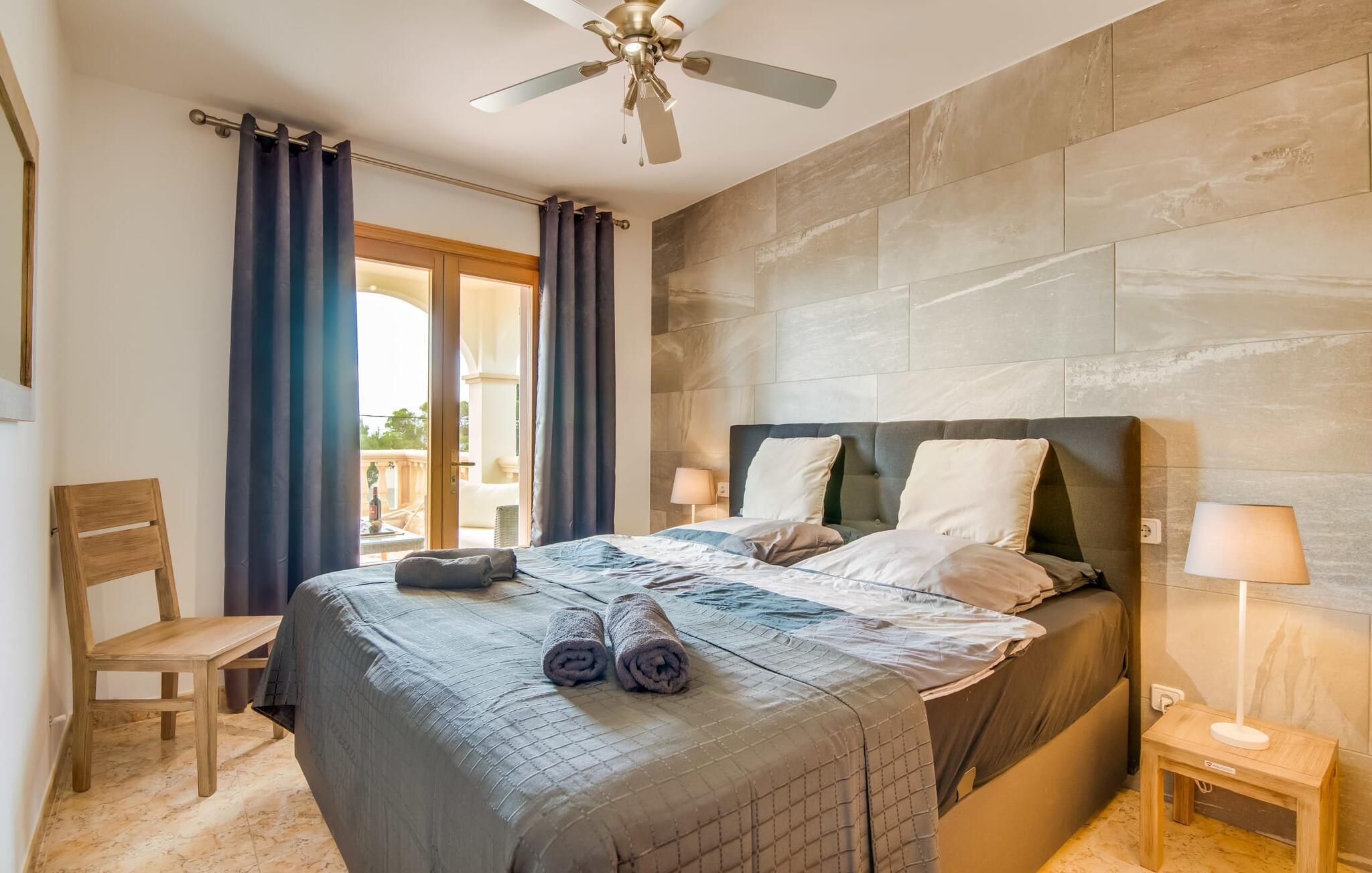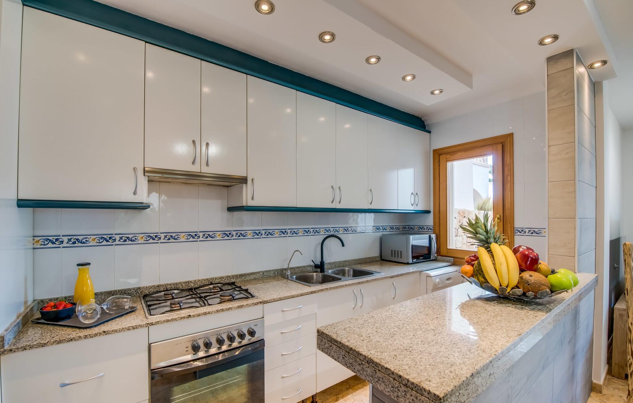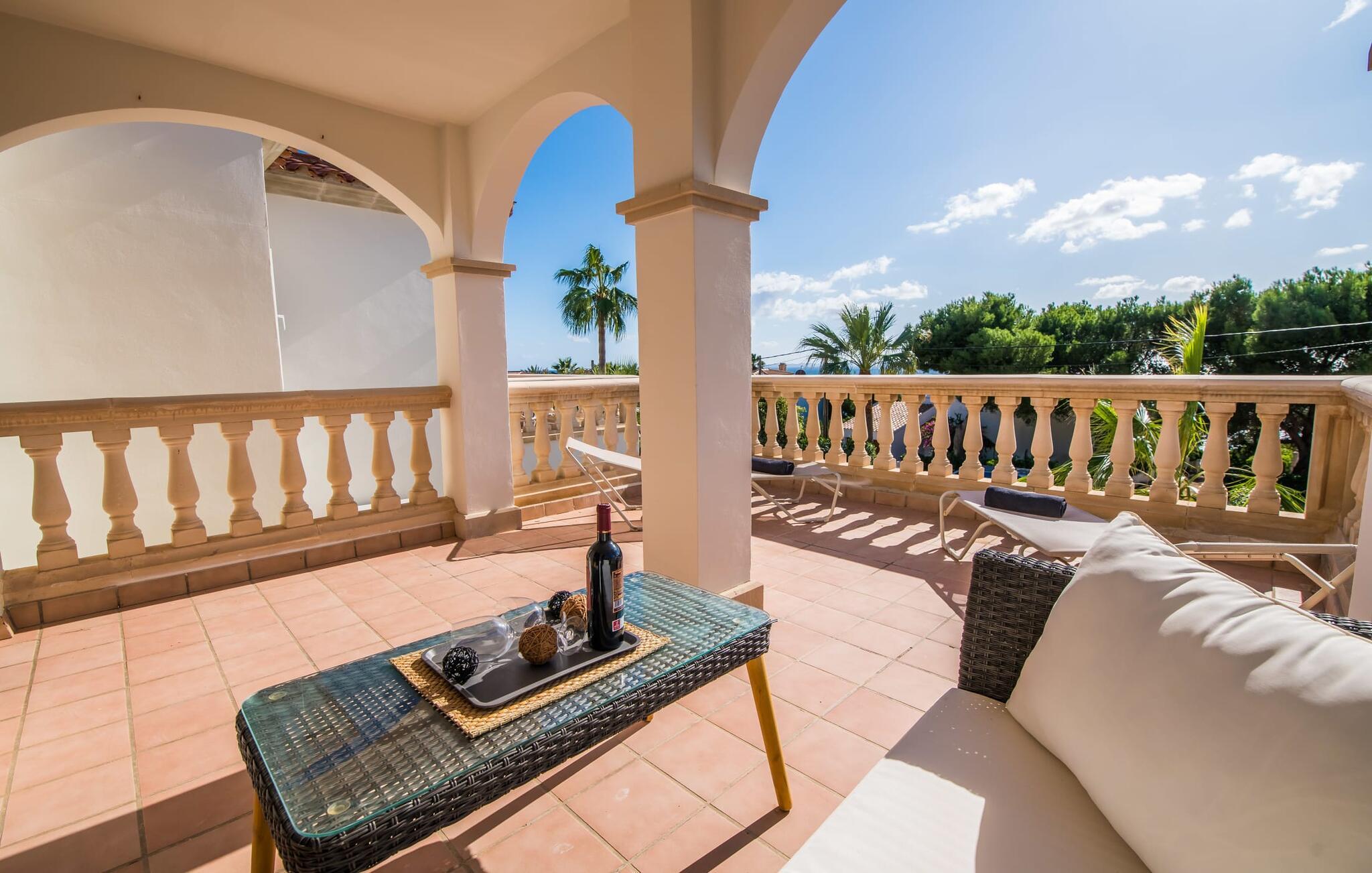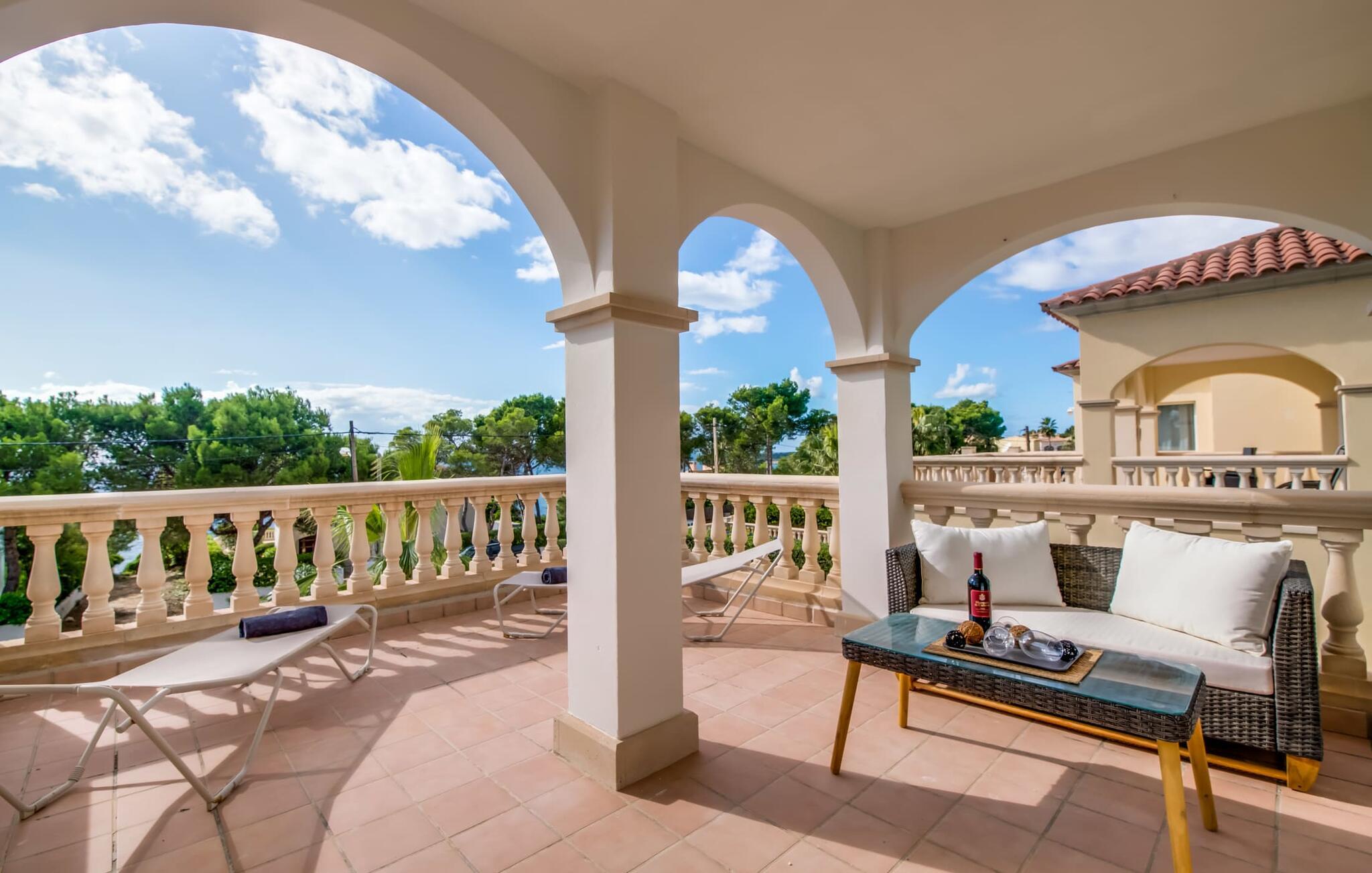 En blid havbrise, kombineret med luksuriøs flair, caribisk lethed og smittende munterhed, gør den strålende hvide finca "Casa Cuba" uimodståelig attraktiv. Palmer indrammer naturstensterrassen med smarte liggestole og parasol. Den fælles pool med sine bugtende mosaikfliser inviterer jer til at slappe af og deles med det tilstødende hus - en ideel ramme for en ferie med venner eller familie uden at ofre jeres privatliv. Den overdækkede terrasse er perfekt til at nyde måltider på varme sommerdage, måske tilberedt på grillen. Indvendigt har villaen et opholds- og spiseområde i åbent plan og et veludstyret køkken i amerikansk stil med morgenmadsbar, perfekt til fælles måltider med selvforplejning. Der er to dobbeltværelser med aircondition ovenpå og et tredje soveværelse med dobbeltseng nedenunder, samt to badeværelser med brusekabine. På første sal er der en rummelig, solrig altan med udsigt over palmer og fyrretræer og havet. Tagterrassen, som kan tilgås fra begge soveværelser, byder på masser af plads til en afslappet start eller afslutning på dagen. Denne villa er ideel for familier, der ønsker at nyde charmen ved livet på en kystø. Havudsigtsvillaen "Casa Cuba" ligger to gader fra de fænomenale klipper i den dejlige kystby Cala Pi. Denne velholdte urbanisering giver jer mulighed for at tilbringe vidunderlige timer på lange gåture langs den imponerende kystregion. I kan gøre jeres indkøb i de omkringliggende byer på den sydlige del af øen. Den fjordlignende, børnevenlige badebugt Cala Pi ligger kun 2 km væk.