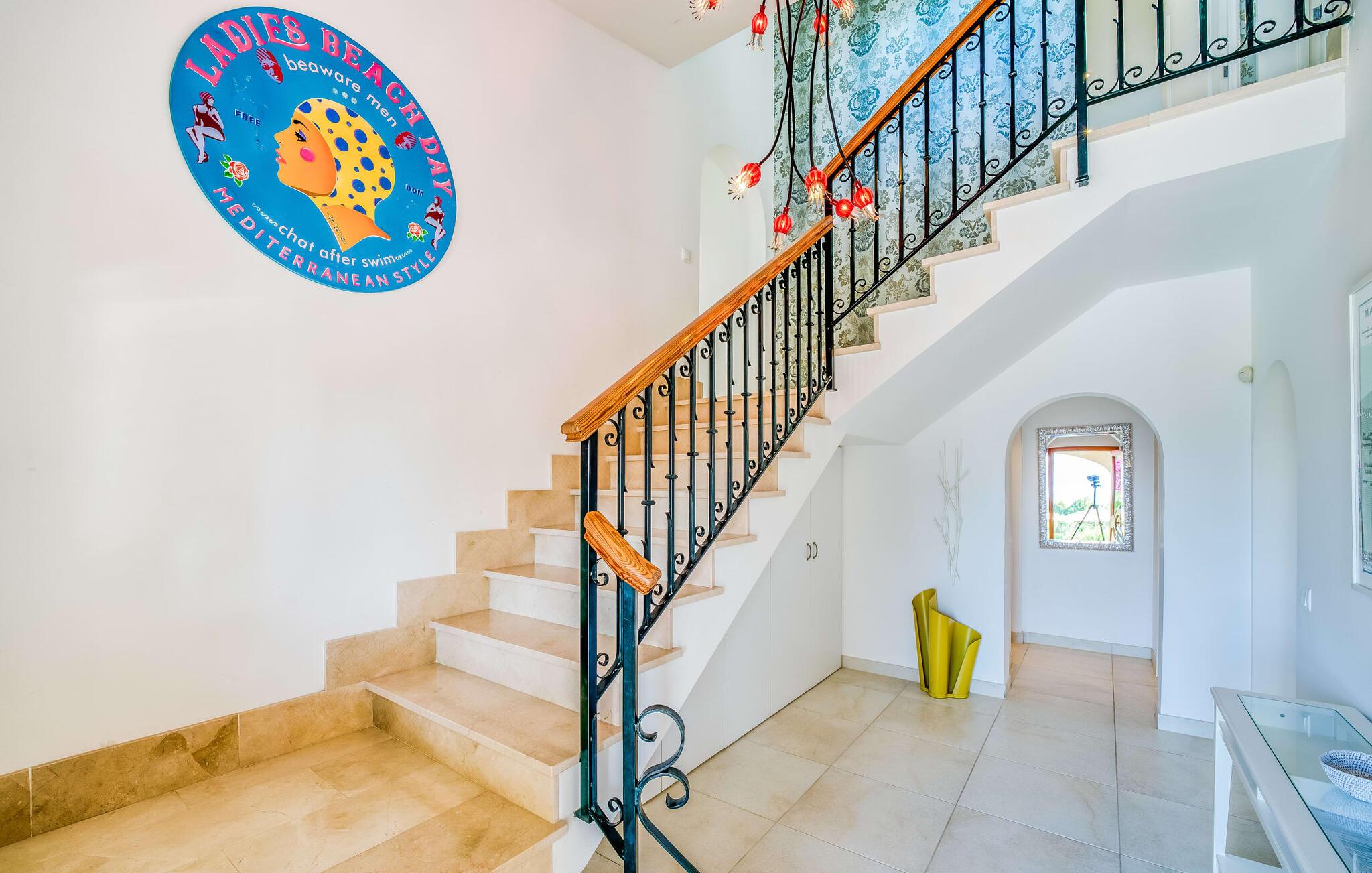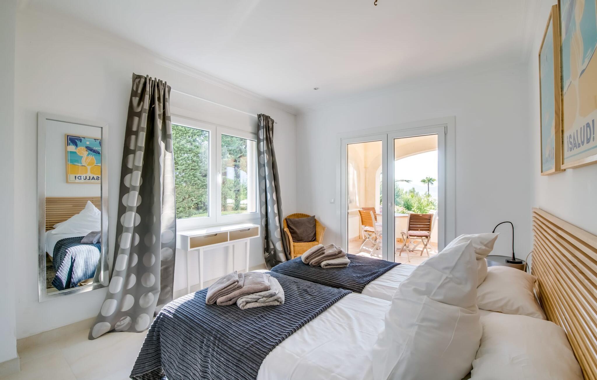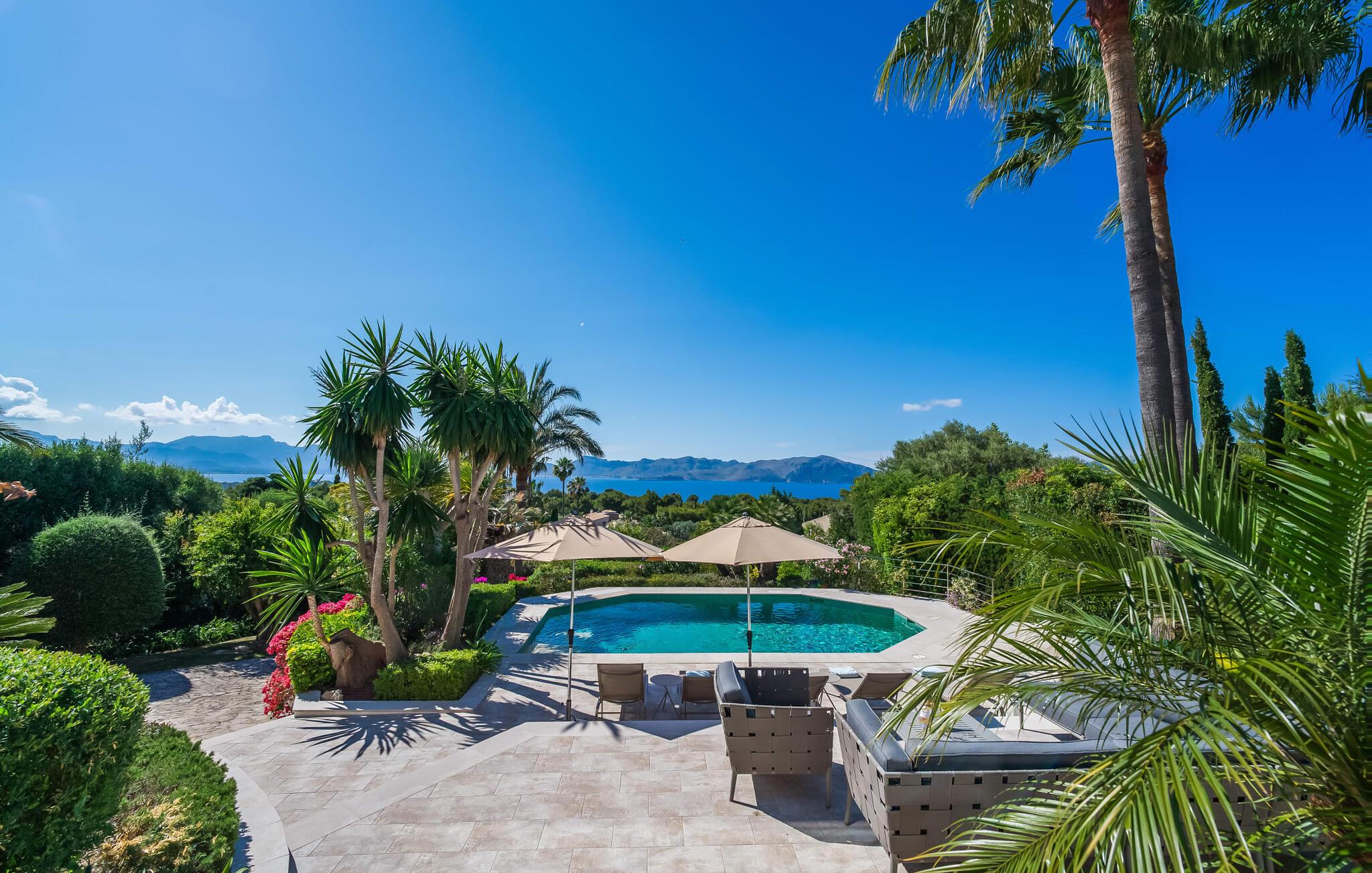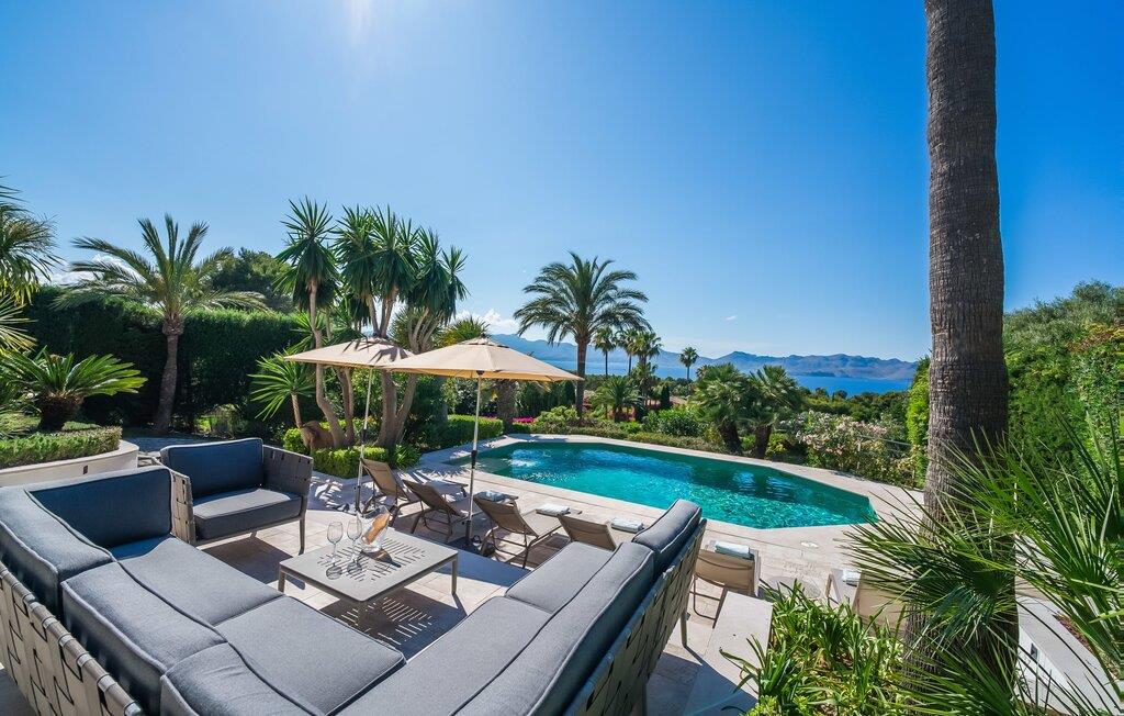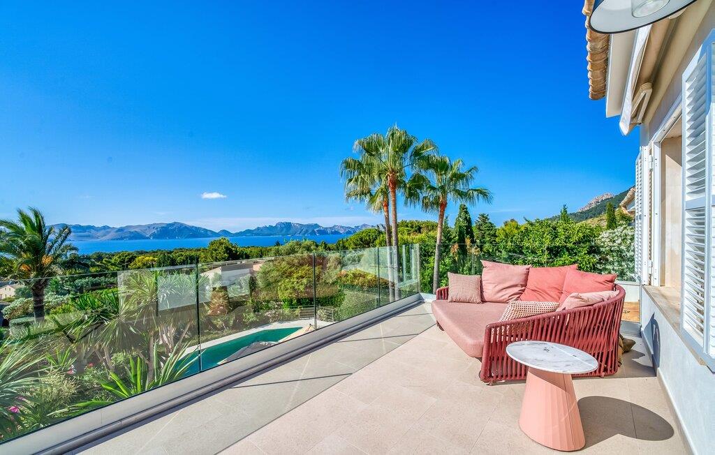 Hvis I vælger villaen "Casa Ehren Alma del Mar", vil jeres ferie være en udsøgt blanding af luksus og havets fortryllende allestedsnærværelse. Fra den afslappende poolterrasse med sine komfortable liggestole er det endeløse panorama af havet synligt ud over swimmingpoolens lokkende turkise vand. Dette er kendt for at få en eller to gæster til at rave, især da den tropiske vegetation i den smukke have med dens mange palmer uundgåeligt skaber en vis sydhavsflair. Sipper I en cocktail her eller oppe i sofahjørnet, går der et stykke tid, før I får nok af den flotte udsigt. I den henseende er den delvist overdækkede terrasse med spisebord et sandt lykketræf. Så snart solen er gået ned, kan I fyre op i gasgrillen og servere friskfanget fisk på ingen tid, mens haven er smukt oplyst af et smart lyskoncept. Usædvanligt store vinduespartier giver masser af lys ind i det indre af denne villa, som opfylder selv de højeste æstetiske standarder. Terrassen er forbundet med stuen af et rummeligt sofaområde, hvorfra I har en perfekt udsigt til fladskærms-tv'et. Perfekte forhold til at nyde en god film om aftenen inden I går i seng. Designermøblerne og udvalget af kunstværker tilføjer subtile, smagfulde accenter. Uanset om I vælger spisestuen eller det yderst komfortable køkken med keramisk kogeplade, er den smagfulde indretning en attraktiv fordel ved denne bolig. Takket være airconditionen kan I føle jer hjemme året rundt - selv i de fire dobbeltværelser, hvoraf det ene har to enkeltsenge og ligger på samme etage som stuen. Alle andre har adgang til verandaen. På mezzaninen finder I et praktisk klædeskab og et gæstetoilet samt et soveværelse med eget badeværelse. Yderligere fire personer kan sove i de to soveværelser i stueetagen, som også har to badeværelser. En af dem har et badekar til en sensuel afslutning på dagen. Villaen er beliggende i det rolige boligområde Bonaire, kun 4 km fra Alcúdia, der kombinerer nærhed til en attraktiv by med fordelene ved en imponerende kystnær beliggenhed. En kort gåtur tager jer til den idylliske lille havn Cocodrilo. Her kan I afslutte aftenen med en drink. Fra villaens terrasse kan man se ud over Formentor-stranden og Pollença-bugten – destinationer, der bestemt er et besøg værd. I Can Picafort, 15 km væk, kan I stoppe ved en af de mange kystbarer og nyde den maritime feriefølelse. Så meget er sikkert: under jeres ferie i villaen "Casa Ehren Alma del Mar" vil I aldrig forlade Mallorcas nordkyst. Lyden af havet er kun 750 m væk i den ultramoderne villa "Casa Ehren Alma del Mar". Det turkise hav og de hvide sandstrande ved bugterne Pollença og Formentor inviterer jer til at gå lange gåture. På mindre end 10 minutter kan I nå den maleriske by Alcúdia med jeres lejebil og for eksempel prøve udsøgte restauranter. Sportsentusiaster vil få noget for pengene på Club de Golf Alcanada, 8 km væk. En adelig residens med utallige mulige udflugtsmål. Bemærk venligst, at denne ejendom ikke accepterer ungdomsgrupper eller polterabender. En ungdomsgruppe på denne ejendom består af personer under 30 år. Book ikke denne ejendom, hvis I er en ungdomsgruppe eller en polterabendgruppe, da jeres reservation vil blive afvist, når den er booket, hvilket også kan være tilfældet ved ankomst til ejendommen eller under jeres ophold, og I vil ikke modtage en refusion.