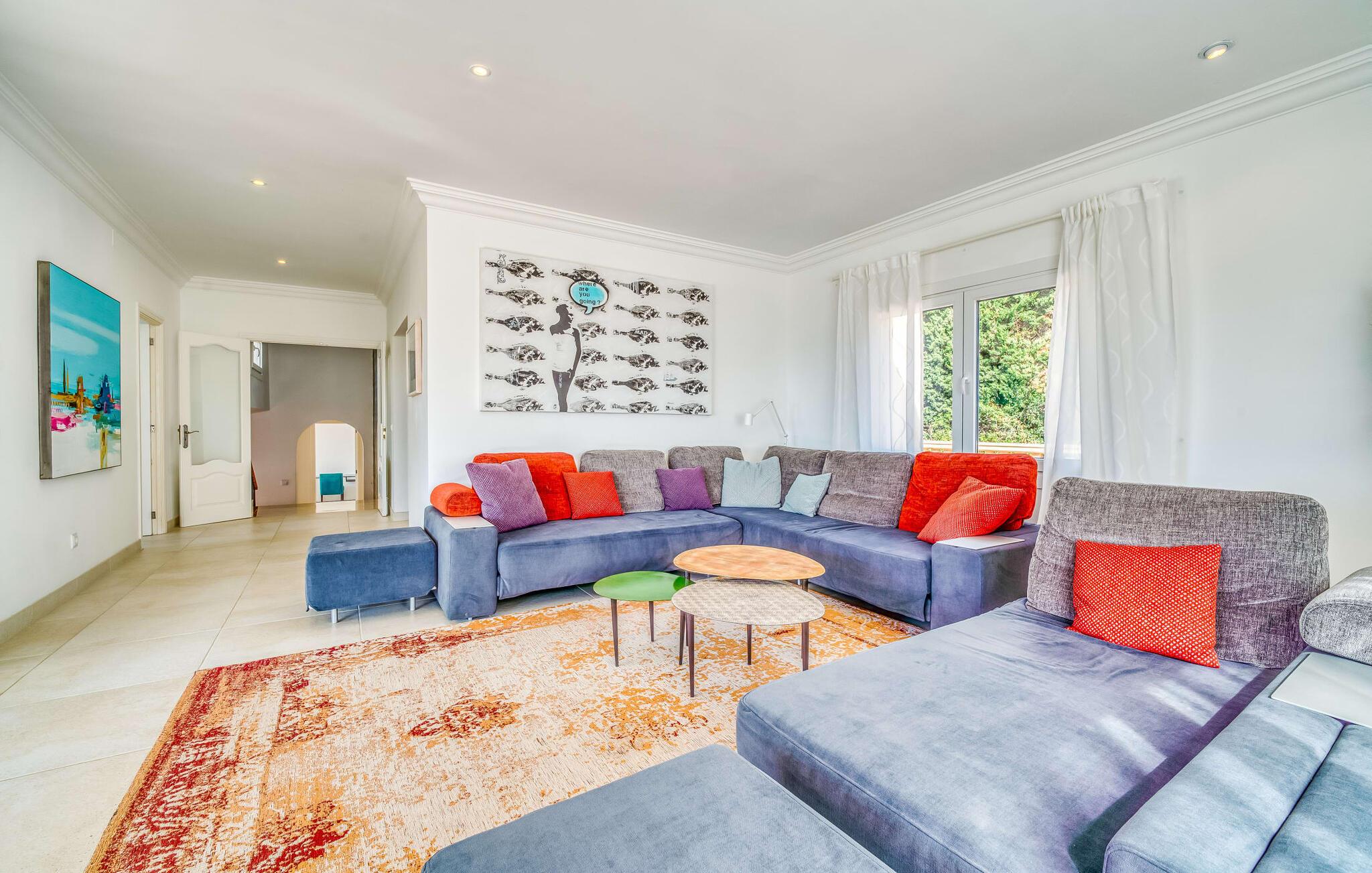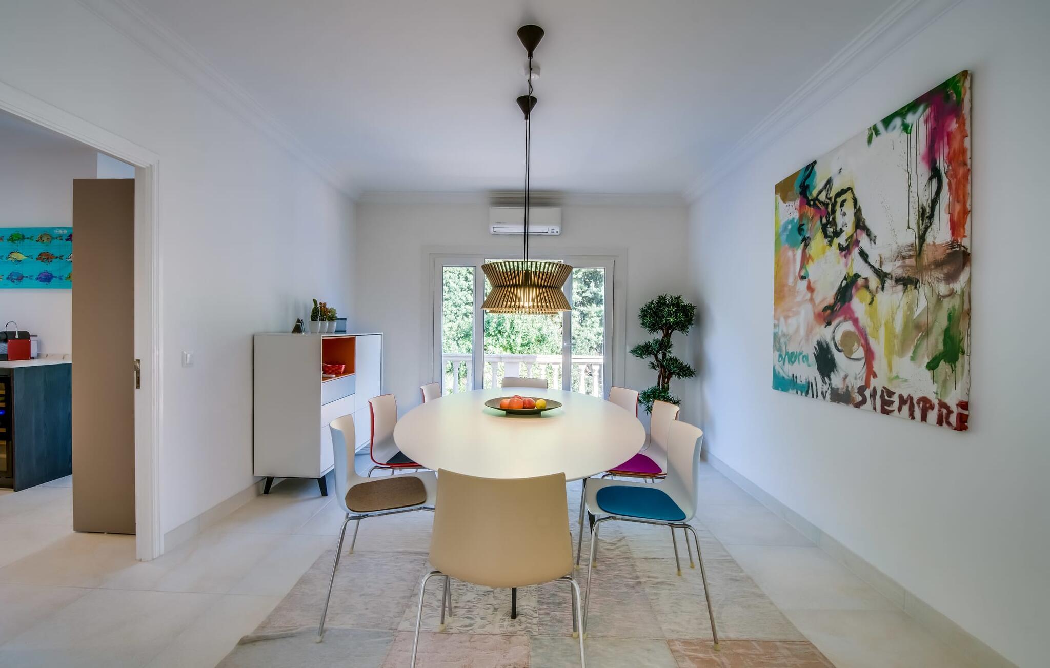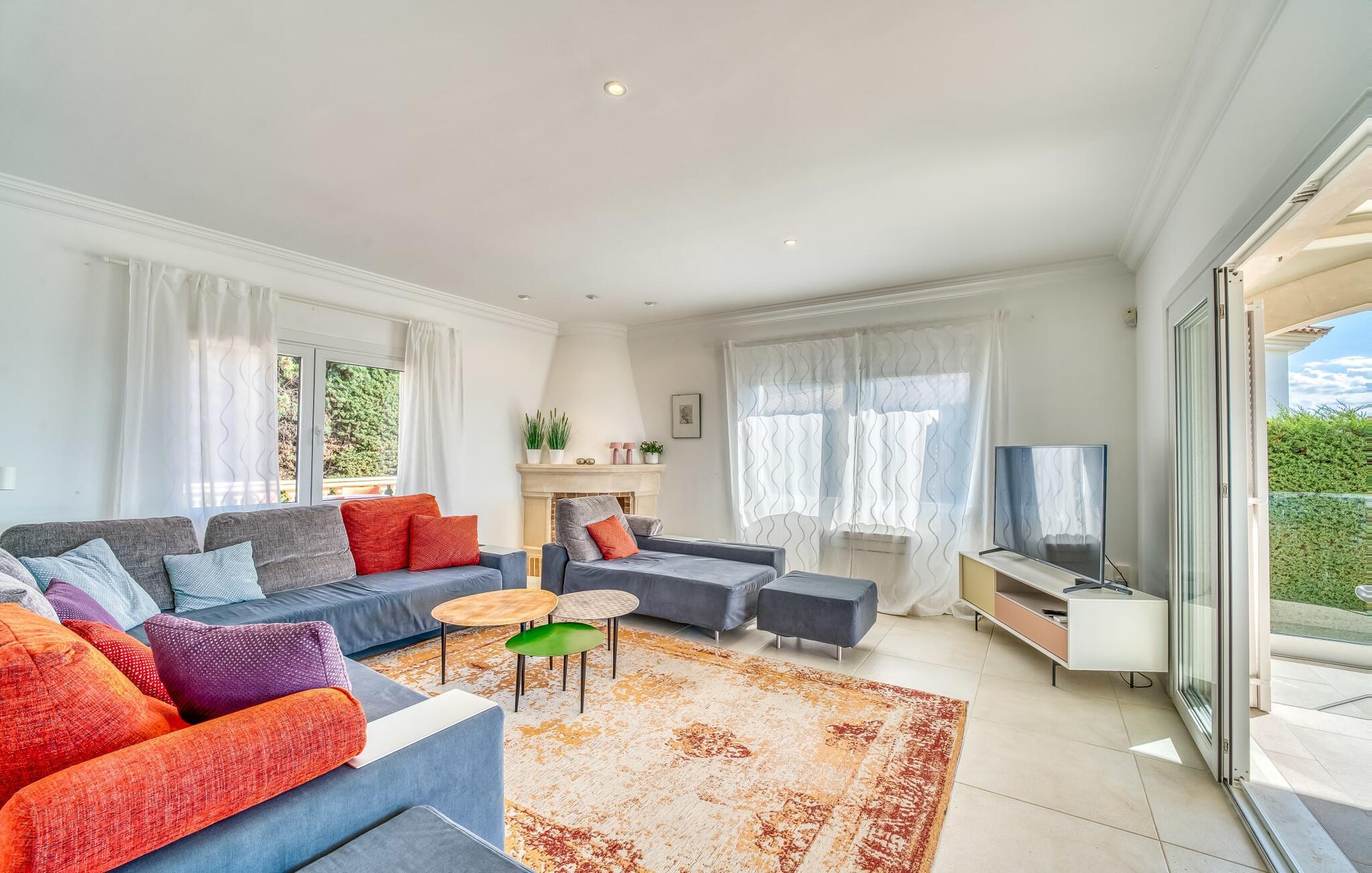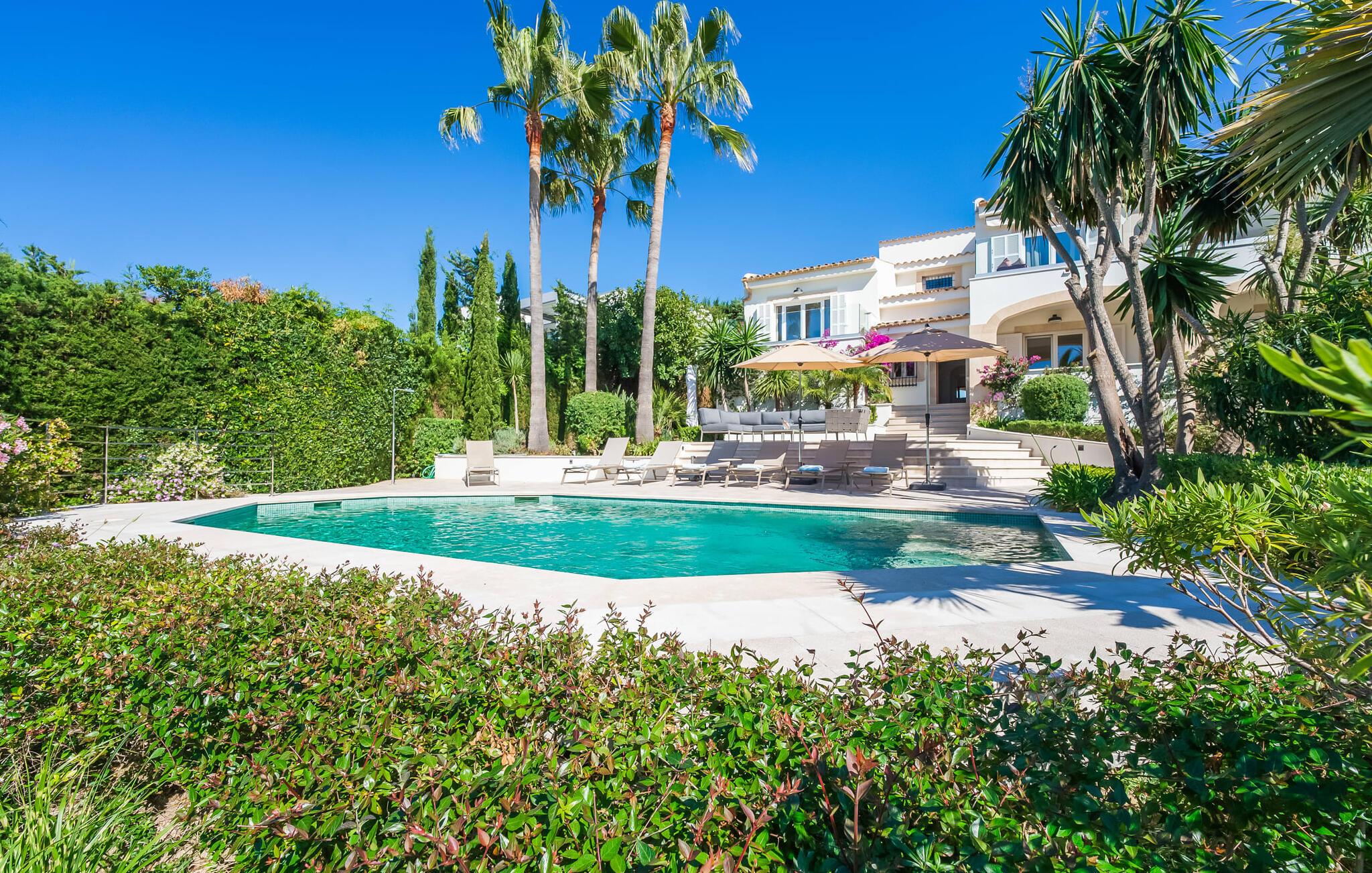 Hvis I vælger villaen "Casa Ehren Alma del Mar", vil jeres ferie være en udsøgt blanding af luksus og havets fortryllende allestedsnærværelse. Fra den afslappende poolterrasse med sine komfortable liggestole er det endeløse panorama af havet synligt ud over swimmingpoolens lokkende turkise vand. Dette er kendt for at få en eller to gæster til at rave, især da den tropiske vegetation i den smukke have med dens mange palmer uundgåeligt skaber en vis sydhavsflair. Sipper I en cocktail her eller oppe i sofahjørnet, går der et stykke tid, før I får nok af den flotte udsigt. I den henseende er den delvist overdækkede terrasse med spisebord et sandt lykketræf. Så snart solen er gået ned, kan I fyre op i gasgrillen og servere friskfanget fisk på ingen tid, mens haven er smukt oplyst af et smart lyskoncept. Usædvanligt store vinduespartier giver masser af lys ind i det indre af denne villa, som opfylder selv de højeste æstetiske standarder. Terrassen er forbundet med stuen af et rummeligt sofaområde, hvorfra I har en perfekt udsigt til fladskærms-tv'et. Perfekte forhold til at nyde en god film om aftenen inden I går i seng. Designermøblerne og udvalget af kunstværker tilføjer subtile, smagfulde accenter. Uanset om I vælger spisestuen eller det yderst komfortable køkken med keramisk kogeplade, er den smagfulde indretning en attraktiv fordel ved denne bolig. Takket være airconditionen kan I føle jer hjemme året rundt - selv i de fire dobbeltværelser, hvoraf det ene har to enkeltsenge og ligger på samme etage som stuen. Alle andre har adgang til verandaen. På mezzaninen finder I et praktisk klædeskab og et gæstetoilet samt et soveværelse med eget badeværelse. Yderligere fire personer kan sove i de to soveværelser i stueetagen, som også har to badeværelser. En af dem har et badekar til en sensuel afslutning på dagen. Villaen er beliggende i det rolige boligområde Bonaire, kun 4 km fra Alcúdia, der kombinerer nærhed til en attraktiv by med fordelene ved en imponerende kystnær beliggenhed. En kort gåtur tager jer til den idylliske lille havn Cocodrilo. Her kan I afslutte aftenen med en drink. Fra villaens terrasse kan man se ud over Formentor-stranden og Pollença-bugten – destinationer, der bestemt er et besøg værd. I Can Picafort, 15 km væk, kan I stoppe ved en af de mange kystbarer og nyde den maritime feriefølelse. Så meget er sikkert: under jeres ferie i villaen "Casa Ehren Alma del Mar" vil I aldrig forlade Mallorcas nordkyst. Lyden af havet er kun 750 m væk i den ultramoderne villa "Casa Ehren Alma del Mar". Det turkise hav og de hvide sandstrande ved bugterne Pollença og Formentor inviterer jer til at gå lange gåture. På mindre end 10 minutter kan I nå den maleriske by Alcúdia med jeres lejebil og for eksempel prøve udsøgte restauranter. Sportsentusiaster vil få noget for pengene på Club de Golf Alcanada, 8 km væk. En adelig residens med utallige mulige udflugtsmål. Bemærk venligst, at denne ejendom ikke accepterer ungdomsgrupper eller polterabender. En ungdomsgruppe på denne ejendom består af personer under 30 år. Book ikke denne ejendom, hvis I er en ungdomsgruppe eller en polterabendgruppe, da jeres reservation vil blive afvist, når den er booket, hvilket også kan være tilfældet ved ankomst til ejendommen eller under jeres ophold, og I vil ikke modtage en refusion.