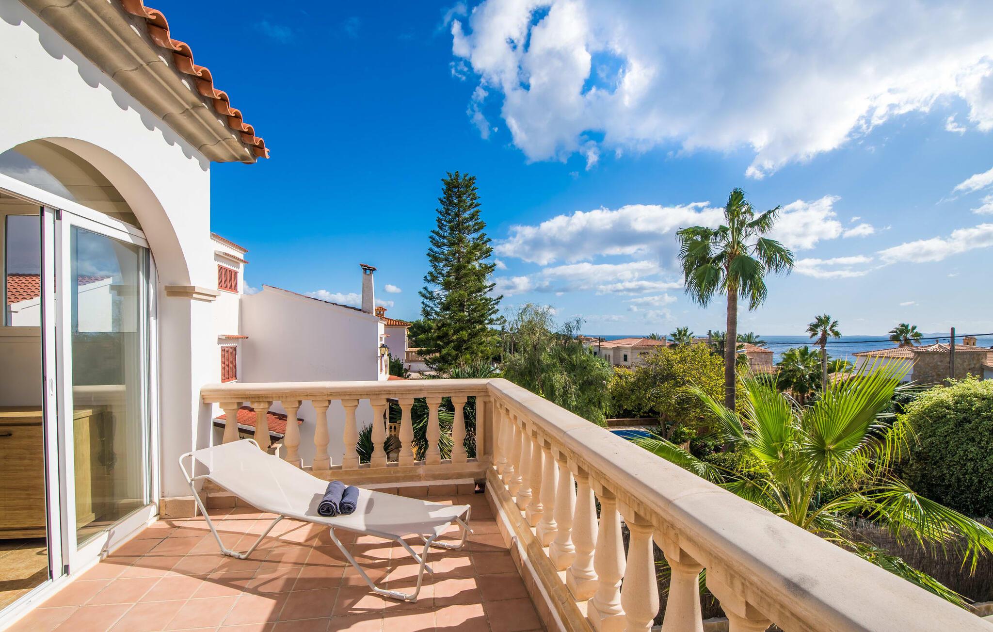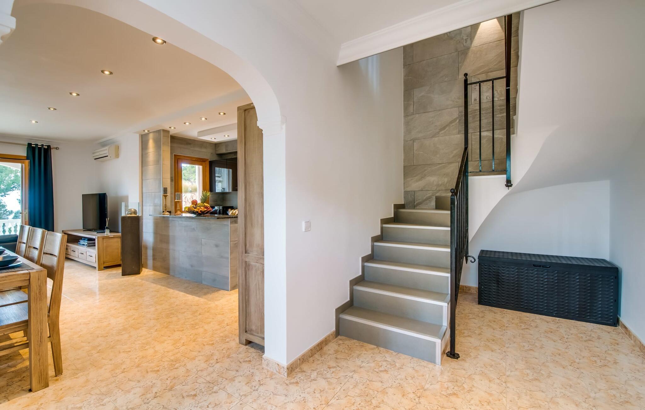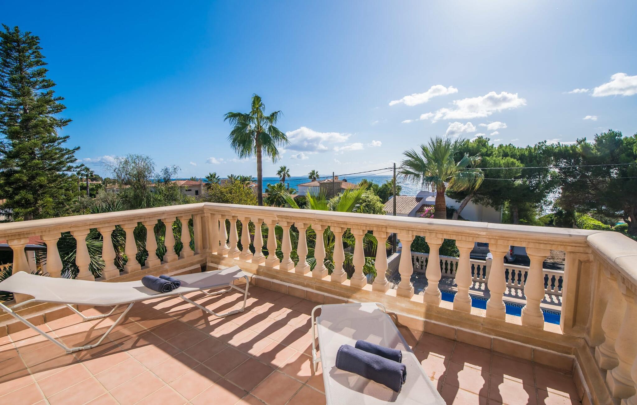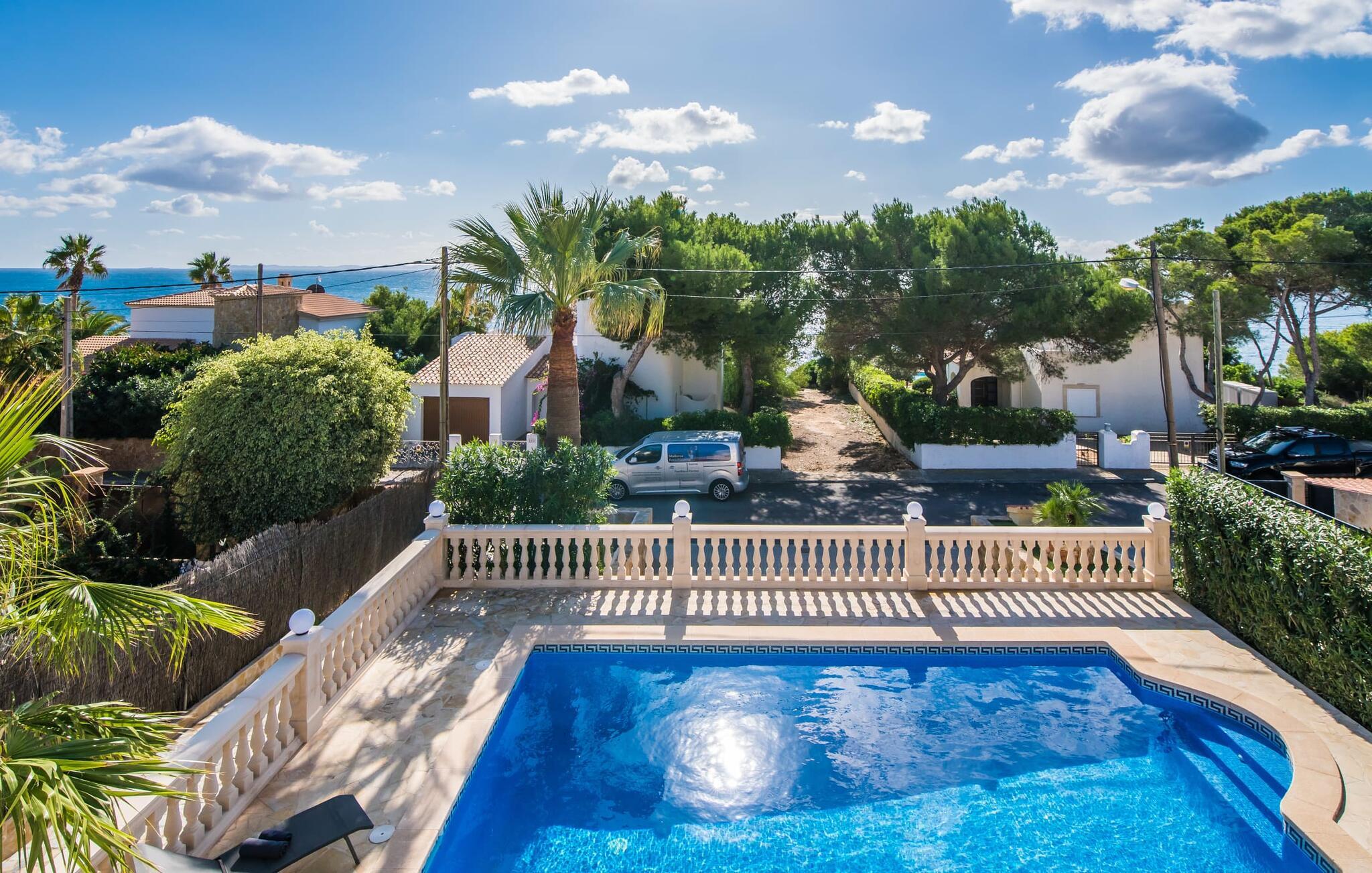 Den stilfulde villa "Casa Habana" kombinerer luksus med en afslappet, munter atmosfære. Beliggende blandt palmer og en naturstenterrasse har villaen smarte liggestole, en parasol og en fælles pool med mosaikfliser, som deles med naboen "Casa Cuba" (EMI110), perfekt til en ferie med venner eller familie. Nyd måltider på den overdækkede terrasse med havudsigt eller lav mad på gasgrillen. En rummelig balkon og tagterrasse giver yderligere steder at slappe af og nyde omgivelserne. Indenfor byder den åbne stue og spisestue på moderne komfort. Der er to dobbeltværelser med aircondition med adgang til tagterrassen på første sal og et med to enkeltsenge i stueetagen. To flisebadeværelser sikrer komfort, mens det fuldt udstyrede køkken byder på alt hvad I behøver til selvforplejning. Villaen er perfekt til at nyde øens charme. Havudsigtsvillaen "Casa Habana" ligger to gader væk fra de fænomenale klipper i den dejlige kystby Cala Pi. Denne velholdte urbanisering giver jer mulighed for at tilbringe skønne timer på lange gåture langs den imponerende kystregion. I kan gøre jeres indkøb i de omkringliggende byer på den sydlige del af øen. Den børnevenlige badebugt Cala Pi ligger kun 2 km væk.