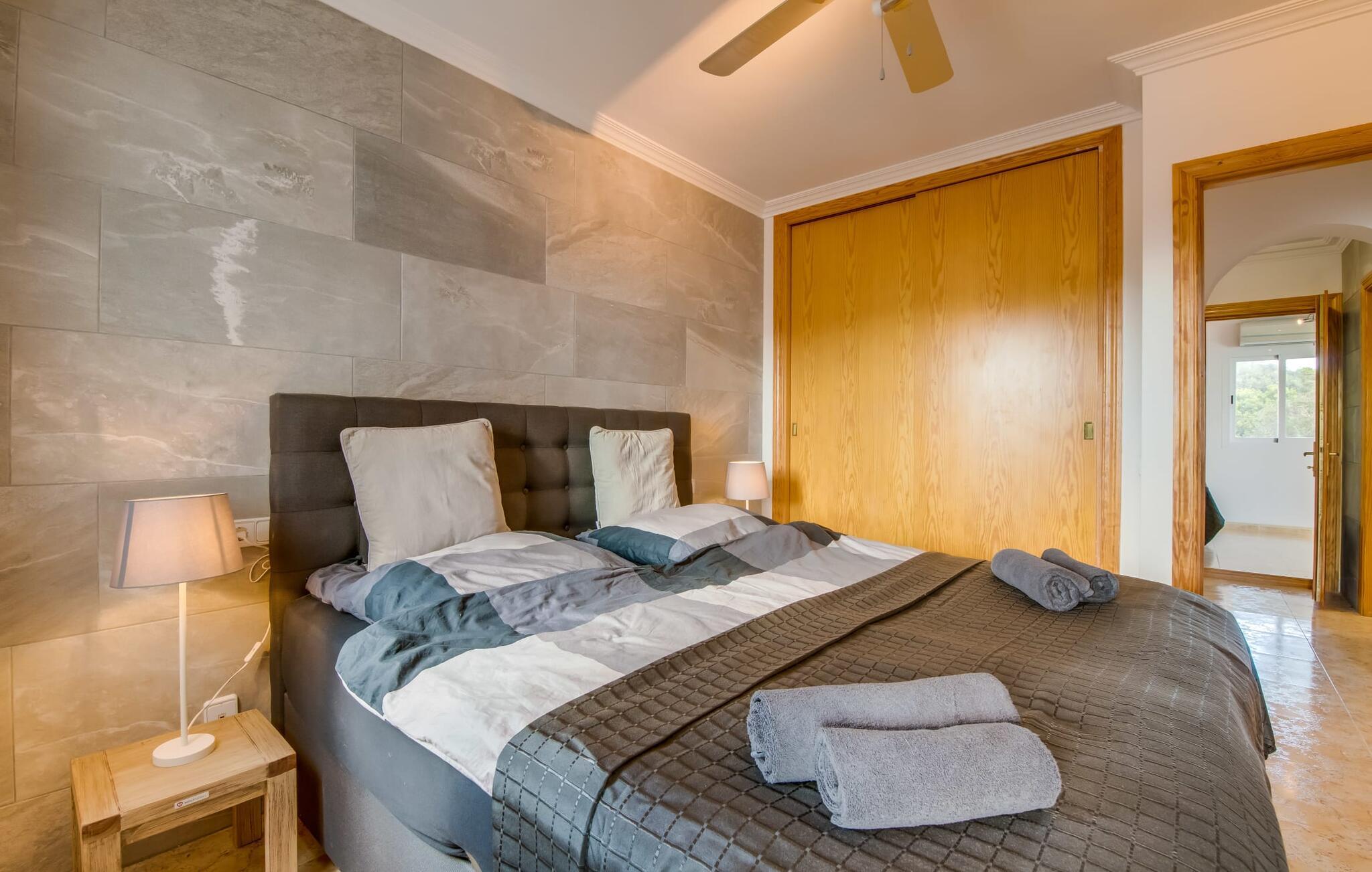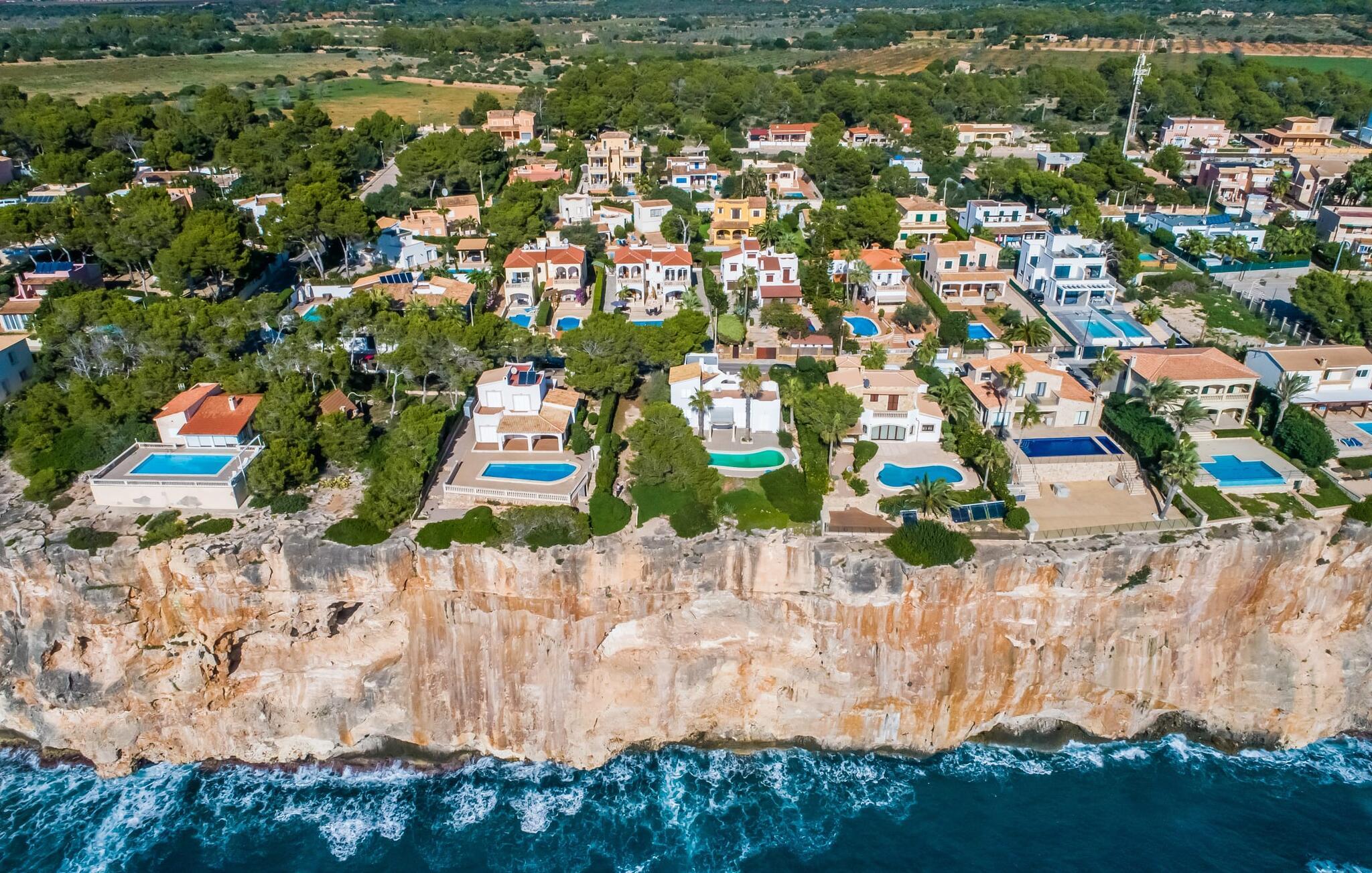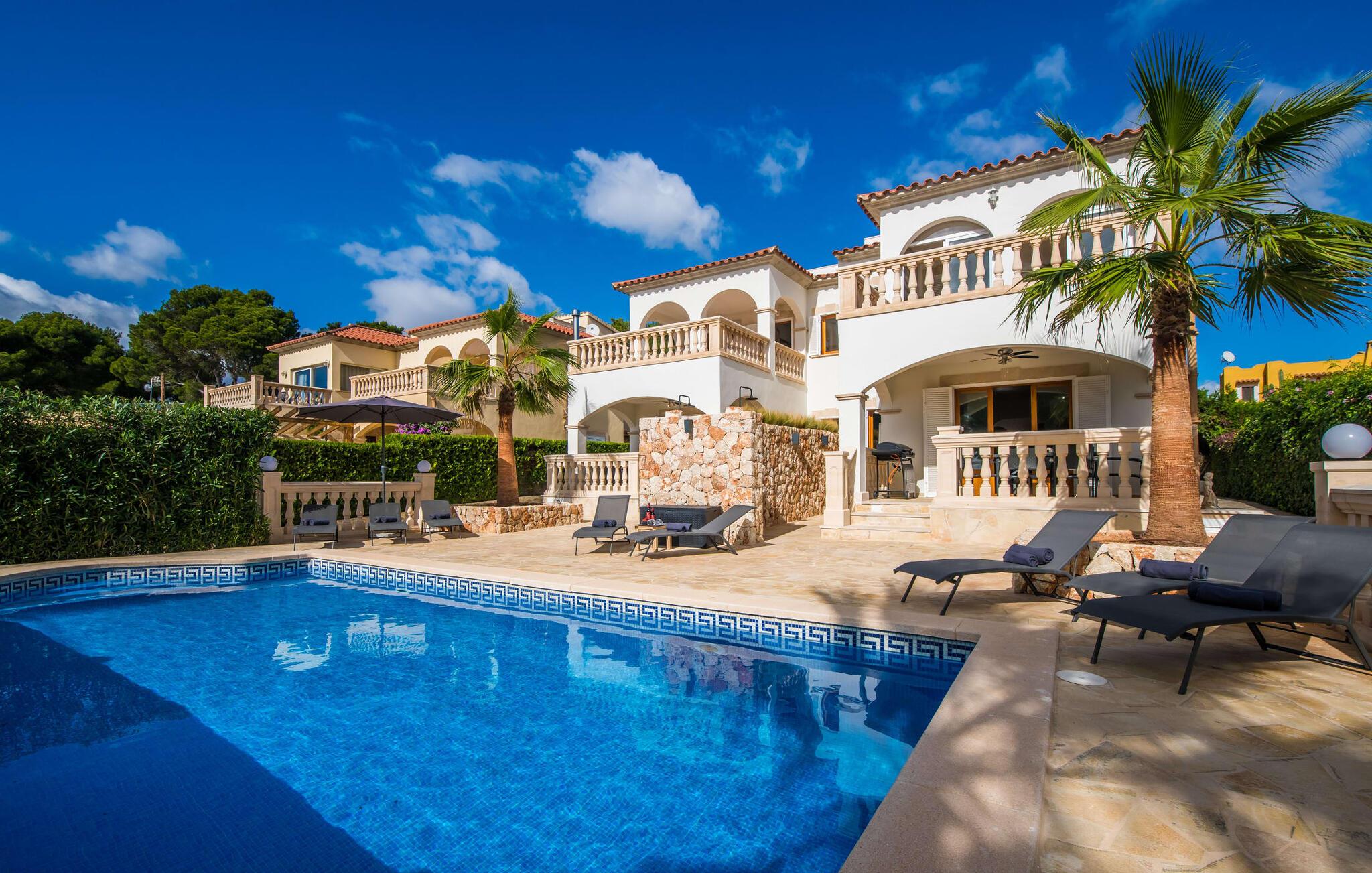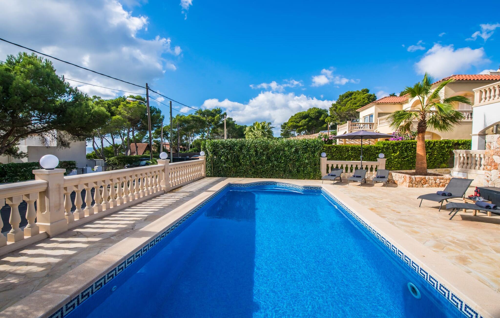 Den stilfulde villa "Casa Habana" kombinerer luksus med en afslappet, munter atmosfære. Beliggende blandt palmer og en naturstenterrasse har villaen smarte liggestole, en parasol og en fælles pool med mosaikfliser, som deles med naboen "Casa Cuba" (EMI110), perfekt til en ferie med venner eller familie. Nyd måltider på den overdækkede terrasse med havudsigt eller lav mad på gasgrillen. En rummelig balkon og tagterrasse giver yderligere steder at slappe af og nyde omgivelserne. Indenfor byder den åbne stue og spisestue på moderne komfort. Der er to dobbeltværelser med aircondition med adgang til tagterrassen på første sal og et med to enkeltsenge i stueetagen. To flisebadeværelser sikrer komfort, mens det fuldt udstyrede køkken byder på alt hvad I behøver til selvforplejning. Villaen er perfekt til at nyde øens charme. Havudsigtsvillaen "Casa Habana" ligger to gader væk fra de fænomenale klipper i den dejlige kystby Cala Pi. Denne velholdte urbanisering giver jer mulighed for at tilbringe skønne timer på lange gåture langs den imponerende kystregion. I kan gøre jeres indkøb i de omkringliggende byer på den sydlige del af øen. Den børnevenlige badebugt Cala Pi ligger kun 2 km væk.