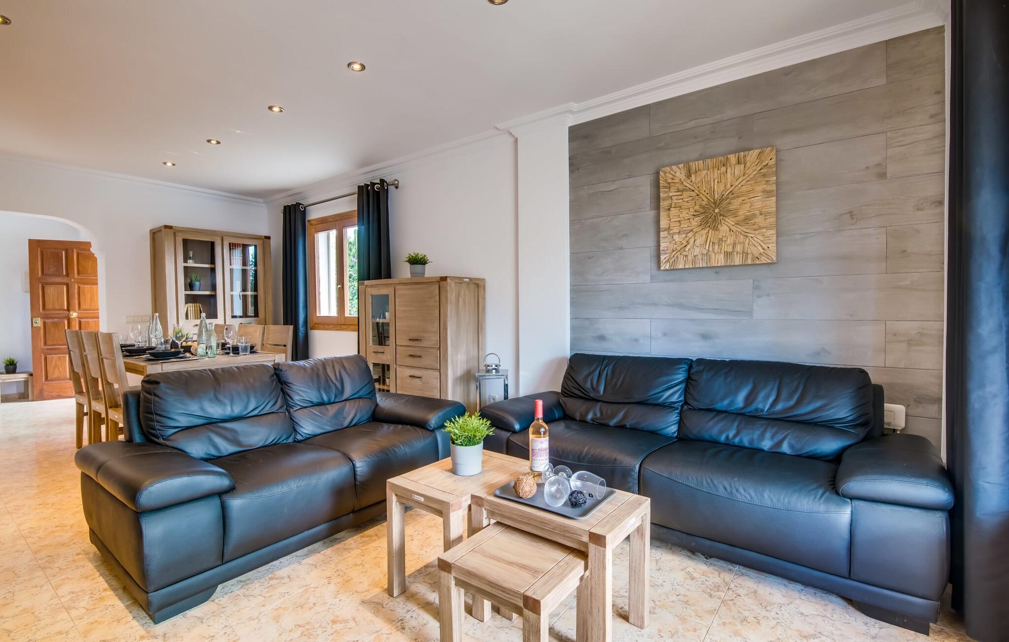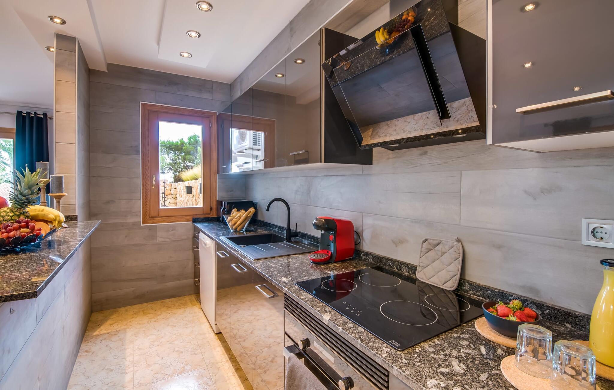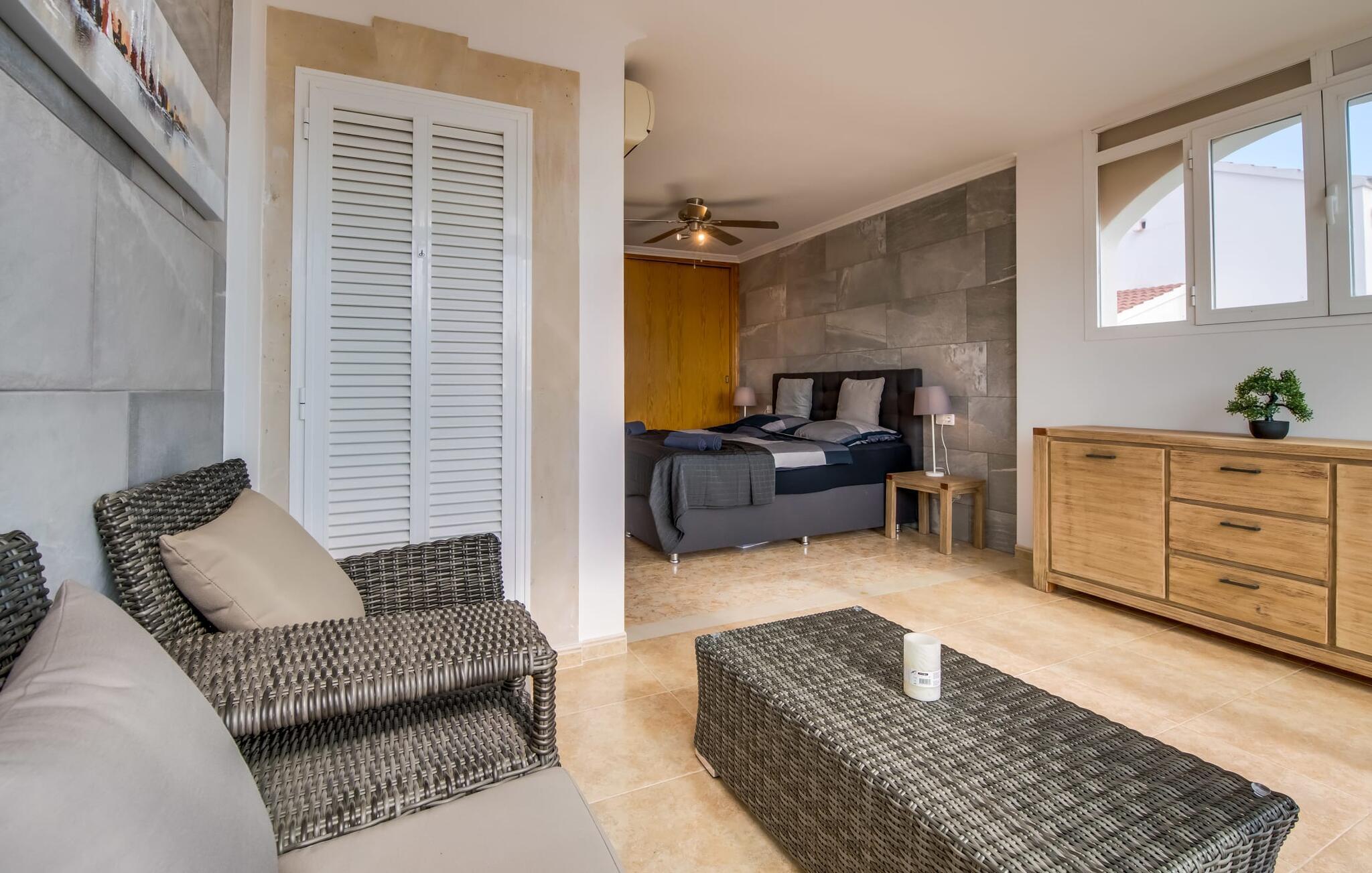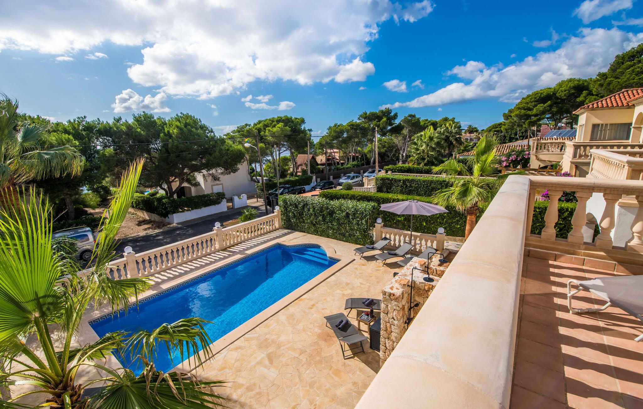 Den stilfulde villa "Casa Habana" kombinerer luksus med en afslappet, munter atmosfære. Beliggende blandt palmer og en naturstenterrasse har villaen smarte liggestole, en parasol og en fælles pool med mosaikfliser, som deles med naboen "Casa Cuba" (EMI110), perfekt til en ferie med venner eller familie. Nyd måltider på den overdækkede terrasse med havudsigt eller lav mad på gasgrillen. En rummelig balkon og tagterrasse giver yderligere steder at slappe af og nyde omgivelserne. Indenfor byder den åbne stue og spisestue på moderne komfort. Der er to dobbeltværelser med aircondition med adgang til tagterrassen på første sal og et med to enkeltsenge i stueetagen. To flisebadeværelser sikrer komfort, mens det fuldt udstyrede køkken byder på alt hvad I behøver til selvforplejning. Villaen er perfekt til at nyde øens charme. Havudsigtsvillaen "Casa Habana" ligger to gader væk fra de fænomenale klipper i den dejlige kystby Cala Pi. Denne velholdte urbanisering giver jer mulighed for at tilbringe skønne timer på lange gåture langs den imponerende kystregion. I kan gøre jeres indkøb i de omkringliggende byer på den sydlige del af øen. Den børnevenlige badebugt Cala Pi ligger kun 2 km væk.
