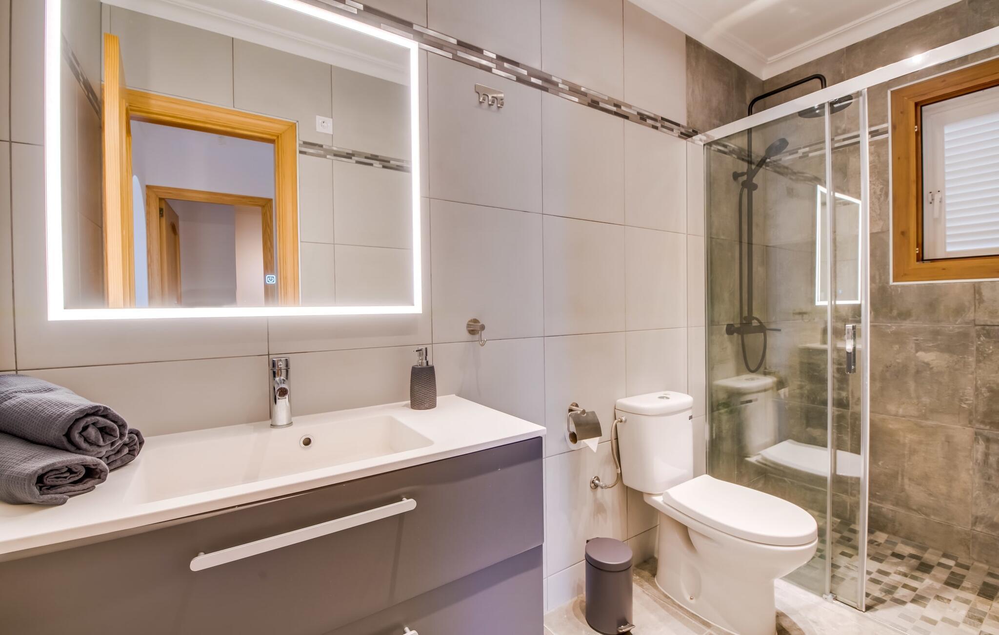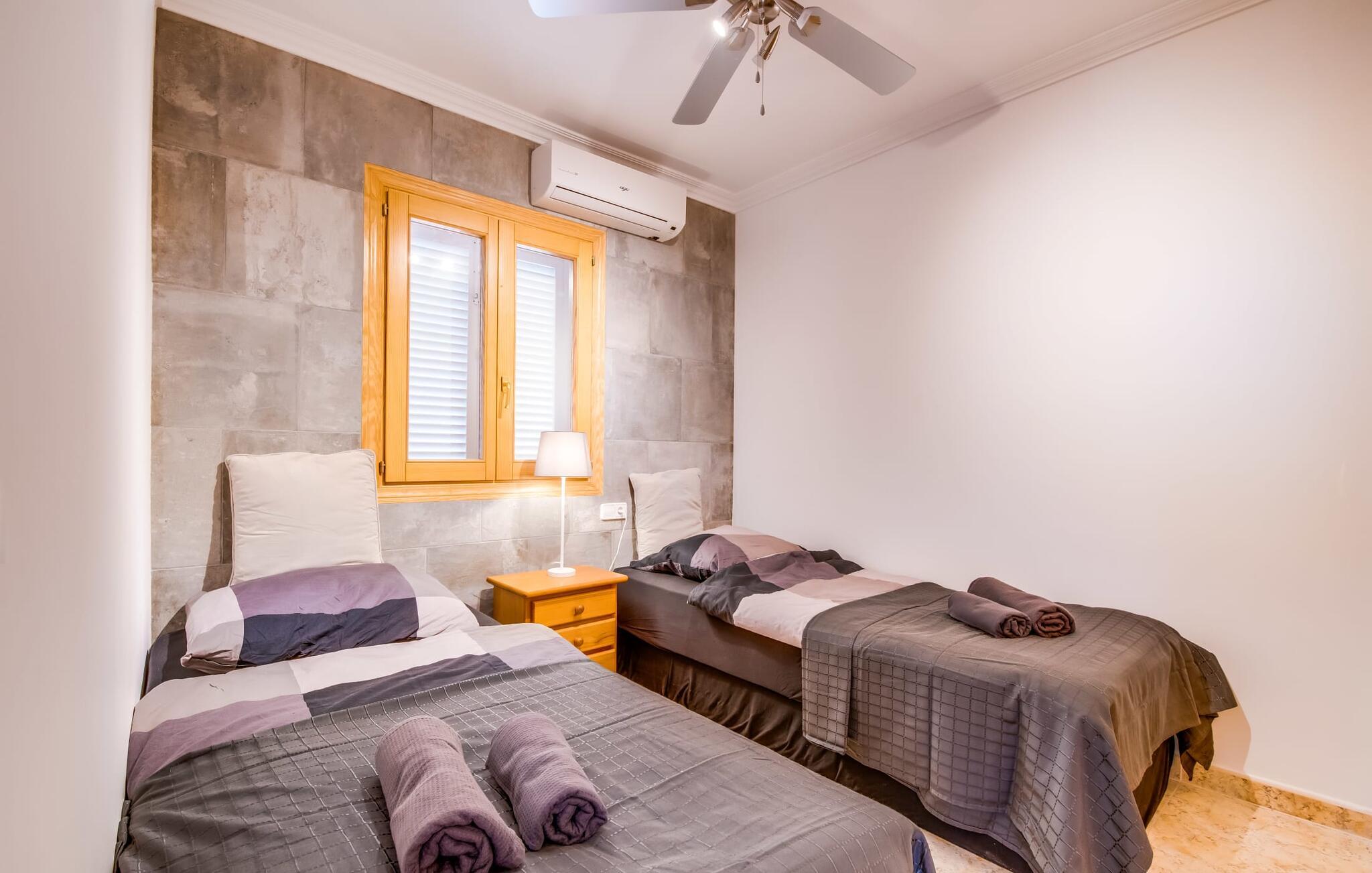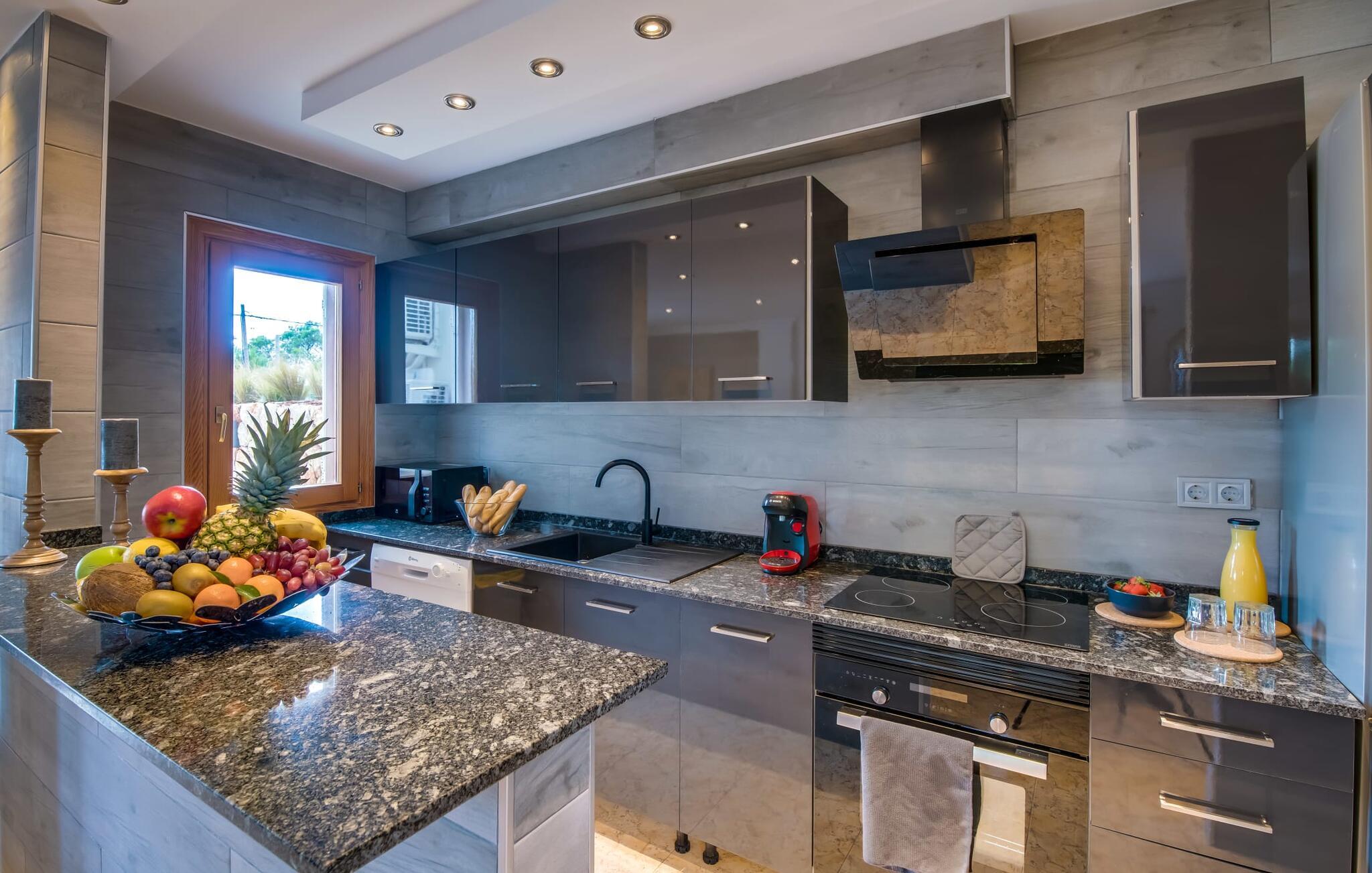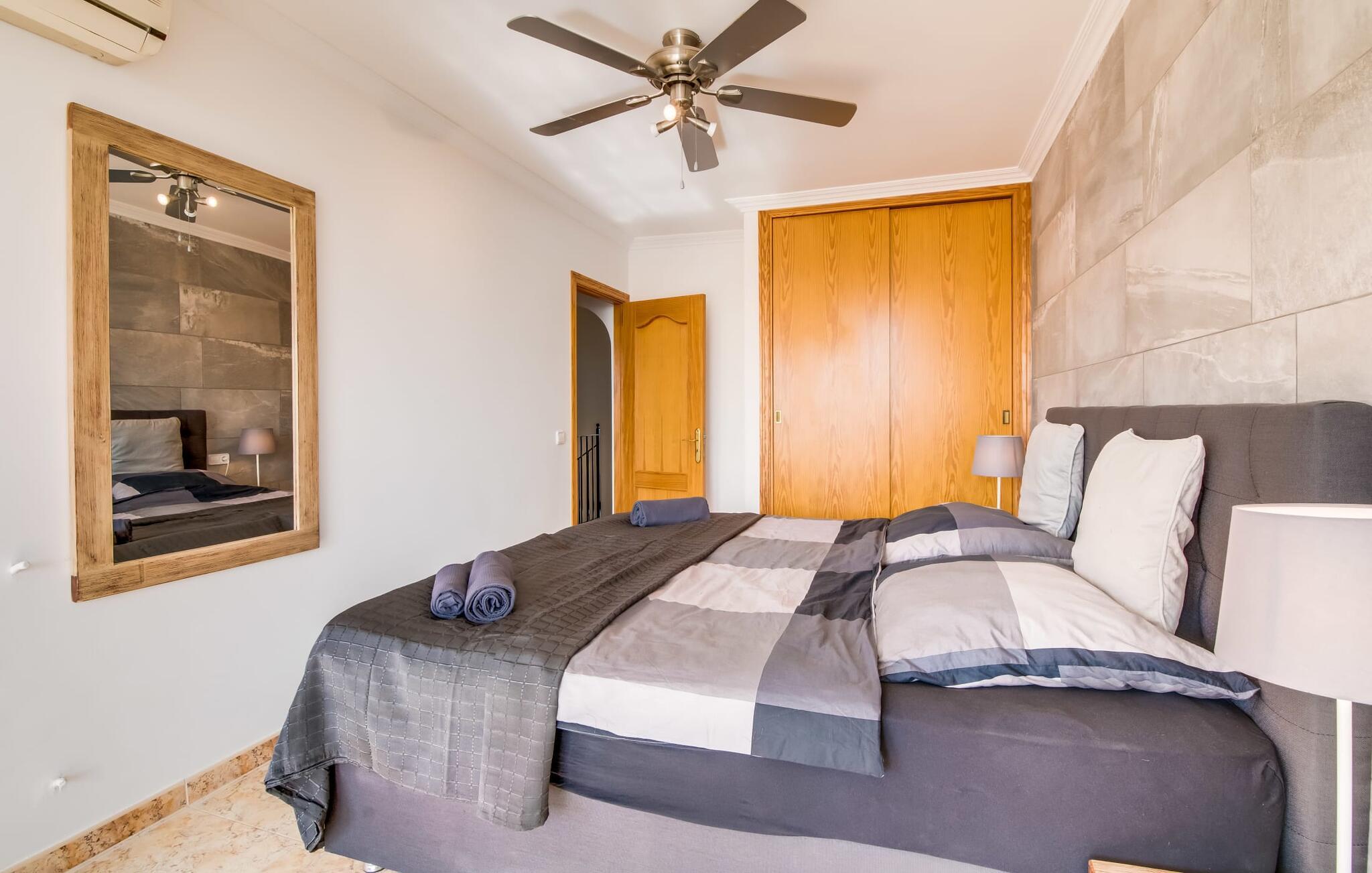Den stilfulde villa "Casa Habana" kombinerer luksus med en afslappet, munter atmosfære. Beliggende blandt palmer og en naturstenterrasse har villaen smarte liggestole, en parasol og en fælles pool med mosaikfliser, som deles med naboen "Casa Cuba" (EMI110), perfekt til en ferie med venner eller familie. Nyd måltider på den overdækkede terrasse med havudsigt eller lav mad på gasgrillen. En rummelig balkon og tagterrasse giver yderligere steder at slappe af og nyde omgivelserne. Indenfor byder den åbne stue og spisestue på moderne komfort. Der er to dobbeltværelser med aircondition med adgang til tagterrassen på første sal og et med to enkeltsenge i stueetagen. To flisebadeværelser sikrer komfort, mens det fuldt udstyrede køkken byder på alt hvad I behøver til selvforplejning. Villaen er perfekt til at nyde øens charme. Havudsigtsvillaen "Casa Habana" ligger to gader væk fra de fænomenale klipper i den dejlige kystby Cala Pi. Denne velholdte urbanisering giver jer mulighed for at tilbringe skønne timer på lange gåture langs den imponerende kystregion. I kan gøre jeres indkøb i de omkringliggende byer på den sydlige del af øen. Den børnevenlige badebugt Cala Pi ligger kun 2 km væk.