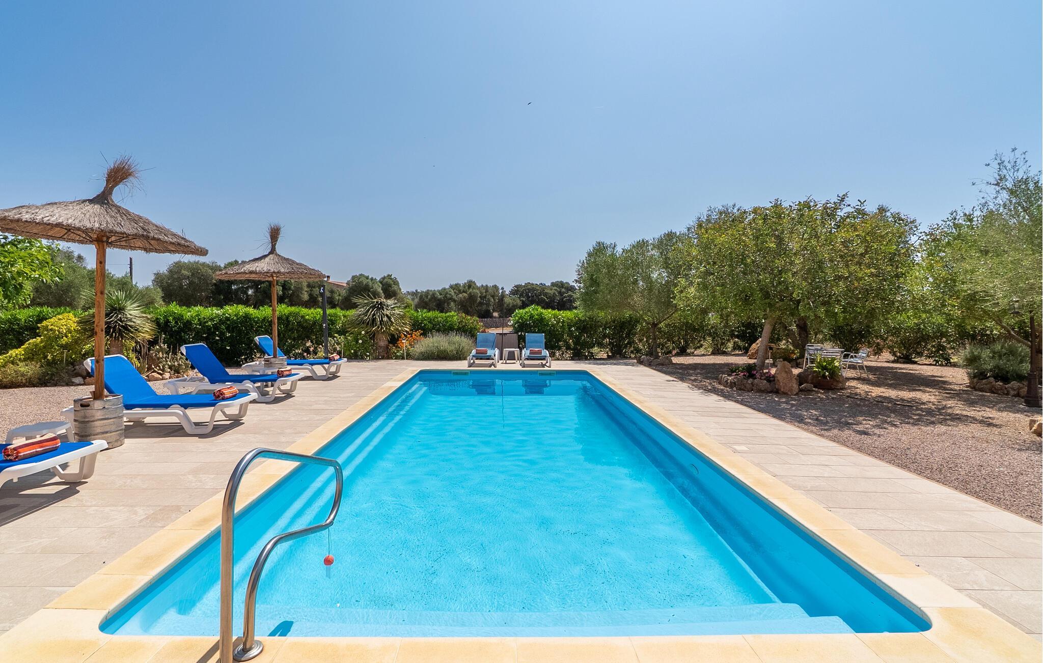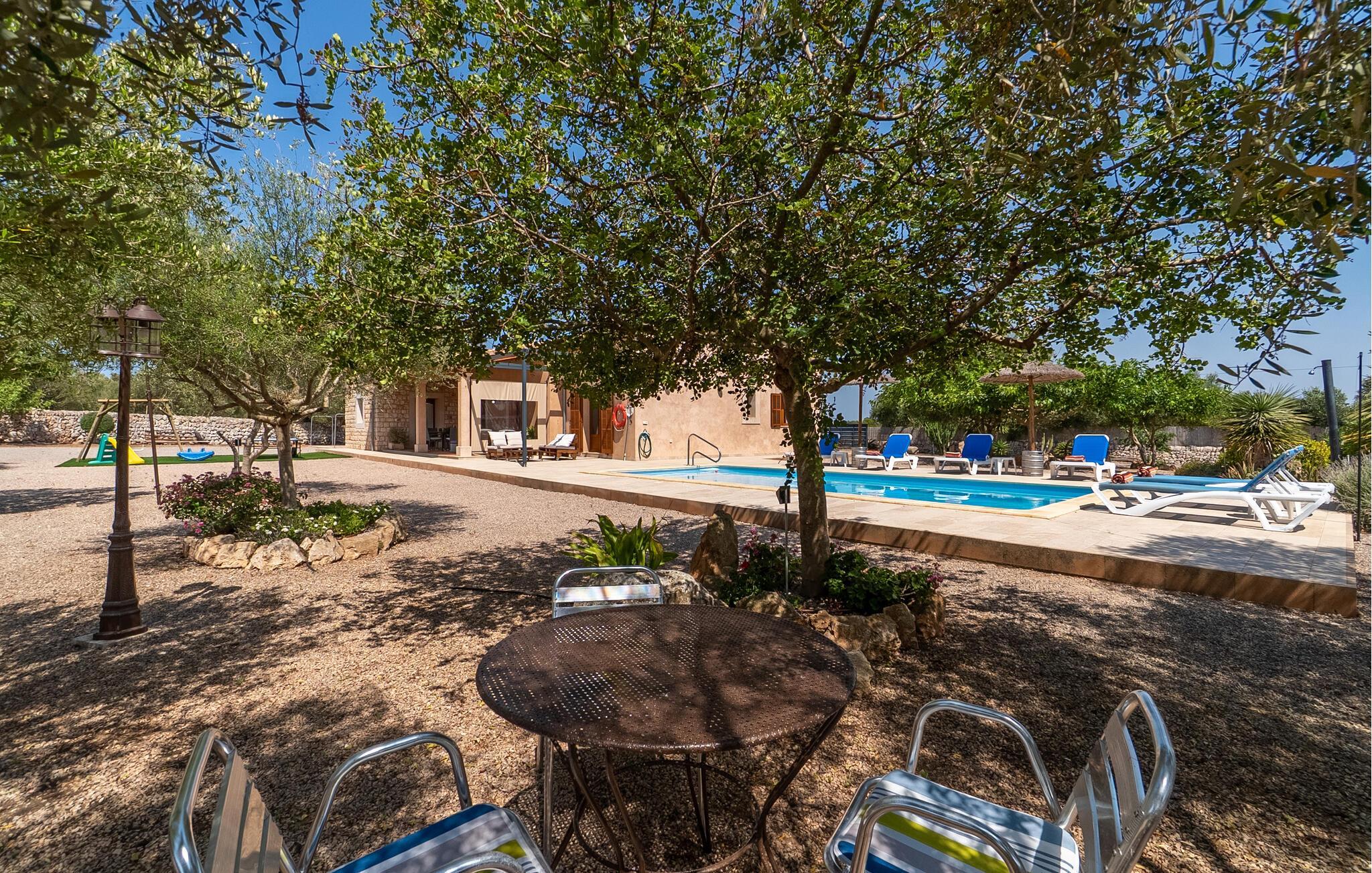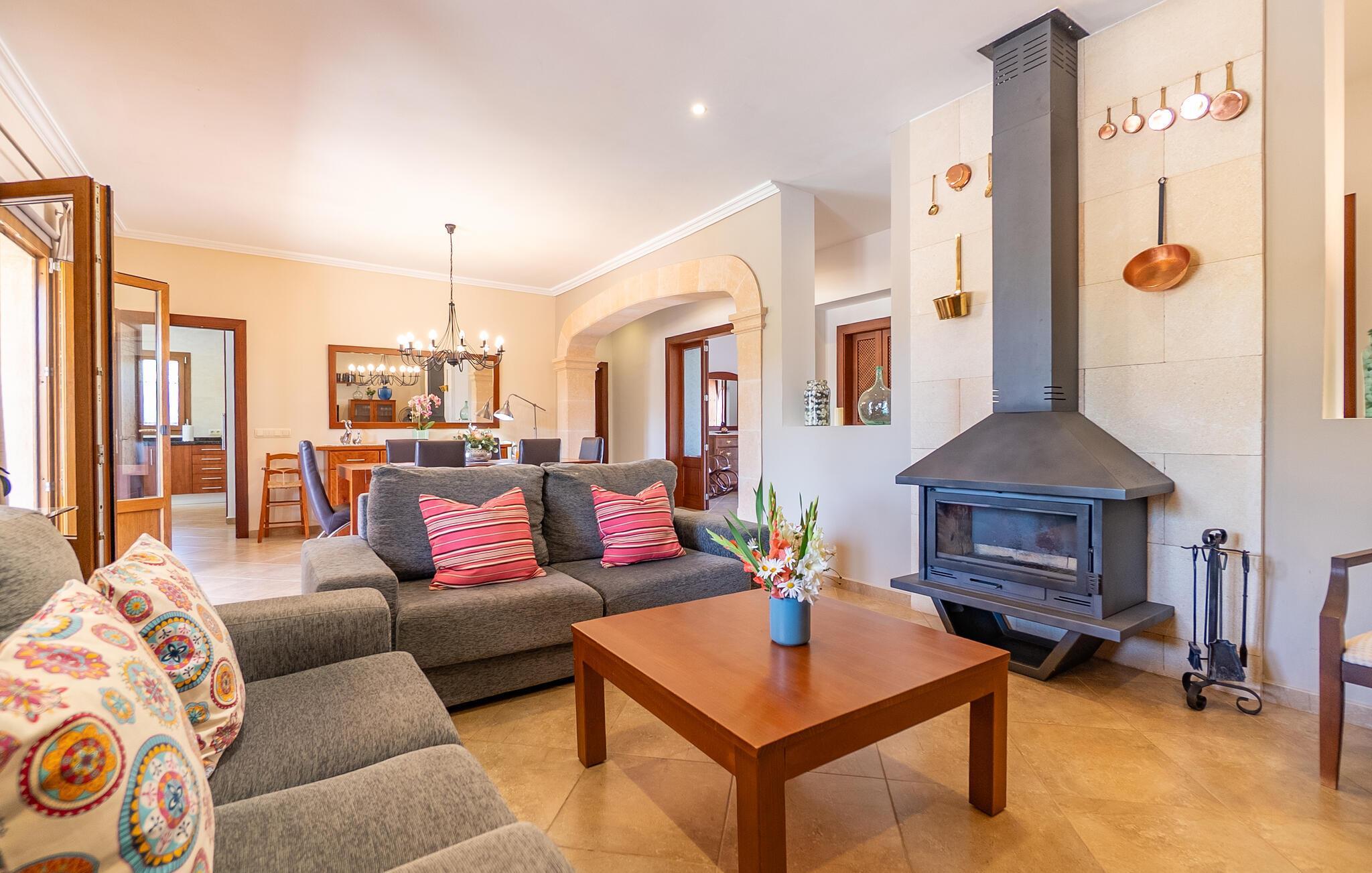 Et vidunderligt privat, landligt feriehus på Mallorca - med et stort hjerte for familier: Dette er fincaen "Casa Maria". Stueetagens finca, delvist bygget af smukke natursten, byder på plads til op til seks personer og er beliggende i det landlige sydlige Mallorca på en stor grund. Under en gåtur vil du støde på imponerende rester af de berømte historiske tårnbygninger fra Talayot-kulturen lige ved siden af. Udover disse interessante historiske facetter byder feriehusets yderst velholdte og nænsomt designede udendørsområde på ren afslapning. Forskellige terrasseområder, herunder en solrig tagterrasse, inviterer til afslapning - det være sig med en lækker snack ved det indbydende spisebord, med en god bog på en af de komfortable liggestole under parasollen ved poolen eller med en sporty omgang bordtennis ved husets bord. Du kan parkere din lejebil komfortabelt på pladsen ved huset eller i garagen med direkte adgang til huset. Dette er et Fincallorca feriehus. Interiøret i "Casa Maria" er klassisk med moderne elementer. Masser af varmt træ, kombineret med lyse vægge og klinkegulve, plus møbler af høj kvalitet, nogle få udvalgte dekorative stykker og behagelig belysning: et sommerhus at føle sig godt tilpas i! At bo på ét plan er særligt praktisk, især for familier med små børn. Du kommer ind i huset gennem et rummeligt indgangsparti. Den hyggelige, åbne stue og spisestue inviterer jer til at slappe af og spise sammen. Men I kan også spise morgenmad sammen i det rummelige, veludstyrede køkken uden pladsproblemer. De tre soveværelser med dobbeltsenge, alle smagfuldt og diskret indrettede og udstyret med indbyggede skabe, tilbyder masser af privatliv. Et soveværelse har et moderne badeværelse en suite, et andet badeværelse fuldender boligområdet på fincaen. Stille og landligt, men på ingen måde isoleret, blev fincaen "Casa Maria" bygget til seks personer på en kæmpe grund. Især børnefamilier vil finde et dejligt privat sommerhus her: Ud over masser af plads til børn at lege og løbe rundt giver den sydvendte pool med sine rummelige, overdækkede og solrige terrassearealer og et bordtennisbord variation på ferie. Den smukke landsby Ses Salines med indkøbsmuligheder ligger kun 2,4 km væk, og den smukke naturlige strand Platja Platja d'es Dolç er kun 7,8 km væk. Bemærk venligst, at denne ejendom ikke accepterer ungdomsgrupper eller polterabender. En ungdomsgruppe på denne ejendom består af personer på 25 år eller derunder. Book ikke denne ejendom, hvis du er en ungdomsgruppe eller polterabend, da din reservation vil blive afvist, når den er booket, hvilket også kan være tilfældet ved ankomst til ejendommen eller under dit ophold, og du vil ikke modtage en refusion