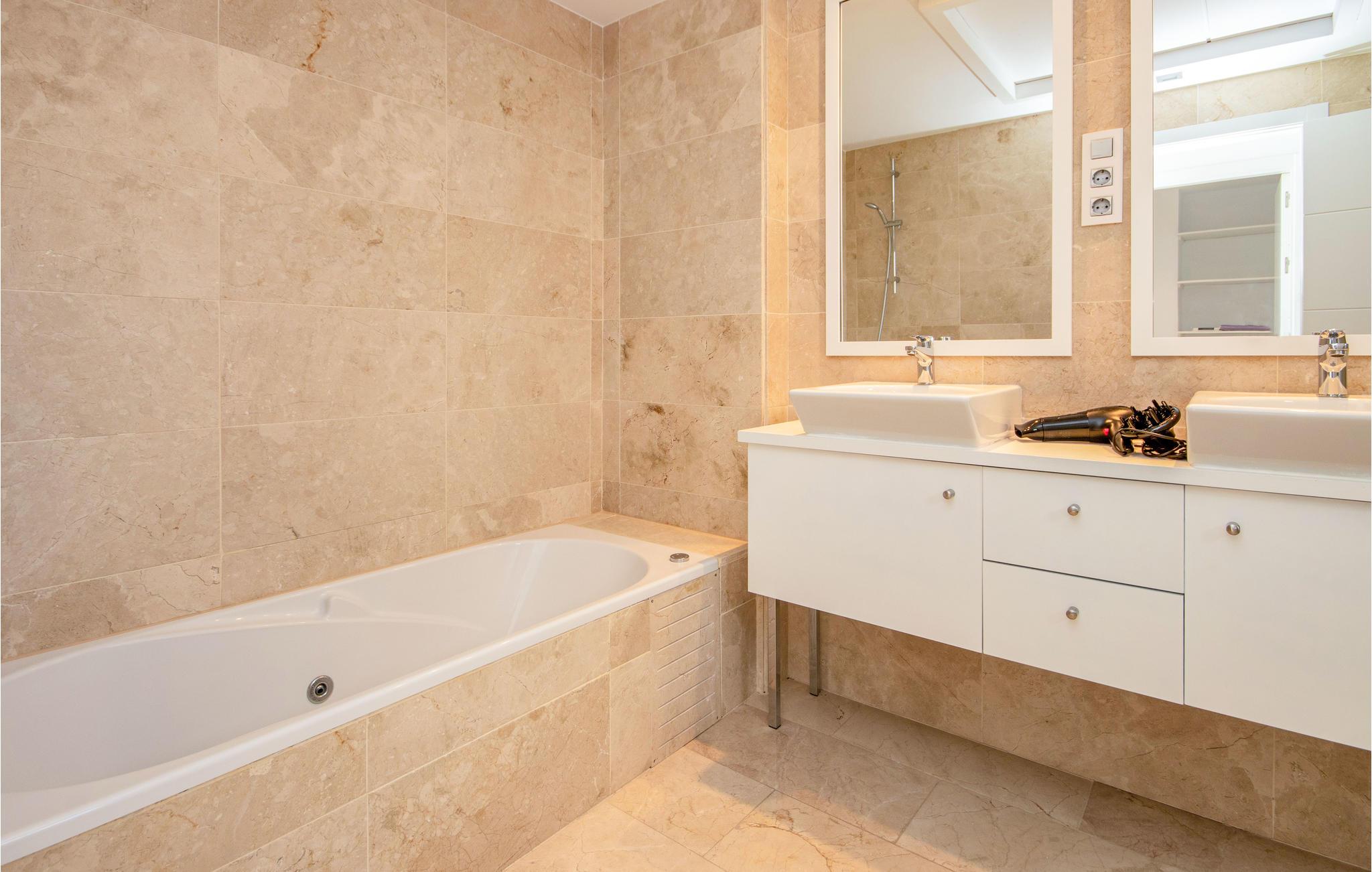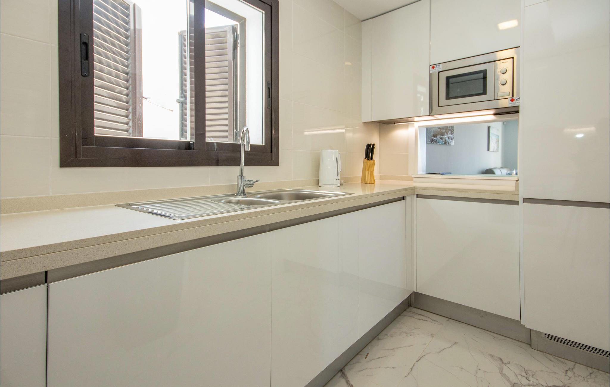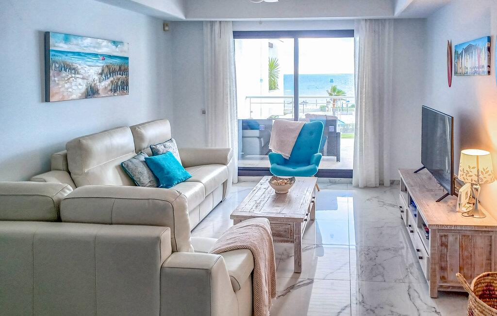 Denne moderne og lækre ferielejlighed med to soveværelser er ganske enkelt indbydende. Den rummelige lejlighed ligger lige ud til Casares del Marstranden i Casares, er møbleret med førsteklasses genstande og har en sydvendt terrasse hvorfra der er betagende udsigt over både havet og den fælles pool. På terrassen er der sofa og behagelige stole, samt spisebord og stole samt en gasgrill. Lejligheden ligger på første sal i en ejendom med elevator og er smukt indrettet. Her er v/k klimaanlæg. Den fra den rummelige stue er der udgang til terrassen. Fra køkkenet er der praktisk åbning ind til stuen, med spisebord og stole, L-formet sofa og tv. I det største soveværelse er der en super-kingsize-seng og et walk-in-closet samt indgang til eget badeværelse. I gæsteværelset er der en dobbeltseng og en etageseng til to personer. Her er også indbyggede skabe og gæsterne kan benytte sig af lejlighedens andet badeværelse. Fra begge soveværelser er der udgang til en terrasse.