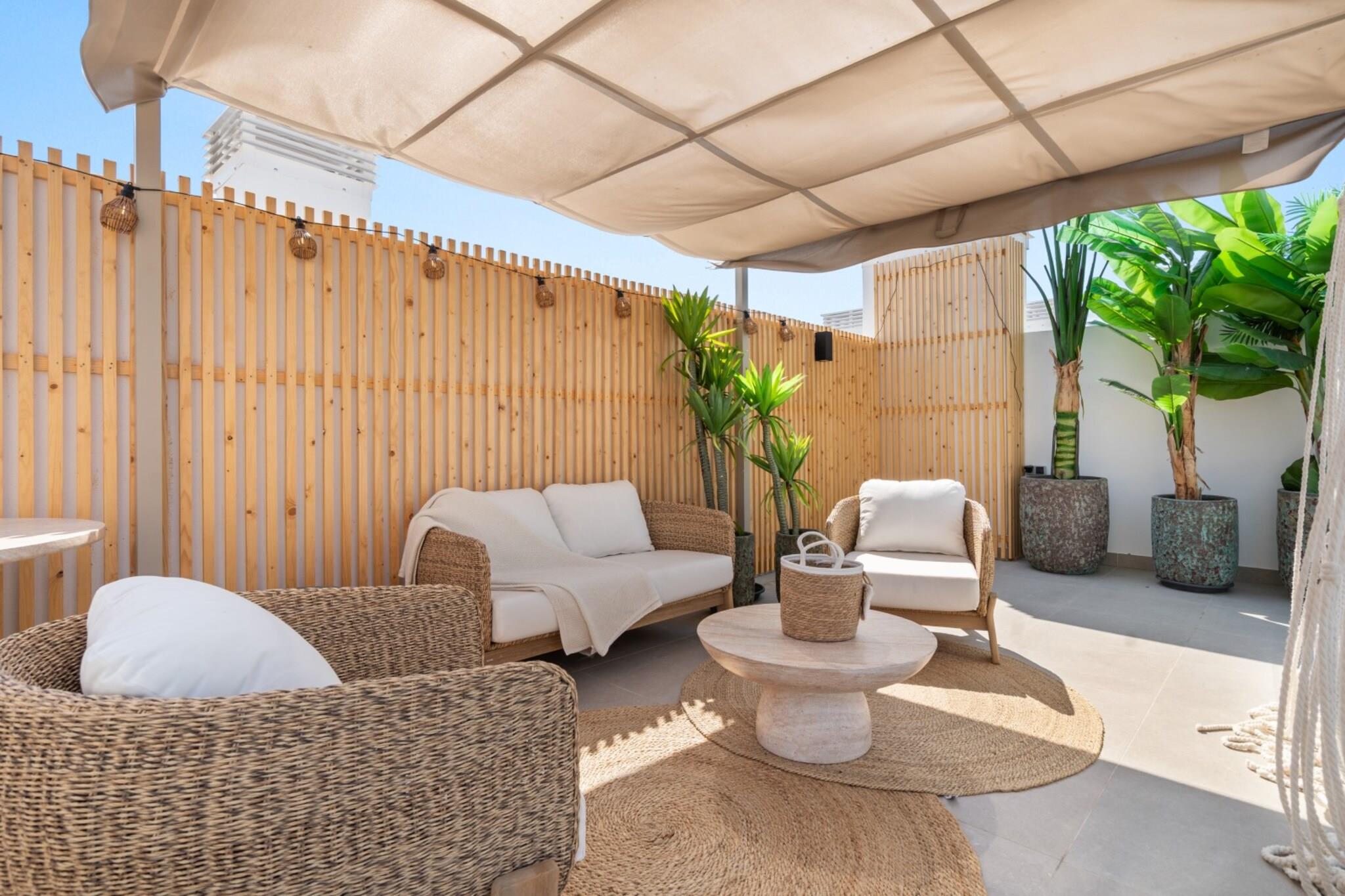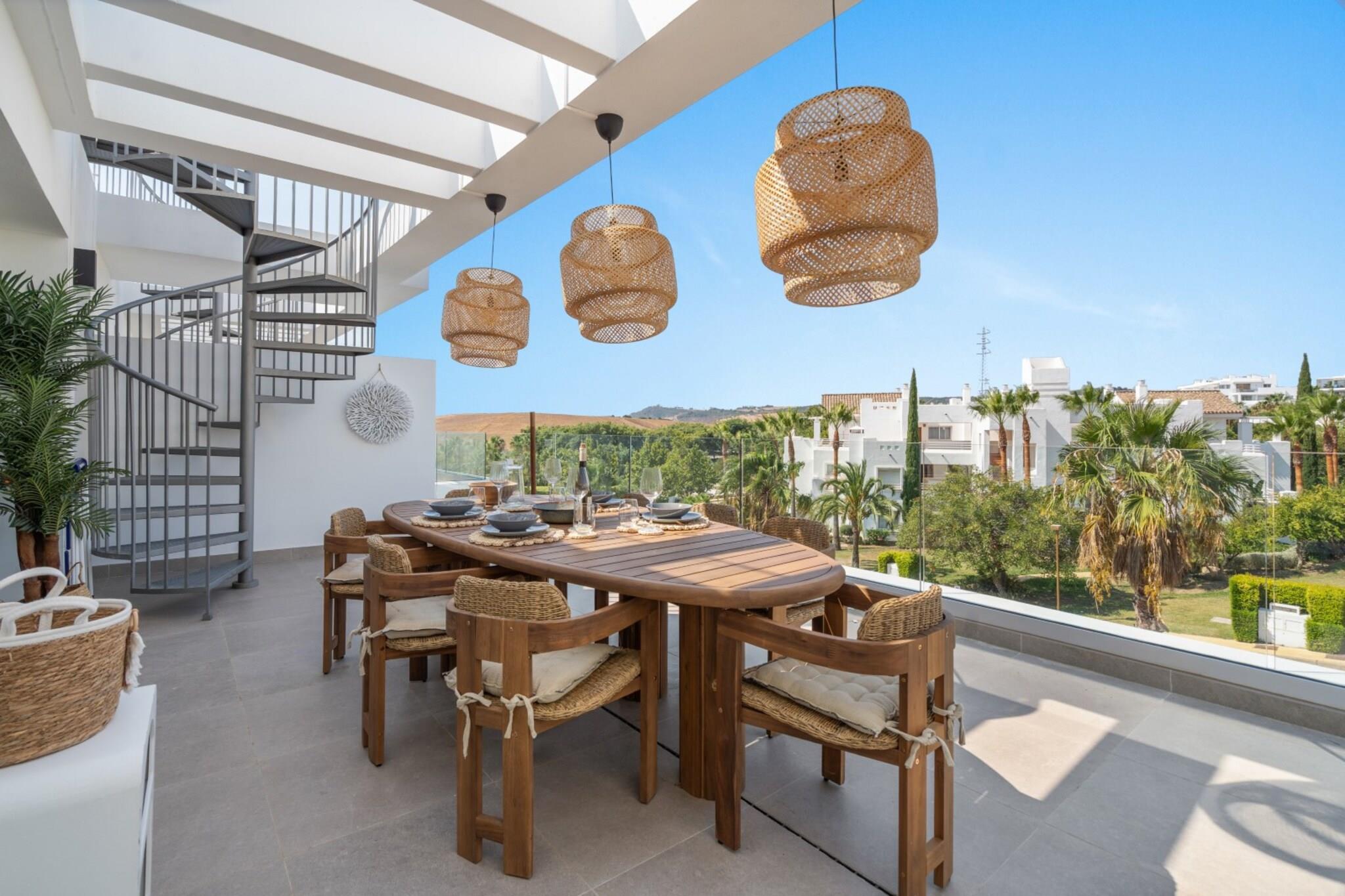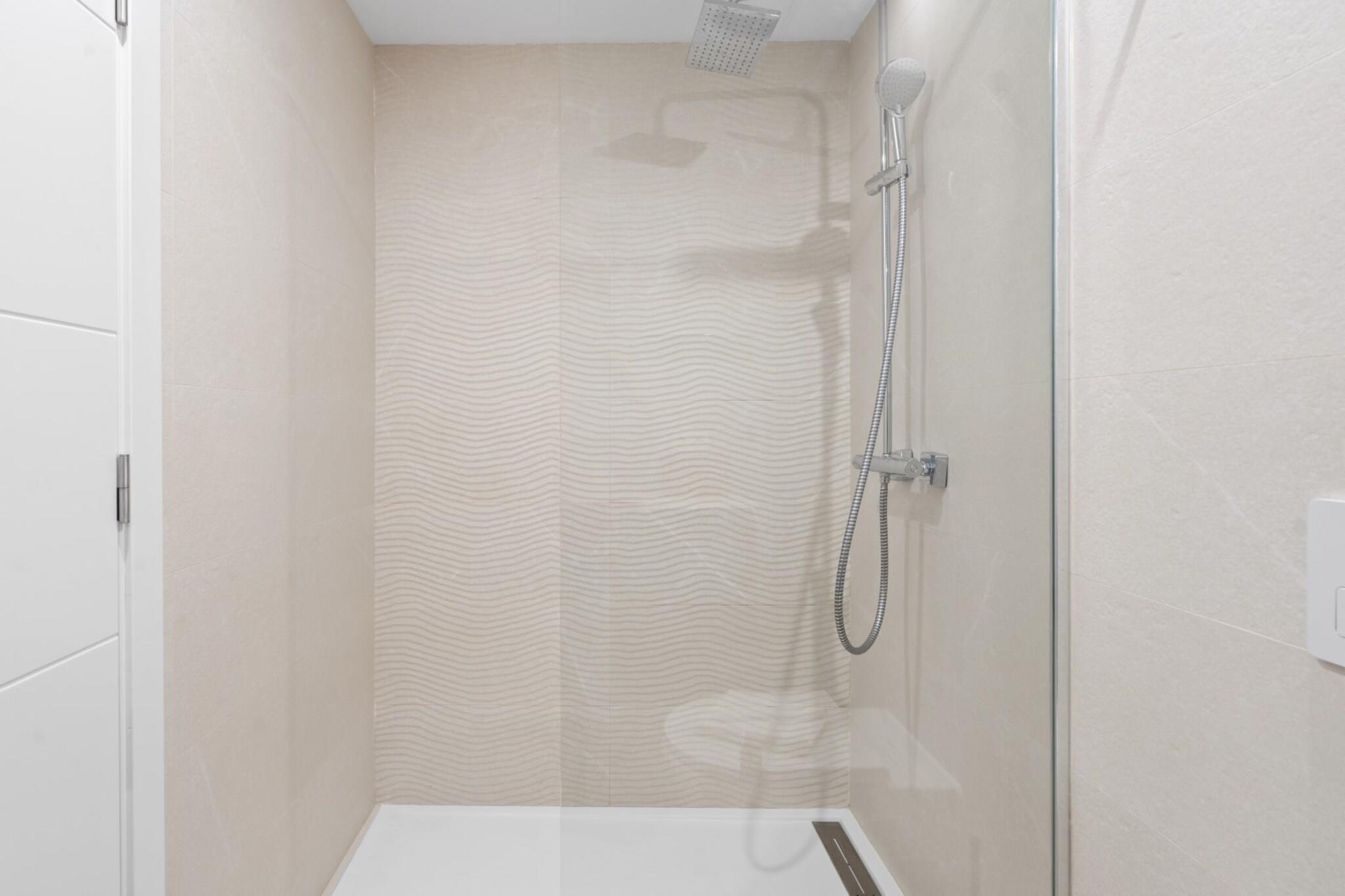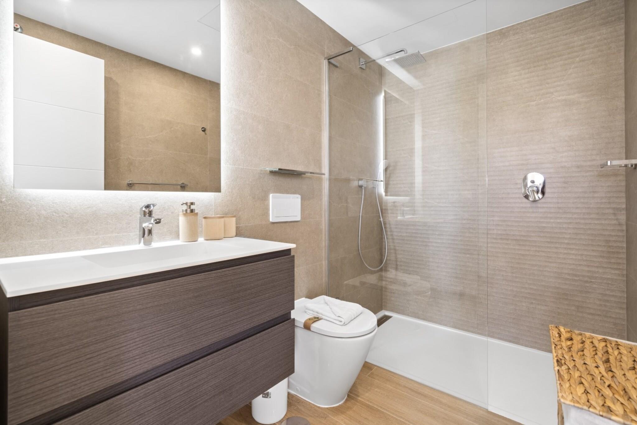 , åbent køkken(elkedel, brødrister, kaffemaskine(espresso), ovn, mikrobølgeovn, opvaskemaskine , køleskab, fryser, , ), stue / spisestue(Fjernsyn(Smart-TV), spisebord, sofahjørne, radio), soveværelse(enkeltseng), soveværelse(dobbeltseng), badeværelse(bruser, håndvask, toilet), badeværelse(bruser, håndvask, toilet), fitnessrum, Internetadgang, Børne swimmingpool, Havemøbler, hottub, hottub, sauna, vaskemaskine, balkon, varme, klimaanlæg, terrasse, have, solstole, parkering, swimmingpool(deles med andre gæster), strygejern, føntørrer, Alarm