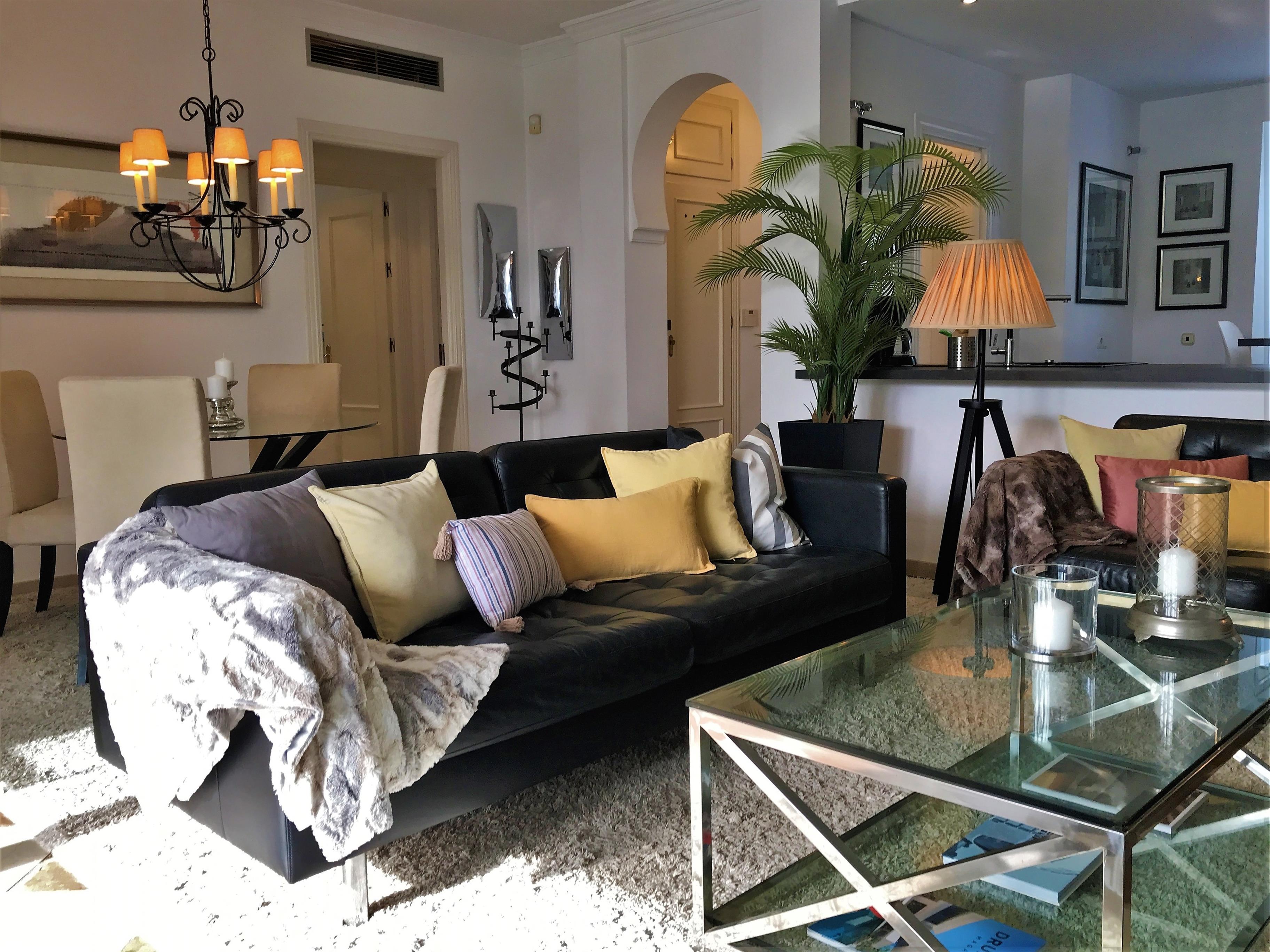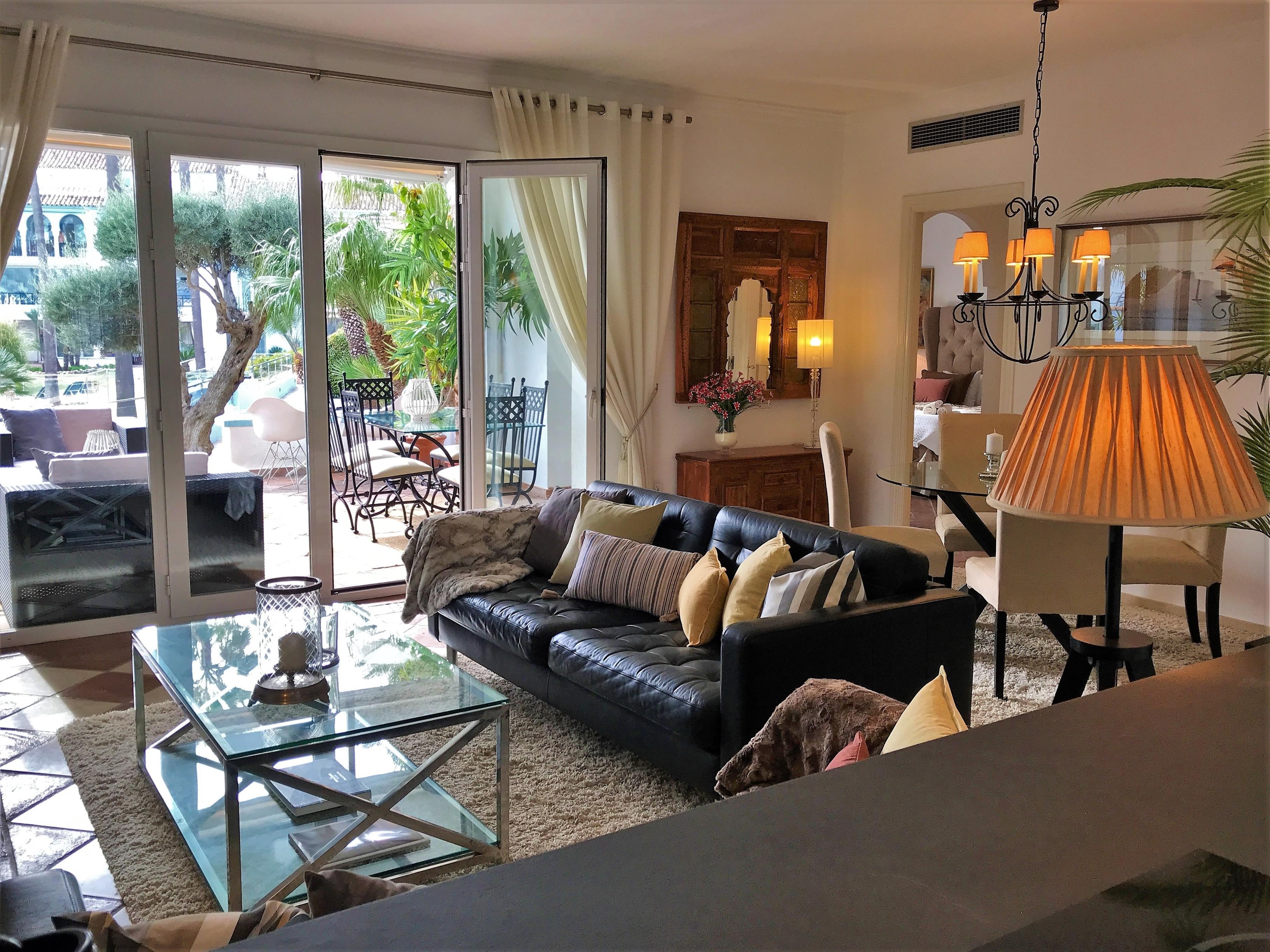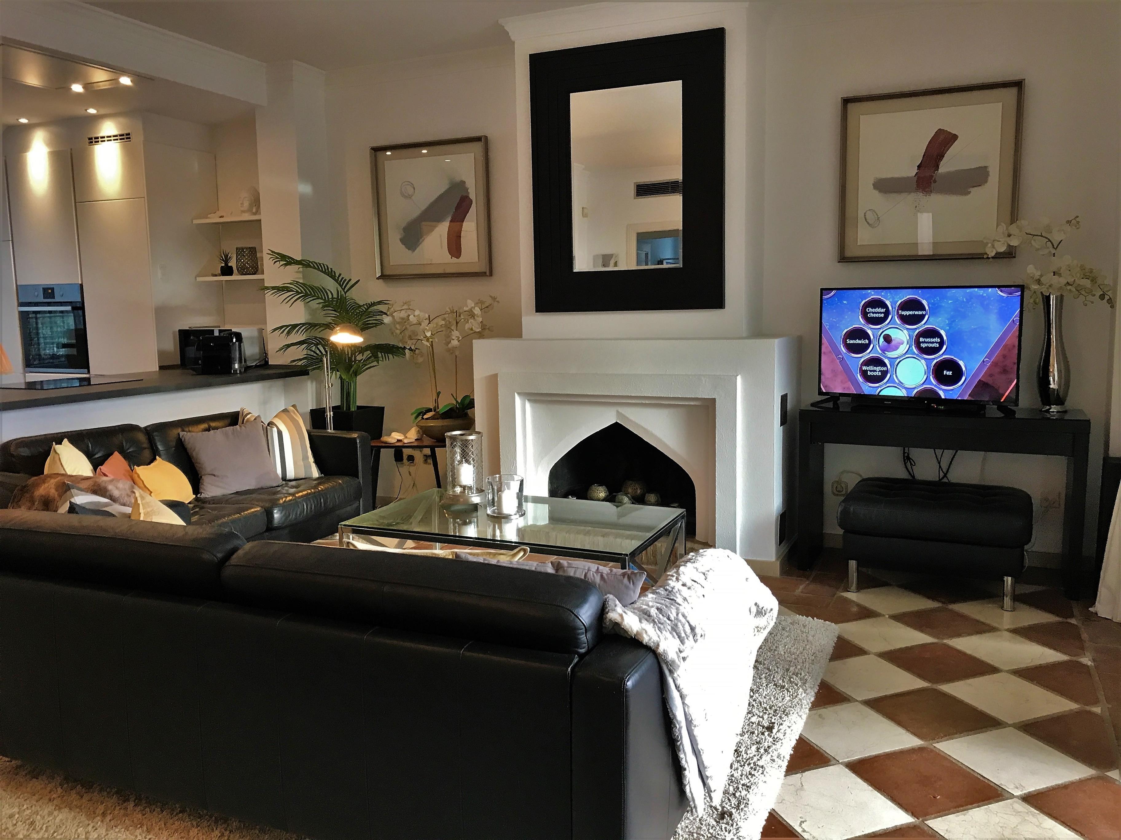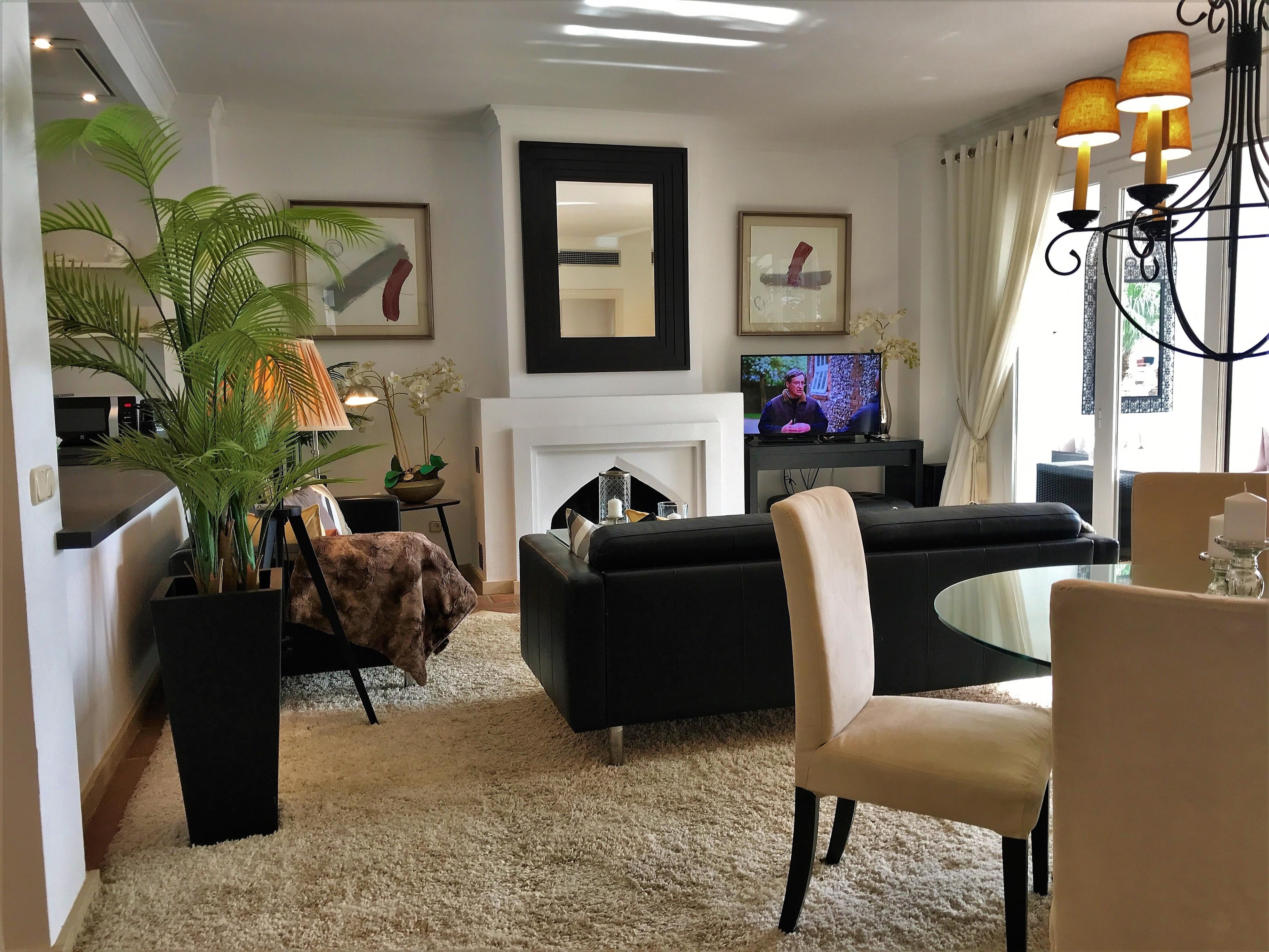 Herzstück der Wohnung ist das sonnige Wohnzimmer mit bequemen Sofas vor dem Kamin, kleinem Esstisch & direkten Zugang der der überdachten Terrasse mit einem weiteren Esstisch & Loungemöbeln. Beide Schlafzimmer haben ein eigenes en-suite Bad. Die Wohnung ist durchgehend sehr hochwertig & geschmackvoll eingerichtet.