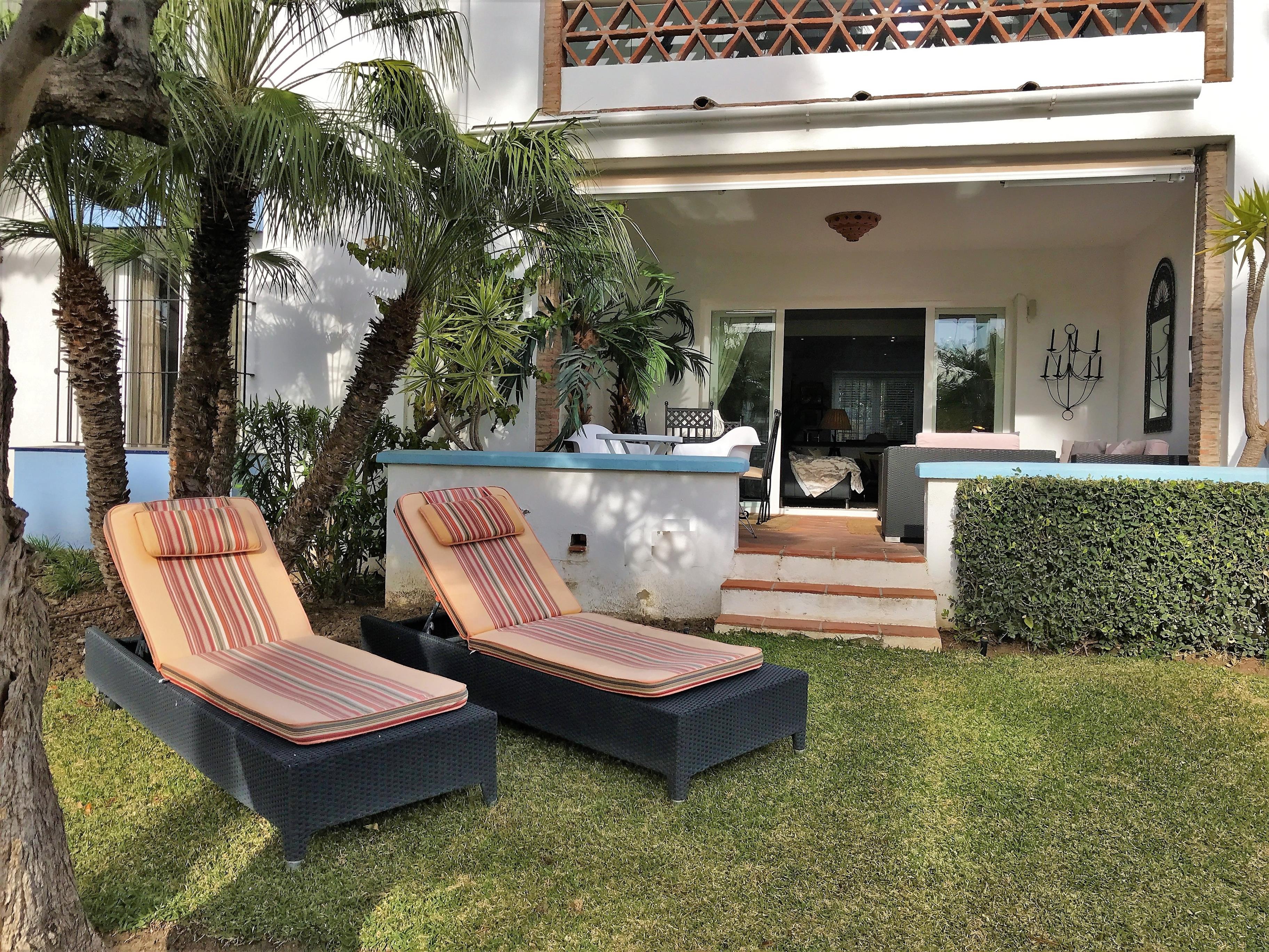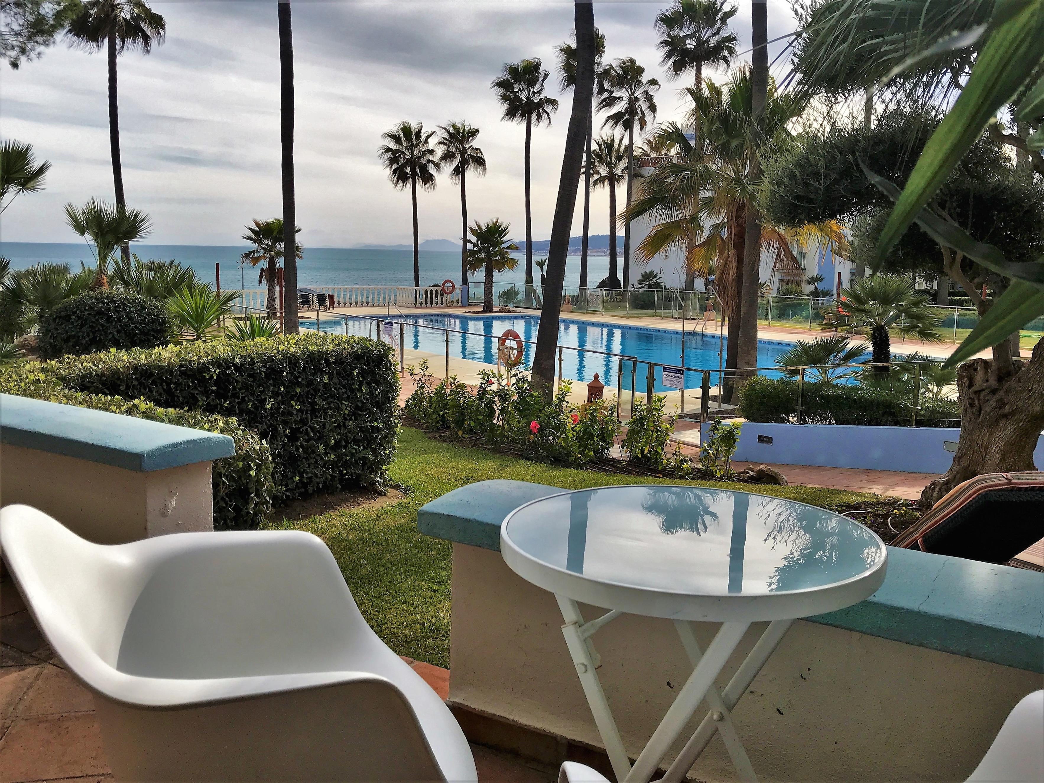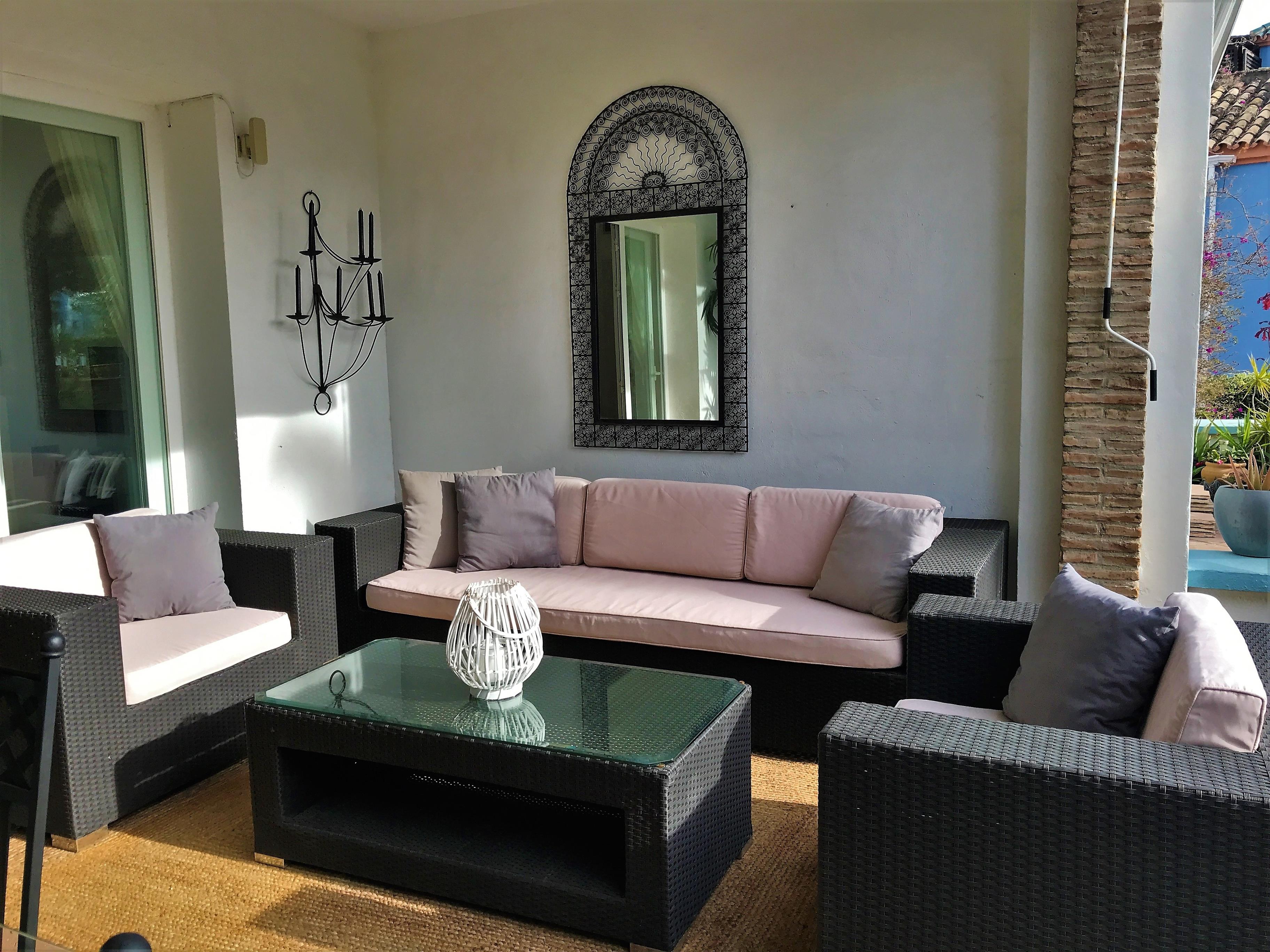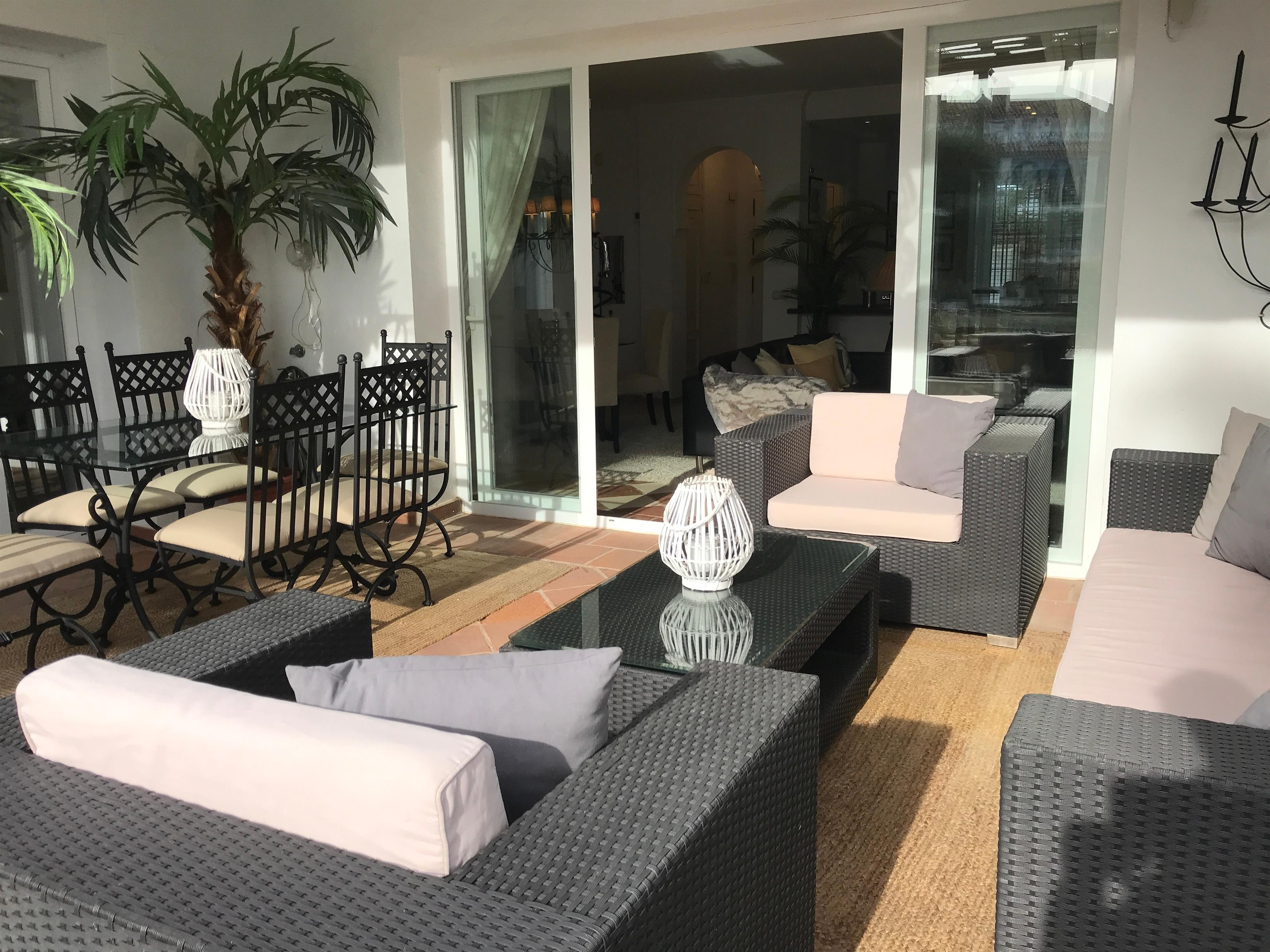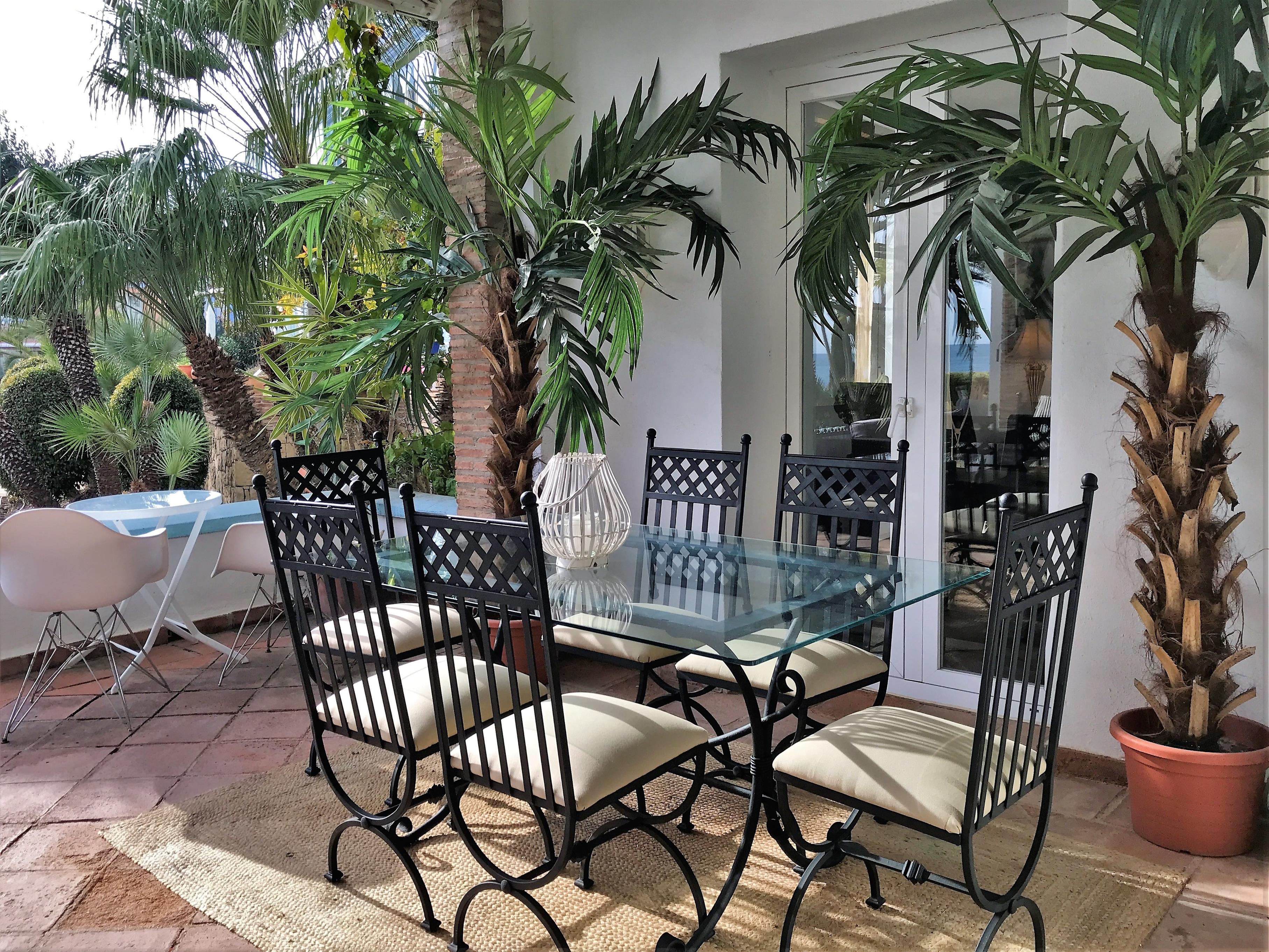 Auf der grossen & überdachten Terrasse erwartet Sie ein vierter Esstisch für 6 Personen & bequeme Lounge-Möbel. Die Terrasse überblickt den privaten kleinen Garten vor der Terrasse, den Hauptpool der Anlage & dahinter das Mittelmeer mit Afrika & GIbraltar.