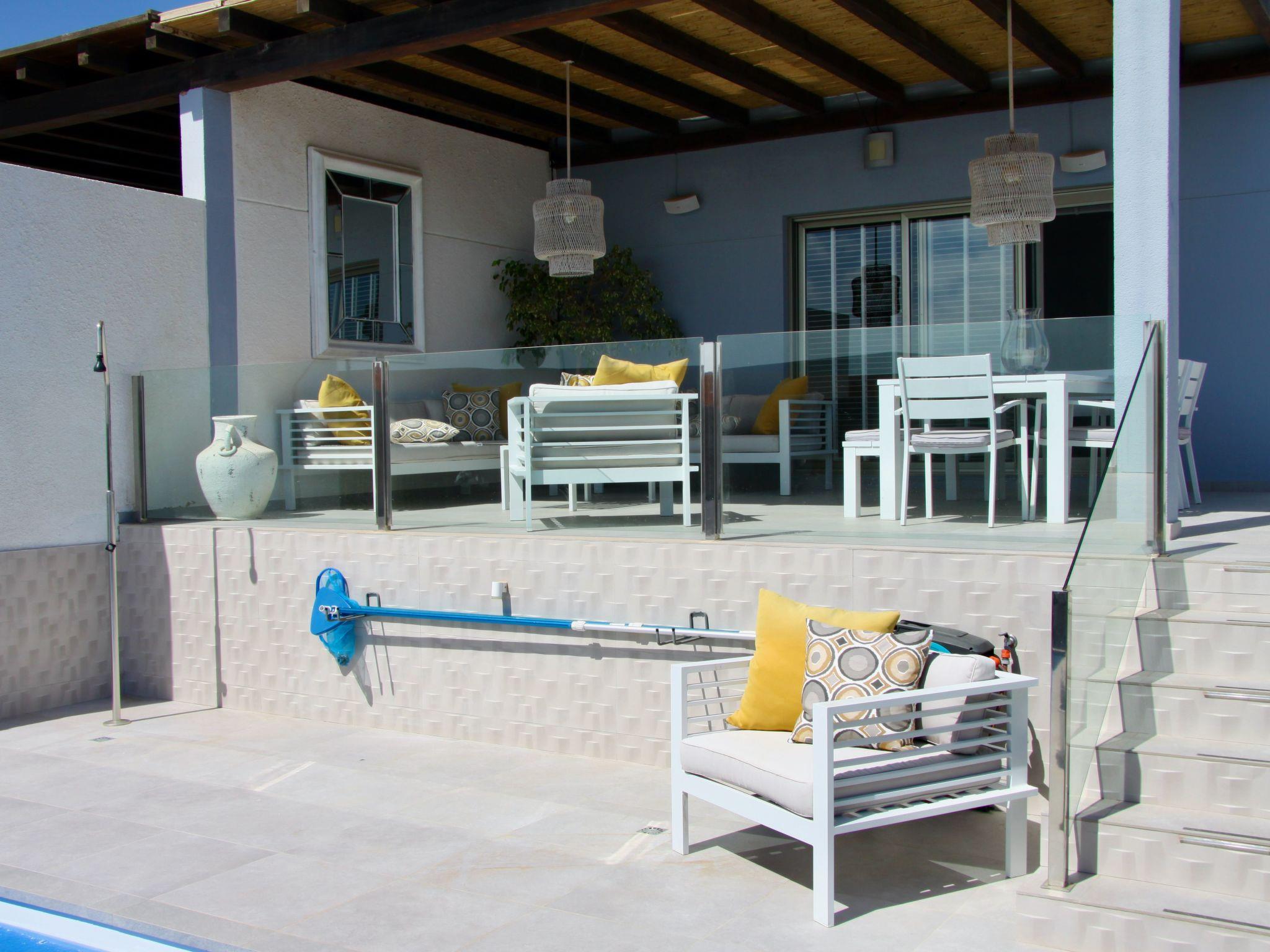 The villa has a spacious upper terrace, which includes ample comfy seating and dining table seating up to 8 persons, the outside Kitchen includes BBQ, sink unit and fridge freezer, induction hot plate also available. Lower Garden includes a 3m x 6m salt water swimming pool with shower, pool temperature is maintained at 28c -29c, ample sunbeds with beach towels provided. For convenience there is also an outside WC, All areas of the exterior are illuminated well.
