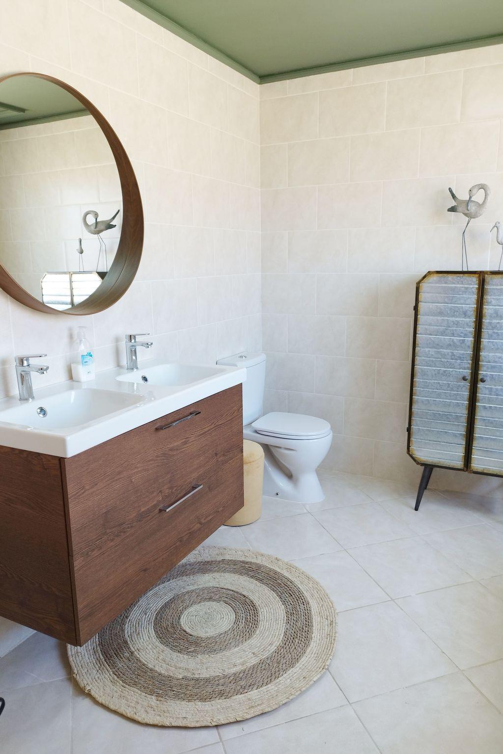 Master suite with en suite bathroom (on the 1st floor): 1 large double bed 150 x 190 cm with 2 bedside tables - Chest of drawers - 1 flat-screen TV with French DTT satellite reception - 1 Google Chromecast - 1 TV unit - Fan. Access to terrace. Bathroom with bath, double washbasin unit, mirror and WC.