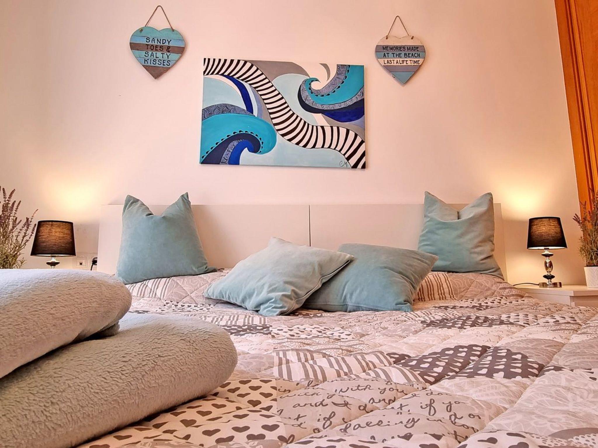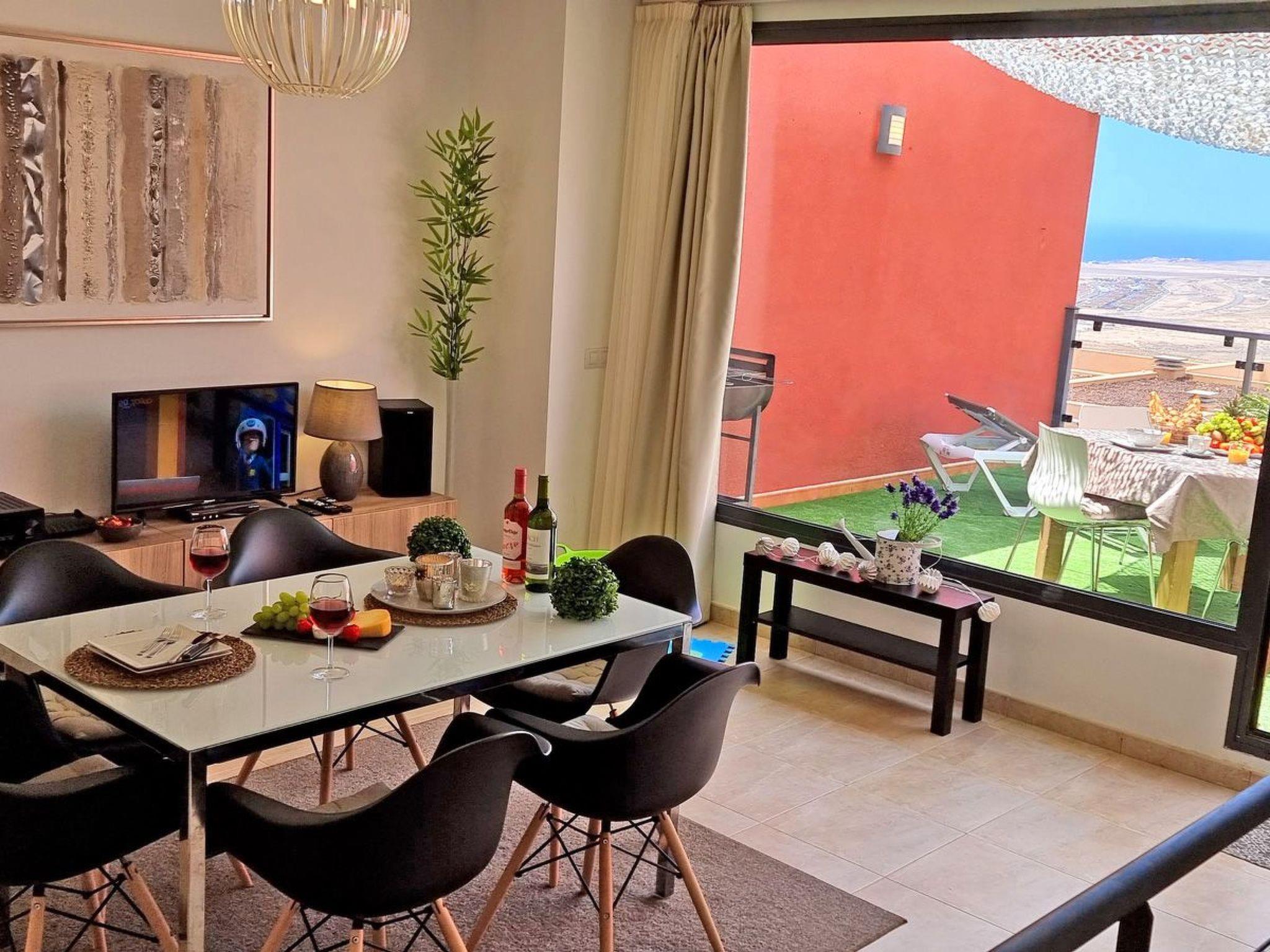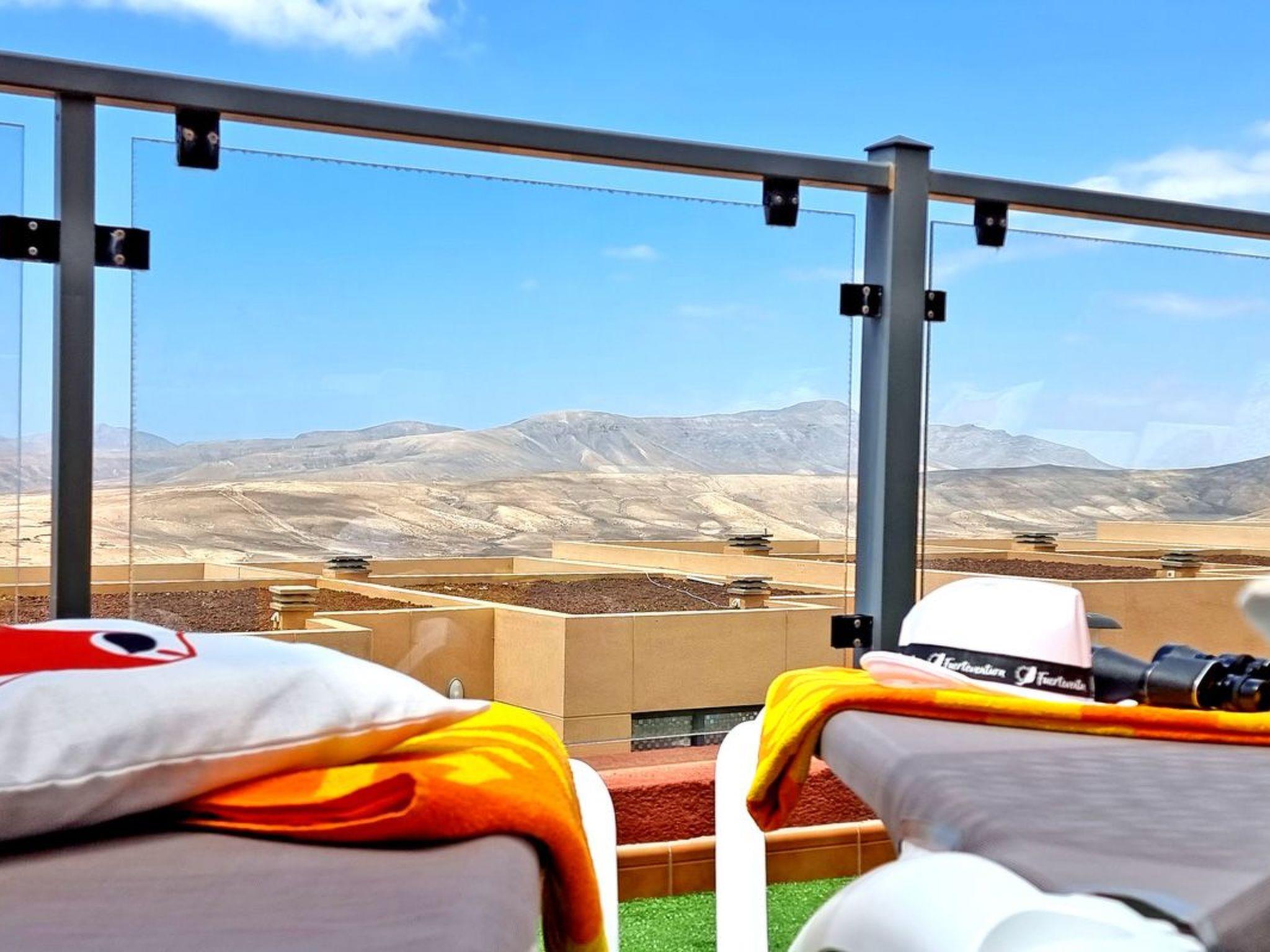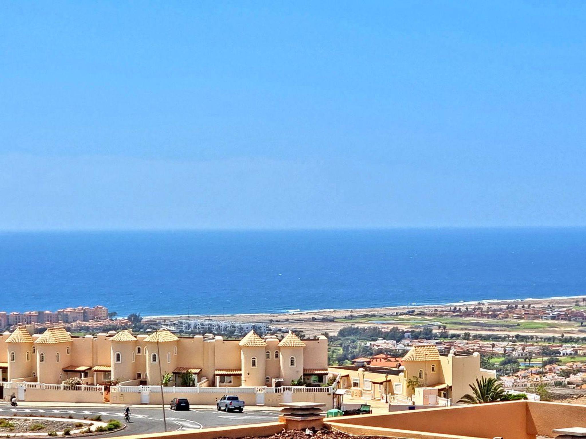 The comfortably furnished and modern 3-storey apartment on a mountain in Caleta de Fuste offers 3 bedrooms, 3 bathrooms, a large living area with a pull-out sofa bed, a dining area with an open kitchen and a great large terrace with a barbecue, sun loungers and seating is.The view from the dining area and from the terrace: IS BREATHTAKING. You have a panoramic view of the whole city, a wonderful sea and mountain view.Bedroom No. 1 with ensuite bathroom: