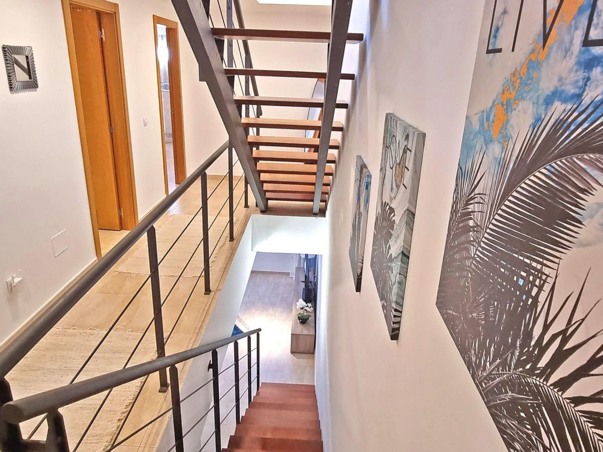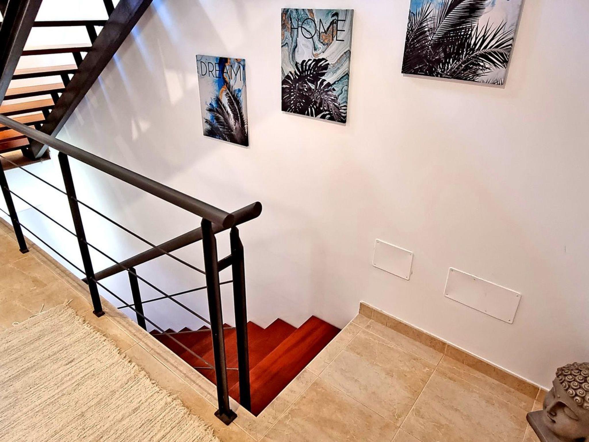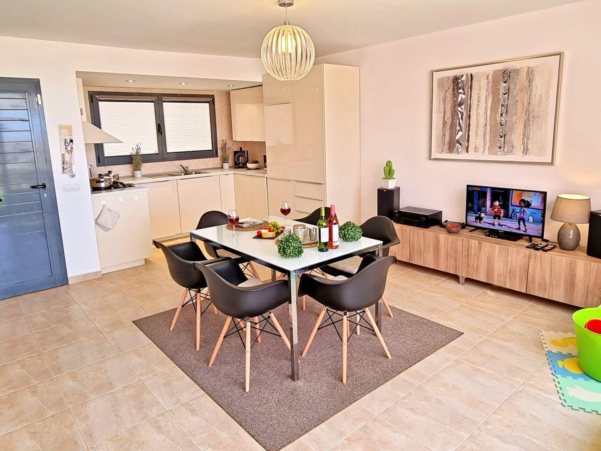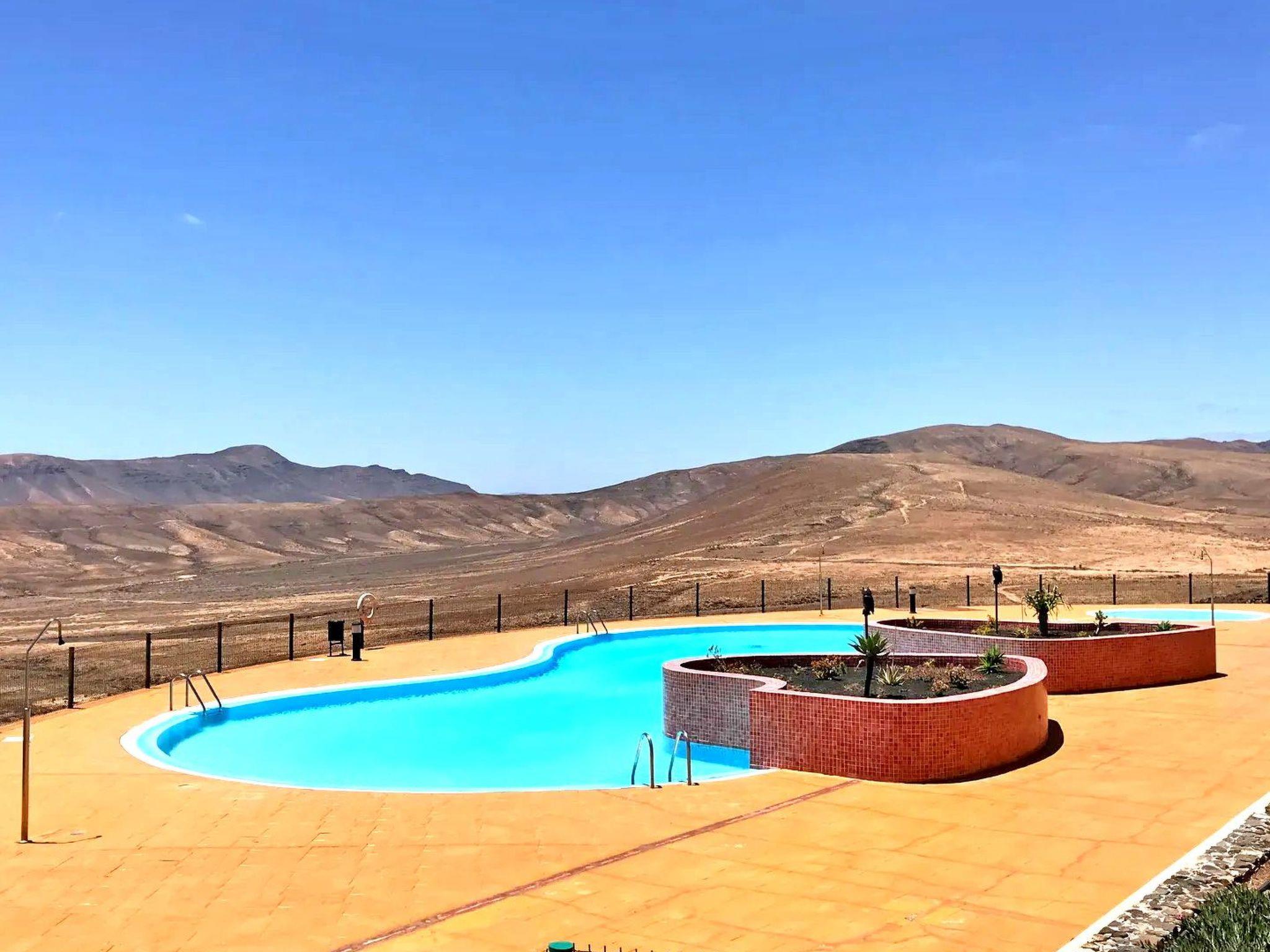 The comfortably furnished and modern 3-storey apartment on a mountain in Caleta de Fuste offers 3 bedrooms, 3 bathrooms, a large living area with a pull-out sofa bed, a dining area with an open kitchen and a great large terrace with a barbecue, sun loungers and seating is.The view from the dining area and from the terrace: IS BREATHTAKING. You have a panoramic view of the whole city, a wonderful sea and mountain view.Bedroom No. 1 with ensuite bathroom: