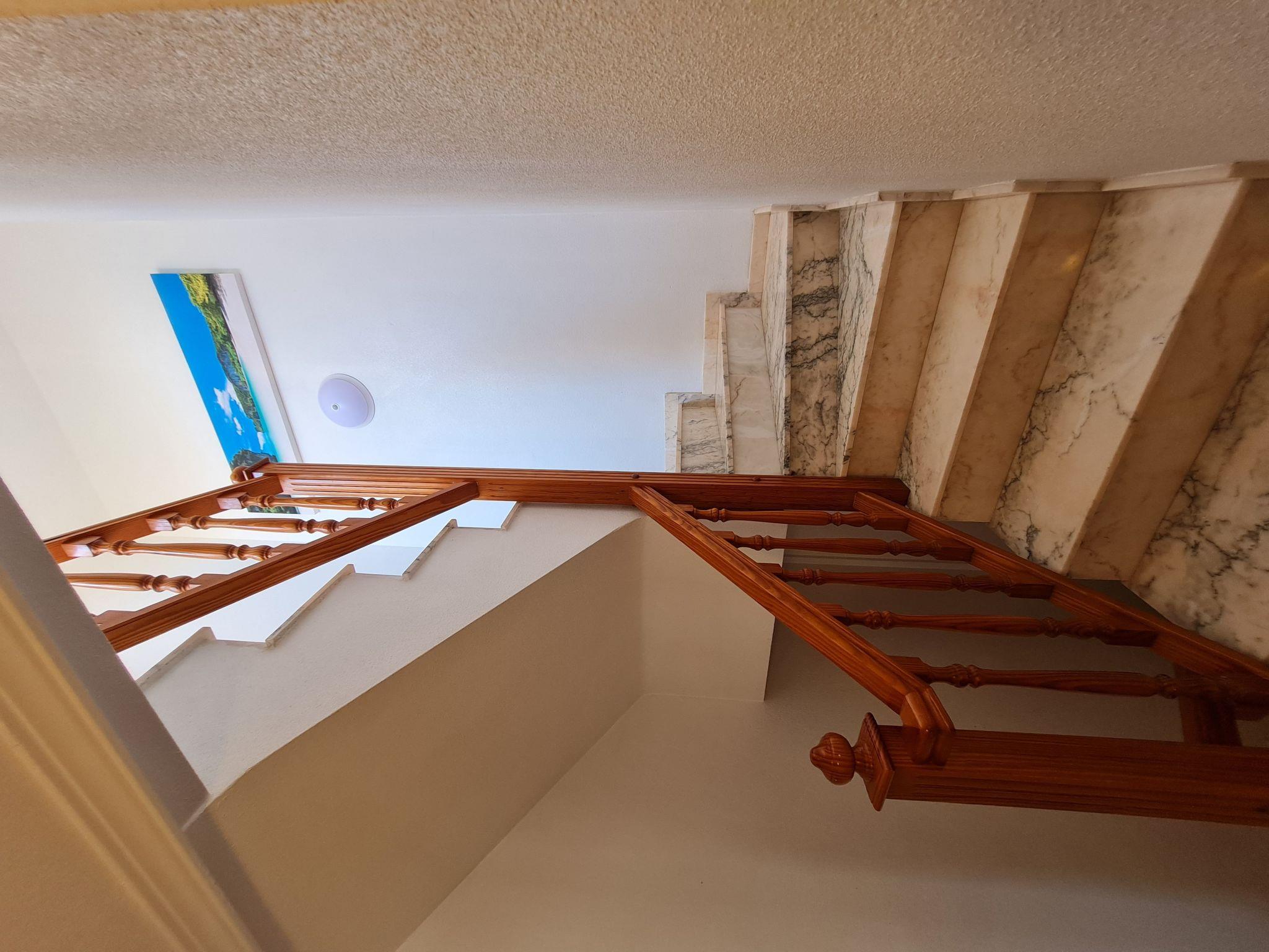 The vacation home has 3 floors: we have a terrace, living and dining area with guest toilet and a fully equipped kitchen on the first floor. This area is equipped with air conditioning, ceiling fans and pellet stove. Smart TV with intl. Cable TV channels - Cable list:: Olé TV cable channelsOn the upper floor is the bathroom with shower, the two bedrooms, one with double bed + balcony and one with two single beds. Both bedrooms are equipped with air conditioning. You can reach your private roof terrace (solarium) via the internal staircase. The solarium is completely private and well protected from prying eyes. Loungers, table and chairs invite you to sunbathe and relax. From here you have a view of the pool area and towards the beach, with the sea visible in the distance.