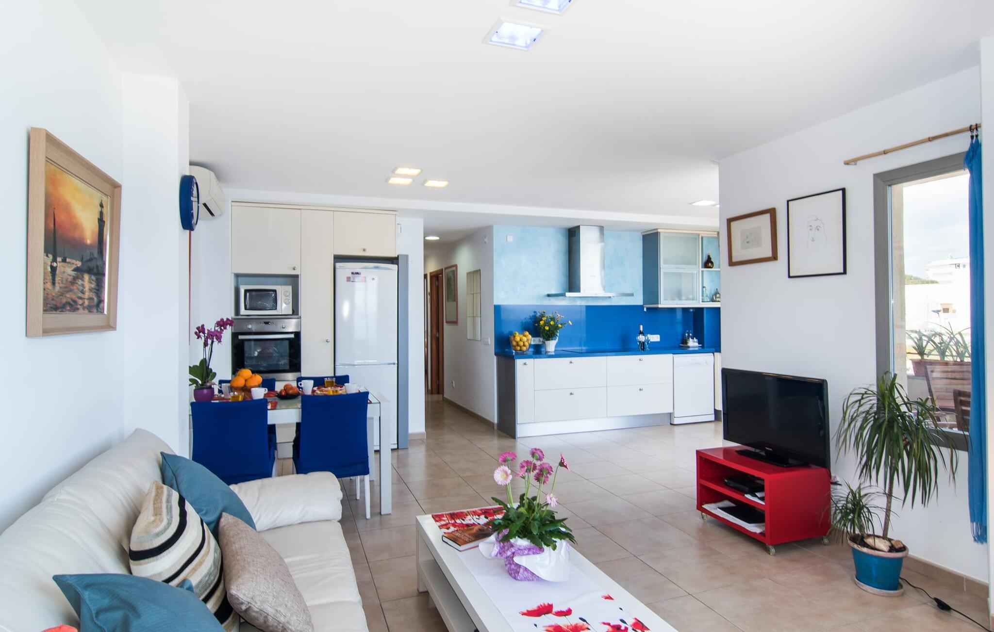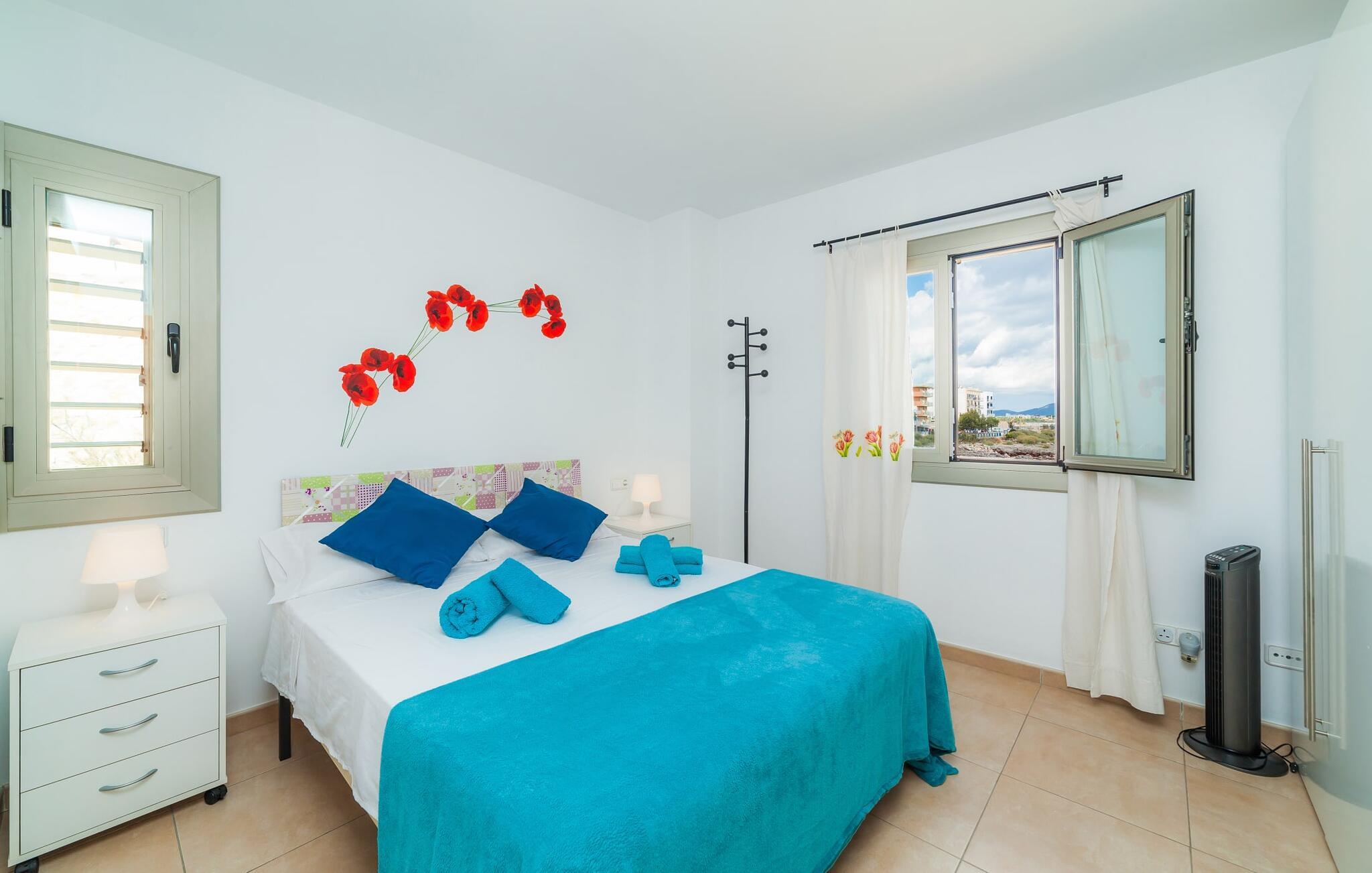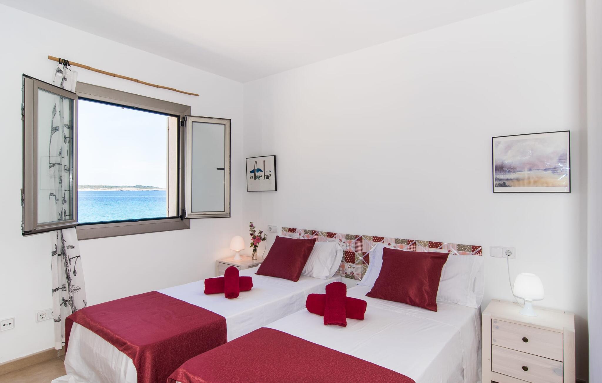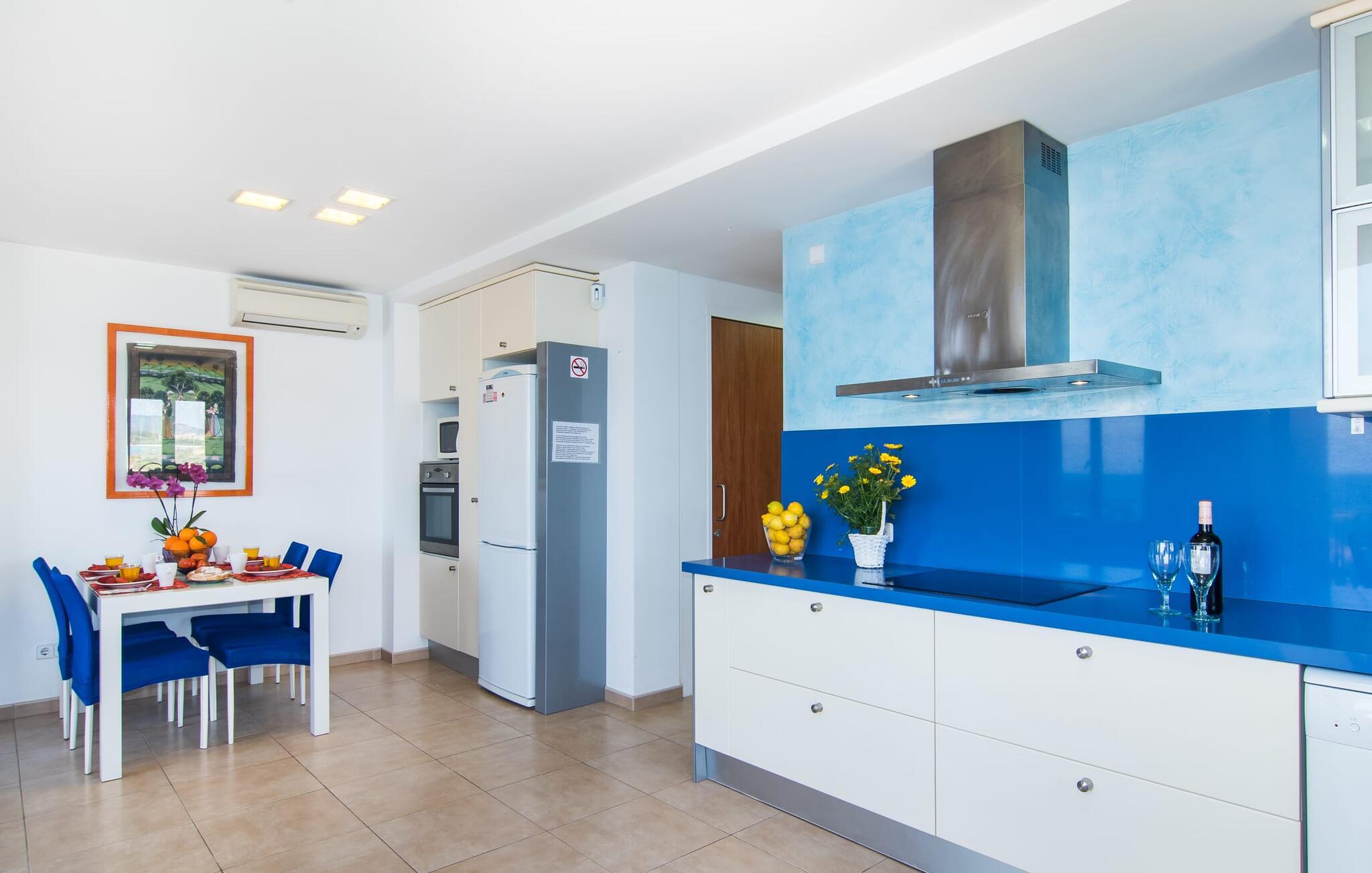 Hvis I vil starte jeres dag med udsigt over havet, nyde friskbrygget kaffe og samtidig beslutte jer for, hvordan I vil starte resten af dagen, så er ferievillaen med det stemningsfulde navn "Cielo Mar" den perfekte sted for jer. Oversat betyder det intet andet end "himmel (og) hav". Begge er utrolig tæt på hinanden her, hvilket betyder, at I kan nyde både solopgang og solnedgang fra denne lille plet. Om aftenen fuldender den glitrende månereflektion på vandet den romantiske atmosfære. Denne velholdte lejlighed er et glimrende alternativ til en hotelferie med faste morgenmads- og spisetider. Især hvis I foretrækker at rejse selvstændigt og også værdsætter fordelene ved en bymæssig beliggenhed. Den sydvendte villa ligger i udkanten af Sa Coma ud for S'Illot og byder på et smukt, til dels barskt landskab præget af dets nærhed til havet. Det delvist stenbeklædte hus med de muntre blå skodder passer ikke til billedet af masseovernatning, men lover sit eget præg, selvom der er et par andre lejlighedskomplekser i det tyndt bebyggede kvarter... Man kan gå til landsbyen, hvor I kan friske op om morgenen. I kan hente bagværk, eller slentre langs promenaden om aftenen og stoppe ved en af bodegaerne for en "Hierbas" (Mallorcan urtelikør). Det moderne feriehus "Cielo Mar" imponerer med sin behagelige maritime charme og indbydende munterhed, som er særdeles velegnet til en familie med to børn. Belægningen er dog helt variabel, da I kan reservere en ekstra seng på gæsteværelset ovenpå, hvilket er en omkostningseffektiv måde at udvide jeres gruppe på, eller også kan reserveres af et par til nedsat pris. Og dette kan nydes hele året rundt, da boligen har varm/kold aircondition i sit centrale rum, nemlig det dejligt åbne opholds-, spise- og køkkenalrum. Den komfortable sofa foran LCD-fjernsynet er ideel til en afslappet filmaften på køligere aftener. Hvid og ultramarin er de dominerende farver i det lyst møblerede og dekorerede spise- og køkkenområde; Sidstnævnte er i øvrigt meget praktisk, fordi den blandt andet også er udstyret med en opvaskemaskine. I kan også bruge vaskemaskinen til at holde jeres feriegarderobe pæn og ren. Efter at have lavet mad med udsigt over havet kan I gå ud på altanen, hvor mindst fire personer kan sidde og nyde deres måltider sammen. Soveværelserne ligger for enden af gangen, så I kan sove godt med vinduet åbent og høre havets brusen - for nogle mennesker er det endnu mere beroligende end at tælle får. Stilen i lejligheden er munter og lys overalt. I så mange små detaljer kan I endda mærke den kærlighed, som dette sted blev forberedt til sine gæster, så I kan føle jer helt komfortabel. Det inspirerende villa sommerhus “Cielo Mar” tilbyder en ferie lige ved havet, da det ligger direkte ved vandet i udkanten af Sa Coma. Takket være dens nærhed til stranden og byen er det et ideelt udgangspunkt for dejlige gåture, og det er også kun en kort gåtur til selvforplejning. Den nærliggende havneby Porto Cristo og dens indbydende promenade kan nås på få minutter i bil. Lufthavnen i Palma de Mallorca kan nås i bil på cirka en time, og der er en direkte offentlig bus, der forbinder den med landsbyen! Bemærk venligst, at denne ejendom ikke accepterer ungdomsgrupper eller polterabender. En ungdomsgruppe på denne ejendom består af personer under 18 år. Book ikke denne ejendom, hvis I er en ungdomsgruppe eller polterabend, da jeres reservation vil blive afvist, når den er booket, hvilket også kan være tilfældet ved ankomst til ejendommen eller under jeres ophold, og I vil ikke modtage en refusion