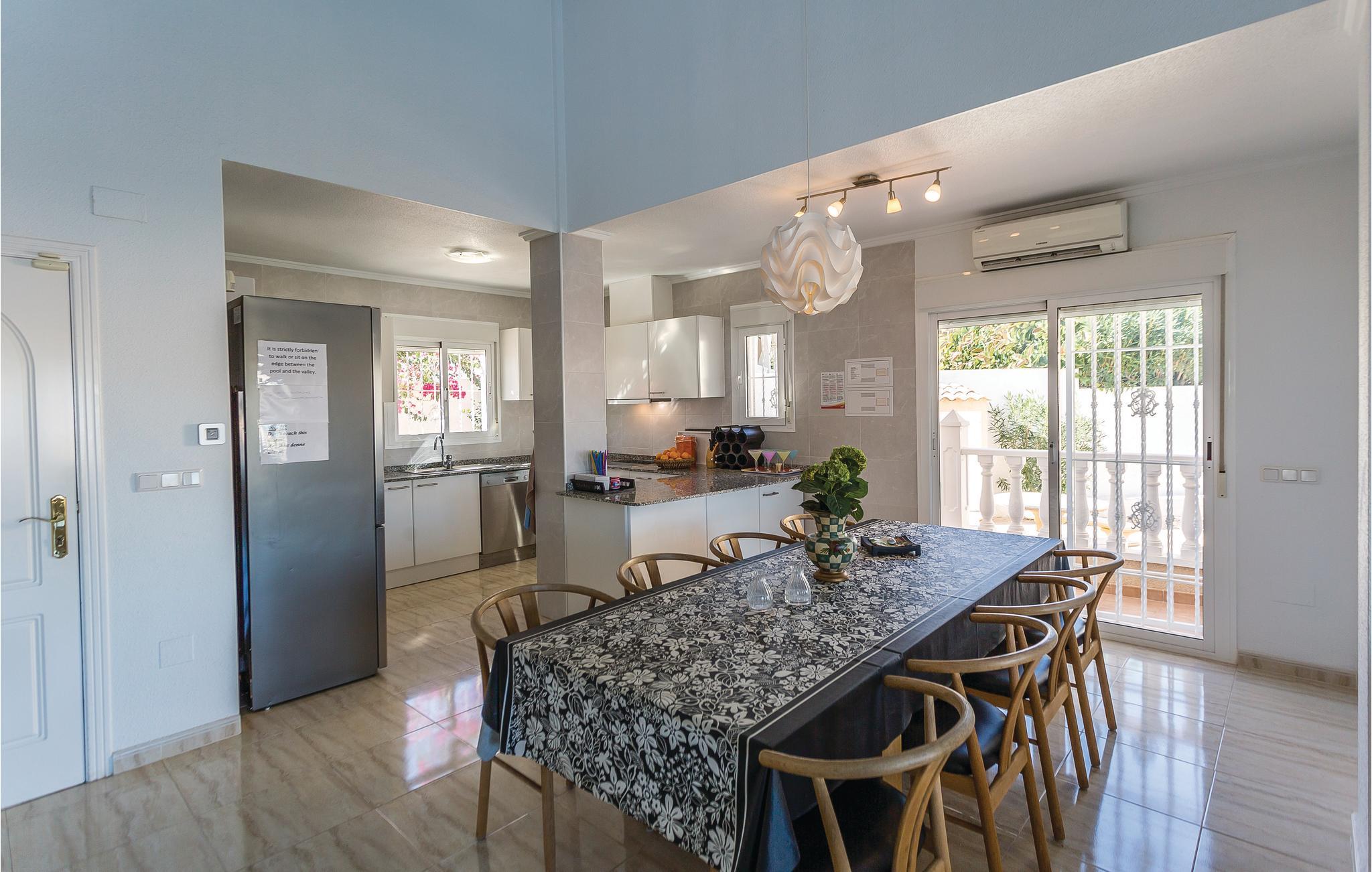 Foran den overdækkede terrasse, der hører til dette hus, har I en drømmeudsigt ud over golfbanen Marquesa. Snup en forfriskende svømmetur i swimmingpoolen og lad blikket vandre, mens I nyder den fabelagtige udsigt. Trods den skønne pool, skal I også forkæle jer selv med et besøg på de herlige strande med klitter ved Guadamar - de er bestemt et besøg værd! Også golfelskere vil elske dette sted. Klubhuset, restauranterne og butikkerne kommer I let til til fods. Dem, der holder ferie her, længes efter fred og ro, skøn udsigt til bjergene og at kunne nyde det smukke lyshav i dalen om aftenen. Ikke langt fra huset ligger der et fredet naturområde med to saltsøer, hvor I kan betragte eksotiske fugle. Regionen byder på talrige markeder, hvor I bl.a. kan finde eksotiske frugter og grøntsager til favorable priser - gå ikke glip af en oplevelsesrig ferie her. Blandt feriehusets særlige udstyr er en mobil gasgrill, en børnehøjstol, og en babyseng. sengelinned til denne er mod betaling.
