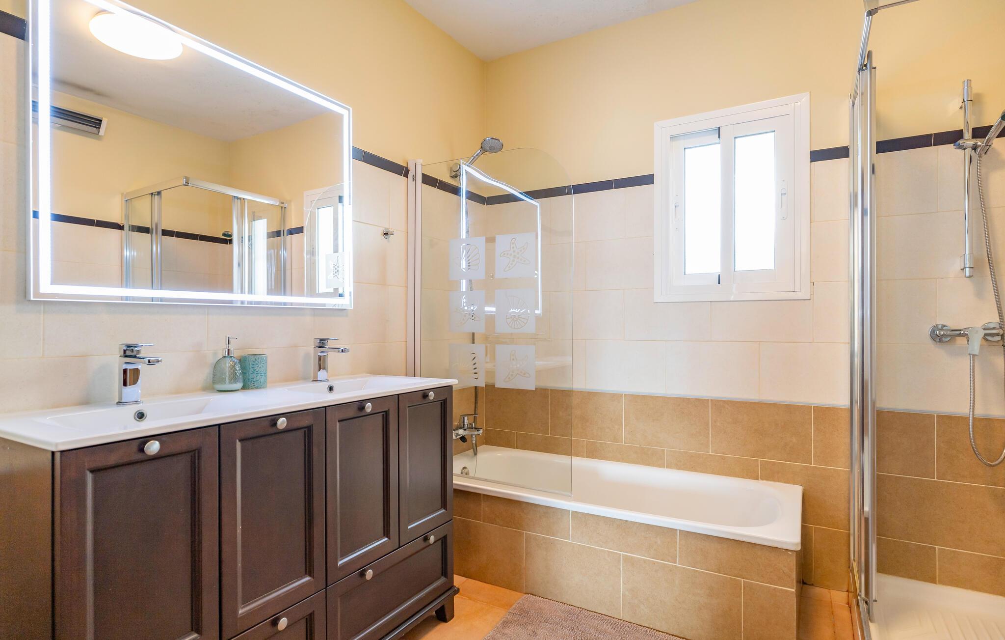 Lyse og smagfuldt indrettede værelser byder velkommen til dette feriehus, som er udstyret med mange ekstraudstyr. Tilbered lækre tapas i det moderne køkken og nyd dagens måltider ved det indbydende spisebord. Efter en begivenhedsrig dag kan I sætte fødderne op, streame en spændende film eller gøre jer godt tilpas i den hyggelige stue til en spilleaften.